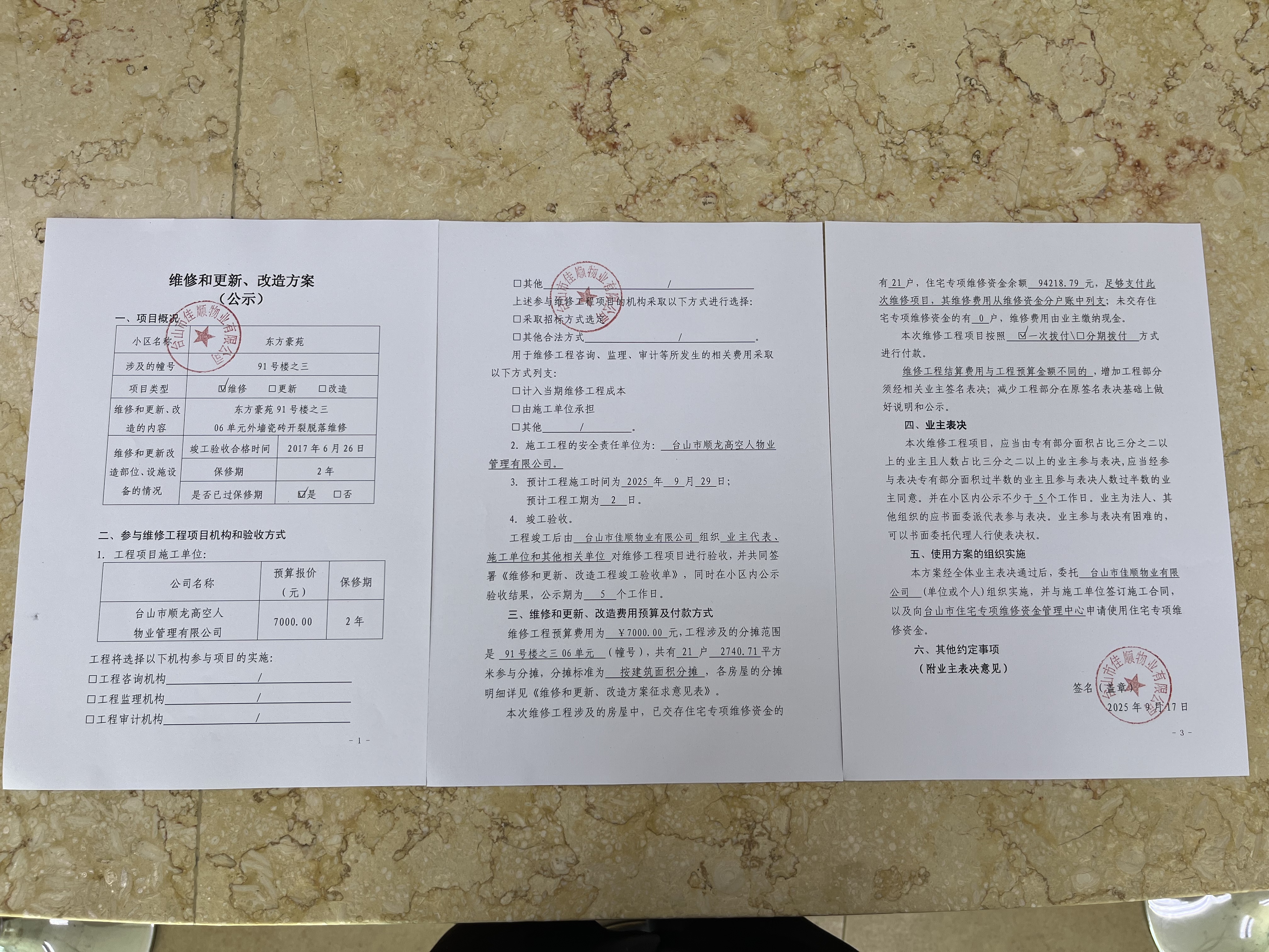 <td VALIGN="top" VALUES="" STYLE="border-width:0" BINDTYPE="0" ROWSPAN="19" COLSPAN="7" DATASOURCE="投票结果" ><font style="font-size:14pt;"><p style="white-space: normal; font-family: 宋体; line-height: 1.75em;">东方豪苑91号全体业主:</p><p style="white-space: normal; font-family: 宋体; line-height: 1.75em; text-indent: 2em;">本小区关于东方豪苑91号楼之三06单元外墙瓷砖开裂脱落维修的使用维修资金投票的投票已表决结束,询异时间从2025年10月22日开始,投票询异公示期间,业主可通过微信查询自己的表决情况或可凭身份证件申请查询自己的表决情况;如公示的业主表决情况与查询的本人表决意见不一致的,可以以书面形式向投票组织机构申诉,投票组织机构予以纠正并重新公示表决结果。异议提出人对投票组织机构的处理仍有异议的,可以向街道办事处(镇人民政府)反映处理,涉及住宅专项维修资金的,可向属地住宅专项维修资金管理中心反映处理。</p><p style="white-space: normal;"><br/></p><p style="white-space: normal; font-family: 宋体; line-height: 1.75em;"><strong>附件:</strong></p><p style="white-space: normal; font-family: 宋体; line-height: 1.75em;"><strong>一、投票范围</strong></p><p style="white-space: normal; font-family: 宋体; line-height: 1.75em; text-indent: 2em;">东方豪苑91号</p><p style="white-space: normal; font-family: 宋体; line-height: 1.75em; text-indent: 2em;">总人数(专有部分人数之和):21</p><p style="white-space: normal; font-family: 宋体; line-height: 1.75em; text-indent: 2em;"><span style="font-family: 宋体, SimSun;"><span style="font-family: 宋体; text-indent: 32px;"><span style="font-family: 宋体; text-indent: 32px;">总户数:21</span></span></span></p><p style="white-space: normal; font-family: 宋体; line-height: 1.75em; text-indent: 2em;">建筑物总面积(专有部分面积之和):2740.71㎡</p><p style="white-space: normal; font-family: 宋体; line-height: 1.75em;"><strong>二、询异公示起止时间</strong></p><p dir="ltr" style="white-space: normal; font-family: 宋体; line-height: 1.75em; text-indent: 2em;"><span style="text-indent: 36px;">2025年10月22日至2025年11月01日</span></p><p style="white-space: normal; font-family: 宋体; line-height: 1.75em;"><strong>三、投票详细描述</strong></p><p style="white-space: normal; font-family: 宋体; line-height: 1.75em; text-indent: 2em;"><p>东方豪苑91座3梯06单元外墙瓷砖开裂,存在脱落安全隐患,现对此栋外墙瓷砖进行拆除修复,工程维修预算金额为7000元,因已过保修期,维修费用由相关业主按建筑面积分摊,详见公示附件。如业主手机不能正常通过微信投票,请联系物业公司进行线下纸质投票,物业电话:0750-5579397。</p></p><p style="white-space: normal; font-family: 宋体; line-height: 1.75em;"><strong>四、计票规则</strong></p><p style="white-space: normal; font-family: 宋体; line-height: 1.75em; text-indent: 2em;">表决事项:使用建筑物及其附属设施的维修资金<br /><p style='text-align: left; font-family: 宋体; font-size: 16px; line-height: 1.75em; text-indent: 2em;'>计票规则:弃权票不并入其它项 未表决票不并入其它项</p></p><p style="white-space: normal; font-family: 宋体; line-height: 1.75em;"><strong>五、通过规则</strong></p><p style="white-space: normal; font-family: 宋体; line-height: 1.75em;"><strong><strong style="white-space: normal;"><span style="font-family: 宋体, SimSun;"> 根据《中华人民共和国民法典》第二百七十八条规定:业主共同决定事项,应当由专有部分面积占比三分之二以上的业主且人数占比三分之二以上的业主参与表决。</span></strong></strong></p><p style="white-space: normal; font-family: 宋体; line-height: 1.75em; text-indent: 2em;">表决事项:使用建筑物及其附属设施的维修资金<br /><p style='text-align: left; font-family: 宋体; font-size: 16px; line-height: 1.75em; text-indent: 2em;'>通过规则:双2/3以上参与表决,参与表决双过半同意</p></p><p style="white-space: normal; font-family: 宋体; line-height: 1.75em;"><strong>六、投票结果</strong></p><p style="white-space: normal; font-family: 宋体; line-height: 1.75em; text-indent: 2em;"><div id='resultTable'><table style='table-layout: fixed; font-size:12px; margin-top:10px' width='100%' border='0' cellspacing='0' cellpadding='0'><tr><td height='28' colspan='10' align='center' style='border: 1px solid #666'><strong style='font-size: 14px;'> 使用建筑物及其附属设施的维修资金</strong></td> </tr><tr id='trfirst'><td height='28' colspan='4' style='border-left: 1px solid #666; border-bottom: 1px solid #666'><strong> 申报单位:</strong> 台山市佳顺物业有限公司</td><td colspan='3' style='border-left: 1px solid #666; border-bottom: 1px solid #666'><strong> 联系方式:</strong> </td><td colspan='3' style='border-left: 1px solid #666; border-bottom: 1px solid #666; border-right: 1px solid #666'><strong> 申报日期:</strong> 2025年9月17日 </td></tr><tr> <td height='28' colspan='5' style='border-left: 1px solid #666; border-bottom: 1px solid #666'><strong> 总人数(专有部分人数之和):</strong>21人 </td><td colspan='5' style='border-left: 1px solid #666; border-bottom: 1px solid #666; border-right: 1px solid #666'><strong> 建筑物总面积(专有部分面积之和):</strong>2740.71㎡ </td> </tr><tr><td height='28' colspan='10' bgcolor='#F3F3F3' style='border-left: 1px solid #666;border-bottom: 1px solid #666;border-right: 1px solid #666'><strong> 参与人数及面积统计</strong></td></tr><tr><td height='28' colspan='5' style='border-left: 1px solid #666; border-bottom: 1px solid #666'><strong> 参与表决专有部分人数之和:</strong>18人</td><td colspan='5' style='border-left: 1px solid #666; border-bottom: 1px solid #666; border