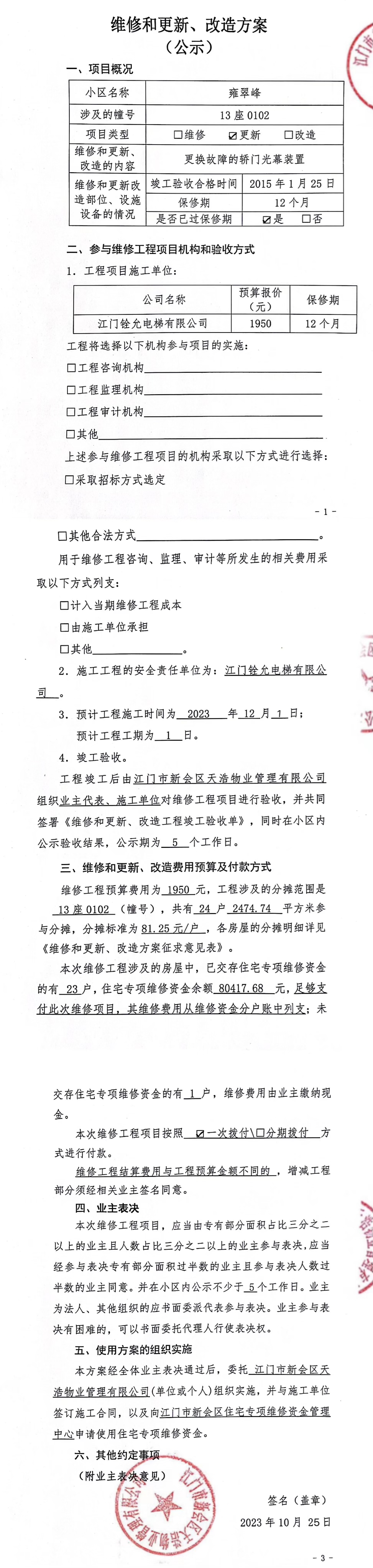 <td valign="top" values="" style="border-width:0" bindtype="0" rowspan="17" colspan="7" datasource="投票结果"><font style=" font-family:方正小标宋简体;font-size:14pt;"><p style="line-height: 1.75em;"><span style="font-family: 宋体, SimSun;">各位尊敬的业主:</span><br></p><p style="text-indent: 2em; line-height: 1.75em;"><span style="font-family: 宋体, SimSun;">根据法律法规的规定,本小区业主利用“江门市物业事项表决管理系统”已对本小区公共事务决策事项进行了表决,在经过7日的询异公示期后,未收到业主有效的异议。现将投票结果公告,并就产生的法律效力说明如下:</span></p><p style="line-height: 1.75em; text-indent: 0em;"><strong style="text-indent: 2em;"><span style="font-family: 宋体, SimSun;">一、投票范围</span></strong></p><p style="text-indent: 2em; line-height: 1.75em;"><span style="font-family: 宋体, SimSun;">雍翠峰雍翠峰13座</span></p><p style="text-indent: 2em; line-height: 1.75em;"><span style="font-family: 宋体, SimSun;">总人数(专有部分人数之和):24</span></p><p style="text-indent: 2em; line-height: 1.75em;"><span style="font-family: 宋体, SimSun;"><span style="font-family: 宋体, SimSun; text-indent: 32px;"><span style="font-family: 宋体; text-indent: 32px;">总户数:24</span></span></span></p><p style="text-indent: 2em; line-height: 1.75em;"><span style="font-family: 宋体, SimSun;">建筑物总面积(专有部分面积之和):2474.74㎡</span></p><p style="line-height: 1.75em;"><strong><span style="font-family: 宋体, SimSun;">二、投票结果公告时间</span></strong></p><p style="text-indent: 2em; line-height: 1.75em;"><span style="font-family: 宋体, SimSun;">从2023年11月03日开始</span></p><p style="line-height: 1.75em;"><strong><span style="font-family: 宋体, SimSun;">三、计票规则</span></strong></p><p style="text-indent: 2em; line-height: 1.75em;"><span style="font-family: 宋体, SimSun;">表决事项:使用建筑物及其附属设施的维修资金<br></span></p><p style="font-family: 宋体, SimSun;line-height: 1.75em; text-indent: 2em;">计票规则:弃权票不并入其它项 未表决票不并入其它项</p><p></p><p style="line-height: 1.75em;"><strong><span style="font-family: 宋体, SimSun;">四、通过规则</span></strong></p><p style="line-height: 1.75em;"><strong><span style="font-family: 宋体, SimSun;"> 根据《中华人民共和国民法典》第二百七十八条规定:业主共同决定事项,应当由专有部分面积占比三分之二以上的业主且人数占比三分之二以上的业主参与表决。</span></strong></p><p style="text-indent: 2em; line-height: 1.75em;"><span style="font-family: 宋体, SimSun;"><span style="font-family: 宋体, SimSun; text-indent: 32px;">表决事项:使用建筑物及其附属设施的维修资金<br></span></span></p><p style="font-family: 宋体, SimSun;line-height: 1.75em; text-indent: 2em;">通过规则:参与表决专有部分面积过半数的业主且参与表决人数过半数的业主同意</p><p></p><p style="line-height: 1.75em;"><strong><span style="font-family: 宋体, SimSun;">五、投票结果</span></strong></p><p style="line-height: 1.75em; text-indent: 2em;"><span style="font-family: 宋体, SimSun; text-indent: 2em;"></span></p><div id="resultTable"><table style="table-layout: fixed; font-size:12px; margin-top:10px" width="100%" border="0" cellspacing="0" cellpadding="0"><tbody><tr><td height="28" colspan="10" align="center" style="border: 1px solid #666"><strong style="font-size: 14px;"> 使用建筑物及其附属设施的维修资金</strong></td> </tr><tr id="trfirst"><td height="28" colspan="4" style="border-left: 1px solid #666; border-bottom: 1px solid #666"><strong> 申报单位:</strong> 江门市新会区天浩物业管理有限公司</td><td colspan="3" style="border-left: 1px solid #666; border-bottom: 1px solid #666"><strong> 联系方式:</strong> </td><td colspan="3" style="border-left: 1px solid #666; border-bottom: 1px solid #666; border-right: 1px solid #666"><strong> 申报日期:</strong> 2023年10月25日 </td></tr><tr> <td height="28" colspan="5" style="border-left: 1px solid #666; border-bottom: 1px solid #666"><strong> 总人数(专有部分人数之和):</strong>24人 </td><td colspan="5" style="border-left: 1px solid #666; border-bottom: 1px solid #666; border-right: 1px solid #666"><strong> 建筑物总面积(专有部分面积之和):</strong>2474.74㎡ </td> </tr><tr><td height="28" colspan="10" bgcolor="#F3F3F3" style="border-left: 1px solid #666;border-bottom: 1px solid #666;border-right: 1px solid #666"><strong> 参与人数及面积统计</strong></td></tr><tr><td height="28" colspan="5" style="border-left: 1px solid #666; border-bottom: 1px solid #666"><strong> 参与表决专有部分人数之和:</strong>18人</td><td colspan="5" style="border-left: 1px solid #666; border-bottom: 1px solid #666; border-right: 1px solid #666"><strong> 参与表决占有表决权总人数比例:</strong>75.00%</td></tr><tr><td height="28" colspan="5" style="border-left: 1px solid #666; border-bottom: 1px solid #666"><strong> 参与表决专有部分面积之和:</strong>2001.49㎡</td><td colspan="5" style="border-left: 1px solid #666; border-bottom: 1px solid #666; border-right: 1px solid #666"><strong> 参与表决占有表决权总面积比例:</strong>80.88%</td></tr><tr><td height="28" colspan="10" bgcolor="#F3F3F3" style="border-left: 1px solid #666; border-bottom: 1px solid #666;border-right: 1px solid #666"> <strong> 未参与人数及面积统计</strong></td> </tr><tr><td height="28" colspan="5" style="border-left: 1px solid #666; border-bottom: 1px solid #666"><strong> 未参与表决专有部分人数之和:</strong>6人 </td><td colspan="5" style="border-left: 1px solid #666; border-bottom: 1px solid #666; border-right: 1px solid #666"><strong> 未参与表决占有表决权总人数比例:</strong>25.00%