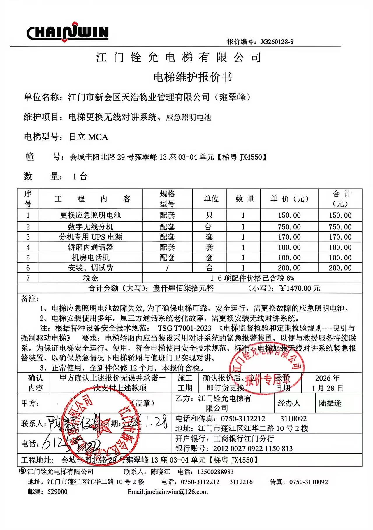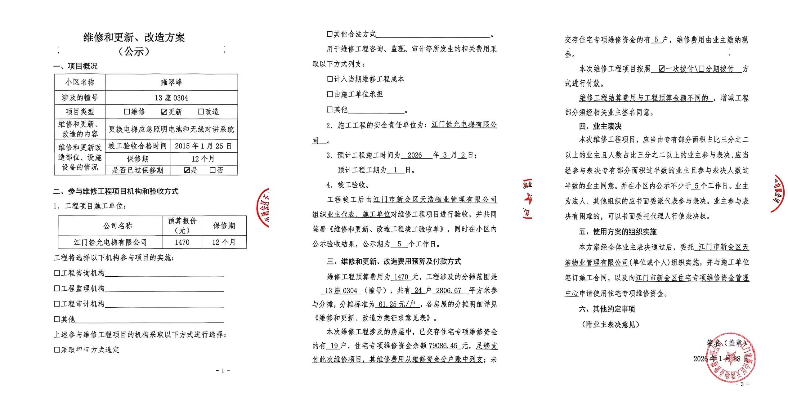 <td VALIGN="top" VALUES="" STYLE="border-width:0" BINDTYPE="0" ROWSPAN="19" COLSPAN="7" DATASOURCE="投票结果" ><font style="font-size:14pt;"><p style="white-space: normal; font-family: 宋体; line-height: 1.75em;">雍翠峰雍翠峰13座全体业主:</p><p style="white-space: normal; font-family: 宋体; line-height: 1.75em; text-indent: 2em;">本小区关于雍翠峰13座03-04单元电梯【梯粤JX4550】更换应急照明电池和无线对讲系统使用维修资金的投票的投票已表决结束,询异时间从2026年02月02日开始,投票询异公示期间,业主可通过微信查询自己的表决情况或可凭身份证件申请查询自己的表决情况;如公示的业主表决情况与查询的本人表决意见不一致的,可以以书面形式向投票组织机构申诉,投票组织机构予以纠正并重新公示表决结果。异议提出人对投票组织机构的处理仍有异议的,可以向街道办事处(镇人民政府)反映处理,涉及住宅专项维修资金的,可向属地住宅专项维修资金管理中心反映处理。</p><p style="white-space: normal;"><br/></p><p style="white-space: normal; font-family: 宋体; line-height: 1.75em;"><strong>附件:</strong></p><p style="white-space: normal; font-family: 宋体; line-height: 1.75em;"><strong>一、投票范围</strong></p><p style="white-space: normal; font-family: 宋体; line-height: 1.75em; text-indent: 2em;">雍翠峰雍翠峰13座</p><p style="white-space: normal; font-family: 宋体; line-height: 1.75em; text-indent: 2em;">总人数(专有部分人数之和):24</p><p style="white-space: normal; font-family: 宋体; line-height: 1.75em; text-indent: 2em;"><span style="font-family: 宋体, SimSun;"><span style="font-family: 宋体; text-indent: 32px;"><span style="font-family: 宋体; text-indent: 32px;">总户数:24</span></span></span></p><p style="white-space: normal; font-family: 宋体; line-height: 1.75em; text-indent: 2em;">建筑物总面积(专有部分面积之和):2806.67㎡</p><p style="white-space: normal; font-family: 宋体; line-height: 1.75em;"><strong>二、询异公示起止时间</strong></p><p dir="ltr" style="white-space: normal; font-family: 宋体; line-height: 1.75em; text-indent: 2em;"><span style="text-indent: 36px;">2026年02月02日至2026年02月12日</span></p><p style="white-space: normal; font-family: 宋体; line-height: 1.75em;"><strong>三、投票详细描述</strong></p><p style="white-space: normal; font-family: 宋体; line-height: 1.75em; text-indent: 2em;"><p> 雍翠峰13座03-04单元电梯【梯粤JX4550】,电梯上报五方通话接听失灵和电梯应急照明失效,经检查确认为电梯应急照明故障损坏和原三方通话系统老化故障,配件日常使用自然损坏,已过保修期。</p><p> 现需申请使用维修资金对13座03-04单元电梯【梯粤JX4550】进行维修,工程维修预算金额为1470元,项目最终费用以施工合同签订金额为准。维修费用的分摊标准为按分户分摊,每户分摊61.25元,详见公示附件。如业主不能正常通过微信投票,请联系物业公司进行线下纸质投票,物业电话:0750-6125500</p></p><p style="white-space: normal; font-family: 宋体; line-height: 1.75em;"><strong>四、计票规则</strong></p><p style="white-space: normal; font-family: 宋体; line-height: 1.75em; text-indent: 2em;">表决事项:使用建筑物及其附属设施的维修资金<br /><p style='text-align: left; font-family: 宋体; font-size: 16px; line-height: 1.75em; text-indent: 2em;'>计票规则:弃权票不并入其它项 未表决票不并入其它项</p></p><p style="white-space: normal; font-family: 宋体; line-height: 1.75em;"><strong>五、通过规则</strong></p><p style="white-space: normal; font-family: 宋体; line-height: 1.75em;"><strong><strong style="white-space: normal;"><span style="font-family: 宋体, SimSun;"> 根据《中华人民共和国民法典》第二百七十八条规定:业主共同决定事项,应当由专有部分面积占比三分之二以上的业主且人数占比三分之二以上的业主参与表决。</span></strong></strong></p><p style="white-space: normal; font-family: 宋体; line-height: 1.75em; text-indent: 2em;">表决事项:使用建筑物及其附属设施的维修资金<br /><p style='text-align: left; font-family: 宋体; font-size: 16px; line-height: 1.75em; text-indent: 2em;'>通过规则:双2/3以上参与表决,参与表决双过半同意</p></p><p style="white-space: normal; font-family: 宋体; line-height: 1.75em;"><strong>六、投票结果</strong></p><p style="white-space: normal; font-family: 宋体; line-height: 1.75em; text-indent: 2em;"><div id='resultTable'><table style='table-layout: fixed; font-size:12px; margin-top:10px' width='100%' border='0' cellspacing='0' cellpadding='0'><tr><td height='28' colspan='10' align='center' style='border: 1px solid #666'><strong style='font-size: 14px;'> 使用建筑物及其附属设施的维修资金</strong></td> </tr><tr id='trfirst'><td height='28' colspan='4' style='border-left: 1px solid #666; border-bottom: 1px solid #666'><strong> 申报单位:</strong> 江门市新会区天浩物业管理有限公司</td><td colspan='3' style='border-left: 1px solid #666; border-bottom: 1px solid #666'><strong> 联系方式:</strong> </td><td colspan='3' style='border-left: 1px solid #666; border-bottom: 1px solid #666; border-right: 1px solid #666'><strong> 申报日期:</strong> 2026年1月29日 </td></tr><tr> <td height='28' colspan='5' style='border-left: 1px solid #666; border-bottom: 1px solid #666'><strong> 总人数(专有部分人数之和):</strong>24人 </td><td colspan='5' style='border-left: 1px solid #666; border-bottom: 1px solid #666; border-right: 1px solid #666'><strong> 建筑物总面积(专有部分面积之和):</strong>2806.67㎡ </td> </tr><tr><td height='28' colspan='10' bgcolor='#F3F3F3' style='border-left: 1px solid #666;border-bottom: 1px solid #666;border-rig