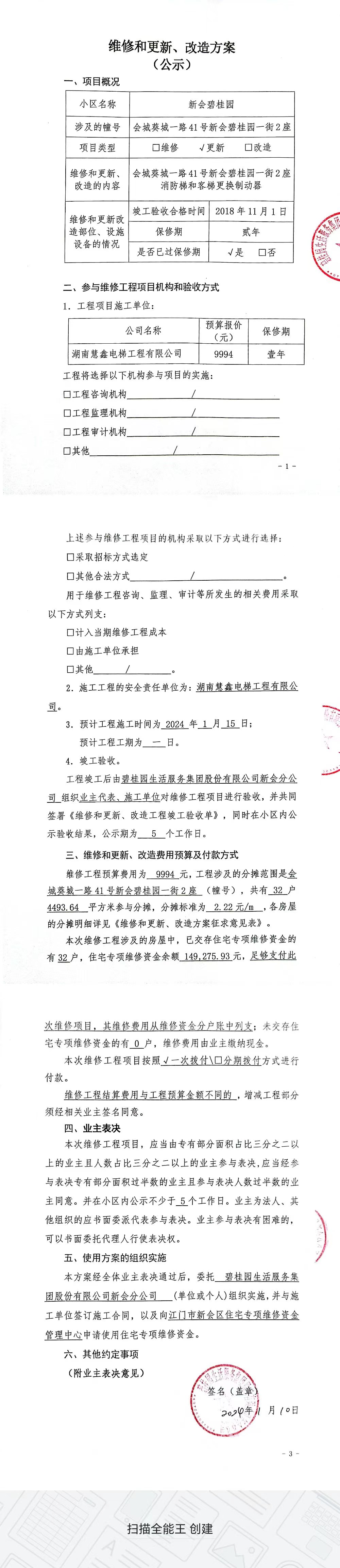 <td valign="top" values="" style="border-width:0" bindtype="0" rowspan="17" colspan="7" datasource="投票结果"><font style=" font-family:方正小标宋简体;font-size:14pt;"><p style="line-height: 1.75em;"><span style="font-family: 宋体, SimSun;">各位尊敬的业主:</span><br></p><p style="text-indent: 2em; line-height: 1.75em;"><span style="font-family: 宋体, SimSun;">根据法律法规的规定,本小区业主利用“江门市物业事项表决管理系统”已对本小区公共事务决策事项进行了表决,在经过7日的询异公示期后,未收到业主有效的异议。现将投票结果公告,并就产生的法律效力说明如下:</span></p><p style="line-height: 1.75em; text-indent: 0em;"><strong style="text-indent: 2em;"><span style="font-family: 宋体, SimSun;">一、投票范围</span></strong></p><p style="text-indent: 2em; line-height: 1.75em;"><span style="font-family: 宋体, SimSun;">新会碧桂园葵城一路41号01街02座</span></p><p style="text-indent: 2em; line-height: 1.75em;"><span style="font-family: 宋体, SimSun;">总人数(专有部分人数之和):32</span></p><p style="text-indent: 2em; line-height: 1.75em;"><span style="font-family: 宋体, SimSun;"><span style="font-family: 宋体, SimSun; text-indent: 32px;"><span style="font-family: 宋体; text-indent: 32px;"><span style="font-family: 宋体; text-indent: 32px;">总户数:32</span></span></span></span></p><p style="text-indent: 2em; line-height: 1.75em;"><span style="font-family: 宋体, SimSun;">建筑物总面积(专有部分面积之和):4493.64㎡</span></p><p style="line-height: 1.75em;"><strong><span style="font-family: 宋体, SimSun;">二、投票结果公告时间</span></strong></p><p style="text-indent: 2em; line-height: 1.75em;"><span style="font-family: 宋体, SimSun;">从2024年01月24日开始</span></p><p style="line-height: 1.75em;"><strong><span style="font-family: 宋体, SimSun;">三、计票规则</span></strong></p><p style="text-indent: 2em; line-height: 1.75em;"><span style="font-family: 宋体, SimSun;">表决事项:使用建筑物及其附属设施的维修资金<br></span></p><p style="font-family: 宋体, SimSun;line-height: 1.75em; text-indent: 2em;">计票规则:弃权票不并入其它项 未表决票不并入其它项</p><p></p><p style="line-height: 1.75em;"><strong><span style="font-family: 宋体, SimSun;">四、通过规则</span></strong></p><p style="line-height: 1.75em;"><strong><span style="font-family: 宋体, SimSun;"> 根据《中华人民共和国民法典》第二百七十八条规定:业主共同决定事项,应当由专有部分面积占比三分之二以上的业主且人数占比三分之二以上的业主参与表决。</span></strong></p><p style="text-indent: 2em; line-height: 1.75em;"><span style="font-family: 宋体, SimSun;"><span style="font-family: 宋体, SimSun; text-indent: 32px;">表决事项:使用建筑物及其附属设施的维修资金<br></span></span></p><p style="font-family: 宋体, SimSun;line-height: 1.75em; text-indent: 2em;">通过规则:参与表决专有部分面积过半数的业主且参与表决人数过半数的业主同意</p><p></p><p style="line-height: 1.75em;"><strong><span style="font-family: 宋体, SimSun;">五、投票结果</span></strong></p><p style="line-height: 1.75em; text-indent: 2em;"><span style="font-family: 宋体, SimSun; text-indent: 2em;"></span></p><div id="resultTable"><table style="table-layout: fixed; font-size:12px; margin-top:10px" width="100%" border="0" cellspacing="0" cellpadding="0"><tbody><tr><td height="28" colspan="10" align="center" style="border: 1px solid #666"><strong style="font-size: 14px;"> 使用建筑物及其附属设施的维修资金</strong></td> </tr><tr id="trfirst"><td height="28" colspan="4" style="border-left: 1px solid #666; border-bottom: 1px solid #666"><strong> 申报单位:</strong> 碧桂园生活服务集团股份有限公司新会分公司</td><td colspan="3" style="border-left: 1px solid #666; border-bottom: 1px solid #666"><strong> 联系方式:</strong> </td><td colspan="3" style="border-left: 1px solid #666; border-bottom: 1px solid #666; border-right: 1px solid #666"><strong> 申报日期:</strong> 2024年1月10日 </td></tr><tr> <td height="28" colspan="5" style="border-left: 1px solid #666; border-bottom: 1px solid #666"><strong> 总人数(专有部分人数之和):</strong>32人 </td><td colspan="5" style="border-left: 1px solid #666; border-bottom: 1px solid #666; border-right: 1px solid #666"><strong> 建筑物总面积(专有部分面积之和):</strong>4493.64㎡ </td> </tr><tr><td height="28" colspan="10" bgcolor="#F3F3F3" style="border-left: 1px solid #666;border-bottom: 1px solid #666;border-right: 1px solid #666"><strong> 参与人数及面积统计</strong></td></tr><tr><td height="28" colspan="5" style="border-left: 1px solid #666; border-bottom: 1px solid #666"><strong> 参与表决专有部分人数之和:</strong>22人</td><td colspan="5" style="border-left: 1px solid #666; border-bottom: 1px solid #666; border-right: 1px solid #666"><strong> 参与表决占有表决权总人数比例:</strong>68.75%</td></tr><tr><td height="28" colspan="5" style="border-left: 1px solid #666; border-bottom: 1px solid #666"><strong> 参与表决专有部分面积之和:</strong>3084.84㎡</td><td colspan="5" style="border-left: 1px solid #666; border-bottom: 1px solid #666; border-right: 1px solid #666"><strong> 参与表决占有表决权总面积比例:</strong>68.65%</td></tr><tr><td height="28" colspan="10" bgcolor="#F3F3F3" style="border-left: 1px solid #666; border-bottom: 1px solid #666;border-right: 1px solid #666"> <strong> 未参与人数及面积统计</strong></td> </tr><tr><td height="28" colspan="5" style="border-left: 1px solid #666; border-bottom: 1px solid #666"><strong> 未参与表决专有部分人数之和:</strong>10人 </td><td colspan="5" style="border-left: 1px solid #666; border-bottom: 1px solid #666; border-r