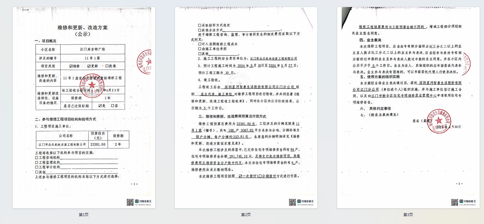 <td VALIGN="top" VALUES="" STYLE="border-width:0" BINDTYPE="0" ROWSPAN="17" COLSPAN="7" DATASOURCE="投票结果" ><font style=" font-family:方正小标宋简体;font-size:14pt;"><p style="line-height: 1.75em;"><span style="font-family: 宋体, SimSun;">各位尊敬的业主:</span><br/></p><p style="text-indent: 2em; line-height: 1.75em;"><span style="font-family: 宋体, SimSun;">根据法律法规的规定,本小区业主利用“江门市物业事项表决管理系统”已对本小区公共事务决策事项进行了表决,在经过7日的询异公示期后,未收到业主有效的异议。现将投票结果公告,并就产生的法律效力说明如下:</span></p><p style="line-height: 1.75em; text-indent: 0em;"><strong style="text-indent: 2em;"><span style="font-family: 宋体, SimSun;">一、投票范围</span></strong></p><p style="text-indent: 2em; line-height: 1.75em;"><span style="font-family: 宋体, SimSun;">江门美吉特广场会城启超大道11号1座</span></p><p style="text-indent: 2em; line-height: 1.75em;"><span style="font-family: 宋体, SimSun;">总人数(专有部分人数之和):99</span></p><p style="text-indent: 2em; line-height: 1.75em;"><span style="font-family: 宋体, SimSun;"><span style="font-family: 宋体, SimSun; text-indent: 32px;"><span style="font-family: 宋体; text-indent: 32px;"><span style="font-family: 宋体; text-indent: 32px;">总户数:100</span></span></span></span></p><p style="text-indent: 2em; line-height: 1.75em;"><span style="font-family: 宋体, SimSun;">建筑物总面积(专有部分面积之和):9367.03㎡</span></p><p style="line-height: 1.75em;"><strong><span style="font-family: 宋体, SimSun;">二、投票结果公告时间</span></strong></p><p style="text-indent: 2em; line-height: 1.75em;"><span style="font-family: 宋体, SimSun;">从2024年05月19日开始</span></p><p style="line-height: 1.75em;"><strong><span style="font-family: 宋体, SimSun;">三、计票规则</span></strong></p><p style="text-indent: 2em; line-height: 1.75em;"><span style="font-family: 宋体, SimSun;">表决事项:使用建筑物及其附属设施的维修资金<br /><p style='font-family: 宋体, SimSun;line-height: 1.75em; text-indent: 2em;'>计票规则:弃权票不并入其它项&nbsp;&nbsp;&nbsp;&nbsp;未表决票不并入其它项</p></span></p><p style="line-height: 1.75em;"><strong><span style="font-family: 宋体, SimSun;">四、通过规则</span></strong></p><p style="line-height: 1.75em;"><strong><span style="font-family: 宋体, SimSun;">&nbsp; 根据《中华人民共和国民法典》第二百七十八条规定:业主共同决定事项,应当由专有部分面积占比三分之二以上的业主且人数占比三分之二以上的业主参与表决。</span></strong></p><p style="text-indent: 2em; line-height: 1.75em;"><span style="font-family: 宋体, SimSun;"><span style="font-family: 宋体, SimSun; text-indent: 32px;">表决事项:使用建筑物及其附属设施的维修资金<br /><p style='font-family: 宋体, SimSun;line-height: 1.75em; text-indent: 2em;'>通过规则:双2/3以上参与表决,参与表决双过半同意</p></span></span></p><p style="line-height: 1.75em;"><strong><span style="font-family: 宋体, SimSun;">五、投票结果</span></strong></p><p style="line-height: 1.75em; text-indent: 2em;"><span style="font-family: 宋体, SimSun; text-indent: 2em;"><div id='resultTable'><table style='table-layout: fixed; font-size:12px; margin-top:10px' width='100%' border='0' cellspacing='0' cellpadding='0'><tr><td height='28' colspan='10' align='center' style='border: 1px solid #666'><strong style='font-size: 14px;'> 使用建筑物及其附属设施的维修资金</strong></td> </tr><tr id='trfirst'><td height='28' colspan='4' style='border-left: 1px solid #666; border-bottom: 1px solid #666'><strong>&nbsp;申报单位:</strong> 深圳星河智善生活股份有限公司江门分公司</td><td colspan='3' style='border-left: 1px solid #666; border-bottom: 1px solid #666'><strong>&nbsp;联系方式:</strong> (0750) 3871336 3829717 </td><td colspan='3' style='border-left: 1px solid #666; border-bottom: 1px solid #666; border-right: 1px solid #666'><strong>&nbsp;申报日期:</strong> 2024年4月30日 </td></tr><tr> <td height='28' colspan='5' style='border-left: 1px solid #666; border-bottom: 1px solid #666'><strong>&nbsp;列支总人数(专有部分人数之和):</strong>99人 </td><td colspan='5' style='border-left: 1px solid #666; border-bottom: 1px solid #666; border-right: 1px solid #666'><strong>&nbsp;列支建筑物总面积(专有部分面积之和):</strong>9367.03㎡ </td> </tr><tr><td height='28' colspan='10' bgcolor='#F3F3F3' style='border-left: 1px solid #666;border-bottom: 1px solid #666;border-right: 1px solid #666'><strong>&nbsp;参与表决人数及面积统计</strong></td></tr><tr><td height='28' colspan='5' style='border-left: 1px solid #666; border-bottom: 1px solid #666'><strong>&nbsp;参与表决人数:</strong>70人</td><td colspan='5' style='border-left: 1px solid #666; border-bottom: 1px solid #666; border-right: 1px solid #666'><strong>&nbsp;参与表决人数占总人数比例:</strong>70.71%</td></tr><tr><td height='28' colspan='5' style='border-left: 1px solid #666; border-bottom: 1px solid #666'><strong>&nbsp;参与表决面积:</strong>6721.47㎡</td><td colspan='5' style='border-left: 1px solid #666; border-bottom: 1px solid #666; border-right: 1px solid #666'><strong>&nbsp;参与表决面积占总面积比例:</strong>71.76%</td></tr><tr><td height='28' colspan='10' bgcolor='#F3F3F3' style='border-left: 1px solid #666; border-bottom: 1px solid #666;border-right: 1px solid #666'> <strong>&nbsp;参与表决同意人数及面积统计</strong></td> </tr><tr><td height='28' colspan='5' style='border-left: 1px solid #666; border-bottom: 1px solid #666'><strong>&nbsp;参与表决同意人数:</strong>68人 </td><td colspan='5' style='border-left: 1px solid #666; border-bottom: 1px solid #