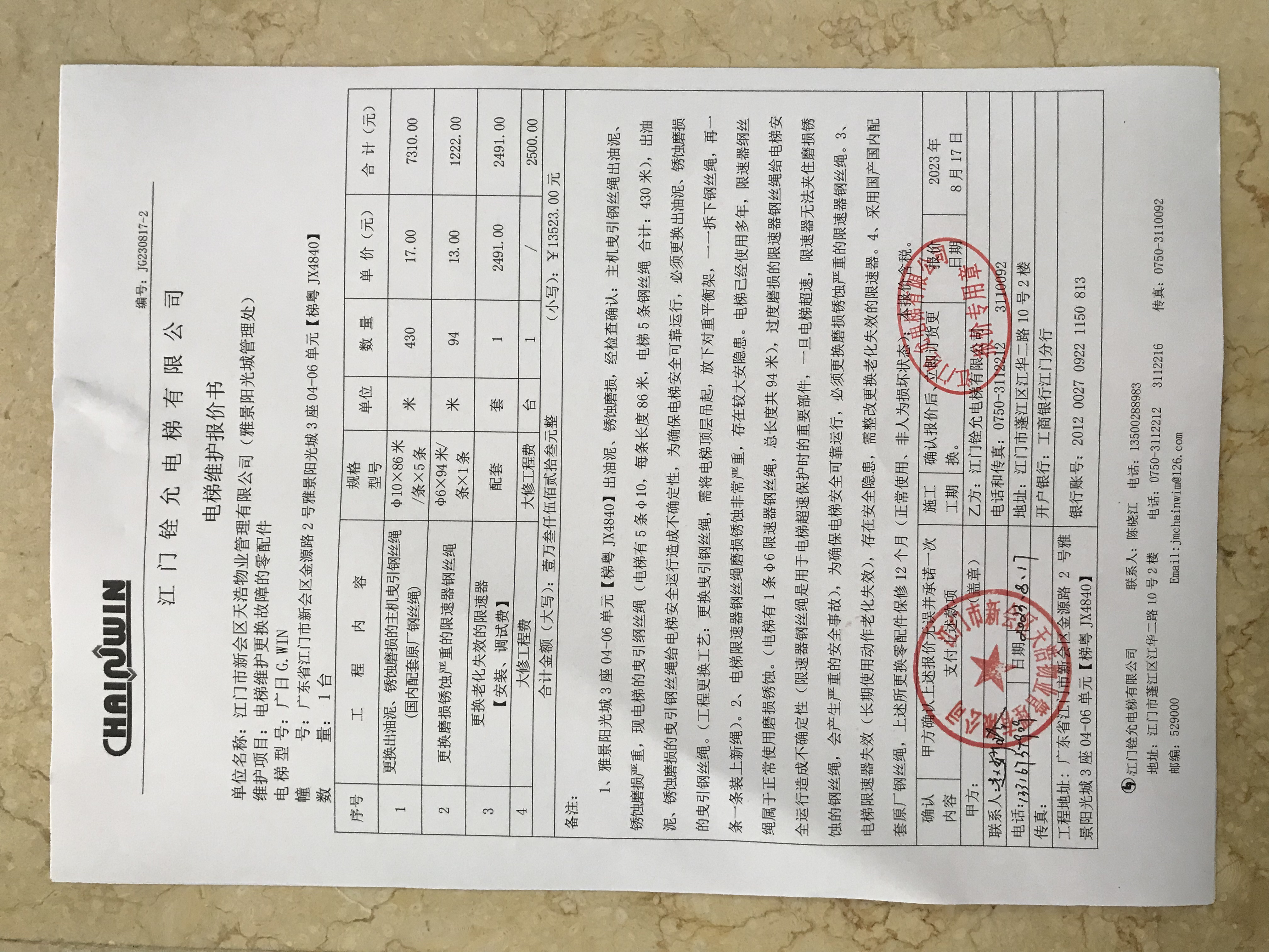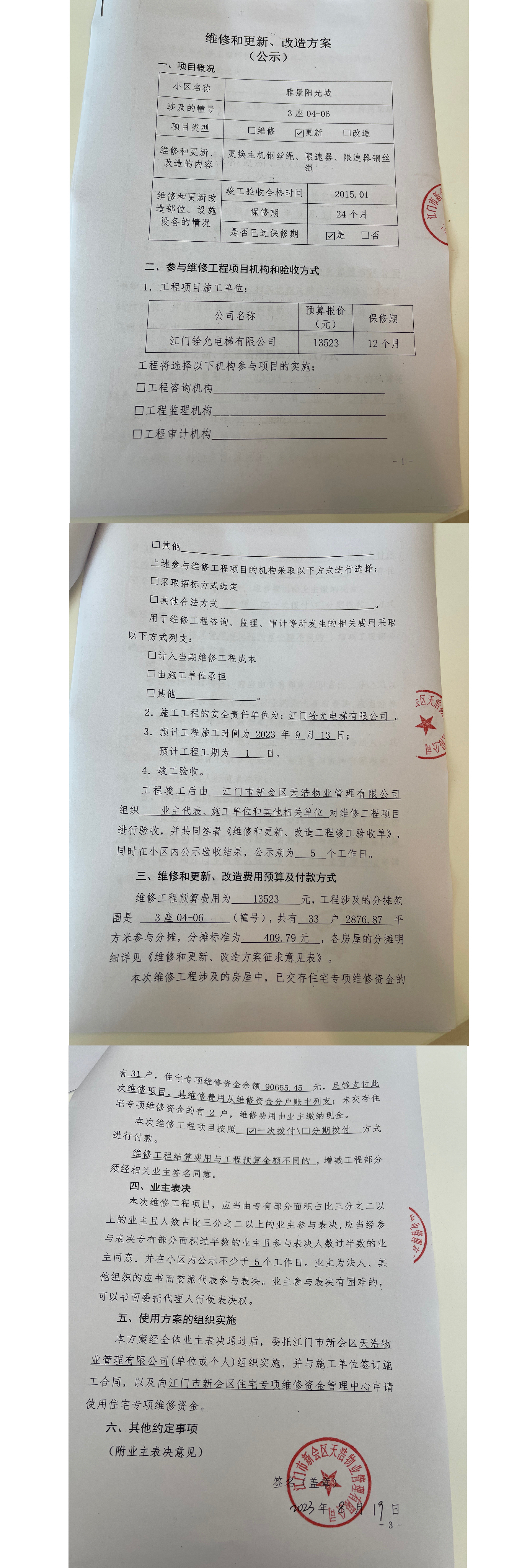 <td VALIGN="top" VALUES="" STYLE="border-width:0" BINDTYPE="0" ROWSPAN="19" COLSPAN="7" DATASOURCE="投票结果" ><font style="font-size:14pt;"><p style="white-space: normal; font-family: 宋体; line-height: 1.75em;">雅景阳光城3座全体业主:</p><p style="white-space: normal; font-family: 宋体; line-height: 1.75em; text-indent: 2em;">本小区关于雅景阳光城3座04-06电梯(梯粤JX4840)更换主机钢丝绳、限速器、限速器钢丝绳使用维修资金的投票的投票已表决结束,询异时间从2023年08月24日开始,投票询异公示期间,业主可通过微信查询自己的表决情况或可凭身份证件申请查询自己的表决情况;如公示的业主表决情况与查询的本人表决意见不一致的,可以以书面形式向投票组织机构申诉,投票组织机构予以纠正并重新公示表决结果。异议提出人对投票组织机构的处理仍有异议的,可以向街道办事处(镇人民政府)反映处理,涉及住宅专项维修资金的,可向属地住宅专项维修资金管理中心反映处理。</p><p style="white-space: normal;"><br/></p><p style="white-space: normal; font-family: 宋体; line-height: 1.75em;"><strong>附件:</strong></p><p style="white-space: normal; font-family: 宋体; line-height: 1.75em;"><strong>一、投票范围</strong></p><p style="white-space: normal; font-family: 宋体; line-height: 1.75em; text-indent: 2em;">雅景阳光城3座</p><p style="white-space: normal; font-family: 宋体; line-height: 1.75em; text-indent: 2em;">总人数(专有部分人数之和):33</p><p style="white-space: normal; font-family: 宋体; line-height: 1.75em; text-indent: 2em;"><span style="font-family: 宋体, SimSun;">总户数:33</span></p><p style="white-space: normal; font-family: 宋体; line-height: 1.75em; text-indent: 2em;">建筑物总面积(专有部分面积之和):2876.87㎡</p><p style="white-space: normal; font-family: 宋体; line-height: 1.75em;"><strong>二、询异公示起止时间</strong></p><p dir="ltr" style="white-space: normal; font-family: 宋体; line-height: 1.75em; text-indent: 2em;"><span style="text-indent: 36px;">2023年08月24日至2023年08月30日</span></p><p style="white-space: normal; font-family: 宋体; line-height: 1.75em;"><strong>三、投票详细描述</strong></p><p style="white-space: normal; font-family: 宋体; line-height: 1.75em; text-indent: 2em;"><p><span style="font-size: 14px;">雅景阳光城3座04-06电梯检查时发现钢丝绳出油泥,电梯主机曳引式钢丝绳锈蚀磨损严重、限速器钢丝绳锈蚀非常严重,电梯限速器失效,(日常使用,自然磨损损坏)已过保修期。现需申请使用维修资金对3座04-06电梯进行维修,工程维修预算金额为13523元,项目最终费用以施工合同签订金额为准。维修费用的分摊标准为按分户分摊,每户分摊409.79元,详见公示附件。如业主手机不能正常通过维修投票,请联系物业公司进行线下纸质投票,物业电话:0750-6303009</span><span style="font-size: 14px;"></span></p></p><p style="white-space: normal; font-family: 宋体; line-height: 1.75em;"><strong>四、计票规则</strong></p><p style="white-space: normal; font-family: 宋体; line-height: 1.75em; text-indent: 2em;">表决事项:使用建筑物及其附属设施的维修资金<br /><p style='text-align: left; font-family: 宋体; font-size: 16px; line-height: 1.75em; text-indent: 2em;'>计票规则:弃权票不并入其它项 未表决票不并入其它项</p></p><p style="white-space: normal; font-family: 宋体; line-height: 1.75em;"><strong>五、通过规则</strong></p><p style="white-space: normal; font-family: 宋体; line-height: 1.75em; text-indent: 2em;">表决事项:使用建筑物及其附属设施的维修资金<br /><p style='text-align: left; font-family: 宋体; font-size: 16px; line-height: 1.75em; text-indent: 2em;'>通过规则:参与表决专有部分面积过半数的业主且参与表决人数过半数的业主同意</p></p><p style="white-space: normal; font-family: 宋体; line-height: 1.75em;"><strong>六、投票结果</strong></p><p style="white-space: normal; font-family: 宋体; line-height: 1.75em; text-indent: 2em;"><div id='resultTable'><table style='table-layout: fixed; font-size:12px; margin-top:10px' width='100%' border='0' cellspacing='0' cellpadding='0'><tr><td height='28' colspan='10' align='center' style='border: 1px solid #666'><strong style='font-size: 14px;'> 使用建筑物及其附属设施的维修资金</strong></td> </tr><tr id='trfirst'><td height='28' colspan='4' style='border-left: 1px solid #666; border-bottom: 1px solid #666'><strong> 申报单位:</strong> 江门市新会区天浩物业管理有限公司</td><td colspan='3' style='border-left: 1px solid #666; border-bottom: 1px solid #666'><strong> 联系方式:</strong> </td><td colspan='3' style='border-left: 1px solid #666; border-bottom: 1px solid #666; border-right: 1px solid #666'><strong> 申报日期:</strong> 2023年8月21日 </td></tr><tr> <td height='28' colspan='5' style='border-left: 1px solid #666; border-bottom: 1px solid #666'><strong> 总人数(专有部分人数之和):</strong>33人 </td><td colspan='5' style='border-left: 1px solid #666; border-bottom: 1px solid #666; border-right: 1px solid #666'><strong> 建筑物总面积(专有部分面积之和):</strong>2876.87㎡ </td> </tr><tr><td height='28' colspan='10' bgcolor='#F3F3F3' style='border-left: 1px solid #666;border-bottom: 1px solid #666;border-right: 1px solid #666'><strong> 参与人数及面积统计</strong></td></tr><tr><td height='28' colspan='5' style='border-left: 1px solid #666; border-bottom: 1px solid #666'><strong> 参与表决专有部分人数之和:</strong>23人</td><td colspan='5' style='border-left: 1px solid #666; border-bottom: 1px solid #666; border-right: 1px solid #666'><strong> 参与表决占有表决权总人数比例:</strong>69.70%</td></tr><tr><td height='28' colspan='5' s