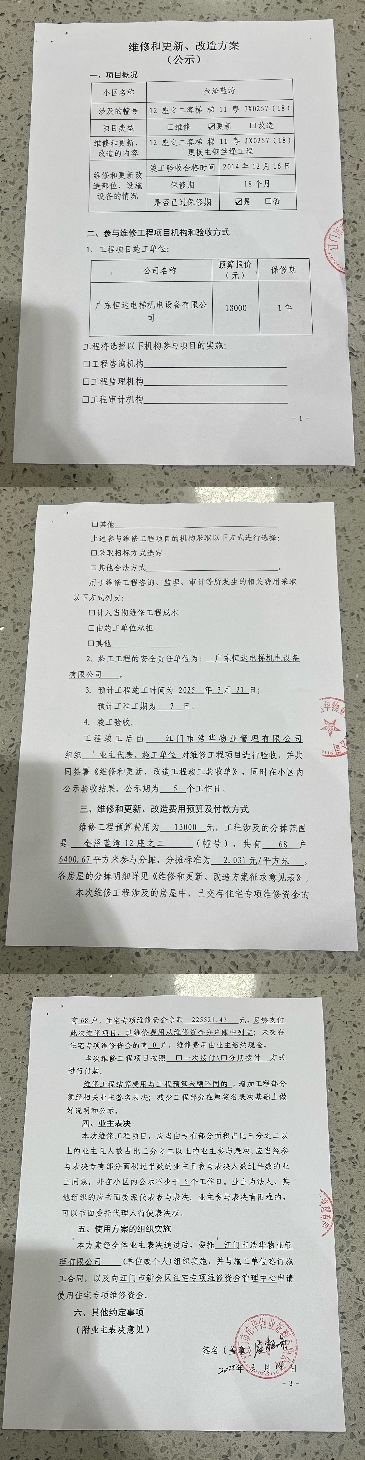 <td VALIGN="top" VALUES="" STYLE="border-width:0" BINDTYPE="0" ROWSPAN="17" COLSPAN="7" DATASOURCE="投票结果" ><font style=" font-family:方正小标宋简体;font-size:14pt;"><p style="line-height: 1.75em;"><span style="font-family: 宋体, SimSun;">各位尊敬的业主:</span><br/></p><p style="text-indent: 2em; line-height: 1.75em;"><span style="font-family: 宋体, SimSun;">根据法律法规的规定,本小区业主利用“江门市物业事项表决管理系统”已对本小区公共事务决策事项进行了表决,在经过7日的询异公示期后,未收到业主有效的异议。现将投票结果公告,并就产生的法律效力说明如下:</span></p><p style="line-height: 1.75em; text-indent: 0em;"><strong style="text-indent: 2em;"><span style="font-family: 宋体, SimSun;">一、投票范围</span></strong></p><p style="text-indent: 2em; line-height: 1.75em;"><span style="font-family: 宋体, SimSun;">金泽蓝湾金泽蓝湾12座之二</span></p><p style="text-indent: 2em; line-height: 1.75em;"><span style="font-family: 宋体, SimSun;">总人数(专有部分人数之和):68</span></p><p style="text-indent: 2em; line-height: 1.75em;"><span style="font-family: 宋体, SimSun;"><span style="font-family: 宋体, SimSun; text-indent: 32px;"><span style="font-family: 宋体; text-indent: 32px;"><span style="font-family: 宋体; text-indent: 32px;">总户数:68</span></span></span></span></p><p style="text-indent: 2em; line-height: 1.75em;"><span style="font-family: 宋体, SimSun;">建筑物总面积(专有部分面积之和):6400.67㎡</span></p><p style="line-height: 1.75em;"><strong><span style="font-family: 宋体, SimSun;">二、投票结果公告时间</span></strong></p><p style="text-indent: 2em; line-height: 1.75em;"><span style="font-family: 宋体, SimSun;"><span style="font-family: 宋体, SimSun; text-indent: 32px;">从2025年04月19日开始</span></span></p><p style="line-height: 1.75em;"><strong><span style="font-family: 宋体, SimSun;">三、计票规则</span></strong></p><p style="text-indent: 2em; line-height: 1.75em;"><span style="font-family: 宋体, SimSun;">表决事项:使用建筑物及其附属设施的维修资金<br /><p style='font-family: 宋体, SimSun;line-height: 1.75em; text-indent: 2em;'>计票规则:弃权票不并入其它项&nbsp;&nbsp;&nbsp;&nbsp;未表决票不并入其它项</p></span></p><p style="line-height: 1.75em;"><strong><span style="font-family: 宋体, SimSun;">四、通过规则</span></strong></p><p style="line-height: 1.75em;"><strong><span style="font-family: 宋体, SimSun;">&nbsp; 根据《中华人民共和国民法典》第二百七十八条规定:业主共同决定事项,应当由专有部分面积占比三分之二以上的业主且人数占比三分之二以上的业主参与表决。</span></strong></p><p style="text-indent: 2em; line-height: 1.75em;"><span style="font-family: 宋体, SimSun;"><span style="font-family: 宋体, SimSun; text-indent: 32px;">表决事项:使用建筑物及其附属设施的维修资金<br /><p style='font-family: 宋体, SimSun;line-height: 1.75em; text-indent: 2em;'>通过规则:双2/3以上参与表决,参与表决双过半同意</p></span></span></p><p style="line-height: 1.75em;"><strong><span style="font-family: 宋体, SimSun;">五、投票结果</span></strong></p><p style="line-height: 1.75em; text-indent: 2em;"><span style="font-family: 宋体, SimSun; text-indent: 2em;"><div id='resultTable'><table style='table-layout: fixed; font-size:12px; margin-top:10px' width='100%' border='0' cellspacing='0' cellpadding='0'><tr><td height='28' colspan='10' align='center' style='border: 1px solid #666'><strong style='font-size: 14px;'> 使用建筑物及其附属设施的维修资金</strong></td> </tr><tr id='trfirst'><td height='28' colspan='4' style='border-left: 1px solid #666; border-bottom: 1px solid #666'><strong>&nbsp;申报单位:</strong> 江门市浩华物业管理有限公司</td><td colspan='3' style='border-left: 1px solid #666; border-bottom: 1px solid #666'><strong>&nbsp;联系方式:</strong> 0750-6892282 </td><td colspan='3' style='border-left: 1px solid #666; border-bottom: 1px solid #666; border-right: 1px solid #666'><strong>&nbsp;申报日期:</strong> 2025年3月14日 </td></tr><tr> <td height='28' colspan='5' style='border-left: 1px solid #666; border-bottom: 1px solid #666'><strong>&nbsp;列支总人数(专有部分人数之和):</strong>68人 </td><td colspan='5' style='border-left: 1px solid #666; border-bottom: 1px solid #666; border-right: 1px solid #666'><strong>&nbsp;列支建筑物总面积(专有部分面积之和):</strong>6400.67㎡ </td> </tr><tr><td height='28' colspan='10' bgcolor='#F3F3F3' style='border-left: 1px solid #666;border-bottom: 1px solid #666;border-right: 1px solid #666'><strong>&nbsp;参与表决人数及面积统计</strong></td></tr><tr><td height='28' colspan='5' style='border-left: 1px solid #666; border-bottom: 1px solid #666'><strong>&nbsp;参与表决人数:</strong>48人</td><td colspan='5' style='border-left: 1px solid #666; border-bottom: 1px solid #666; border-right: 1px solid #666'><strong>&nbsp;参与表决人数占总人数比例:</strong>70.59%</td></tr><tr><td height='28' colspan='5' style='border-left: 1px solid #666; border-bottom: 1px solid #666'><strong>&nbsp;参与表决面积:</strong>4672.14㎡</td><td colspan='5' style='border-left: 1px solid #666; border-bottom: 1px solid #666; border-right: 1px solid #666'><strong>&nbsp;参与表决面积占总面积比例:</strong>72.99%</td></tr><tr><td height='28' colspan='10' bgcolor='#F3F3F3' style='border-left: 1px solid #666; border-bottom: 1px solid #666;border-right: 1px solid #666'> <strong>&nbsp;参与表决同意人数及面积统计</strong></td> </tr><tr><td height='28' colspan='5' style='border-left: 1px solid #666; border-bottom: 1px solid #666'><strong>&nbsp;参与表决同意人数:</strong>45人 </td><td colspan='5' style='border-left: 1px solid #666;