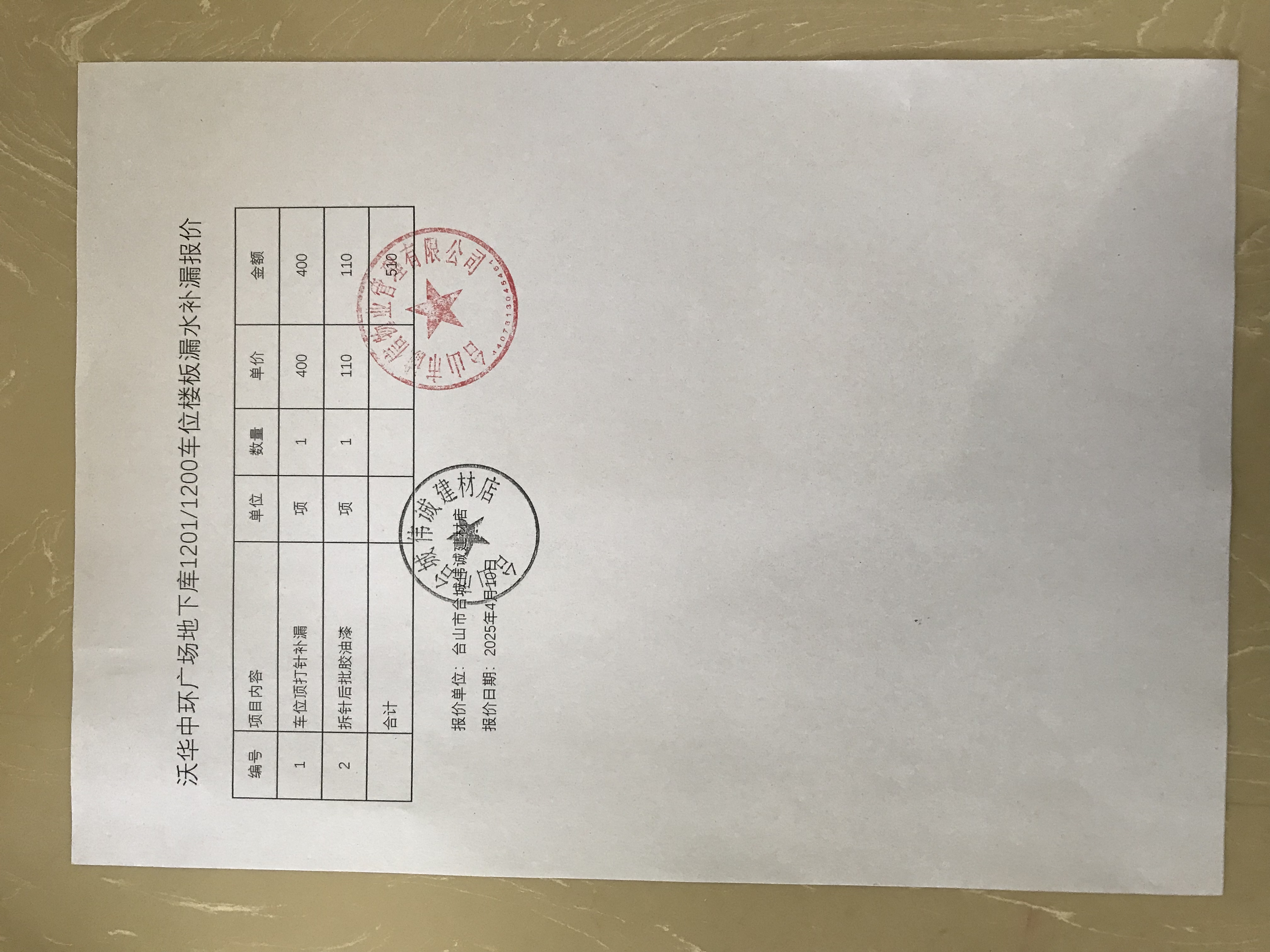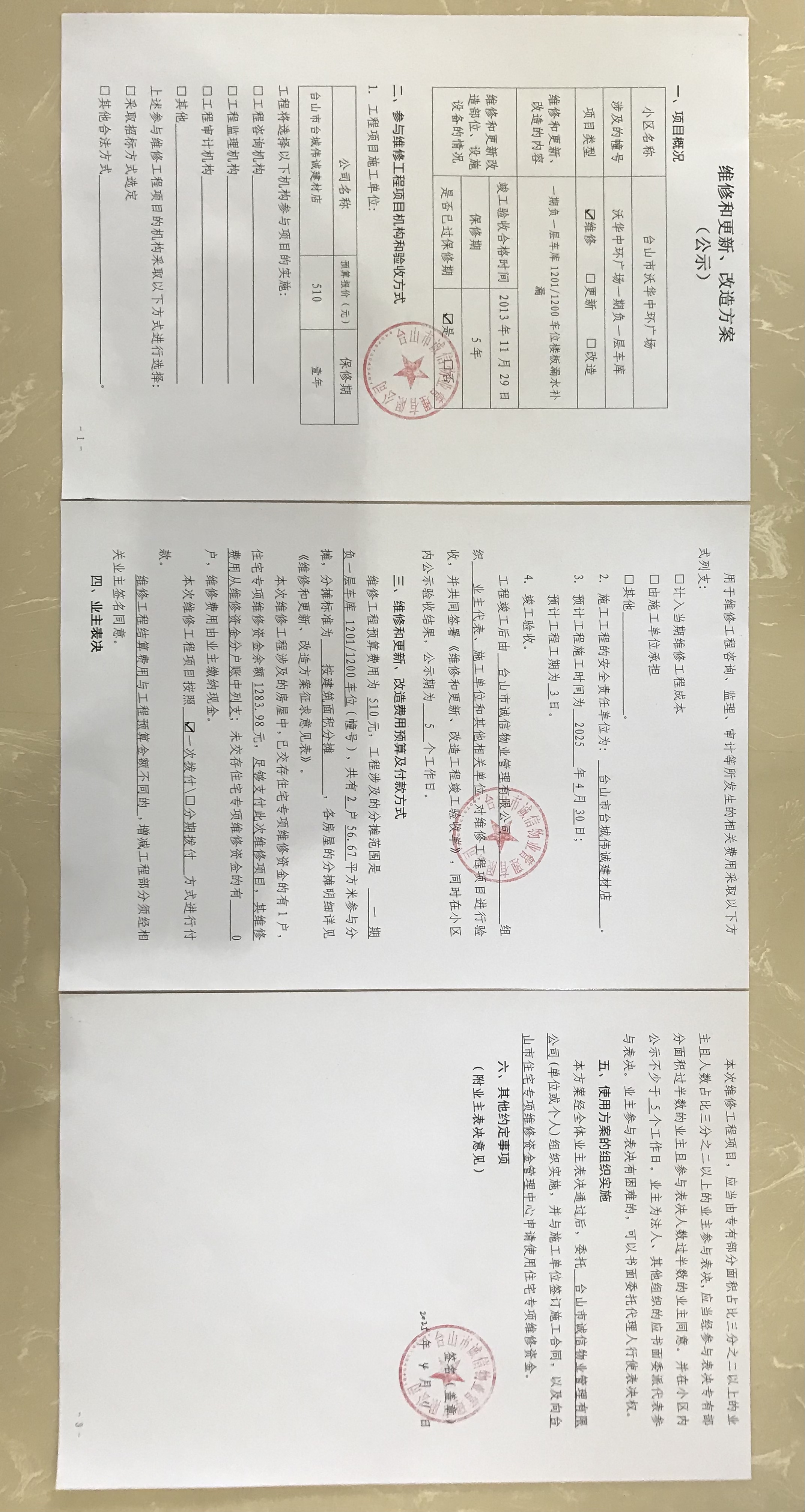 <td VALIGN="top" VALUES="" STYLE="border-width:0" BINDTYPE="0" ROWSPAN="19" COLSPAN="7" DATASOURCE="投票结果" ><font style="font-size:14pt;"><p style="white-space: normal; font-family: 宋体; line-height: 1.75em;">台山沃华中环广场沃华·中环广场一期负一层车库全体业主:</p><p style="white-space: normal; font-family: 宋体; line-height: 1.75em; text-indent: 2em;">本小区关于一期负一层车库1201/1200车位楼板漏水补漏使用维修资金投票的投票已表决结束,询异时间从2025年04月25日开始,投票询异公示期间,业主可通过微信查询自己的表决情况或可凭身份证件申请查询自己的表决情况;如公示的业主表决情况与查询的本人表决意见不一致的,可以以书面形式向投票组织机构申诉,投票组织机构予以纠正并重新公示表决结果。异议提出人对投票组织机构的处理仍有异议的,可以向街道办事处(镇人民政府)反映处理,涉及住宅专项维修资金的,可向属地住宅专项维修资金管理中心反映处理。</p><p style="white-space: normal;"><br/></p><p style="white-space: normal; font-family: 宋体; line-height: 1.75em;"><strong>附件:</strong></p><p style="white-space: normal; font-family: 宋体; line-height: 1.75em;"><strong>一、投票范围</strong></p><p style="white-space: normal; font-family: 宋体; line-height: 1.75em; text-indent: 2em;">台山沃华中环广场沃华·中环广场一期负一层车库</p><p style="white-space: normal; font-family: 宋体; line-height: 1.75em; text-indent: 2em;">总人数(专有部分人数之和):2</p><p style="white-space: normal; font-family: 宋体; line-height: 1.75em; text-indent: 2em;"><span style="font-family: 宋体, SimSun;"><span style="font-family: 宋体; text-indent: 32px;"><span style="font-family: 宋体; text-indent: 32px;">总户数:2</span></span></span></p><p style="white-space: normal; font-family: 宋体; line-height: 1.75em; text-indent: 2em;">建筑物总面积(专有部分面积之和):56.67㎡</p><p style="white-space: normal; font-family: 宋体; line-height: 1.75em;"><strong>二、询异公示起止时间</strong></p><p dir="ltr" style="white-space: normal; font-family: 宋体; line-height: 1.75em; text-indent: 2em;"><span style="text-indent: 36px;">2025年04月25日至2025年05月05日</span></p><p style="white-space: normal; font-family: 宋体; line-height: 1.75em;"><strong>三、投票详细描述</strong></p><p style="white-space: normal; font-family: 宋体; line-height: 1.75em; text-indent: 2em;"><p> 小区一期负一层车库1201/1200车位楼板漏水,影响正常使用。 </p><p> 现对一期负一层车库1201/1200车位楼板漏水补漏,工程维修预算金额为510元,项目最终费用以施工合同签订金额为准。因已过保修期,维修费用由相关业主按建筑面积分摊,每平方约9.00元,详见公示附件。如业主手机不能正常通过微信投票,请联系物业公司进行线下纸质投票,物业电话:0750-5555839、5555819。</p><p><br/></p></p><p style="white-space: normal; font-family: 宋体; line-height: 1.75em;"><strong>四、计票规则</strong></p><p style="white-space: normal; font-family: 宋体; line-height: 1.75em; text-indent: 2em;">表决事项:使用建筑物及其附属设施的维修资金<br /><p style='text-align: left; font-family: 宋体; font-size: 16px; line-height: 1.75em; text-indent: 2em;'>计票规则:弃权票不并入其它项 未表决票不并入其它项</p></p><p style="white-space: normal; font-family: 宋体; line-height: 1.75em;"><strong>五、通过规则</strong></p><p style="white-space: normal; font-family: 宋体; line-height: 1.75em;"><strong><strong style="white-space: normal;"><span style="font-family: 宋体, SimSun;"> 根据《中华人民共和国民法典》第二百七十八条规定:业主共同决定事项,应当由专有部分面积占比三分之二以上的业主且人数占比三分之二以上的业主参与表决。</span></strong></strong></p><p style="white-space: normal; font-family: 宋体; line-height: 1.75em; text-indent: 2em;">表决事项:使用建筑物及其附属设施的维修资金<br /><p style='text-align: left; font-family: 宋体; font-size: 16px; line-height: 1.75em; text-indent: 2em;'>通过规则:双2/3以上参与表决,参与表决双过半同意</p></p><p style="white-space: normal; font-family: 宋体; line-height: 1.75em;"><strong>六、投票结果</strong></p><p style="white-space: normal; font-family: 宋体; line-height: 1.75em; text-indent: 2em;"><div id='resultTable'><table style='table-layout: fixed; font-size:12px; margin-top:10px' width='100%' border='0' cellspacing='0' cellpadding='0'><tr><td height='28' colspan='10' align='center' style='border: 1px solid #666'><strong style='font-size: 14px;'> 使用建筑物及其附属设施的维修资金</strong></td> </tr><tr id='trfirst'><td height='28' colspan='4' style='border-left: 1px solid #666; border-bottom: 1px solid #666'><strong> 申报单位:</strong> 台山市诚信物业管理有限公司</td><td colspan='3' style='border-left: 1px solid #666; border-bottom: 1px solid #666'><strong> 联系方式:</strong> 5555819 </td><td colspan='3' style='border-left: 1px solid #666; border-bottom: 1px solid #666; border-right: 1px solid #666'><strong> 申报日期:</strong> 2025年4月14日 </td></tr><tr> <td height='28' colspan='5' style='border-left: 1px solid #666; border-bottom: 1px solid #666'><strong> 总人数(专有部分人数之和):</strong>2人 </td><td colspan='5' style='border-left: 1px solid #666; border-bottom: 1px solid #666; border-right: 1px solid #666'><strong> 建筑物总面积(专有部分面积之和):</strong>56.67㎡ </td> </tr><tr><td height='28' colspan='10' bgcolor='#F3F3F3' style='border-left: 1px solid #666;border-bottom: 1px solid #666;border-right: 1px solid #666'><strong> 参与人数及面积统计</strong></td></tr><tr><td height='28' colspan='5' style