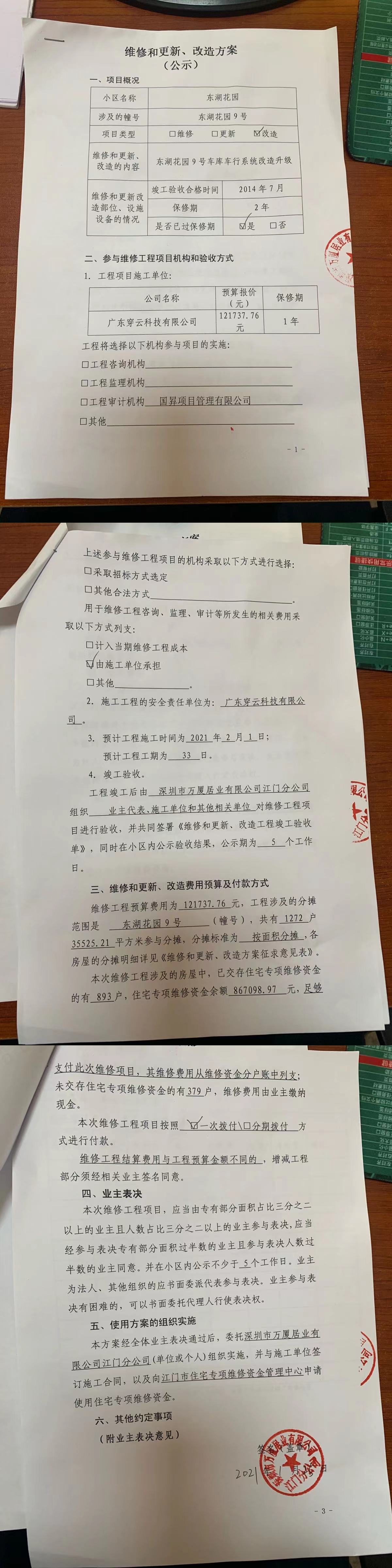 <td VALIGN="top" VALUES="" STYLE="border-width:0" BINDTYPE="0" ROWSPAN="17" COLSPAN="7" DATASOURCE="投票结果" ><font style=" font-family:方正小标宋简体;font-size:14pt;"><p style="line-height: 1.75em;"><span style="font-family: 宋体, SimSun;">各位尊敬的业主:</span><br/></p><p style="text-indent: 2em; line-height: 1.75em;"><span style="font-family: 宋体, SimSun;">根据法律法规的规定,本小区业主利用“物业公共事务决策系统”已对本小区公共事务决策事项进行了表决,在经过7日的询异公示期后,未收到业主有效的异议。现将投票结果公告,并就产生的法律效力说明如下:</span></p><p style="line-height: 1.75em; text-indent: 0em;"><strong style="text-indent: 2em;"><span style="font-family: 宋体, SimSun;">一、投票范围</span></strong></p><p style="text-indent: 2em; line-height: 1.75em;"><span style="font-family: 宋体, SimSun;">天安东湖花园天安东湖花园9号</span></p><p style="text-indent: 2em; line-height: 1.75em;"><span style="font-family: 宋体, SimSun;">总人数(专有部分人数之和):549</span></p><p style="text-indent: 2em; line-height: 1.75em;"><span style="font-family: 宋体, SimSun;">建筑物总面积(专有部分面积之和):35525.21㎡</span></p><p style="line-height: 1.75em;"><strong><span style="font-family: 宋体, SimSun;">二、投票起止时间</span></strong></p><p style="text-indent: 2em; line-height: 1.75em;"><span style="font-family: 宋体, SimSun;">投票表决时间:从2021年12月13日到2022年01月13日止</span></p><p style="text-indent: 2em; line-height: 1.75em;"><span style="font-family: 宋体, SimSun;">投票询异公示时间:从2022年01月14日开始</span></p><p style="text-indent: 2em; line-height: 1.75em;"><span style="font-family: 宋体, SimSun;">投票结果通知公告时间:从2022年01月21日开始</span></p><p style="line-height: 1.75em;"><strong><span style="font-family: 宋体, SimSun;">三、计票规则</span></strong></p><p style="text-indent: 2em; line-height: 1.75em;"><span style="font-family: 宋体, SimSun;">表决事项:使用建筑物及其附属设施的维修资金<br /><p style='font-family: 宋体, SimSun;line-height: 1.75em; text-indent: 2em;'>计票规则:弃权票不并入其它项</p></span></p><p style="line-height: 1.75em;"><strong><span style="font-family: 宋体, SimSun;">四、通过规则</span></strong></p><p style="text-indent: 2em; line-height: 1.75em;"><span style="font-family: 宋体, SimSun;"><span style="font-family: 宋体, SimSun; text-indent: 32px;">表决事项:使用建筑物及其附属设施的维修资金<br /><p style='font-family: 宋体, SimSun;line-height: 1.75em; text-indent: 2em;'>通过规则:双三分之二以上参与表决,并经参与表决双过半数以上同意</p></span></span></p><p style="line-height: 1.75em;"><strong><span style="font-family: 宋体, SimSun;">五、投票结果</span></strong></p><p style="line-height: 1.75em; text-indent: 2em;"><span style="font-family: 宋体, SimSun; text-indent: 2em;"><div id='resultTable'><table style='table-layout: fixed; font-size:12px; margin-top:10px' width='100%' border='0' cellspacing='0' cellpadding='0'><tr><td height='28' colspan='10' align='center' style='border: 1px solid #666'><strong style='font-size: 14px;'> 使用建筑物及其附属设施的维修资金</strong></td> </tr><tr id='trfirst'><td height='28' colspan='4' style='border-left: 1px solid #666; border-bottom: 1px solid #666'><strong>&nbsp;申报单位:</strong> 深圳市万厦居业有限公司江门分公司</td><td colspan='3' style='border-left: 1px solid #666; border-bottom: 1px solid #666'><strong>&nbsp;联系方式:</strong> 0750-3118111 </td><td colspan='3' style='border-left: 1px solid #666; border-bottom: 1px solid #666; border-right: 1px solid #666'><strong>&nbsp;申报日期:</strong> 2021年12月6日 </td></tr><tr> <td height='28' colspan='5' style='border-left: 1px solid #666; border-bottom: 1px solid #666'><strong>&nbsp;总人数(专有部分人数之和):</strong>549人 </td><td colspan='5' style='border-left: 1px solid #666; border-bottom: 1px solid #666; border-right: 1px solid #666'><strong>&nbsp;建筑物总面积(专有部分面积之和):</strong>35525.21㎡ </td> </tr><tr><td height='28' colspan='10' style='border: 1px solid #666'><strong>&nbsp;该事项表决是否通过:未通过</strong></td></tr><tr><td height='28' colspan='10' bgcolor='#F3F3F3' style='border-left: 1px solid #666;border-bottom: 1px solid #666;border-right: 1px solid #666'><strong>&nbsp;参与人数及面积统计</strong></td></tr><tr><td height='28' colspan='5' style='border-left: 1px solid #666; border-bottom: 1px solid #666'><strong>&nbsp;参与表决专有部分人数之和:</strong>5人</td><td colspan='5' style='border-left: 1px solid #666; border-bottom: 1px solid #666; border-right: 1px solid #666'><strong>&nbsp;参与表决占有表决权总人数比例:</strong>0.91%</td></tr><tr><td height='28' colspan='5' style='border-left: 1px solid #666; border-bottom: 1px solid #666'><strong>&nbsp;参与表决专有部分面积之和:</strong>627.49㎡</td><td colspan='5' style='border-left: 1px solid #666; border-bottom: 1px solid #666; border-right: 1px solid #666'><strong>&nbsp;参与表决占有表决权总面积比例:</strong>1.77%</td></tr><tr><td height='28' colspan='10' bgcolor='#F3F3F3' style='border-left: 1px solid #666; border-bottom: 1px solid #666;border-right: 1px solid #666'> <strong>&nbsp;未参与人数及面积统计</strong></td> </tr><tr><td height='28' colspan='5' style='border-left: 1px solid #666; border-bottom: 1px solid #666'><strong>&nbsp;未参与表决专有部分人数之和:</strong>544人 </td><td colspan='5' style='border-left: 1px solid #666; border-bottom: 1px solid #666; border-right: 1px solid #666'><strong>&nbsp;未参与表决占有表决权总人数比例:</strong>99.09%</td></tr><tr><td height='28' colspan='5' style='border-left: 1px sol