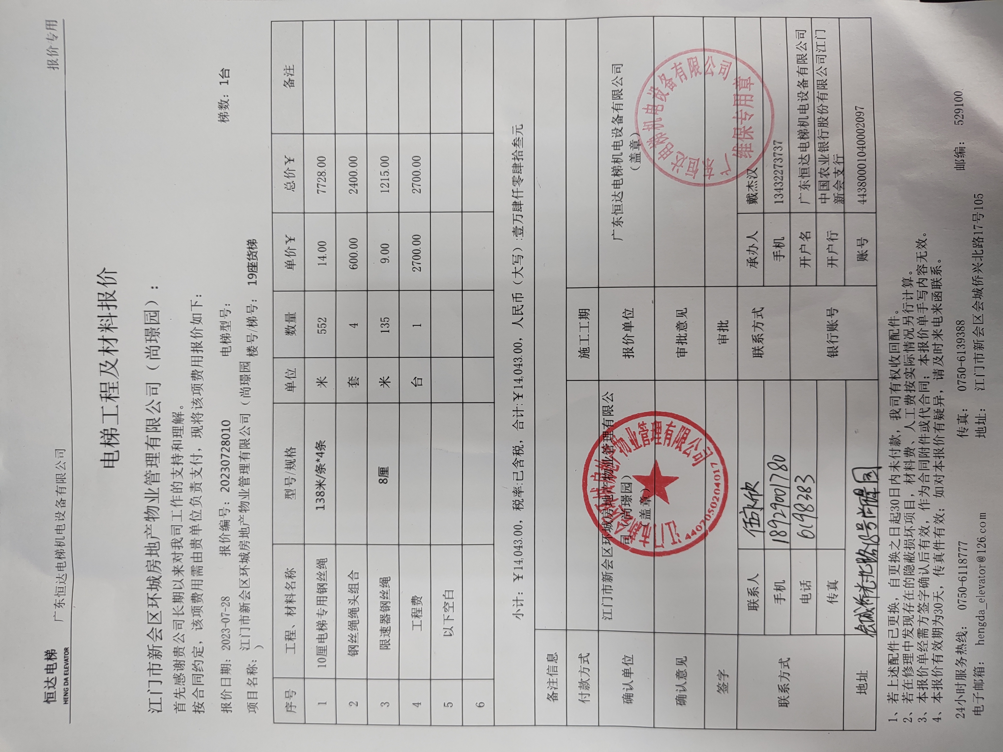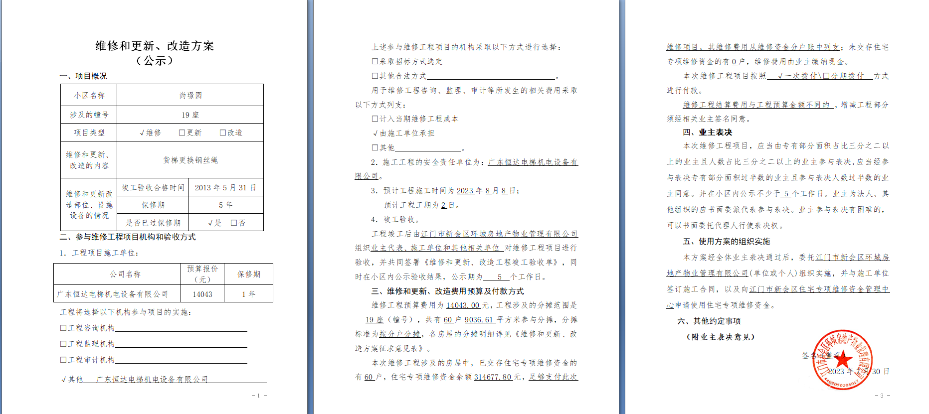 <td VALIGN="top" VALUES="" STYLE="border-width:0" BINDTYPE="0" ROWSPAN="19" COLSPAN="7" DATASOURCE="投票结果" ><font style="font-size:14pt;"><p style="white-space: normal; font-family: 宋体; line-height: 1.75em;">尚璟园尚璟园19座全体业主:</p><p style="white-space: normal; font-family: 宋体; line-height: 1.75em; text-indent: 2em;">本小区关于尚璟园19座货梯更换钢丝绳使用维修资金的投票的投票已表决结束,询异时间从2023年08月10日开始,投票询异公示期间,业主可通过微信查询自己的表决情况或可凭身份证件申请查询自己的表决情况;如公示的业主表决情况与查询的本人表决意见不一致的,可以以书面形式向投票组织机构申诉,投票组织机构予以纠正并重新公示表决结果。异议提出人对投票组织机构的处理仍有异议的,可以向街道办事处(镇人民政府)反映处理,涉及住宅专项维修资金的,可向属地住宅专项维修资金管理中心反映处理。</p><p style="white-space: normal;"><br/></p><p style="white-space: normal; font-family: 宋体; line-height: 1.75em;"><strong>附件:</strong></p><p style="white-space: normal; font-family: 宋体; line-height: 1.75em;"><strong>一、投票范围</strong></p><p style="white-space: normal; font-family: 宋体; line-height: 1.75em; text-indent: 2em;">尚璟园尚璟园19座</p><p style="white-space: normal; font-family: 宋体; line-height: 1.75em; text-indent: 2em;">总人数(专有部分人数之和):60</p><p style="white-space: normal; font-family: 宋体; line-height: 1.75em; text-indent: 2em;"><span style="font-family: 宋体, SimSun;">总户数:60</span></p><p style="white-space: normal; font-family: 宋体; line-height: 1.75em; text-indent: 2em;">建筑物总面积(专有部分面积之和):9036.61㎡</p><p style="white-space: normal; font-family: 宋体; line-height: 1.75em;"><strong>二、询异公示起止时间</strong></p><p dir="ltr" style="white-space: normal; font-family: 宋体; line-height: 1.75em; text-indent: 2em;"><span style="text-indent: 36px;">2023年08月10日至2023年08月16日</span></p><p style="white-space: normal; font-family: 宋体; line-height: 1.75em;"><strong>三、投票详细描述</strong></p><p style="white-space: normal; font-family: 宋体; line-height: 1.75em; text-indent: 2em;"><p>本小区19座货梯出现异常,经检查,是由于钢丝绳爆股造成。现需申请使用维修资金对19座货梯维修,工程维修预算金额为 14043.00 元,项目最终费用以施工合同签订金额为准。维修费用的分摊标准为按每户234.05元,详见公示附件。物业公司联系电话:0750-6198383。</p></p><p style="white-space: normal; font-family: 宋体; line-height: 1.75em;"><strong>四、计票规则</strong></p><p style="white-space: normal; font-family: 宋体; line-height: 1.75em; text-indent: 2em;">表决事项:使用建筑物及其附属设施的维修资金<br /><p style='text-align: left; font-family: 宋体; font-size: 16px; line-height: 1.75em; text-indent: 2em;'>计票规则:弃权票不并入其它项 未表决票不并入其它项</p></p><p style="white-space: normal; font-family: 宋体; line-height: 1.75em;"><strong>五、通过规则</strong></p><p style="white-space: normal; font-family: 宋体; line-height: 1.75em; text-indent: 2em;">表决事项:使用建筑物及其附属设施的维修资金<br /><p style='text-align: left; font-family: 宋体; font-size: 16px; line-height: 1.75em; text-indent: 2em;'>通过规则:参与表决专有部分面积过半数的业主且参与表决人数过半数的业主同意</p></p><p style="white-space: normal; font-family: 宋体; line-height: 1.75em;"><strong>六、投票结果</strong></p><p style="white-space: normal; font-family: 宋体; line-height: 1.75em; text-indent: 2em;"><div id='resultTable'><table style='table-layout: fixed; font-size:12px; margin-top:10px' width='100%' border='0' cellspacing='0' cellpadding='0'><tr><td height='28' colspan='10' align='center' style='border: 1px solid #666'><strong style='font-size: 14px;'> 使用建筑物及其附属设施的维修资金</strong></td> </tr><tr id='trfirst'><td height='28' colspan='4' style='border-left: 1px solid #666; border-bottom: 1px solid #666'><strong> 申报单位:</strong> 新会区环城房地产物业管理有限公司</td><td colspan='3' style='border-left: 1px solid #666; border-bottom: 1px solid #666'><strong> 联系方式:</strong> </td><td colspan='3' style='border-left: 1px solid #666; border-bottom: 1px solid #666; border-right: 1px solid #666'><strong> 申报日期:</strong> 2023年7月31日 </td></tr><tr> <td height='28' colspan='5' style='border-left: 1px solid #666; border-bottom: 1px solid #666'><strong> 总人数(专有部分人数之和):</strong>60人 </td><td colspan='5' style='border-left: 1px solid #666; border-bottom: 1px solid #666; border-right: 1px solid #666'><strong> 建筑物总面积(专有部分面积之和):</strong>9036.61㎡ </td> </tr><tr><td height='28' colspan='10' bgcolor='#F3F3F3' style='border-left: 1px solid #666;border-bottom: 1px solid #666;border-right: 1px solid #666'><strong> 参与人数及面积统计</strong></td></tr><tr><td height='28' colspan='5' style='border-left: 1px solid #666; border-bottom: 1px solid #666'><strong> 参与表决专有部分人数之和:</strong>45人</td><td colspan='5' style='border-left: 1px solid #666; border-bottom: 1px solid #666; border-right: 1px solid #666'><strong> 参与表决占有表决权总人数比例:</strong>75.00%</td></tr><tr><td height='28' colspan='5' style='border-left: 1px solid #666; border-bottom: 1px solid #666'><strong> 参与表决专有部分面积之和:</strong>6888.15㎡</td><td colspan='5' style='border-left: 1px solid #666; border-bottom: 1px solid #666; border-right: 1px solid #666'><strong> 参与表决占有表决权总面积比例:</strong>76.22%</td></tr><tr><td height='28' colspan='10' bgcolor='#F3F3F3' styl
