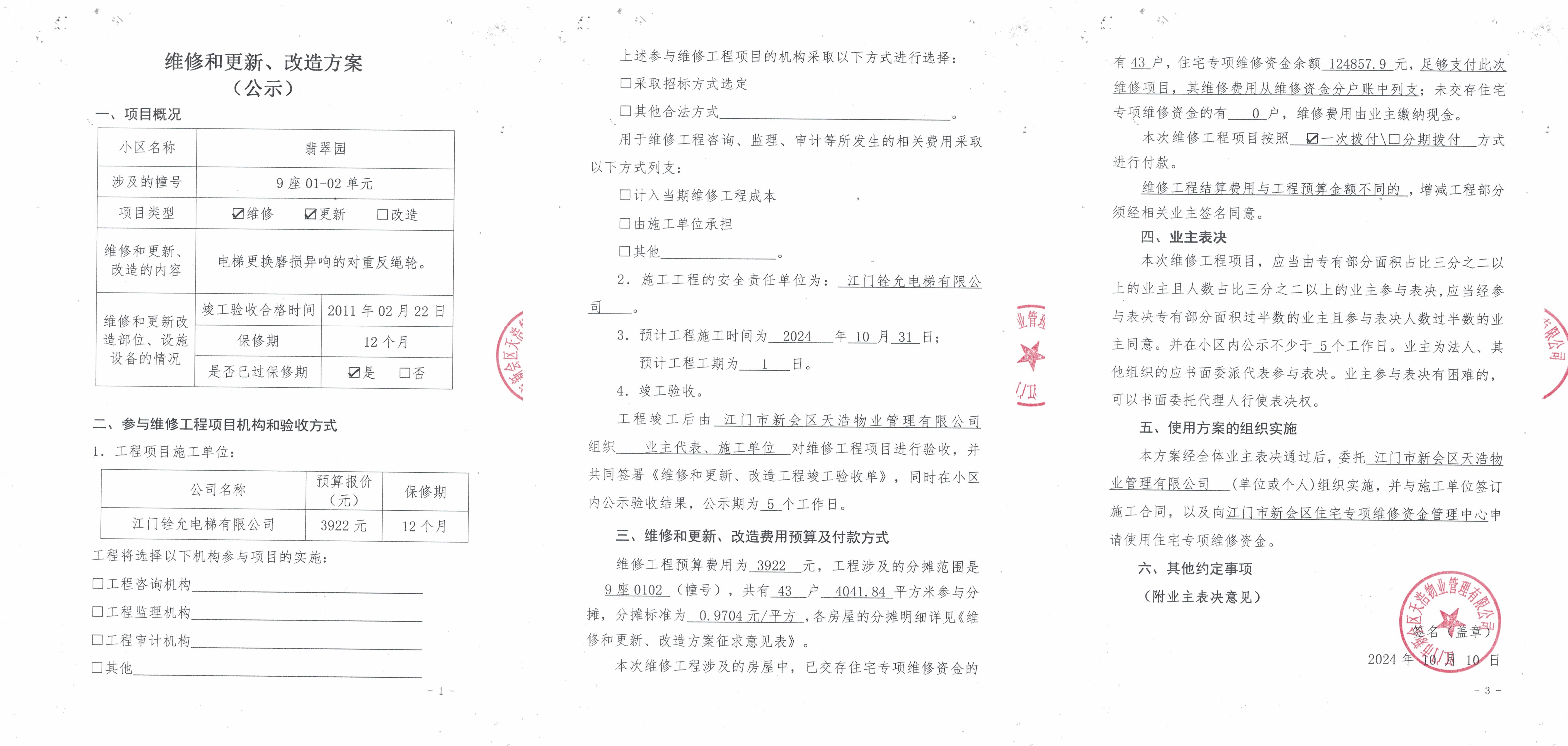 <td VALIGN="top" VALUES="" STYLE="border-width:0" BINDTYPE="0" ROWSPAN="17" COLSPAN="7" DATASOURCE="投票结果" ><font style=" font-family:方正小标宋简体;font-size:14pt;"><p style="line-height: 1.75em;"><span style="font-family: 宋体, SimSun;">各位尊敬的业主:</span><br/></p><p style="text-indent: 2em; line-height: 1.75em;"><span style="font-family: 宋体, SimSun;">根据法律法规的规定,本小区业主利用“江门市物业事项表决管理系统”已对本小区公共事务决策事项进行了表决,在经过7日的询异公示期后,未收到业主有效的异议。现将投票结果公告,并就产生的法律效力说明如下:</span></p><p style="line-height: 1.75em; text-indent: 0em;"><strong style="text-indent: 2em;"><span style="font-family: 宋体, SimSun;">一、投票范围</span></strong></p><p style="text-indent: 2em; line-height: 1.75em;"><span style="font-family: 宋体, SimSun;">翡翠园翡翠园9座</span></p><p style="text-indent: 2em; line-height: 1.75em;"><span style="font-family: 宋体, SimSun;">总人数(专有部分人数之和):24</span></p><p style="text-indent: 2em; line-height: 1.75em;"><span style="font-family: 宋体, SimSun;"><span style="font-family: 宋体, SimSun; text-indent: 32px;"><span style="font-family: 宋体; text-indent: 32px;"><span style="font-family: 宋体; text-indent: 32px;">总户数:43</span></span></span></span></p><p style="text-indent: 2em; line-height: 1.75em;"><span style="font-family: 宋体, SimSun;">建筑物总面积(专有部分面积之和):4041.84㎡</span></p><p style="line-height: 1.75em;"><strong><span style="font-family: 宋体, SimSun;">二、投票结果公告时间</span></strong></p><p style="text-indent: 2em; line-height: 1.75em;"><span style="font-family: 宋体, SimSun;"><span style="font-family: 宋体, SimSun; text-indent: 32px;">从2024年11月02日开始</span></span></p><p style="line-height: 1.75em;"><strong><span style="font-family: 宋体, SimSun;">三、计票规则</span></strong></p><p style="text-indent: 2em; line-height: 1.75em;"><span style="font-family: 宋体, SimSun;">表决事项:使用建筑物及其附属设施的维修资金<br /><p style='font-family: 宋体, SimSun;line-height: 1.75em; text-indent: 2em;'>计票规则:弃权票不并入其它项&nbsp;&nbsp;&nbsp;&nbsp;未表决票不并入其它项</p></span></p><p style="line-height: 1.75em;"><strong><span style="font-family: 宋体, SimSun;">四、通过规则</span></strong></p><p style="line-height: 1.75em;"><strong><span style="font-family: 宋体, SimSun;">&nbsp; 根据《中华人民共和国民法典》第二百七十八条规定:业主共同决定事项,应当由专有部分面积占比三分之二以上的业主且人数占比三分之二以上的业主参与表决。</span></strong></p><p style="text-indent: 2em; line-height: 1.75em;"><span style="font-family: 宋体, SimSun;"><span style="font-family: 宋体, SimSun; text-indent: 32px;">表决事项:使用建筑物及其附属设施的维修资金<br /><p style='font-family: 宋体, SimSun;line-height: 1.75em; text-indent: 2em;'>通过规则:双2/3以上参与表决,参与表决双过半同意</p></span></span></p><p style="line-height: 1.75em;"><strong><span style="font-family: 宋体, SimSun;">五、投票结果</span></strong></p><p style="line-height: 1.75em; text-indent: 2em;"><span style="font-family: 宋体, SimSun; text-indent: 2em;"><div id='resultTable'><table style='table-layout: fixed; font-size:12px; margin-top:10px' width='100%' border='0' cellspacing='0' cellpadding='0'><tr><td height='28' colspan='10' align='center' style='border: 1px solid #666'><strong style='font-size: 14px;'> 使用建筑物及其附属设施的维修资金</strong></td> </tr><tr id='trfirst'><td height='28' colspan='4' style='border-left: 1px solid #666; border-bottom: 1px solid #666'><strong>&nbsp;申报单位:</strong> 江门市新会区天浩物业管理有限公司</td><td colspan='3' style='border-left: 1px solid #666; border-bottom: 1px solid #666'><strong>&nbsp;联系方式:</strong> </td><td colspan='3' style='border-left: 1px solid #666; border-bottom: 1px solid #666; border-right: 1px solid #666'><strong>&nbsp;申报日期:</strong> 2024年10月10日 </td></tr><tr> <td height='28' colspan='5' style='border-left: 1px solid #666; border-bottom: 1px solid #666'><strong>&nbsp;列支总人数(专有部分人数之和):</strong>24人 </td><td colspan='5' style='border-left: 1px solid #666; border-bottom: 1px solid #666; border-right: 1px solid #666'><strong>&nbsp;列支建筑物总面积(专有部分面积之和):</strong>4041.84㎡ </td> </tr><tr><td height='28' colspan='10' bgcolor='#F3F3F3' style='border-left: 1px solid #666;border-bottom: 1px solid #666;border-right: 1px solid #666'><strong>&nbsp;参与表决人数及面积统计</strong></td></tr><tr><td height='28' colspan='5' style='border-left: 1px solid #666; border-bottom: 1px solid #666'><strong>&nbsp;参与表决人数:</strong>18人</td><td colspan='5' style='border-left: 1px solid #666; border-bottom: 1px solid #666; border-right: 1px solid #666'><strong>&nbsp;参与表决人数占总人数比例:</strong>75.00%</td></tr><tr><td height='28' colspan='5' style='border-left: 1px solid #666; border-bottom: 1px solid #666'><strong>&nbsp;参与表决面积:</strong>2996.87㎡</td><td colspan='5' style='border-left: 1px solid #666; border-bottom: 1px solid #666; border-right: 1px solid #666'><strong>&nbsp;参与表决面积占总面积比例:</strong>74.15%</td></tr><tr><td height='28' colspan='10' bgcolor='#F3F3F3' style='border-left: 1px solid #666; border-bottom: 1px solid #666;border-right: 1px solid #666'> <strong>&nbsp;参与表决同意人数及面积统计</strong></td> </tr><tr><td height='28' colspan='5' style='border-left: 1px solid #666; border-bottom: 1px solid #666'><strong>&nbsp;参与表决同意人数:</strong>17人 </td><td colspan='5' style='border-left: 1px solid #666; border-bottom: 