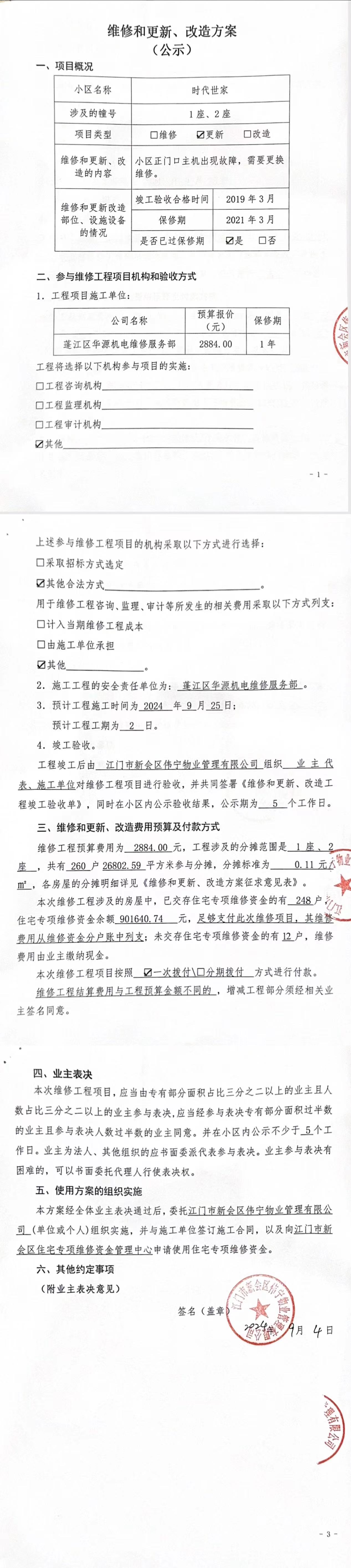 <td valign="top" values="" style="border-width:0" bindtype="0" rowspan="17" colspan="7" datasource="投票结果"><font style=" font-family:方正小标宋简体;font-size:14pt;"><p style="line-height: 1.75em;"><span style="font-family: 宋体, SimSun;">各位尊敬的业主:</span><br></p><p style="text-indent: 2em; line-height: 1.75em;"><span style="font-family: 宋体, SimSun;">根据法律法规的规定,本小区业主利用“江门市物业事项表决管理系统”已对本小区公共事务决策事项进行了表决,在经过7日的询异公示期后,未收到业主有效的异议。现将投票结果公告,并就产生的法律效力说明如下:</span></p><p style="line-height: 1.75em; text-indent: 0em;"><strong style="text-indent: 2em;"><span style="font-family: 宋体, SimSun;">一、投票范围</span></strong></p><p style="text-indent: 2em; line-height: 1.75em;"><span style="font-family: 宋体, SimSun;">时代世家1座、2座</span></p><p style="text-indent: 2em; line-height: 1.75em;"><span style="font-family: 宋体, SimSun;">总人数(专有部分人数之和):258</span></p><p style="text-indent: 2em; line-height: 1.75em;"><span style="font-family: 宋体, SimSun;"><span style="font-family: 宋体, SimSun; text-indent: 32px;"><span style="font-family: 宋体; text-indent: 32px;"><span style="font-family: 宋体; text-indent: 32px;">总户数:260</span></span></span></span></p><p style="text-indent: 2em; line-height: 1.75em;"><span style="font-family: 宋体, SimSun;">建筑物总面积(专有部分面积之和):26802.59㎡</span></p><p style="line-height: 1.75em;"><strong><span style="font-family: 宋体, SimSun;">二、投票结果公告时间</span></strong></p><p style="text-indent: 2em; line-height: 1.75em;"><span style="font-family: 宋体, SimSun;"><span style="font-family: 宋体, SimSun; text-indent: 32px;">从2024年09月26日开始</span></span></p><p style="line-height: 1.75em;"><strong><span style="font-family: 宋体, SimSun;">三、计票规则</span></strong></p><p style="text-indent: 2em; line-height: 1.75em;"><span style="font-family: 宋体, SimSun;">表决事项:使用建筑物及其附属设施的维修资金<br></span></p><p style="font-family: 宋体, SimSun;line-height: 1.75em; text-indent: 2em;">计票规则:弃权票不并入其它项 未表决票不并入其它项</p><p></p><p style="line-height: 1.75em;"><strong><span style="font-family: 宋体, SimSun;">四、通过规则</span></strong></p><p style="line-height: 1.75em;"><strong><span style="font-family: 宋体, SimSun;"> 根据《中华人民共和国民法典》第二百七十八条规定:业主共同决定事项,应当由专有部分面积占比三分之二以上的业主且人数占比三分之二以上的业主参与表决。</span></strong></p><p style="text-indent: 2em; line-height: 1.75em;"><span style="font-family: 宋体, SimSun;"><span style="font-family: 宋体, SimSun; text-indent: 32px;">表决事项:使用建筑物及其附属设施的维修资金<br></span></span></p><p style="font-family: 宋体, SimSun;line-height: 1.75em; text-indent: 2em;">通过规则:双2/3以上参与表决,参与表决双过半同意</p><p></p><p style="line-height: 1.75em;"><strong><span style="font-family: 宋体, SimSun;">五、投票结果</span></strong></p><p style="line-height: 1.75em; text-indent: 2em;"><span style="font-family: 宋体, SimSun; text-indent: 2em;"></span></p><div id="resultTable"><table style="table-layout: fixed; font-size:12px; margin-top:10px" width="100%" border="0" cellspacing="0" cellpadding="0"><tbody><tr><td height="28" colspan="10" align="center" style="border: 1px solid #666"><strong style="font-size: 14px;"> 使用建筑物及其附属设施的维修资金</strong></td> </tr><tr id="trfirst"><td height="28" colspan="4" style="border-left: 1px solid #666; border-bottom: 1px solid #666"><strong> 申报单位:</strong> 江门市新会区伟宁物业管理有限公司</td><td colspan="3" style="border-left: 1px solid #666; border-bottom: 1px solid #666"><strong> 联系方式:</strong> 6109605 </td><td colspan="3" style="border-left: 1px solid #666; border-bottom: 1px solid #666; border-right: 1px solid #666"><strong> 申报日期:</strong> 2024年9月10日 </td></tr><tr> <td height="28" colspan="5" style="border-left: 1px solid #666; border-bottom: 1px solid #666"><strong> 总人数(专有部分人数之和):</strong>258人 </td><td colspan="5" style="border-left: 1px solid #666; border-bottom: 1px solid #666; border-right: 1px solid #666"><strong> 建筑物总面积(专有部分面积之和):</strong>26802.59㎡ </td> </tr><tr><td height="28" colspan="10" bgcolor="#F3F3F3" style="border-left: 1px solid #666;border-bottom: 1px solid #666;border-right: 1px solid #666"><strong> 参与表决人数及面积统计</strong></td></tr><tr><td height="28" colspan="5" style="border-left: 1px solid #666; border-bottom: 1px solid #666"><strong> 参与表决人数:</strong>51人</td><td colspan="5" style="border-left: 1px solid #666; border-bottom: 1px solid #666; border-right: 1px solid #666"><strong> 参与表决人数占总人数比例:</strong>19.77%</td></tr><tr><td height="28" colspan="5" style="border-left: 1px solid #666; border-bottom: 1px solid #666"><strong> 参与表决面积:</strong>5293.92㎡</td><td colspan="5" style="border-left: 1px solid #666; border-bottom: 1px solid #666; border-right: 1px solid #666"><strong> 参与表决面积占总面积比例:</strong>19.75%</td></tr><tr><td height="28" colspan="10" bgcolor="#F3F3F3" style="border-left: 1px solid #666; border-bottom: 1px solid #666;border-right: 1px solid #666"> <strong> 参与表决同意人数及面积统计</strong></td> </tr><tr><td height="28" colspan="5" style="border-left: 1px solid #666; border-bottom: 1px solid #666"><strong> 参与表决同意人数:</strong>51人 </td><td colspan="5" style="border-left: 1px solid #666; border-bottom: 1px solid #666; border-right: 1px solid #666"><strong> 参与