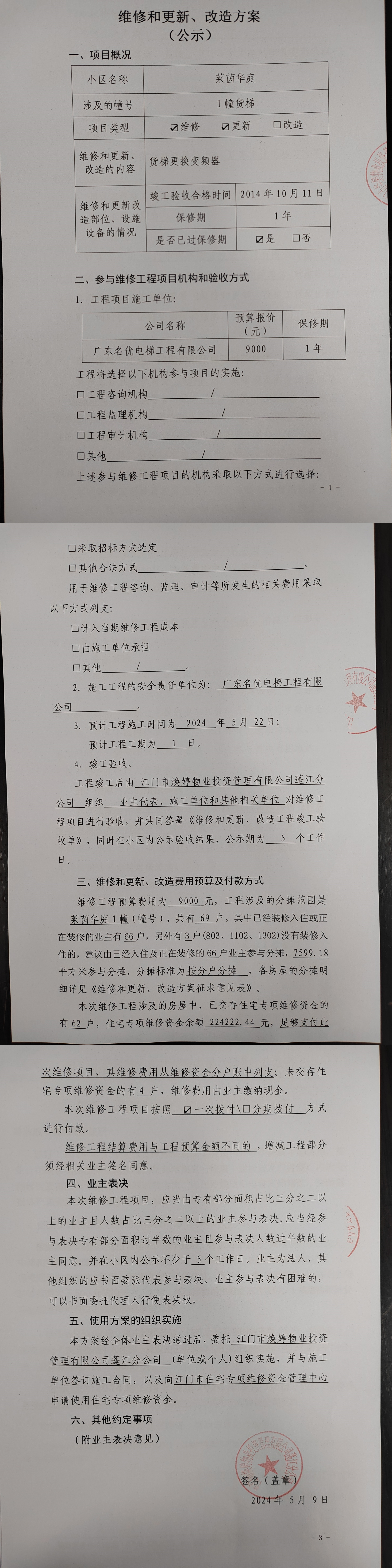 <td VALIGN="top" VALUES="" STYLE="border-width:0" BINDTYPE="0" ROWSPAN="17" COLSPAN="7" DATASOURCE="投票结果" ><font style=" font-family:方正小标宋简体;font-size:14pt;"><p style="line-height: 1.75em;"><span style="font-family: 宋体, SimSun;">各位尊敬的业主:</span><br/></p><p style="text-indent: 2em; line-height: 1.75em;"><span style="font-family: 宋体, SimSun;">根据法律法规的规定,本小区业主利用“江门市物业事项表决管理系统”已对本小区公共事务决策事项进行了表决,在经过7日的询异公示期后,未收到业主有效的异议。现将投票结果公告,并就产生的法律效力说明如下:</span></p><p style="line-height: 1.75em; text-indent: 0em;"><strong style="text-indent: 2em;"><span style="font-family: 宋体, SimSun;">一、投票范围</span></strong></p><p style="text-indent: 2em; line-height: 1.75em;"><span style="font-family: 宋体, SimSun;">莱茵华庭蓬江区莱茵华庭1幢</span></p><p style="text-indent: 2em; line-height: 1.75em;"><span style="font-family: 宋体, SimSun;">总人数(专有部分人数之和):66</span></p><p style="text-indent: 2em; line-height: 1.75em;"><span style="font-family: 宋体, SimSun;"><span style="font-family: 宋体, SimSun; text-indent: 32px;"><span style="font-family: 宋体; text-indent: 32px;"><span style="font-family: 宋体; text-indent: 32px;">总户数:66</span></span></span></span></p><p style="text-indent: 2em; line-height: 1.75em;"><span style="font-family: 宋体, SimSun;">建筑物总面积(专有部分面积之和):7599.18㎡</span></p><p style="line-height: 1.75em;"><strong><span style="font-family: 宋体, SimSun;">二、投票结果公告时间</span></strong></p><p style="text-indent: 2em; line-height: 1.75em;"><span style="font-family: 宋体, SimSun;">从2024年05月29日开始</span></p><p style="line-height: 1.75em;"><strong><span style="font-family: 宋体, SimSun;">三、计票规则</span></strong></p><p style="text-indent: 2em; line-height: 1.75em;"><span style="font-family: 宋体, SimSun;">表决事项:使用建筑物及其附属设施的维修资金<br /><p style='font-family: 宋体, SimSun;line-height: 1.75em; text-indent: 2em;'>计票规则:弃权票不并入其它项&nbsp;&nbsp;&nbsp;&nbsp;未表决票不并入其它项</p></span></p><p style="line-height: 1.75em;"><strong><span style="font-family: 宋体, SimSun;">四、通过规则</span></strong></p><p style="line-height: 1.75em;"><strong><span style="font-family: 宋体, SimSun;">&nbsp; 根据《中华人民共和国民法典》第二百七十八条规定:业主共同决定事项,应当由专有部分面积占比三分之二以上的业主且人数占比三分之二以上的业主参与表决。</span></strong></p><p style="text-indent: 2em; line-height: 1.75em;"><span style="font-family: 宋体, SimSun;"><span style="font-family: 宋体, SimSun; text-indent: 32px;">表决事项:使用建筑物及其附属设施的维修资金<br /><p style='font-family: 宋体, SimSun;line-height: 1.75em; text-indent: 2em;'>通过规则:双2/3以上参与表决,参与表决双过半同意</p></span></span></p><p style="line-height: 1.75em;"><strong><span style="font-family: 宋体, SimSun;">五、投票结果</span></strong></p><p style="line-height: 1.75em; text-indent: 2em;"><span style="font-family: 宋体, SimSun; text-indent: 2em;"><div id='resultTable'><table style='table-layout: fixed; font-size:12px; margin-top:10px' width='100%' border='0' cellspacing='0' cellpadding='0'><tr><td height='28' colspan='10' align='center' style='border: 1px solid #666'><strong style='font-size: 14px;'> 使用建筑物及其附属设施的维修资金</strong></td> </tr><tr id='trfirst'><td height='28' colspan='4' style='border-left: 1px solid #666; border-bottom: 1px solid #666'><strong>&nbsp;申报单位:</strong> 江门市焕婷物业投资管理有限公司蓬江分公司</td><td colspan='3' style='border-left: 1px solid #666; border-bottom: 1px solid #666'><strong>&nbsp;联系方式:</strong> 3211392 </td><td colspan='3' style='border-left: 1px solid #666; border-bottom: 1px solid #666; border-right: 1px solid #666'><strong>&nbsp;申报日期:</strong> 2024年5月9日 </td></tr><tr> <td height='28' colspan='5' style='border-left: 1px solid #666; border-bottom: 1px solid #666'><strong>&nbsp;列支总人数(专有部分人数之和):</strong>66人 </td><td colspan='5' style='border-left: 1px solid #666; border-bottom: 1px solid #666; border-right: 1px solid #666'><strong>&nbsp;列支建筑物总面积(专有部分面积之和):</strong>7599.18㎡ </td> </tr><tr><td height='28' colspan='10' bgcolor='#F3F3F3' style='border-left: 1px solid #666;border-bottom: 1px solid #666;border-right: 1px solid #666'><strong>&nbsp;参与表决人数及面积统计</strong></td></tr><tr><td height='28' colspan='5' style='border-left: 1px solid #666; border-bottom: 1px solid #666'><strong>&nbsp;参与表决人数:</strong>48人</td><td colspan='5' style='border-left: 1px solid #666; border-bottom: 1px solid #666; border-right: 1px solid #666'><strong>&nbsp;参与表决人数占总人数比例:</strong>72.73%</td></tr><tr><td height='28' colspan='5' style='border-left: 1px solid #666; border-bottom: 1px solid #666'><strong>&nbsp;参与表决面积:</strong>5501.00㎡</td><td colspan='5' style='border-left: 1px solid #666; border-bottom: 1px solid #666; border-right: 1px solid #666'><strong>&nbsp;参与表决面积占总面积比例:</strong>72.39%</td></tr><tr><td height='28' colspan='10' bgcolor='#F3F3F3' style='border-left: 1px solid #666; border-bottom: 1px solid #666;border-right: 1px solid #666'> <strong>&nbsp;参与表决同意人数及面积统计</strong></td> </tr><tr><td height='28' colspan='5' style='border-left: 1px solid #666; border-bottom: 1px solid #666'><strong>&nbsp;参与表决同意人数:</strong>44人 </td><td colspan='5' style='border-left: 1px solid #666; border-bottom: 1px solid #666; border-right: 1px so