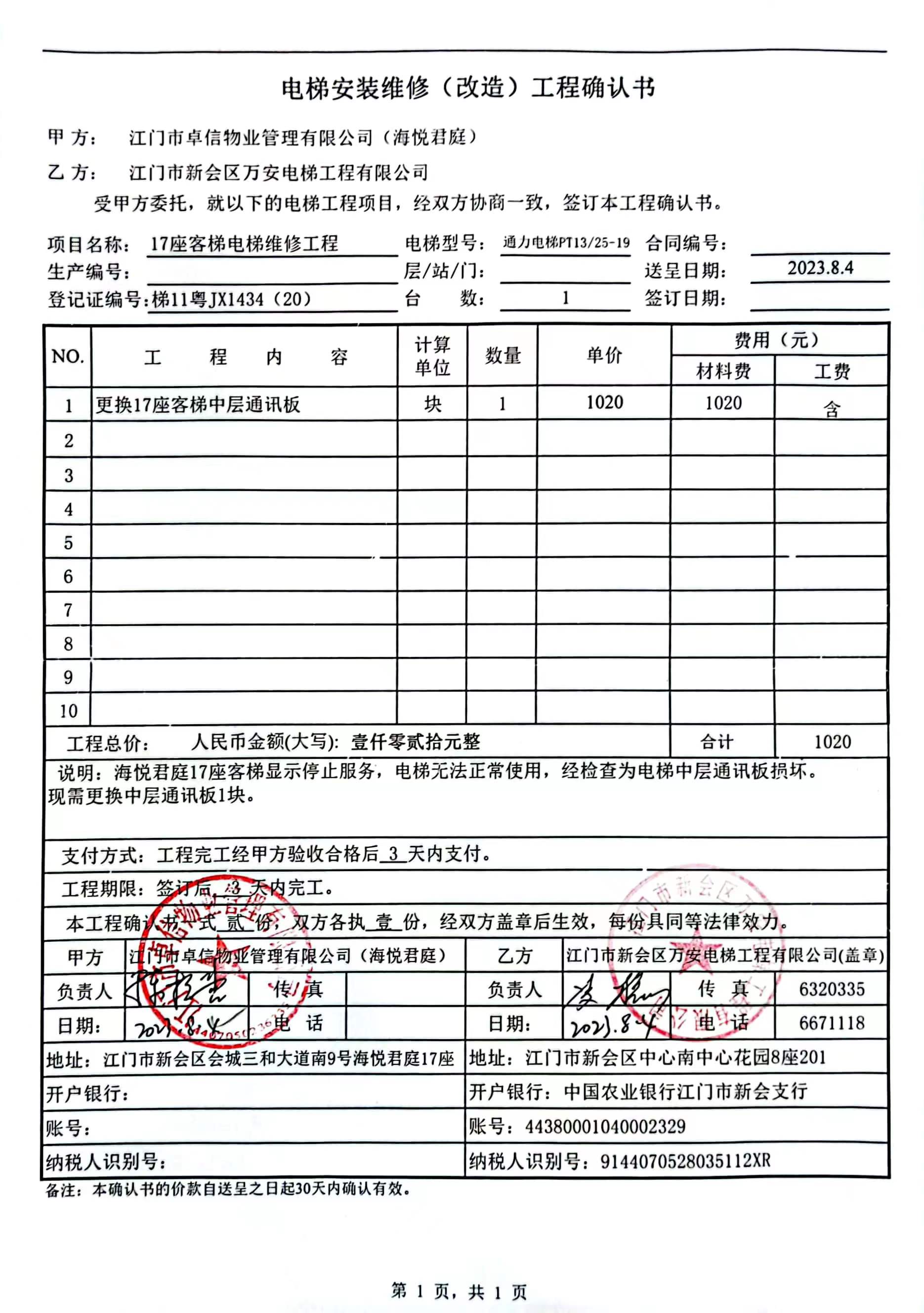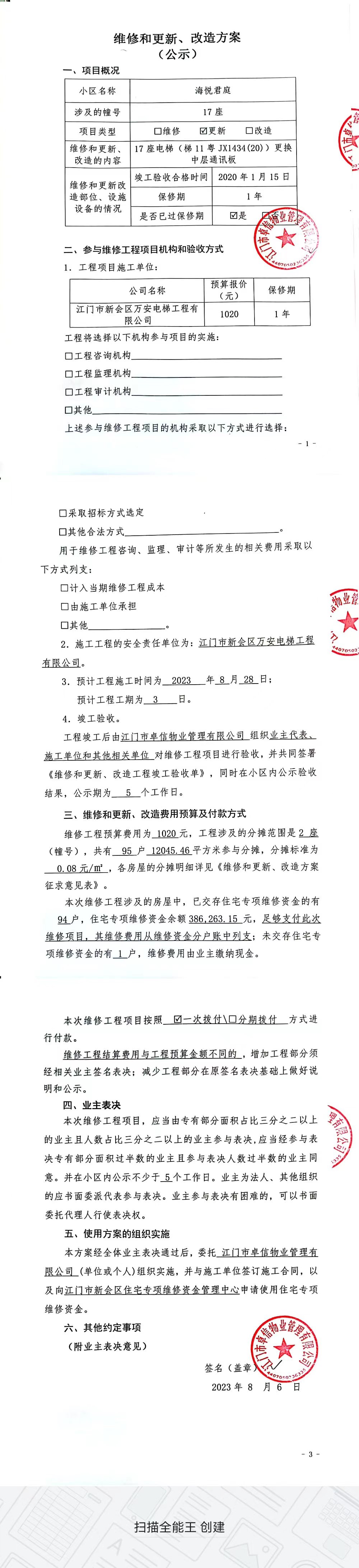 <td VALIGN="top" VALUES="" STYLE="border-width:0" BINDTYPE="0" ROWSPAN="19" COLSPAN="7" DATASOURCE="投票结果" ><font style="font-size:14pt;"><p style="white-space: normal; font-family: 宋体; line-height: 1.75em;">海悦君庭17座全体业主:</p><p style="white-space: normal; font-family: 宋体; line-height: 1.75em; text-indent: 2em;">本小区关于海悦君庭17座电梯(梯11粤JX1434(20))更换中层通讯板使用维修资金的投票的投票已表决结束,询异时间从2023年08月26日开始,投票询异公示期间,业主可通过微信查询自己的表决情况或可凭身份证件申请查询自己的表决情况;如公示的业主表决情况与查询的本人表决意见不一致的,可以以书面形式向投票组织机构申诉,投票组织机构予以纠正并重新公示表决结果。异议提出人对投票组织机构的处理仍有异议的,可以向街道办事处(镇人民政府)反映处理,涉及住宅专项维修资金的,可向属地住宅专项维修资金管理中心反映处理。</p><p style="white-space: normal;"><br/></p><p style="white-space: normal; font-family: 宋体; line-height: 1.75em;"><strong>附件:</strong></p><p style="white-space: normal; font-family: 宋体; line-height: 1.75em;"><strong>一、投票范围</strong></p><p style="white-space: normal; font-family: 宋体; line-height: 1.75em; text-indent: 2em;">海悦君庭17座</p><p style="white-space: normal; font-family: 宋体; line-height: 1.75em; text-indent: 2em;">总人数(专有部分人数之和):95</p><p style="white-space: normal; font-family: 宋体; line-height: 1.75em; text-indent: 2em;"><span style="font-family: 宋体, SimSun;">总户数:95</span></p><p style="white-space: normal; font-family: 宋体; line-height: 1.75em; text-indent: 2em;">建筑物总面积(专有部分面积之和):12045.46㎡</p><p style="white-space: normal; font-family: 宋体; line-height: 1.75em;"><strong>二、询异公示起止时间</strong></p><p dir="ltr" style="white-space: normal; font-family: 宋体; line-height: 1.75em; text-indent: 2em;"><span style="text-indent: 36px;">2023年08月26日至2023年09月01日</span></p><p style="white-space: normal; font-family: 宋体; line-height: 1.75em;"><strong>三、投票详细描述</strong></p><p style="white-space: normal; font-family: 宋体; line-height: 1.75em; text-indent: 2em;"><p><span style="font-family: Helvetica;letter-spacing: 0;font-size: 14px;background: rgb(255, 255, 255)"><span style="font-family:Helvetica"> 本小区</span><span style="font-family:Helvetica">17座电梯(梯11粤JX1434(20))显示停止服务,经电梯维保公司工作人员详细检测确认:电梯中层通讯板损坏,现需更换新的电梯中层通讯板,已过保修期。现需申请使用维修资金对17座电梯(梯11粤JX1434(20))进行维修,工程维修预算金额为1020 元,项目最终费用以施工合同签订金额为准。维修费用的分摊标准为按建筑面积分摊,每平方约:0.08元,详见公示附件。如有业主手机不能正常通过微信投票,请联系物业公司进行线下纸质投票,物业电话:0750-6667066。</span></span></p><p><br/></p></p><p style="white-space: normal; font-family: 宋体; line-height: 1.75em;"><strong>四、计票规则</strong></p><p style="white-space: normal; font-family: 宋体; line-height: 1.75em; text-indent: 2em;">表决事项:使用建筑物及其附属设施的维修资金<br /><p style='text-align: left; font-family: 宋体; font-size: 16px; line-height: 1.75em; text-indent: 2em;'>计票规则:弃权票不并入其它项 未表决票不并入其它项</p></p><p style="white-space: normal; font-family: 宋体; line-height: 1.75em;"><strong>五、通过规则</strong></p><p style="white-space: normal; font-family: 宋体; line-height: 1.75em; text-indent: 2em;">表决事项:使用建筑物及其附属设施的维修资金<br /><p style='text-align: left; font-family: 宋体; font-size: 16px; line-height: 1.75em; text-indent: 2em;'>通过规则:参与表决专有部分面积过半数的业主且参与表决人数过半数的业主同意</p></p><p style="white-space: normal; font-family: 宋体; line-height: 1.75em;"><strong>六、投票结果</strong></p><p style="white-space: normal; font-family: 宋体; line-height: 1.75em; text-indent: 2em;"><div id='resultTable'><table style='table-layout: fixed; font-size:12px; margin-top:10px' width='100%' border='0' cellspacing='0' cellpadding='0'><tr><td height='28' colspan='10' align='center' style='border: 1px solid #666'><strong style='font-size: 14px;'> 使用建筑物及其附属设施的维修资金</strong></td> </tr><tr id='trfirst'><td height='28' colspan='4' style='border-left: 1px solid #666; border-bottom: 1px solid #666'><strong> 申报单位:</strong> 江门市卓信物业管理有限公司</td><td colspan='3' style='border-left: 1px solid #666; border-bottom: 1px solid #666'><strong> 联系方式:</strong> 7506170181 </td><td colspan='3' style='border-left: 1px solid #666; border-bottom: 1px solid #666; border-right: 1px solid #666'><strong> 申报日期:</strong> 2023年8月12日 </td></tr><tr> <td height='28' colspan='5' style='border-left: 1px solid #666; border-bottom: 1px solid #666'><strong> 总人数(专有部分人数之和):</strong>95人 </td><td colspan='5' style='border-left: 1px solid #666; border-bottom: 1px solid #666; border-right: 1px solid #666'><strong> 建筑物总面积(专有部分面积之和):</strong>12045.46㎡ </td> </tr><tr><td height='28' colspan='10' bgcolor='#F3F3F3' style='border-left: 1px solid #666;border-bottom: 1px solid #666;border-right: 1px solid #666'><strong> 参与人数及面积统计</strong></td></tr><tr><td height='28' colspan='5' style='border-left: 1px solid #666; border-bottom: 1px solid #666'><strong> 参与表决专有部分人数之和:</strong>64人</td><td colspan='5' style='border-left: 1px solid #666; border-bottom: 1px solid #666; border-right: 1px solid #666'><strong> 参