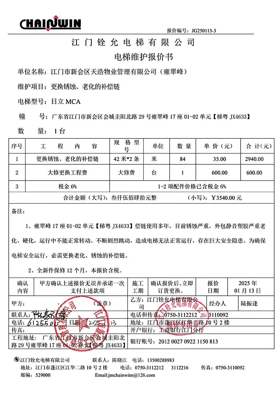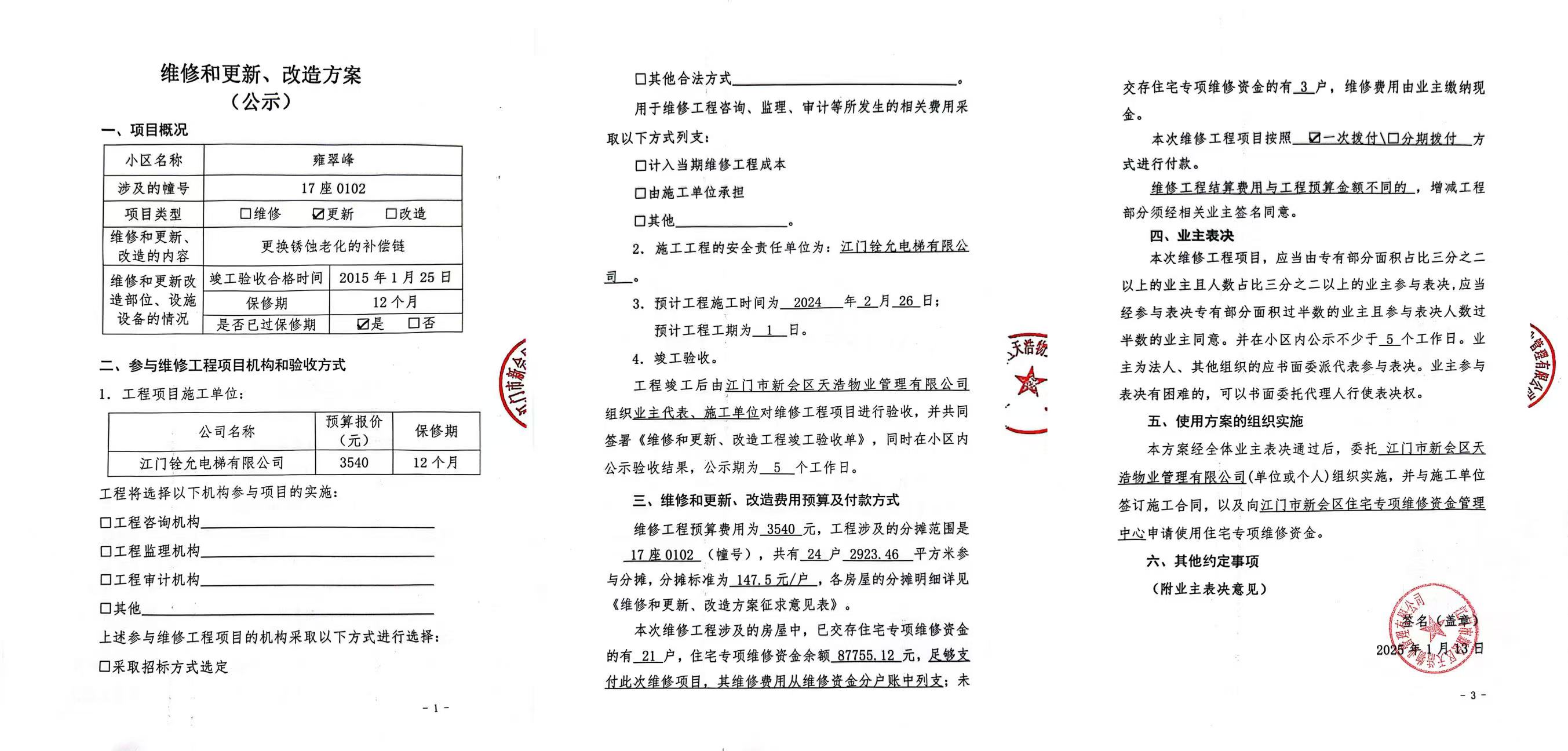 <td VALIGN="top" VALUES="" STYLE="border-width:0" BINDTYPE="0" ROWSPAN="19" COLSPAN="7" DATASOURCE="投票结果" ><font style="font-size:14pt;"><p style="white-space: normal; font-family: 宋体; line-height: 1.75em;">雍翠峰雍翠峰17座全体业主:</p><p style="white-space: normal; font-family: 宋体; line-height: 1.75em; text-indent: 2em;">本小区关于雍翠峰17座0102电梯【梯粤JX4633】更换补偿链的使用维修资金的投票的投票已表决结束,询异时间从2025年01月15日开始,投票询异公示期间,业主可通过微信查询自己的表决情况或可凭身份证件申请查询自己的表决情况;如公示的业主表决情况与查询的本人表决意见不一致的,可以以书面形式向投票组织机构申诉,投票组织机构予以纠正并重新公示表决结果。异议提出人对投票组织机构的处理仍有异议的,可以向街道办事处(镇人民政府)反映处理,涉及住宅专项维修资金的,可向属地住宅专项维修资金管理中心反映处理。</p><p style="white-space: normal;"><br/></p><p style="white-space: normal; font-family: 宋体; line-height: 1.75em;"><strong>附件:</strong></p><p style="white-space: normal; font-family: 宋体; line-height: 1.75em;"><strong>一、投票范围</strong></p><p style="white-space: normal; font-family: 宋体; line-height: 1.75em; text-indent: 2em;">雍翠峰雍翠峰17座</p><p style="white-space: normal; font-family: 宋体; line-height: 1.75em; text-indent: 2em;">总人数(专有部分人数之和):24</p><p style="white-space: normal; font-family: 宋体; line-height: 1.75em; text-indent: 2em;"><span style="font-family: 宋体, SimSun;"><span style="font-family: 宋体; text-indent: 32px;"><span style="font-family: 宋体; text-indent: 32px;">总户数:24</span></span></span></p><p style="white-space: normal; font-family: 宋体; line-height: 1.75em; text-indent: 2em;">建筑物总面积(专有部分面积之和):2923.46㎡</p><p style="white-space: normal; font-family: 宋体; line-height: 1.75em;"><strong>二、询异公示起止时间</strong></p><p dir="ltr" style="white-space: normal; font-family: 宋体; line-height: 1.75em; text-indent: 2em;"><span style="text-indent: 36px;">2025年01月15日至2025年01月25日</span></p><p style="white-space: normal; font-family: 宋体; line-height: 1.75em;"><strong>三、投票详细描述</strong></p><p style="white-space: normal; font-family: 宋体; line-height: 1.75em; text-indent: 2em;"><p> 雍翠峰17座0102电梯【梯粤JX4633】电梯报运行时有异响,经检查发现补偿链外包静音塑胶严重老化、硬化,不能正常转动和不断剧烈跳动,造成电梯无法正常运行,为确保电梯安全运行必需更换锈蚀老化的补偿链,已过保修期。</p><p> 现需申请使用维修资金对17座0102电梯【梯粤JX4633】进行维修,工程维修预算金额为3540元,项目最终费用以施工合同签订金额为准。维修费用的分摊标准为按分户分摊,每户分摊147.5元,详见公示附件。如业主不能正常通过微信投票,请联系物业公司进行线下纸质投票,物业电话:0750-6125500。</p><p><br/></p></p><p style="white-space: normal; font-family: 宋体; line-height: 1.75em;"><strong>四、计票规则</strong></p><p style="white-space: normal; font-family: 宋体; line-height: 1.75em; text-indent: 2em;">表决事项:使用建筑物及其附属设施的维修资金<br /><p style='text-align: left; font-family: 宋体; font-size: 16px; line-height: 1.75em; text-indent: 2em;'>计票规则:弃权票不并入其它项 未表决票不并入其它项</p></p><p style="white-space: normal; font-family: 宋体; line-height: 1.75em;"><strong>五、通过规则</strong></p><p style="white-space: normal; font-family: 宋体; line-height: 1.75em;"><strong><strong style="white-space: normal;"><span style="font-family: 宋体, SimSun;"> 根据《中华人民共和国民法典》第二百七十八条规定:业主共同决定事项,应当由专有部分面积占比三分之二以上的业主且人数占比三分之二以上的业主参与表决。</span></strong></strong></p><p style="white-space: normal; font-family: 宋体; line-height: 1.75em; text-indent: 2em;">表决事项:使用建筑物及其附属设施的维修资金<br /><p style='text-align: left; font-family: 宋体; font-size: 16px; line-height: 1.75em; text-indent: 2em;'>通过规则:双2/3以上参与表决,参与表决双过半同意</p></p><p style="white-space: normal; font-family: 宋体; line-height: 1.75em;"><strong>六、投票结果</strong></p><p style="white-space: normal; font-family: 宋体; line-height: 1.75em; text-indent: 2em;"><div id='resultTable'><table style='table-layout: fixed; font-size:12px; margin-top:10px' width='100%' border='0' cellspacing='0' cellpadding='0'><tr><td height='28' colspan='10' align='center' style='border: 1px solid #666'><strong style='font-size: 14px;'> 使用建筑物及其附属设施的维修资金</strong></td> </tr><tr id='trfirst'><td height='28' colspan='4' style='border-left: 1px solid #666; border-bottom: 1px solid #666'><strong> 申报单位:</strong> 江门市新会区天浩物业管理有限公司</td><td colspan='3' style='border-left: 1px solid #666; border-bottom: 1px solid #666'><strong> 联系方式:</strong> </td><td colspan='3' style='border-left: 1px solid #666; border-bottom: 1px solid #666; border-right: 1px solid #666'><strong> 申报日期:</strong> 2025年1月13日 </td></tr><tr> <td height='28' colspan='5' style='border-left: 1px solid #666; border-bottom: 1px solid #666'><strong> 总人数(专有部分人数之和):</strong>24人 </td><td colspan='5' style='border-left: 1px solid #666; border-bottom: 1px solid #666; border-right: 1px solid #666'><strong> 建筑物总面积(专有部分面积之和):</strong>2923.46㎡ </td> </tr><tr><td height='28' colspan='10' bgcolor='#F3F3F3' style='border-left: 1px solid #666;border-bottom: 1px solid #6