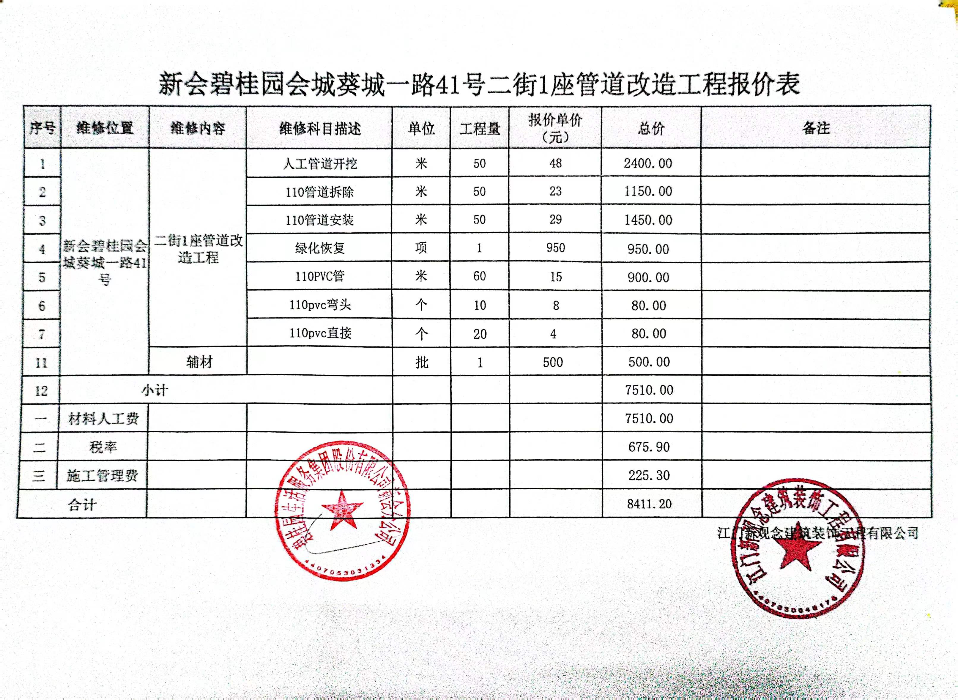 <td VALIGN="top" VALUES="" STYLE="border-width:0" BINDTYPE="0" ROWSPAN="19" COLSPAN="7" DATASOURCE="投票结果" ><font style="font-size:14pt;"><p style="white-space: normal; font-family: 宋体; line-height: 1.75em;">新会碧桂园葵城一路41号02街01座全体业主:</p><p style="white-space: normal; font-family: 宋体; line-height: 1.75em; text-indent: 2em;">本小区关于新会碧桂园关于会城葵城一路41号二街1座管道改造使用维修资金的投票的投票已表决结束,询异时间从2023年12月21日开始,投票询异公示期间,业主可通过微信查询自己的表决情况或可凭身份证件申请查询自己的表决情况;如公示的业主表决情况与查询的本人表决意见不一致的,可以以书面形式向投票组织机构申诉,投票组织机构予以纠正并重新公示表决结果。异议提出人对投票组织机构的处理仍有异议的,可以向街道办事处(镇人民政府)反映处理,涉及住宅专项维修资金的,可向属地住宅专项维修资金管理中心反映处理。</p><p style="white-space: normal;"><br/></p><p style="white-space: normal; font-family: 宋体; line-height: 1.75em;"><strong>附件:</strong></p><p style="white-space: normal; font-family: 宋体; line-height: 1.75em;"><strong>一、投票范围</strong></p><p style="white-space: normal; font-family: 宋体; line-height: 1.75em; text-indent: 2em;">新会碧桂园葵城一路41号02街01座</p><p style="white-space: normal; font-family: 宋体; line-height: 1.75em; text-indent: 2em;">总人数(专有部分人数之和):59</p><p style="white-space: normal; font-family: 宋体; line-height: 1.75em; text-indent: 2em;"><span style="font-family: 宋体, SimSun;"><span style="font-family: 宋体; text-indent: 32px;"><span style="font-family: 宋体; text-indent: 32px;">总户数:60</span></span></span></p><p style="white-space: normal; font-family: 宋体; line-height: 1.75em; text-indent: 2em;">建筑物总面积(专有部分面积之和):10045.40㎡</p><p style="white-space: normal; font-family: 宋体; line-height: 1.75em;"><strong>二、询异公示起止时间</strong></p><p dir="ltr" style="white-space: normal; font-family: 宋体; line-height: 1.75em; text-indent: 2em;"><span style="text-indent: 36px;">2023年12月21日至2023年12月27日</span></p><p style="white-space: normal; font-family: 宋体; line-height: 1.75em;"><strong>三、投票详细描述</strong></p><p style="white-space: normal; font-family: 宋体; line-height: 1.75em; text-indent: 2em;"><p>新会碧桂园会城葵城一路41号二街1座下沉导致排污管管道压断,经检查需打凿开挖重新换管。现申请使用维修资金对新会碧桂园会城葵城一路41号二街1座下沉导致排污管进行维修,工程维修预算约8411.2元,项目最终费用以施工合同签订为准,维修费用的分摊标准按建筑面积分摊,每平方约0.84元,详见公示,如果有业主手机不能正常通过微信投票的,请联系物业公司进行线下纸质投票,物业电话17308202885.</p></p><p style="white-space: normal; font-family: 宋体; line-height: 1.75em;"><strong>四、计票规则</strong></p><p style="white-space: normal; font-family: 宋体; line-height: 1.75em; text-indent: 2em;">表决事项:使用建筑物及其附属设施的维修资金<br /><p style='text-align: left; font-family: 宋体; font-size: 16px; line-height: 1.75em; text-indent: 2em;'>计票规则:弃权票不并入其它项 未表决票不并入其它项</p></p><p style="white-space: normal; font-family: 宋体; line-height: 1.75em;"><strong>五、通过规则</strong></p><p style="white-space: normal; font-family: 宋体; line-height: 1.75em;"><strong><strong style="white-space: normal;"><span style="font-family: 宋体, SimSun;">&nbsp; 根据《中华人民共和国民法典》第二百七十八条规定:业主共同决定事项,应当由专有部分面积占比三分之二以上的业主且人数占比三分之二以上的业主参与表决。</span></strong></strong></p><p style="white-space: normal; font-family: 宋体; line-height: 1.75em; text-indent: 2em;">表决事项:使用建筑物及其附属设施的维修资金<br /><p style='text-align: left; font-family: 宋体; font-size: 16px; line-height: 1.75em; text-indent: 2em;'>通过规则:参与表决专有部分面积过半数的业主且参与表决人数过半数的业主同意</p></p><p style="white-space: normal; font-family: 宋体; line-height: 1.75em;"><strong>六、投票结果</strong></p><p style="white-space: normal; font-family: 宋体; line-height: 1.75em; text-indent: 2em;"><div id='resultTable'><table style='table-layout: fixed; font-size:12px; margin-top:10px' width='100%' border='0' cellspacing='0' cellpadding='0'><tr><td height='28' colspan='10' align='center' style='border: 1px solid #666'><strong style='font-size: 14px;'> 使用建筑物及其附属设施的维修资金</strong></td> </tr><tr id='trfirst'><td height='28' colspan='4' style='border-left: 1px solid #666; border-bottom: 1px solid #666'><strong> 申报单位:</strong> 碧桂园生活服务集团股份有限公司新会分公司</td><td colspan='3' style='border-left: 1px solid #666; border-bottom: 1px solid #666'><strong> 联系方式:</strong> </td><td colspan='3' style='border-left: 1px solid #666; border-bottom: 1px solid #666; border-right: 1px solid #666'><strong> 申报日期:</strong> 2023年8月3日 </td></tr><tr> <td height='28' colspan='5' style='border-left: 1px solid #666; border-bottom: 1px solid #666'><strong> 总人数(专有部分人数之和):</strong>59人 </td><td colspan='5' style='border-left: 1px solid #666; border-bottom: 1px solid #666; border-right: 1px solid #666'><strong> 建筑物总面积(专有部分面积之和):</strong>10045.40㎡ </td> </tr><tr><td height='28' colspan='10' bgcolor='#F3F3F3' style='border-left: 1px solid #666;border-bottom: 1px solid #666;border-right: 1px solid #666'><strong> 参与人数及