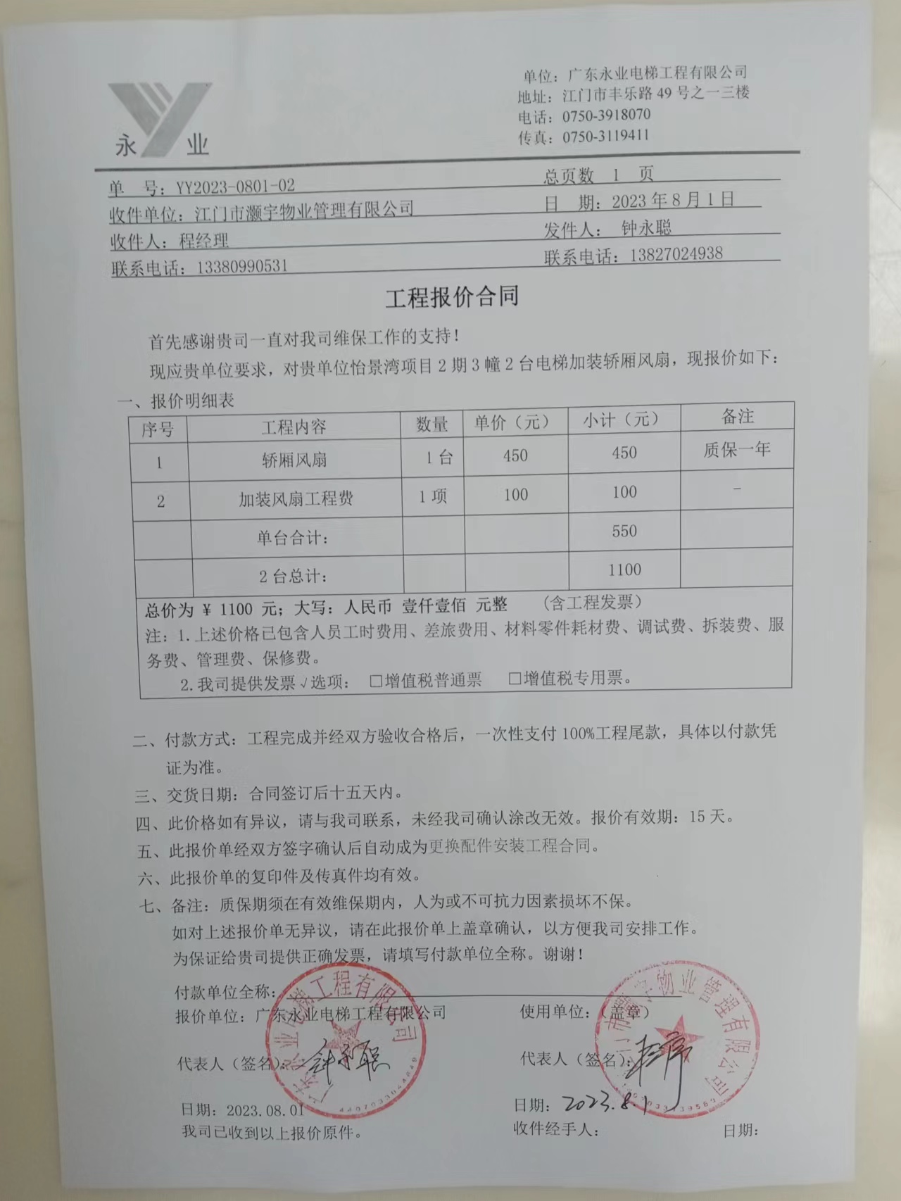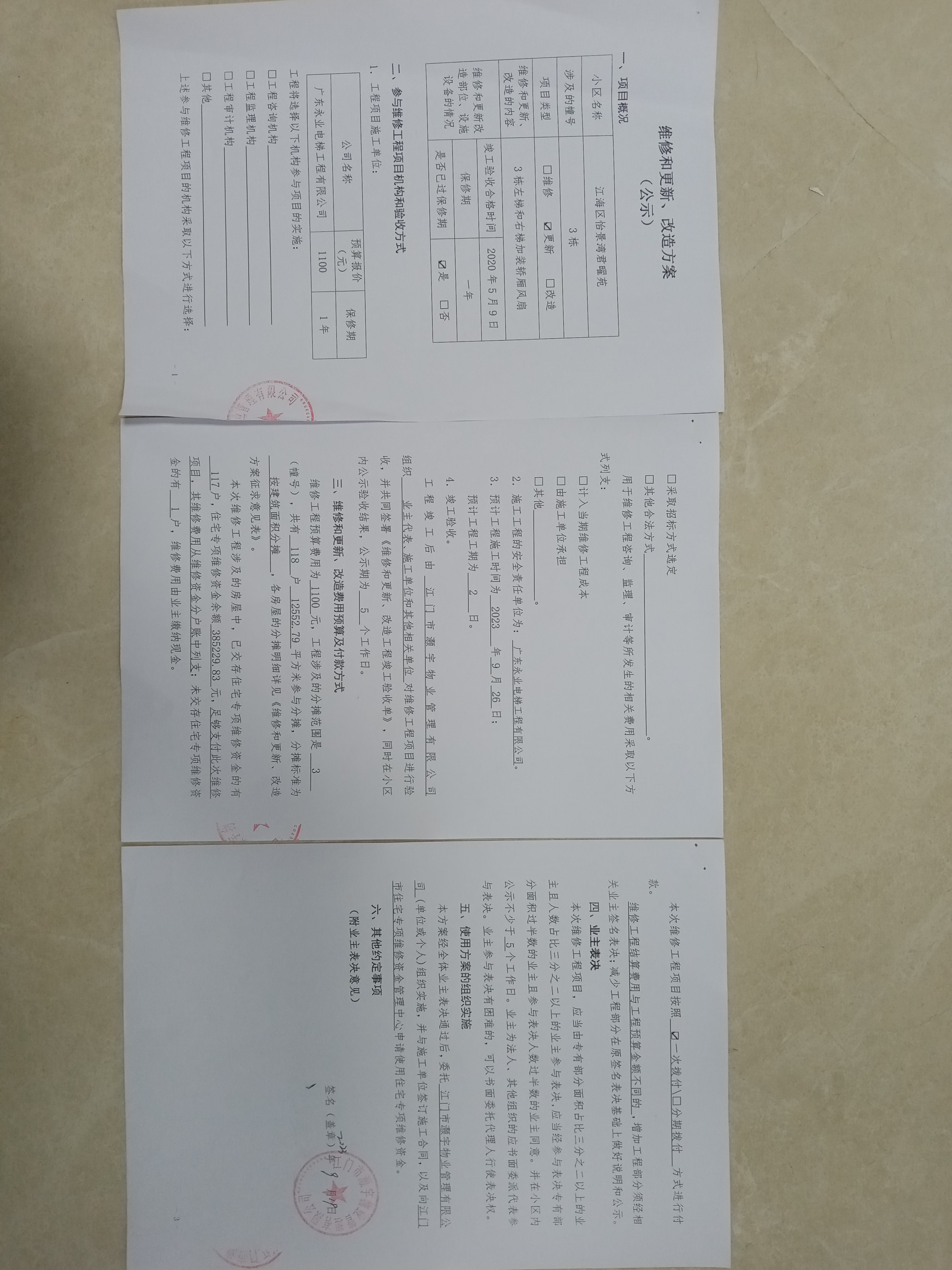 <td valign="top" values="" style="border-width:0" bindtype="0" rowspan="19" colspan="7" datasource="投票结果"><font style="font-size:14pt;"><p style="white-space: normal; font-family: 宋体; line-height: 1.75em;">怡景湾君曜苑江海区怡景湾君曜苑3栋全体业主:</p><p style="white-space: normal; font-family: 宋体; line-height: 1.75em; text-indent: 2em;">本小区关于江海怡景湾君曜苑3栋2台电梯加装轿厢风扇使用维修资金的投票的投票已表决结束,询异时间从2023年09月26日开始,投票询异公示期间,业主可通过微信查询自己的表决情况或可凭身份证件申请查询自己的表决情况;如公示的业主表决情况与查询的本人表决意见不一致的,可以以书面形式向投票组织机构申诉,投票组织机构予以纠正并重新公示表决结果。异议提出人对投票组织机构的处理仍有异议的,可以向街道办事处(镇人民政府)反映处理,涉及住宅专项维修资金的,可向属地住宅专项维修资金管理中心反映处理。</p><p style="white-space: normal;"><br></p><p style="white-space: normal; font-family: 宋体; line-height: 1.75em;"><strong>附件:</strong></p><p style="white-space: normal; font-family: 宋体; line-height: 1.75em;"><strong>一、投票范围</strong></p><p style="white-space: normal; font-family: 宋体; line-height: 1.75em; text-indent: 2em;">怡景湾君曜苑江海区怡景湾君曜苑3栋</p><p style="white-space: normal; font-family: 宋体; line-height: 1.75em; text-indent: 2em;">总人数(专有部分人数之和):118</p><p style="white-space: normal; font-family: 宋体; line-height: 1.75em; text-indent: 2em;"><span style="font-family: 宋体, SimSun;">总户数:118</span></p><p style="white-space: normal; font-family: 宋体; line-height: 1.75em; text-indent: 2em;">建筑物总面积(专有部分面积之和):12552.79㎡</p><p style="white-space: normal; font-family: 宋体; line-height: 1.75em;"><strong>二、询异公示起止时间</strong></p><p dir="ltr" style="white-space: normal; font-family: 宋体; line-height: 1.75em; text-indent: 2em;"><span style="text-indent: 36px;">2023年09月26日至2023年10月02日</span></p><p style="white-space: normal; font-family: 宋体; line-height: 1.75em;"><strong>三、投票详细描述</strong></p><p style="white-space: normal; font-family: 宋体; line-height: 1.75em; text-indent: 2em;"></p><p>江海怡景湾君曜苑3栋业主反馈乘坐电梯时感觉电梯闷热无风,夏天出行造成不便,因电梯原有设计不带风扇,现为响应业主需求,电梯已过保修期。现需申请使用维修资金对<span style="text-wrap: wrap;">君曜苑3栋2台电梯加装轿厢风扇</span>,工程维修预算金额为 1100 元,项目最终费用以施工合同签订金额为准。维修费用的分摊标准为按建筑面积分摊,每平方约0.088 元,详见公示附件。如业主手机不能正常通过微信投票,请联系物业公司进行线下纸质投票 ,物业公司联系电话:0750-3898816</p><p></p><p style="white-space: normal; font-family: 宋体; line-height: 1.75em;"><strong>四、计票规则</strong></p><p style="white-space: normal; font-family: 宋体; line-height: 1.75em; text-indent: 2em;">表决事项:使用建筑物及其附属设施的维修资金<br></p><p style="text-align: left; font-family: 宋体; font-size: 16px; line-height: 1.75em; text-indent: 2em;">计票规则:弃权票不并入其它项 未表决票不并入其它项</p><p></p><p style="white-space: normal; font-family: 宋体; line-height: 1.75em;"><strong>五、通过规则</strong></p><p style="white-space: normal; font-family: 宋体; line-height: 1.75em; text-indent: 2em;">表决事项:使用建筑物及其附属设施的维修资金<br></p><p style="text-align: left; font-family: 宋体; font-size: 16px; line-height: 1.75em; text-indent: 2em;">通过规则:参与表决专有部分面积过半数的业主且参与表决人数过半数的业主同意</p><p></p><p style="white-space: normal; font-family: 宋体; line-height: 1.75em;"><strong>六、投票结果</strong></p><p style="white-space: normal; font-family: 宋体; line-height: 1.75em; text-indent: 2em;"></p><div id="resultTable"><table style="table-layout: fixed; font-size:12px; margin-top:10px" width="100%" border="0" cellspacing="0" cellpadding="0"><tbody><tr><td height="28" colspan="10" align="center" style="border: 1px solid #666"><strong style="font-size: 14px;"> 使用建筑物及其附属设施的维修资金</strong></td> </tr><tr id="trfirst"><td height="28" colspan="4" style="border-left: 1px solid #666; border-bottom: 1px solid #666"><strong> 申报单位:</strong> 江门市灏宇物业管理有限公司</td><td colspan="3" style="border-left: 1px solid #666; border-bottom: 1px solid #666"><strong> 联系方式:</strong> </td><td colspan="3" style="border-left: 1px solid #666; border-bottom: 1px solid #666; border-right: 1px solid #666"><strong> 申报日期:</strong> 2023年9月19日 </td></tr><tr> <td height="28" colspan="5" style="border-left: 1px solid #666; border-bottom: 1px solid #666"><strong> 总人数(专有部分人数之和):</strong>118人 </td><td colspan="5" style="border-left: 1px solid #666; border-bottom: 1px solid #666; border-right: 1px solid #666"><strong> 建筑物总面积(专有部分面积之和):</strong>12552.79㎡ </td> </tr><tr><td height="28" colspan="10" bgcolor="#F3F3F3" style="border-left: 1px solid #666;border-bottom: 1px solid #666;border-right: 1px solid #666"><strong> 参与人数及面积统计</strong></td></tr><tr><td height="28" colspan="5" style="border-left: 1px solid #666; border-bottom: 1px solid #666"><strong> 参与表决专有部分人数之和:</strong>84人</td><td colspan="5" style="border-left: 1px solid #666; border-bottom: 1px solid #666; border-right: 1px solid #666"><strong> 参与表决占有表决权总人数比例:</strong>71.19%</td></tr><tr><td height="28" colspan="5" st