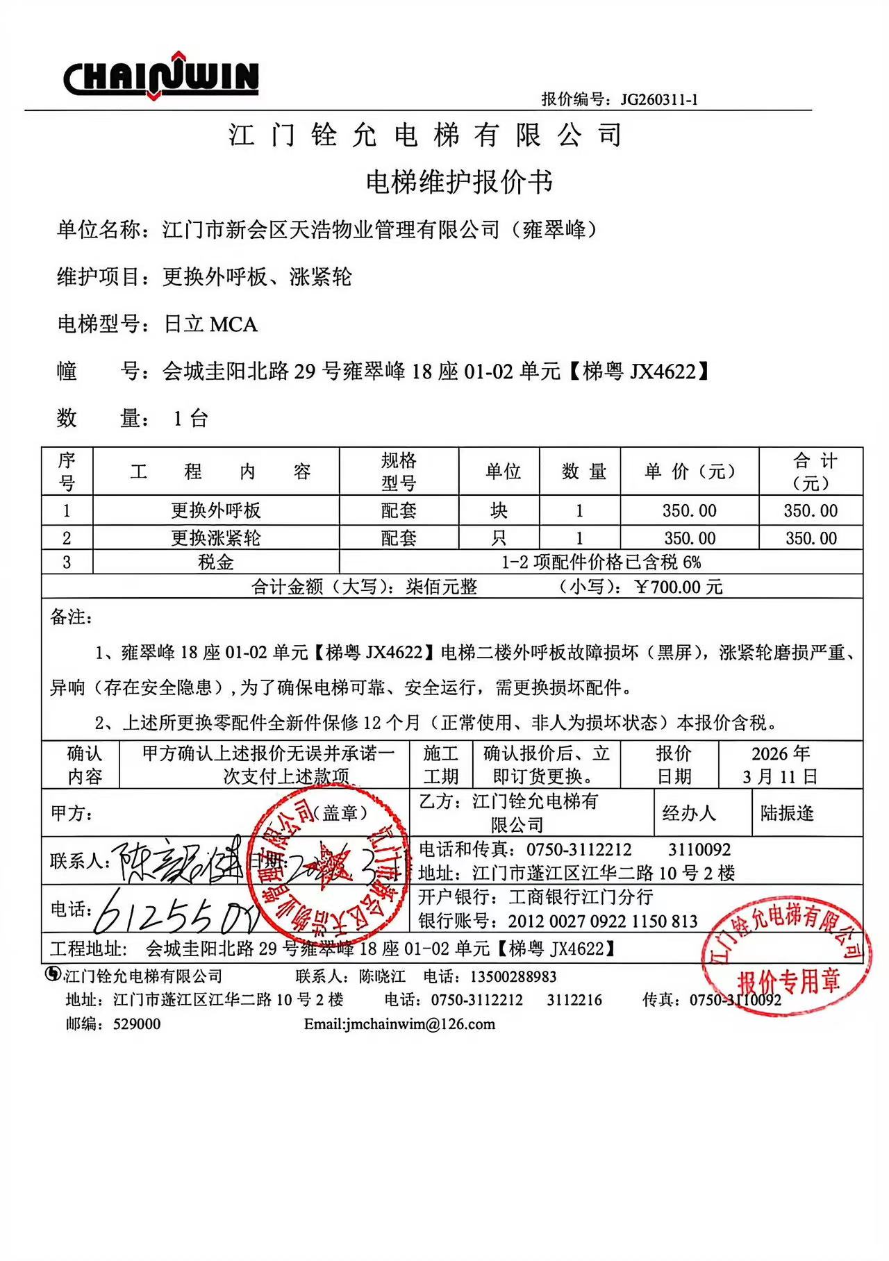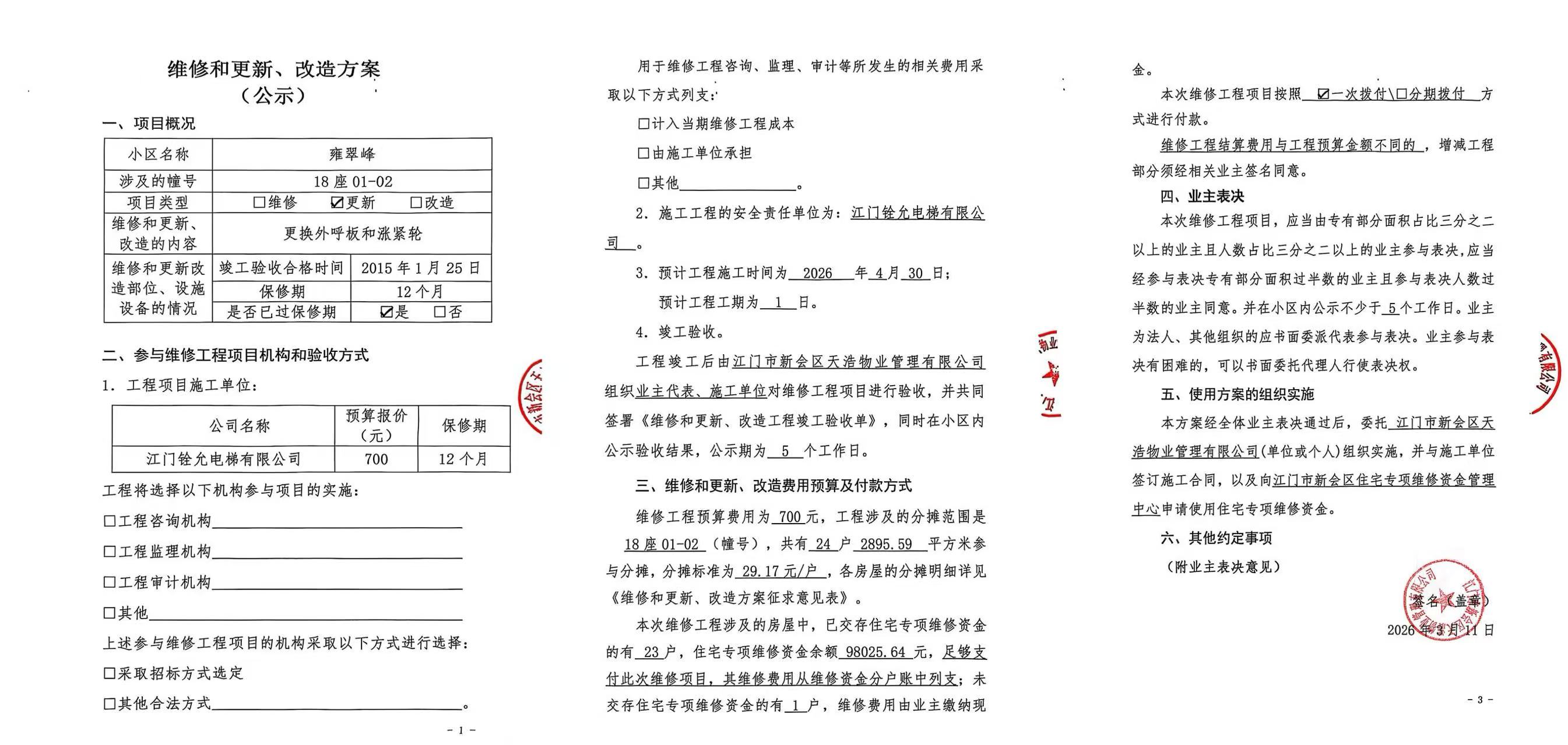 <td VALIGN="top" VALUES="" STYLE="border-width:0" BINDTYPE="0" ROWSPAN="17" COLSPAN="7" DATASOURCE="投票结果" ><font style=" font-family:方正小标宋简体;font-size:14pt;"><p style="line-height: 1.75em;"><span style="font-family: 宋体, SimSun;">各位尊敬的业主:</span><br/></p><p style="text-indent: 2em; line-height: 1.75em;"><span style="font-family: 宋体, SimSun;">根据法律法规的规定,本小区业主利用“江门市物业事项表决管理系统”已对本小区公共事务决策事项(<span style="font-family: 宋体; text-indent: 32px;">雍翠峰18座01-02单元电梯【梯粤JX4622】更换外呼板和涨紧轮使用维修资金的投票</span>)进行了表决,在经过7日的询异公示期后,未收到业主有效的异议。现将投票结果公告,并就产生的法律效力说明如下:</span></p><p style="line-height: 1.75em; text-indent: 0em;"><strong style="text-indent: 2em;"><span style="font-family: 宋体, SimSun;">一、投票范围</span></strong></p><p style="text-indent: 2em; line-height: 1.75em;"><span style="font-family: 宋体, SimSun;">雍翠峰雍翠峰18座</span></p><p style="text-indent: 2em; line-height: 1.75em;"><span style="font-family: 宋体, SimSun;">总人数(专有部分人数之和):24</span></p><p style="text-indent: 2em; line-height: 1.75em;"><span style="font-family: 宋体, SimSun;"><span style="font-family: 宋体, SimSun; text-indent: 32px;"><span style="font-family: 宋体; text-indent: 32px;"><span style="font-family: 宋体; text-indent: 32px;">总户数:24</span></span></span></span></p><p style="text-indent: 2em; line-height: 1.75em;"><span style="font-family: 宋体, SimSun;">建筑物总面积(专有部分面积之和):2895.59㎡</span></p><p style="line-height: 1.75em;"><strong><span style="font-family: 宋体, SimSun;">二、投票结果公告时间</span></strong></p><p style="text-indent: 2em; line-height: 1.75em;"><span style="font-family: 宋体, SimSun;"><span style="font-family: 宋体, SimSun; text-indent: 32px;">从2026年03月28日开始</span></span></p><p style="line-height: 1.75em;"><strong><span style="font-family: 宋体, SimSun;">三、计票规则</span></strong></p><p style="text-indent: 2em; line-height: 1.75em;"><span style="font-family: 宋体, SimSun;">表决事项:使用建筑物及其附属设施的维修资金<br /><p style='font-family: 宋体, SimSun;line-height: 1.75em; text-indent: 2em;'>计票规则:弃权票不并入其它项&nbsp;&nbsp;&nbsp;&nbsp;未表决票不并入其它项</p></span></p><p style="line-height: 1.75em;"><strong><span style="font-family: 宋体, SimSun;">四、通过规则</span></strong></p><p style="line-height: 1.75em;"><strong><span style="font-family: 宋体, SimSun;">&nbsp; 根据《中华人民共和国民法典》第二百七十八条规定:业主共同决定事项,应当由专有部分面积占比三分之二以上的业主且人数占比三分之二以上的业主参与表决。</span></strong></p><p style="text-indent: 2em; line-height: 1.75em;"><span style="font-family: 宋体, SimSun;"><span style="font-family: 宋体, SimSun; text-indent: 32px;">表决事项:使用建筑物及其附属设施的维修资金<br /><p style='font-family: 宋体, SimSun;line-height: 1.75em; text-indent: 2em;'>通过规则:双2/3以上参与表决,参与表决双过半同意</p></span></span></p><p style="line-height: 1.75em;"><strong><span style="font-family: 宋体, SimSun;">五、投票结果</span></strong></p><p style="line-height: 1.75em; text-indent: 2em;"><span style="font-family: 宋体, SimSun; text-indent: 2em;"><div id='resultTable'><table style='table-layout: fixed; font-size:12px; margin-top:10px' width='100%' border='0' cellspacing='0' cellpadding='0'><tr><td height='28' colspan='10' align='center' style='border: 1px solid #666'><strong style='font-size: 14px;'> 使用建筑物及其附属设施的维修资金</strong></td> </tr><tr id='trfirst'><td height='28' colspan='4' style='border-left: 1px solid #666; border-bottom: 1px solid #666'><strong>&nbsp;申报单位:</strong> 江门市新会区天浩物业管理有限公司</td><td colspan='3' style='border-left: 1px solid #666; border-bottom: 1px solid #666'><strong>&nbsp;联系方式:</strong> </td><td colspan='3' style='border-left: 1px solid #666; border-bottom: 1px solid #666; border-right: 1px solid #666'><strong>&nbsp;申报日期:</strong> 2026年3月11日 </td></tr><tr> <td height='28' colspan='5' style='border-left: 1px solid #666; border-bottom: 1px solid #666'><strong>&nbsp;列支总人数(专有部分人数之和):</strong>24人 </td><td colspan='5' style='border-left: 1px solid #666; border-bottom: 1px solid #666; border-right: 1px solid #666'><strong>&nbsp;列支建筑物总面积(专有部分面积之和):</strong>2895.59㎡ </td> </tr><tr><td height='28' colspan='10' bgcolor='#F3F3F3' style='border-left: 1px solid #666;border-bottom: 1px solid #666;border-right: 1px solid #666'><strong>&nbsp;参与表决人数及面积统计</strong></td></tr><tr><td height='28' colspan='5' style='border-left: 1px solid #666; border-bottom: 1px solid #666'><strong>&nbsp;参与表决人数:</strong>17人</td><td colspan='5' style='border-left: 1px solid #666; border-bottom: 1px solid #666; border-right: 1px solid #666'><strong>&nbsp;参与表决人数占总人数比例:</strong>70.83%</td></tr><tr><td height='28' colspan='5' style='border-left: 1px solid #666; border-bottom: 1px solid #666'><strong>&nbsp;参与表决面积:</strong>2217.07㎡</td><td colspan='5' style='border-left: 1px solid #666; border-bottom: 1px solid #666; border-right: 1px solid #666'><strong>&nbsp;参与表决面积占总面积比例:</strong>76.57%</td></tr><tr><td height='28' colspan='10' bgcolor='#F3F3F3' style='border-left: 1px solid #666; border-bottom: 1px solid #666;border-right: 1px solid #666'> <strong>&nbsp;参与表决同意人数及面积统计</strong></td> </tr><tr><td height='28' colspan='5' style='border-left: 1px sol