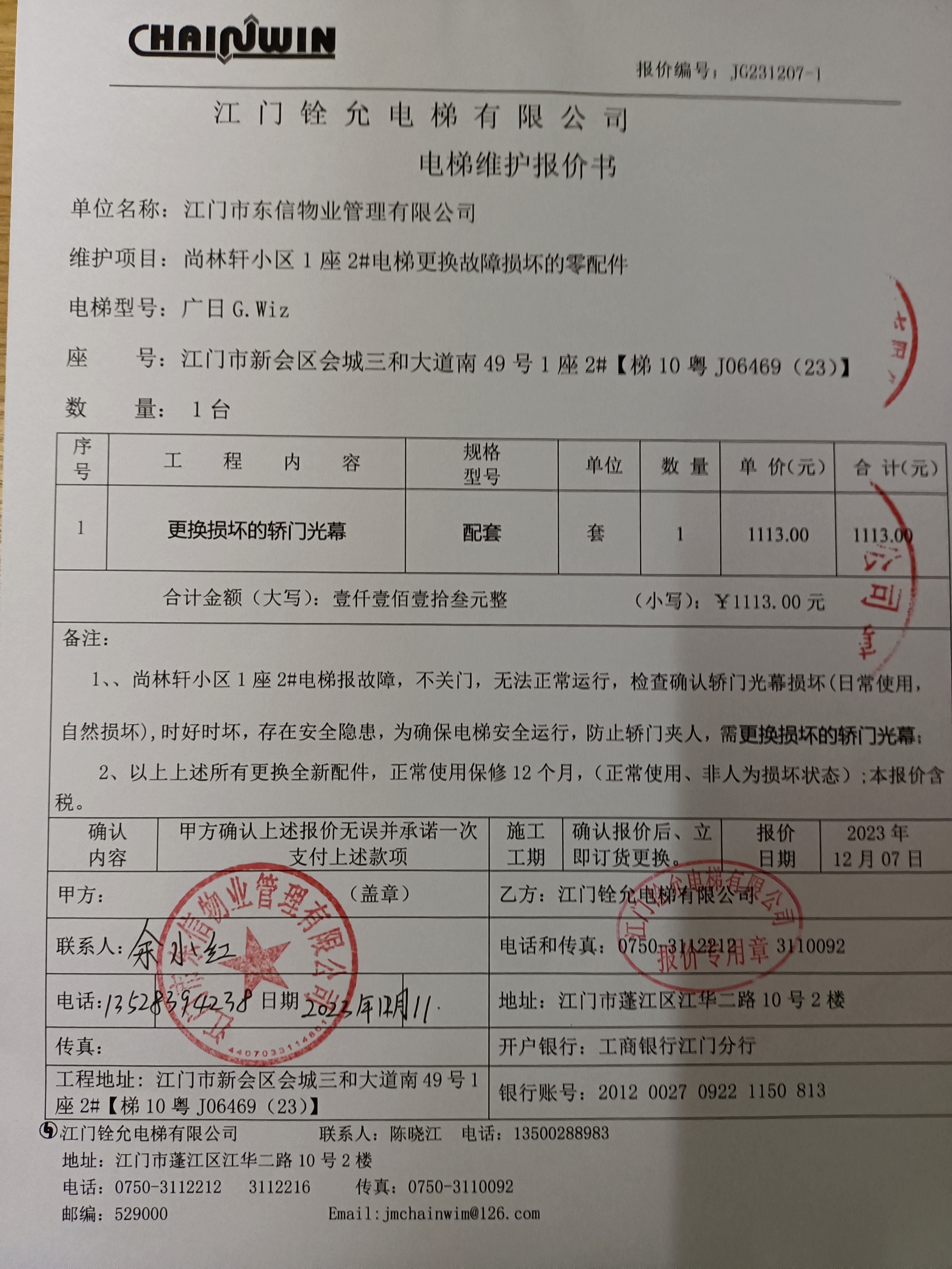 <td VALIGN="top" VALUES="" STYLE="border-width:0" BINDTYPE="0" ROWSPAN="19" COLSPAN="7" DATASOURCE="投票结果" ><font style="font-size:14pt;"><p style="white-space: normal; font-family: 宋体; line-height: 1.75em;">尚林轩小区尚林轩1座全体业主:</p><p style="white-space: normal; font-family: 宋体; line-height: 1.75em; text-indent: 2em;">本小区关于尚林轩小区1座2#电梯(梯10粤J06469(23)更换轿门光幕使用维修资金的投票的投票已表决结束,询异时间从2023年12月21日开始,投票询异公示期间,业主可通过微信查询自己的表决情况或可凭身份证件申请查询自己的表决情况;如公示的业主表决情况与查询的本人表决意见不一致的,可以以书面形式向投票组织机构申诉,投票组织机构予以纠正并重新公示表决结果。异议提出人对投票组织机构的处理仍有异议的,可以向街道办事处(镇人民政府)反映处理,涉及住宅专项维修资金的,可向属地住宅专项维修资金管理中心反映处理。</p><p style="white-space: normal;"><br/></p><p style="white-space: normal; font-family: 宋体; line-height: 1.75em;"><strong>附件:</strong></p><p style="white-space: normal; font-family: 宋体; line-height: 1.75em;"><strong>一、投票范围</strong></p><p style="white-space: normal; font-family: 宋体; line-height: 1.75em; text-indent: 2em;">尚林轩小区尚林轩1座</p><p style="white-space: normal; font-family: 宋体; line-height: 1.75em; text-indent: 2em;">总人数(专有部分人数之和):65</p><p style="white-space: normal; font-family: 宋体; line-height: 1.75em; text-indent: 2em;"><span style="font-family: 宋体, SimSun;"><span style="font-family: 宋体; text-indent: 32px;"><span style="font-family: 宋体; text-indent: 32px;">总户数:65</span></span></span></p><p style="white-space: normal; font-family: 宋体; line-height: 1.75em; text-indent: 2em;">建筑物总面积(专有部分面积之和):5912.54㎡</p><p style="white-space: normal; font-family: 宋体; line-height: 1.75em;"><strong>二、询异公示起止时间</strong></p><p dir="ltr" style="white-space: normal; font-family: 宋体; line-height: 1.75em; text-indent: 2em;"><span style="text-indent: 36px;">2023年12月21日至2023年12月27日</span></p><p style="white-space: normal; font-family: 宋体; line-height: 1.75em;"><strong>三、投票详细描述</strong></p><p style="white-space: normal; font-family: 宋体; line-height: 1.75em; text-indent: 2em;"><p>尚林轩小区1座2# 电梯(梯10粤J06469(23))电梯故障,无法正常运行,经检查确认轿门光幕损坏(日常使用,自然损坏),存在安全隐患 ,需要更换损坏的轿门光幕,已过保修期。现需申请使用维修资金对1座2#电梯维修,工程维修预算金额为1113元,项目最终费用以施工合同签订金额为准。维修费用的分摊标准为 0.18825平方米,详见公示附件。如业主手机不能正常通过微信投票,请联系物业公司进行线下纸质投票,物业公司联系电话:6683199</p></p><p style="white-space: normal; font-family: 宋体; line-height: 1.75em;"><strong>四、计票规则</strong></p><p style="white-space: normal; font-family: 宋体; line-height: 1.75em; text-indent: 2em;">表决事项:使用建筑物及其附属设施的维修资金<br /><p style='text-align: left; font-family: 宋体; font-size: 16px; line-height: 1.75em; text-indent: 2em;'>计票规则:弃权票不并入其它项 未表决票不并入其它项</p></p><p style="white-space: normal; font-family: 宋体; line-height: 1.75em;"><strong>五、通过规则</strong></p><p style="white-space: normal; font-family: 宋体; line-height: 1.75em;"><strong><strong style="white-space: normal;"><span style="font-family: 宋体, SimSun;">&nbsp; 根据《中华人民共和国民法典》第二百七十八条规定:业主共同决定事项,应当由专有部分面积占比三分之二以上的业主且人数占比三分之二以上的业主参与表决。</span></strong></strong></p><p style="white-space: normal; font-family: 宋体; line-height: 1.75em; text-indent: 2em;">表决事项:使用建筑物及其附属设施的维修资金<br /><p style='text-align: left; font-family: 宋体; font-size: 16px; line-height: 1.75em; text-indent: 2em;'>通过规则:参与表决专有部分面积过半数的业主且参与表决人数过半数的业主同意</p></p><p style="white-space: normal; font-family: 宋体; line-height: 1.75em;"><strong>六、投票结果</strong></p><p style="white-space: normal; font-family: 宋体; line-height: 1.75em; text-indent: 2em;"><div id='resultTable'><table style='table-layout: fixed; font-size:12px; margin-top:10px' width='100%' border='0' cellspacing='0' cellpadding='0'><tr><td height='28' colspan='10' align='center' style='border: 1px solid #666'><strong style='font-size: 14px;'> 使用建筑物及其附属设施的维修资金</strong></td> </tr><tr id='trfirst'><td height='28' colspan='4' style='border-left: 1px solid #666; border-bottom: 1px solid #666'><strong> 申报单位:</strong> 江门市东信物业管理有限公司</td><td colspan='3' style='border-left: 1px solid #666; border-bottom: 1px solid #666'><strong> 联系方式:</strong> 0750-6683199 </td><td colspan='3' style='border-left: 1px solid #666; border-bottom: 1px solid #666; border-right: 1px solid #666'><strong> 申报日期:</strong> 2023年12月14日 </td></tr><tr> <td height='28' colspan='5' style='border-left: 1px solid #666; border-bottom: 1px solid #666'><strong> 总人数(专有部分人数之和):</strong>65人 </td><td colspan='5' style='border-left: 1px solid #666; border-bottom: 1px solid #666; border-right: 1px solid #666'><strong> 建筑物总面积(专有部分面积之和):</strong>5912.54㎡ </td> </tr><tr><td height='28' colspan='10' bgcolor='#F3F3F3' style='border-left: 1px solid #666;border-bottom: 1px solid #666;border-right: 1px solid #666'><strong> 参与人数及面积