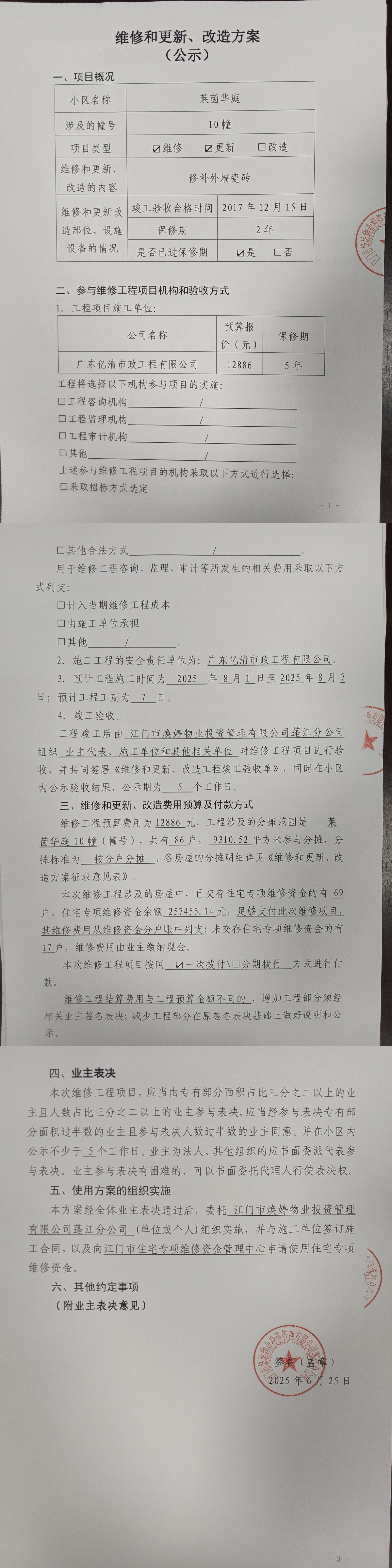 <td VALIGN="top" VALUES="" STYLE="border-width:0" BINDTYPE="0" ROWSPAN="19" COLSPAN="7" DATASOURCE="投票结果" ><font style="font-size:14pt;"><p style="white-space: normal; font-family: 宋体; line-height: 1.75em;">莱茵华庭蓬江区莱茵华庭10幢全体业主:</p><p style="white-space: normal; font-family: 宋体; line-height: 1.75em; text-indent: 2em;">本小区关于莱茵华庭小区10幢修补外墙空鼓的瓷砖使用维修资金的投票的投票已表决结束,询异时间从2025年08月05日开始,投票询异公示期间,业主可通过微信查询自己的表决情况或可凭身份证件申请查询自己的表决情况;如公示的业主表决情况与查询的本人表决意见不一致的,可以以书面形式向投票组织机构申诉,投票组织机构予以纠正并重新公示表决结果。异议提出人对投票组织机构的处理仍有异议的,可以向街道办事处(镇人民政府)反映处理,涉及住宅专项维修资金的,可向属地住宅专项维修资金管理中心反映处理。</p><p style="white-space: normal;"><br/></p><p style="white-space: normal; font-family: 宋体; line-height: 1.75em;"><strong>附件:</strong></p><p style="white-space: normal; font-family: 宋体; line-height: 1.75em;"><strong>一、投票范围</strong></p><p style="white-space: normal; font-family: 宋体; line-height: 1.75em; text-indent: 2em;">莱茵华庭蓬江区莱茵华庭10幢</p><p style="white-space: normal; font-family: 宋体; line-height: 1.75em; text-indent: 2em;">总人数(专有部分人数之和):86</p><p style="white-space: normal; font-family: 宋体; line-height: 1.75em; text-indent: 2em;"><span style="font-family: 宋体, SimSun;"><span style="font-family: 宋体; text-indent: 32px;"><span style="font-family: 宋体; text-indent: 32px;">总户数:86</span></span></span></p><p style="white-space: normal; font-family: 宋体; line-height: 1.75em; text-indent: 2em;">建筑物总面积(专有部分面积之和):9310.52㎡</p><p style="white-space: normal; font-family: 宋体; line-height: 1.75em;"><strong>二、询异公示起止时间</strong></p><p dir="ltr" style="white-space: normal; font-family: 宋体; line-height: 1.75em; text-indent: 2em;"><span style="text-indent: 36px;">2025年08月05日至2025年08月15日</span></p><p style="white-space: normal; font-family: 宋体; line-height: 1.75em;"><strong>三、投票详细描述</strong></p><p style="white-space: normal; font-family: 宋体; line-height: 1.75em; text-indent: 2em;"><p><span style="background-color: rgb(255, 255, 255); font-family: 宋体, SimSun; font-size: 16px;">本小区10幢有两处建筑外墙瓷砖出现严重空鼓和脱落的情况发生,因10幢楼下是人行走道,如不及时对空鼓脱落的外墙进行修补,随时会危及业主和他人的生命及财产安全。已过保修期,现需申请使用维修资金对10幢外墙瓷砖进行修补,工程维修预算金额为12886元,项目最终费用以施工合同签订金额为准。维修费用的分摊标准为按分户分摊 每户约149.84元,详见公示附件。如业主手机不能正常通过微信投票,请联系物业公司进行线下纸质投票,物业公司联系电话:0750-3212633。 </span></p></p><p style="white-space: normal; font-family: 宋体; line-height: 1.75em;"><strong>四、计票规则</strong></p><p style="white-space: normal; font-family: 宋体; line-height: 1.75em; text-indent: 2em;">表决事项:使用建筑物及其附属设施的维修资金<br /><p style='text-align: left; font-family: 宋体; font-size: 16px; line-height: 1.75em; text-indent: 2em;'>计票规则:弃权票不并入其它项 未表决票不并入其它项</p></p><p style="white-space: normal; font-family: 宋体; line-height: 1.75em;"><strong>五、通过规则</strong></p><p style="white-space: normal; font-family: 宋体; line-height: 1.75em;"><strong><strong style="white-space: normal;"><span style="font-family: 宋体, SimSun;"> 根据《中华人民共和国民法典》第二百七十八条规定:业主共同决定事项,应当由专有部分面积占比三分之二以上的业主且人数占比三分之二以上的业主参与表决。</span></strong></strong></p><p style="white-space: normal; font-family: 宋体; line-height: 1.75em; text-indent: 2em;">表决事项:使用建筑物及其附属设施的维修资金<br /><p style='text-align: left; font-family: 宋体; font-size: 16px; line-height: 1.75em; text-indent: 2em;'>通过规则:双2/3以上参与表决,参与表决双过半同意</p></p><p style="white-space: normal; font-family: 宋体; line-height: 1.75em;"><strong>六、投票结果</strong></p><p style="white-space: normal; font-family: 宋体; line-height: 1.75em; text-indent: 2em;"><div id='resultTable'><table style='table-layout: fixed; font-size:12px; margin-top:10px' width='100%' border='0' cellspacing='0' cellpadding='0'><tr><td height='28' colspan='10' align='center' style='border: 1px solid #666'><strong style='font-size: 14px;'> 使用建筑物及其附属设施的维修资金</strong></td> </tr><tr id='trfirst'><td height='28' colspan='4' style='border-left: 1px solid #666; border-bottom: 1px solid #666'><strong> 申报单位:</strong> 江门市焕婷物业投资管理有限公司蓬江分公司</td><td colspan='3' style='border-left: 1px solid #666; border-bottom: 1px solid #666'><strong> 联系方式:</strong> 3211392 </td><td colspan='3' style='border-left: 1px solid #666; border-bottom: 1px solid #666; border-right: 1px solid #666'><strong> 申报日期:</strong> 2025年6月27日 </td></tr><tr> <td height='28' colspan='5' style='border-left: 1px solid #666; border-bottom: 1px solid #666'><strong> 总人数(专有部分人数之和):</strong>86人 </td><td colspan='5' style='border-left: 1px solid #666; border-bottom: 1px solid #666; border-right: 1px solid #666'><strong> 建筑物总面积(专有部分面积之和):</strong>9310.52㎡ </td> </tr><tr><td height='28' colspan='10' bgcol
