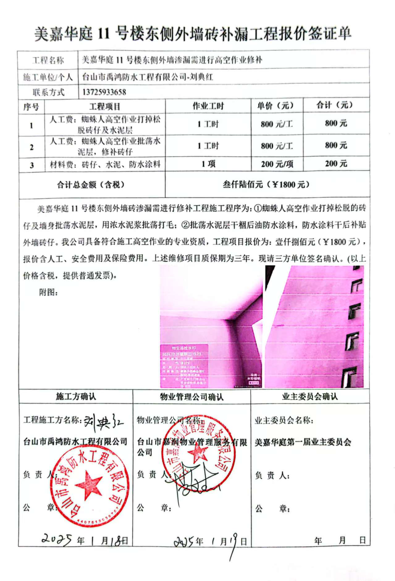 <td VALIGN="top" VALUES="" STYLE="border-width:0" BINDTYPE="0" ROWSPAN="17" COLSPAN="7" DATASOURCE="投票结果" ><font style=" font-family:方正小标宋简体;font-size:14pt;"><p style="line-height: 1.75em;"><span style="font-family: 宋体, SimSun;">各位尊敬的业主:</span><br/></p><p style="text-indent: 2em; line-height: 1.75em;"><span style="font-family: 宋体, SimSun;">根据法律法规的规定,本小区业主利用“江门市物业事项表决管理系统”已对本小区公共事务决策事项(<span style="font-family: 宋体; text-indent: 32px;">美嘉华庭11号楼01单元外墙渗水维修使用维修资金投票</span>)进行了表决,在经过7日的询异公示期后,未收到业主有效的异议。现将投票结果公告,并就产生的法律效力说明如下:</span></p><p style="line-height: 1.75em; text-indent: 0em;"><strong style="text-indent: 2em;"><span style="font-family: 宋体, SimSun;">一、投票范围</span></strong></p><p style="text-indent: 2em; line-height: 1.75em;"><span style="font-family: 宋体, SimSun;">台城陈宜禧路美嘉华庭台城陈宜禧路美嘉华庭11号</span></p><p style="text-indent: 2em; line-height: 1.75em;"><span style="font-family: 宋体, SimSun;">总人数(专有部分人数之和):14</span></p><p style="text-indent: 2em; line-height: 1.75em;"><span style="font-family: 宋体, SimSun;"><span style="font-family: 宋体, SimSun; text-indent: 32px;"><span style="font-family: 宋体; text-indent: 32px;"><span style="font-family: 宋体; text-indent: 32px;">总户数:15</span></span></span></span></p><p style="text-indent: 2em; line-height: 1.75em;"><span style="font-family: 宋体, SimSun;">建筑物总面积(专有部分面积之和):3362.34㎡</span></p><p style="line-height: 1.75em;"><strong><span style="font-family: 宋体, SimSun;">二、投票结果公告时间</span></strong></p><p style="text-indent: 2em; line-height: 1.75em;"><span style="font-family: 宋体, SimSun;"><span style="font-family: 宋体, SimSun; text-indent: 32px;">从2025年08月19日开始</span></span></p><p style="line-height: 1.75em;"><strong><span style="font-family: 宋体, SimSun;">三、计票规则</span></strong></p><p style="text-indent: 2em; line-height: 1.75em;"><span style="font-family: 宋体, SimSun;">表决事项:使用建筑物及其附属设施的维修资金<br /><p style='font-family: 宋体, SimSun;line-height: 1.75em; text-indent: 2em;'>计票规则:弃权票不并入其它项&nbsp;&nbsp;&nbsp;&nbsp;未表决票不并入其它项</p></span></p><p style="line-height: 1.75em;"><strong><span style="font-family: 宋体, SimSun;">四、通过规则</span></strong></p><p style="line-height: 1.75em;"><strong><span style="font-family: 宋体, SimSun;">&nbsp; 根据《中华人民共和国民法典》第二百七十八条规定:业主共同决定事项,应当由专有部分面积占比三分之二以上的业主且人数占比三分之二以上的业主参与表决。</span></strong></p><p style="text-indent: 2em; line-height: 1.75em;"><span style="font-family: 宋体, SimSun;"><span style="font-family: 宋体, SimSun; text-indent: 32px;">表决事项:使用建筑物及其附属设施的维修资金<br /><p style='font-family: 宋体, SimSun;line-height: 1.75em; text-indent: 2em;'>通过规则:双2/3以上参与表决,参与表决双过半同意</p></span></span></p><p style="line-height: 1.75em;"><strong><span style="font-family: 宋体, SimSun;">五、投票结果</span></strong></p><p style="line-height: 1.75em; text-indent: 2em;"><span style="font-family: 宋体, SimSun; text-indent: 2em;"><div id='resultTable'><table style='table-layout: fixed; font-size:12px; margin-top:10px' width='100%' border='0' cellspacing='0' cellpadding='0'><tr><td height='28' colspan='10' align='center' style='border: 1px solid #666'><strong style='font-size: 14px;'> 使用建筑物及其附属设施的维修资金</strong></td> </tr><tr id='trfirst'><td height='28' colspan='4' style='border-left: 1px solid #666; border-bottom: 1px solid #666'><strong>&nbsp;申报单位:</strong> 台山市嘉润物业管理服务有限公司</td><td colspan='3' style='border-left: 1px solid #666; border-bottom: 1px solid #666'><strong>&nbsp;联系方式:</strong> </td><td colspan='3' style='border-left: 1px solid #666; border-bottom: 1px solid #666; border-right: 1px solid #666'><strong>&nbsp;申报日期:</strong> 2025年6月4日 </td></tr><tr> <td height='28' colspan='5' style='border-left: 1px solid #666; border-bottom: 1px solid #666'><strong>&nbsp;列支总人数(专有部分人数之和):</strong>14人 </td><td colspan='5' style='border-left: 1px solid #666; border-bottom: 1px solid #666; border-right: 1px solid #666'><strong>&nbsp;列支建筑物总面积(专有部分面积之和):</strong>3362.34㎡ </td> </tr><tr><td height='28' colspan='10' bgcolor='#F3F3F3' style='border-left: 1px solid #666;border-bottom: 1px solid #666;border-right: 1px solid #666'><strong>&nbsp;参与表决人数及面积统计</strong></td></tr><tr><td height='28' colspan='5' style='border-left: 1px solid #666; border-bottom: 1px solid #666'><strong>&nbsp;参与表决人数:</strong>5人</td><td colspan='5' style='border-left: 1px solid #666; border-bottom: 1px solid #666; border-right: 1px solid #666'><strong>&nbsp;参与表决人数占总人数比例:</strong>35.71%</td></tr><tr><td height='28' colspan='5' style='border-left: 1px solid #666; border-bottom: 1px solid #666'><strong>&nbsp;参与表决面积:</strong>1068.70㎡</td><td colspan='5' style='border-left: 1px solid #666; border-bottom: 1px solid #666; border-right: 1px solid #666'><strong>&nbsp;参与表决面积占总面积比例:</strong>31.78%</td></tr><tr><td height='28' colspan='10' bgcolor='#F3F3F3' style='border-left: 1px solid #666; border-bottom: 1px solid #666;border-right: 1px solid #666'> <strong>&nbsp;参与表决同意人数及面积统计</strong></td> </tr><tr><td height='28' colspan='5' style='border-left: 1px