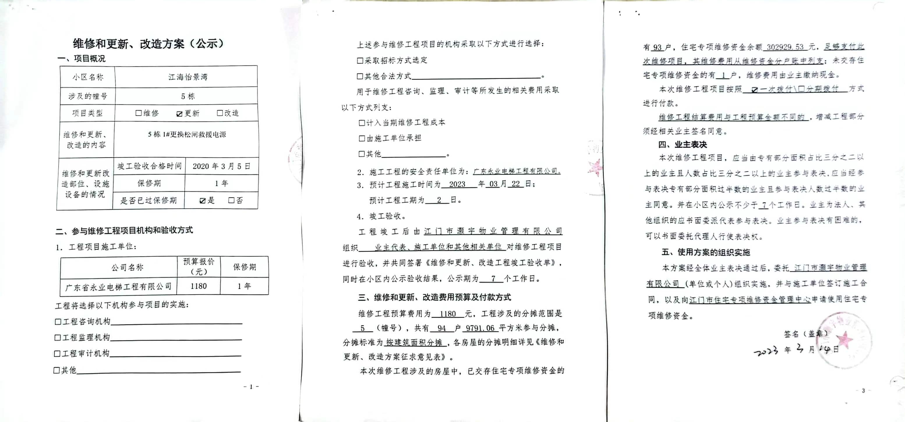 <td valign="top" values="" style="border-width:0" bindtype="0" rowspan="17" colspan="7" datasource="投票结果"><font style=" font-family:方正小标宋简体;font-size:14pt;"><p style="line-height: 1.75em;"><span style="font-family: 宋体, SimSun;">各位尊敬的业主:</span><br></p><p style="text-indent: 2em; line-height: 1.75em;"><span style="font-family: 宋体, SimSun;">根据法律法规的规定,本小区业主利用“物业公共事务决策系统”已对本小区公共事务决策事项进行了表决,在经过7日的询异公示期后,未收到业主有效的异议。现将投票结果公告,并就产生的法律效力说明如下:</span></p><p style="line-height: 1.75em; text-indent: 0em;"><strong style="text-indent: 2em;"><span style="font-family: 宋体, SimSun;">一、投票范围</span></strong></p><p style="text-indent: 2em; line-height: 1.75em;"><span style="font-family: 宋体, SimSun;">江门市江海区怡景湾君铂花园江门市江海区怡景湾君铂花园5栋</span></p><p style="text-indent: 2em; line-height: 1.75em;"><span style="font-family: 宋体, SimSun;">总人数(专有部分人数之和):91</span></p><p style="text-indent: 2em; line-height: 1.75em;"><span style="font-family: 宋体, SimSun;"><span style="font-family: 宋体, SimSun; text-indent: 32px;">总户数:94</span></span></p><p style="text-indent: 2em; line-height: 1.75em;"><span style="font-family: 宋体, SimSun;">建筑物总面积(专有部分面积之和):9791.06㎡</span></p><p style="line-height: 1.75em;"><strong><span style="font-family: 宋体, SimSun;">二、投票起止时间</span></strong></p><p style="text-indent: 2em; line-height: 1.75em;"><span style="font-family: 宋体, SimSun;">投票表决时间:从2023年03月14日到2023年03月21日止</span></p><p style="text-indent: 2em; line-height: 1.75em;"><span style="font-family: 宋体, SimSun;">投票询异公示时间:从2023年03月22日开始</span></p><p style="text-indent: 2em; line-height: 1.75em;"><span style="font-family: 宋体, SimSun;">投票结果通知公告时间:从2023年03月29日开始</span></p><p style="line-height: 1.75em;"><strong><span style="font-family: 宋体, SimSun;">三、计票规则</span></strong></p><p style="text-indent: 2em; line-height: 1.75em;"><span style="font-family: 宋体, SimSun;">表决事项:使用建筑物及其附属设施的维修资金<br></span></p><p style="font-family: 宋体, SimSun;line-height: 1.75em; text-indent: 2em;">计票规则:弃权票不并入其它项 未表决票不并入其它项</p><p></p><p style="line-height: 1.75em;"><strong><span style="font-family: 宋体, SimSun;">四、通过规则</span></strong></p><p style="text-indent: 2em; line-height: 1.75em;"><span style="font-family: 宋体, SimSun;"><span style="font-family: 宋体, SimSun; text-indent: 32px;">表决事项:使用建筑物及其附属设施的维修资金<br></span></span></p><p style="font-family: 宋体, SimSun;line-height: 1.75em; text-indent: 2em;">通过规则:参与表决专有部分面积过半数的业主且参与表决人数过半数的业主同意</p><p></p><p style="line-height: 1.75em;"><strong><span style="font-family: 宋体, SimSun;">五、投票结果</span></strong></p><p style="line-height: 1.75em; text-indent: 2em;"><span style="font-family: 宋体, SimSun; text-indent: 2em;"></span></p><div id="resultTable"><table style="table-layout: fixed; font-size:12px; margin-top:10px" width="100%" border="0" cellspacing="0" cellpadding="0"><tbody><tr><td height="28" colspan="10" align="center" style="border: 1px solid #666"><strong style="font-size: 14px;"> 使用建筑物及其附属设施的维修资金</strong></td> </tr><tr id="trfirst"><td height="28" colspan="4" style="border-left: 1px solid #666; border-bottom: 1px solid #666"><strong> 申报单位:</strong> 江门市灏宇物业管理有限公司</td><td colspan="3" style="border-left: 1px solid #666; border-bottom: 1px solid #666"><strong> 联系方式:</strong> </td><td colspan="3" style="border-left: 1px solid #666; border-bottom: 1px solid #666; border-right: 1px solid #666"><strong> 申报日期:</strong> 2023年3月13日 </td></tr><tr> <td height="28" colspan="5" style="border-left: 1px solid #666; border-bottom: 1px solid #666"><strong> 总人数(专有部分人数之和):</strong>91人 </td><td colspan="5" style="border-left: 1px solid #666; border-bottom: 1px solid #666; border-right: 1px solid #666"><strong> 建筑物总面积(专有部分面积之和):</strong>9791.06㎡ </td> </tr><tr><td height="28" colspan="10" bgcolor="#F3F3F3" style="border-left: 1px solid #666;border-bottom: 1px solid #666;border-right: 1px solid #666"><strong> 参与人数及面积统计</strong></td></tr><tr><td height="28" colspan="5" style="border-left: 1px solid #666; border-bottom: 1px solid #666"><strong> 参与表决专有部分人数之和:</strong>73人</td><td colspan="5" style="border-left: 1px solid #666; border-bottom: 1px solid #666; border-right: 1px solid #666"><strong> 参与表决占有表决权总人数比例:</strong>80.22%</td></tr><tr><td height="28" colspan="5" style="border-left: 1px solid #666; border-bottom: 1px solid #666"><strong> 参与表决专有部分面积之和:</strong>7541.21㎡</td><td colspan="5" style="border-left: 1px solid #666; border-bottom: 1px solid #666; border-right: 1px solid #666"><strong> 参与表决占有表决权总面积比例:</strong>77.02%</td></tr><tr><td height="28" colspan="10" bgcolor="#F3F3F3" style="border-left: 1px solid #666; border-bottom: 1px solid #666;border-right: 1px solid #666"> <strong> 未参与人数及面积统计</strong></td> </tr><tr><td height="28" colspan="5" style="border-left: 1px solid #666; border-bottom: 1px solid #666"><strong> 未参与表决专有部分人数之和:</strong>18人 </td><td colspan="5" style="border-left: 1px solid #666; border-bottom: 1px solid #666; border-right: 1px solid #666"><strong> 未参与表决占有表决权总人数比例:</str