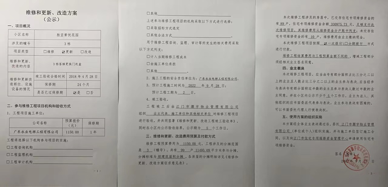 <td VALIGN="top" VALUES="" STYLE="border-width:0" BINDTYPE="0" ROWSPAN="17" COLSPAN="7" DATASOURCE="投票结果" ><font style=" font-family:方正小标宋简体;font-size:14pt;"><p style="line-height: 1.75em;"><span style="font-family: 宋体, SimSun;">各位尊敬的业主:</span><br/></p><p style="text-indent: 2em; line-height: 1.75em;"><span style="font-family: 宋体, SimSun;">根据法律法规的规定,本小区业主利用“物业公共事务决策系统”已对本小区公共事务决策事项进行了表决,在经过7日的询异公示期后,未收到业主有效的异议。现将投票结果公告,并就产生的法律效力说明如下:</span></p><p style="line-height: 1.75em; text-indent: 0em;"><strong style="text-indent: 2em;"><span style="font-family: 宋体, SimSun;">一、投票范围</span></strong></p><p style="text-indent: 2em; line-height: 1.75em;"><span style="font-family: 宋体, SimSun;">蓬江区胜坚紫悦花园蓬江区胜坚紫悦花园3幢</span></p><p style="text-indent: 2em; line-height: 1.75em;"><span style="font-family: 宋体, SimSun;">总人数(专有部分人数之和):90</span></p><p style="text-indent: 2em; line-height: 1.75em;"><span style="font-family: 宋体, SimSun;"><span style="font-family: 宋体, SimSun; text-indent: 32px;">总户数:{TotalHouseCount}</span></span></p><p style="text-indent: 2em; line-height: 1.75em;"><span style="font-family: 宋体, SimSun;">建筑物总面积(专有部分面积之和):11495.09㎡</span></p><p style="line-height: 1.75em;"><strong><span style="font-family: 宋体, SimSun;">二、投票起止时间</span></strong></p><p style="text-indent: 2em; line-height: 1.75em;"><span style="font-family: 宋体, SimSun;">投票表决时间:从2022年09月19日到2022年09月27日止</span></p><p style="text-indent: 2em; line-height: 1.75em;"><span style="font-family: 宋体, SimSun;">投票询异公示时间:从2022年09月28日开始</span></p><p style="text-indent: 2em; line-height: 1.75em;"><span style="font-family: 宋体, SimSun;">投票结果通知公告时间:从2022年10月05日开始</span></p><p style="line-height: 1.75em;"><strong><span style="font-family: 宋体, SimSun;">三、计票规则</span></strong></p><p style="text-indent: 2em; line-height: 1.75em;"><span style="font-family: 宋体, SimSun;">表决事项:使用建筑物及其附属设施的维修资金<br /><p style='font-family: 宋体, SimSun;line-height: 1.75em; text-indent: 2em;'>计票规则:弃权票不并入其它项&nbsp;&nbsp;&nbsp;&nbsp;未表决票不并入其它项</p></span></p><p style="line-height: 1.75em;"><strong><span style="font-family: 宋体, SimSun;">四、通过规则</span></strong></p><p style="text-indent: 2em; line-height: 1.75em;"><span style="font-family: 宋体, SimSun;"><span style="font-family: 宋体, SimSun; text-indent: 32px;">表决事项:使用建筑物及其附属设施的维修资金<br /><p style='font-family: 宋体, SimSun;line-height: 1.75em; text-indent: 2em;'>通过规则:参与表决专有部分面积过半数的业主且参与表决人数过半数的业主同意</p></span></span></p><p style="line-height: 1.75em;"><strong><span style="font-family: 宋体, SimSun;">五、投票结果</span></strong></p><p style="line-height: 1.75em; text-indent: 2em;"><span style="font-family: 宋体, SimSun; text-indent: 2em;"><div id='resultTable'><table style='table-layout: fixed; font-size:12px; margin-top:10px' width='100%' border='0' cellspacing='0' cellpadding='0'><tr><td height='28' colspan='10' align='center' style='border: 1px solid #666'><strong style='font-size: 14px;'> 使用建筑物及其附属设施的维修资金</strong></td> </tr><tr id='trfirst'><td height='28' colspan='4' style='border-left: 1px solid #666; border-bottom: 1px solid #666'><strong>&nbsp;申报单位:</strong> 江门市灏宇物业管理有限公司</td><td colspan='3' style='border-left: 1px solid #666; border-bottom: 1px solid #666'><strong>&nbsp;联系方式:</strong> </td><td colspan='3' style='border-left: 1px solid #666; border-bottom: 1px solid #666; border-right: 1px solid #666'><strong>&nbsp;申报日期:</strong> 2022年9月15日 </td></tr><tr> <td height='28' colspan='5' style='border-left: 1px solid #666; border-bottom: 1px solid #666'><strong>&nbsp;总人数(专有部分人数之和):</strong>90人 </td><td colspan='5' style='border-left: 1px solid #666; border-bottom: 1px solid #666; border-right: 1px solid #666'><strong>&nbsp;建筑物总面积(专有部分面积之和):</strong>11495.09㎡ </td> </tr><tr><td height='28' colspan='10' style='border: 1px solid #666'><strong>&nbsp;该事项表决是否通过:通过(选项为:A:同意)</strong></td></tr><tr><td height='28' colspan='10' bgcolor='#F3F3F3' style='border-left: 1px solid #666;border-bottom: 1px solid #666;border-right: 1px solid #666'><strong>&nbsp;参与人数及面积统计</strong></td></tr><tr><td height='28' colspan='5' style='border-left: 1px solid #666; border-bottom: 1px solid #666'><strong>&nbsp;参与表决专有部分人数之和:</strong>76人</td><td colspan='5' style='border-left: 1px solid #666; border-bottom: 1px solid #666; border-right: 1px solid #666'><strong>&nbsp;参与表决占有表决权总人数比例:</strong>84.44%</td></tr><tr><td height='28' colspan='5' style='border-left: 1px solid #666; border-bottom: 1px solid #666'><strong>&nbsp;参与表决专有部分面积之和:</strong>8751.81㎡</td><td colspan='5' style='border-left: 1px solid #666; border-bottom: 1px solid #666; border-right: 1px solid #666'><strong>&nbsp;参与表决占有表决权总面积比例:</strong>76.14%</td></tr><tr><td height='28' colspan='10' bgcolor='#F3F3F3' style='border-left: 1px solid #666; border-bottom: 1px solid #666;border-right: 1px solid #666'> <strong>&nbsp;未参与人数及面积统计</strong></td> </tr><tr><td height='28' colspan='5' style='border-left: 1px solid #666; border-bottom: 1px solid #666'><strong>&nbsp;未参与表决专有部分人