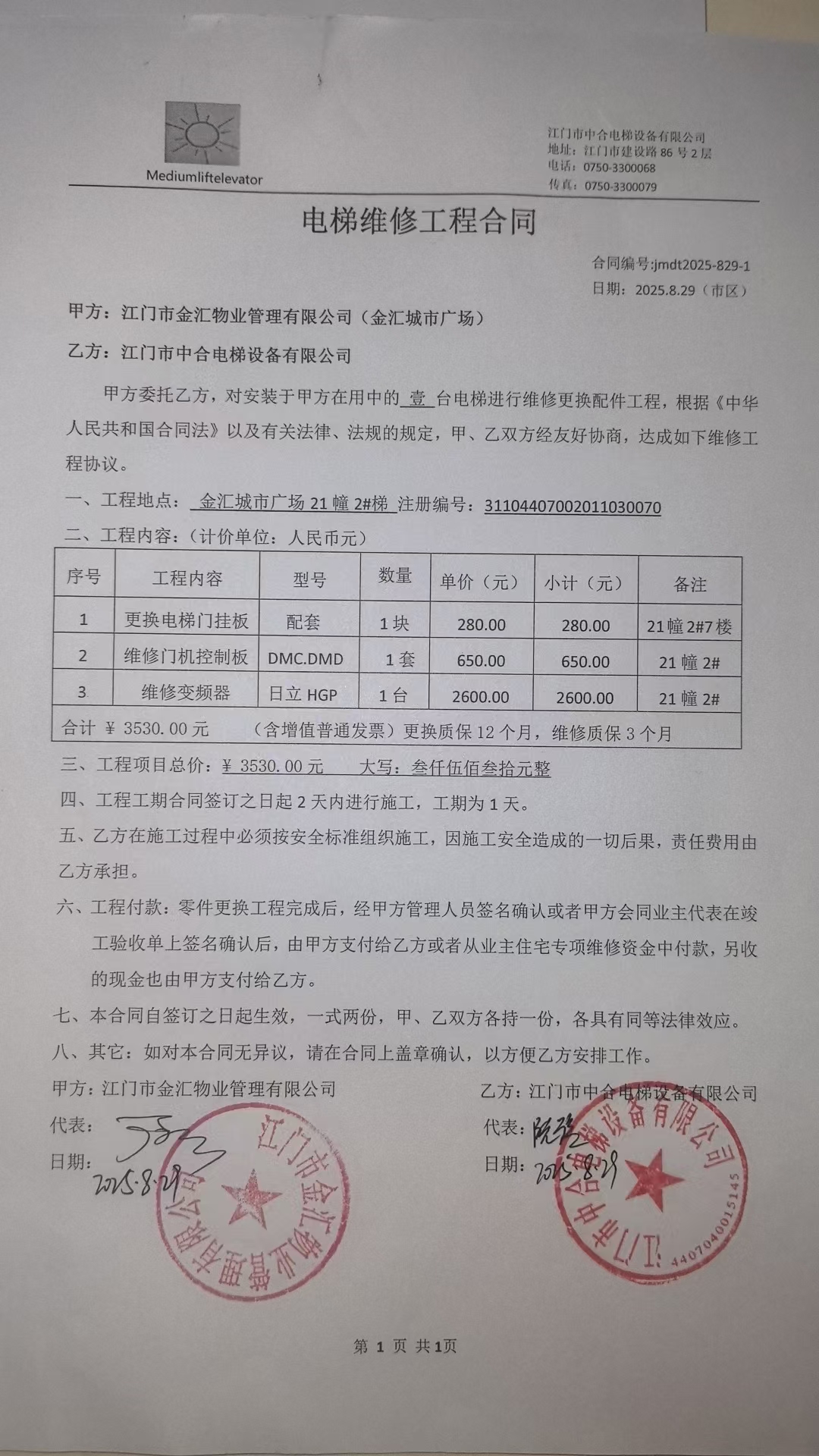 <td valign="top" values="" style="border-width:0" bindtype="0" rowspan="17" colspan="7" datasource="投票结果"><font style=" font-family:方正小标宋简体;font-size:14pt;"><p style="line-height: 1.75em;"><span style="font-family: 宋体, SimSun;">各位尊敬的业主:</span><br></p><p style="text-indent: 2em; line-height: 1.75em;"><span style="font-family: 宋体, SimSun;">根据法律法规的规定,本小区业主利用“江门市物业事项表决管理系统”已对本小区公共事务决策事项(<span style="font-family: 宋体; text-indent: 32px;">金汇城市广场关于21幢2#电梯更换门挂板、维修门机控制板、维修变频器工程维修资金的投票</span>)进行了表决,在经过7日的询异公示期后,未收到业主有效的异议。现将投票结果公告,并就产生的法律效力说明如下:</span></p><p style="line-height: 1.75em; text-indent: 0em;"><strong style="text-indent: 2em;"><span style="font-family: 宋体, SimSun;">一、投票范围</span></strong></p><p style="text-indent: 2em; line-height: 1.75em;"><span style="font-family: 宋体, SimSun;">金汇城市广场蓬江区金汇城市广场21幢</span></p><p style="text-indent: 2em; line-height: 1.75em;"><span style="font-family: 宋体, SimSun;">总人数(专有部分人数之和):72</span></p><p style="text-indent: 2em; line-height: 1.75em;"><span style="font-family: 宋体, SimSun;"><span style="font-family: 宋体, SimSun; text-indent: 32px;"><span style="font-family: 宋体; text-indent: 32px;"><span style="font-family: 宋体; text-indent: 32px;">总户数:72</span></span></span></span></p><p style="text-indent: 2em; line-height: 1.75em;"><span style="font-family: 宋体, SimSun;">建筑物总面积(专有部分面积之和):10700.33㎡</span></p><p style="line-height: 1.75em;"><strong><span style="font-family: 宋体, SimSun;">二、投票结果公告时间</span></strong></p><p style="text-indent: 2em; line-height: 1.75em;"><span style="font-family: 宋体, SimSun;"><span style="font-family: 宋体, SimSun; text-indent: 32px;">从2026年03月13日开始</span></span></p><p style="line-height: 1.75em;"><strong><span style="font-family: 宋体, SimSun;">三、计票规则</span></strong></p><p style="text-indent: 2em; line-height: 1.75em;"><span style="font-family: 宋体, SimSun;">表决事项:使用建筑物及其附属设施的维修资金<br></span></p><p style="font-family: 宋体, SimSun;line-height: 1.75em; text-indent: 2em;">计票规则:弃权票不并入其它项 未表决票不并入其它项</p><p></p><p style="line-height: 1.75em;"><strong><span style="font-family: 宋体, SimSun;">四、通过规则</span></strong></p><p style="line-height: 1.75em;"><strong><span style="font-family: 宋体, SimSun;"> 根据《中华人民共和国民法典》第二百七十八条规定:业主共同决定事项,应当由专有部分面积占比三分之二以上的业主且人数占比三分之二以上的业主参与表决。</span></strong></p><p style="text-indent: 2em; line-height: 1.75em;"><span style="font-family: 宋体, SimSun;"><span style="font-family: 宋体, SimSun; text-indent: 32px;">表决事项:使用建筑物及其附属设施的维修资金<br></span></span></p><p style="font-family: 宋体, SimSun;line-height: 1.75em; text-indent: 2em;">通过规则:双2/3以上参与表决,参与表决双过半同意</p><p></p><p style="line-height: 1.75em;"><strong><span style="font-family: 宋体, SimSun;">五、投票结果</span></strong></p><p style="line-height: 1.75em; text-indent: 2em;"><span style="font-family: 宋体, SimSun; text-indent: 2em;"></span></p><div id="resultTable"><table style="table-layout: fixed; font-size:12px; margin-top:10px" width="100%" border="0" cellspacing="0" cellpadding="0"><tbody><tr><td height="28" colspan="10" align="center" style="border: 1px solid #666"><strong style="font-size: 14px;"> 使用建筑物及其附属设施的维修资金</strong></td> </tr><tr id="trfirst"><td height="28" colspan="4" style="border-left: 1px solid #666; border-bottom: 1px solid #666"><strong> 申报单位:</strong> 江门市金汇物业管理有限公司</td><td colspan="3" style="border-left: 1px solid #666; border-bottom: 1px solid #666"><strong> 联系方式:</strong> 3929003 </td><td colspan="3" style="border-left: 1px solid #666; border-bottom: 1px solid #666; border-right: 1px solid #666"><strong> 申报日期:</strong> 2025年9月19日 </td></tr><tr> <td height="28" colspan="5" style="border-left: 1px solid #666; border-bottom: 1px solid #666"><strong> 列支总人数(专有部分人数之和):</strong>72人 </td><td colspan="5" style="border-left: 1px solid #666; border-bottom: 1px solid #666; border-right: 1px solid #666"><strong> 列支建筑物总面积(专有部分面积之和):</strong>10700.33㎡ </td> </tr><tr><td height="28" colspan="10" bgcolor="#F3F3F3" style="border-left: 1px solid #666;border-bottom: 1px solid #666;border-right: 1px solid #666"><strong> 参与表决人数及面积统计</strong></td></tr><tr><td height="28" colspan="5" style="border-left: 1px solid #666; border-bottom: 1px solid #666"><strong> 参与表决人数:</strong>53人</td><td colspan="5" style="border-left: 1px solid #666; border-bottom: 1px solid #666; border-right: 1px solid #666"><strong> 参与表决人数占总人数比例:</strong>73.61%</td></tr><tr><td height="28" colspan="5" style="border-left: 1px solid #666; border-bottom: 1px solid #666"><strong> 参与表决面积:</strong>8016.79㎡</td><td colspan="5" style="border-left: 1px solid #666; border-bottom: 1px solid #666; border-right: 1px solid #666"><strong> 参与表决面积占总面积比例:</strong>74.92%</td></tr><tr><td height="28" colspan="10" bgcolor="#F3F3F3" style="border-left: 1px solid #666; border-bottom: 1px solid #666;border-right: 1px solid #666"> <strong> 参与表决同意人数及面积统计</strong></td> </tr><tr><td height="28" colspan="5" style="border-left: 1px solid #666; bor