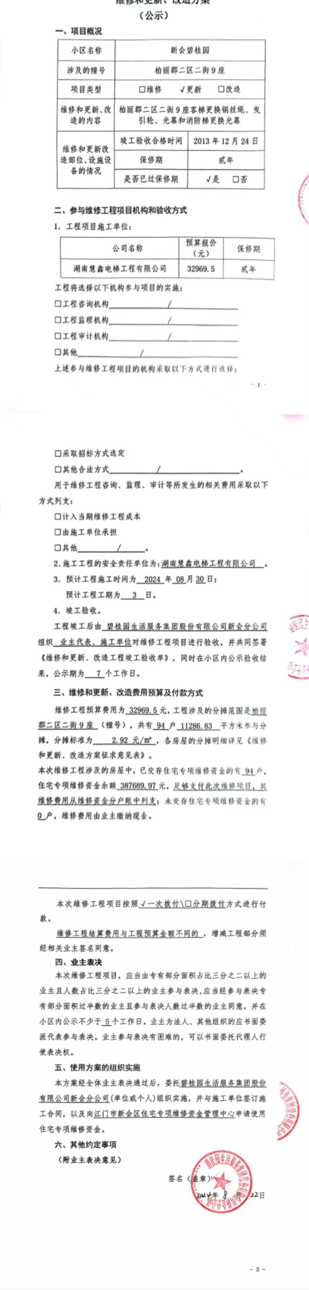 <td VALIGN="top" VALUES="" STYLE="border-width:0" BINDTYPE="0" ROWSPAN="19" COLSPAN="7" DATASOURCE="投票结果" ><font style="font-size:14pt;"><p style="white-space: normal; font-family: 宋体; line-height: 1.75em;">新会碧桂园碧桂园柏丽郡二区二街9座全体业主:</p><p style="white-space: normal; font-family: 宋体; line-height: 1.75em; text-indent: 2em;">本小区关于新会碧桂园柏丽郡二区二街9座客梯更换钢丝绳、曳引轮、光幕和消防梯更换光幕使用维修资金的投票的投票已表决结束,询异时间从2024年08月29日开始,投票询异公示期间,业主可通过微信查询自己的表决情况或可凭身份证件申请查询自己的表决情况;如公示的业主表决情况与查询的本人表决意见不一致的,可以以书面形式向投票组织机构申诉,投票组织机构予以纠正并重新公示表决结果。异议提出人对投票组织机构的处理仍有异议的,可以向街道办事处(镇人民政府)反映处理,涉及住宅专项维修资金的,可向属地住宅专项维修资金管理中心反映处理。</p><p style="white-space: normal;"><br/></p><p style="white-space: normal; font-family: 宋体; line-height: 1.75em;"><strong>附件:</strong></p><p style="white-space: normal; font-family: 宋体; line-height: 1.75em;"><strong>一、投票范围</strong></p><p style="white-space: normal; font-family: 宋体; line-height: 1.75em; text-indent: 2em;">新会碧桂园碧桂园柏丽郡二区二街9座</p><p style="white-space: normal; font-family: 宋体; line-height: 1.75em; text-indent: 2em;">总人数(专有部分人数之和):92</p><p style="white-space: normal; font-family: 宋体; line-height: 1.75em; text-indent: 2em;"><span style="font-family: 宋体, SimSun;"><span style="font-family: 宋体; text-indent: 32px;"><span style="font-family: 宋体; text-indent: 32px;">总户数:94</span></span></span></p><p style="white-space: normal; font-family: 宋体; line-height: 1.75em; text-indent: 2em;">建筑物总面积(专有部分面积之和):11286.83㎡</p><p style="white-space: normal; font-family: 宋体; line-height: 1.75em;"><strong>二、询异公示起止时间</strong></p><p dir="ltr" style="white-space: normal; font-family: 宋体; line-height: 1.75em; text-indent: 2em;"><span style="text-indent: 36px;">2024年08月29日至2024年09月04日</span></p><p style="white-space: normal; font-family: 宋体; line-height: 1.75em;"><strong>三、投票详细描述</strong></p><p style="white-space: normal; font-family: 宋体; line-height: 1.75em; text-indent: 2em;"><p><span style="font-family: "Helvetica Neue", Helvetica, Arial, sans-serif; font-size: 14px; background-color: rgb(255, 255, 255);">新会碧桂园柏丽郡二区二街9座客梯在每个楼层停止时都与地面不对称,客梯和消防梯开关门时出现异常,容易夹到人,经检查,是由于客梯的钢丝绳散股和曳引轮磨损导致电梯停梯位置与地面不对称,客梯和消防梯光幕损坏造成开关门异常。 现对新会碧桂园柏丽郡二区二街9座客梯钢丝绳、曳引轮、光幕和消防梯光幕进行更换,工程维修预算约32969.5元,项目最终费用以施工合同签订为准。因已过保修期,维修费用由相关业主按建筑面积分摊,每平方约2.92元,详见公示附件,如业主手机不能正常通过微信投票,请联系物业公司进行线下纸质投票,物业电话:17308202886梁管家. </span></p></p><p style="white-space: normal; font-family: 宋体; line-height: 1.75em;"><strong>四、计票规则</strong></p><p style="white-space: normal; font-family: 宋体; line-height: 1.75em; text-indent: 2em;">表决事项:使用建筑物及其附属设施的维修资金<br /><p style='text-align: left; font-family: 宋体; font-size: 16px; line-height: 1.75em; text-indent: 2em;'>计票规则:弃权票不并入其它项 未表决票不并入其它项</p></p><p style="white-space: normal; font-family: 宋体; line-height: 1.75em;"><strong>五、通过规则</strong></p><p style="white-space: normal; font-family: 宋体; line-height: 1.75em;"><strong><strong style="white-space: normal;"><span style="font-family: 宋体, SimSun;"> 根据《中华人民共和国民法典》第二百七十八条规定:业主共同决定事项,应当由专有部分面积占比三分之二以上的业主且人数占比三分之二以上的业主参与表决。</span></strong></strong></p><p style="white-space: normal; font-family: 宋体; line-height: 1.75em; text-indent: 2em;">表决事项:使用建筑物及其附属设施的维修资金<br /><p style='text-align: left; font-family: 宋体; font-size: 16px; line-height: 1.75em; text-indent: 2em;'>通过规则:双2/3以上参与表决,参与表决双过半同意</p></p><p style="white-space: normal; font-family: 宋体; line-height: 1.75em;"><strong>六、投票结果</strong></p><p style="white-space: normal; font-family: 宋体; line-height: 1.75em; text-indent: 2em;"><div id='resultTable'><table style='table-layout: fixed; font-size:12px; margin-top:10px' width='100%' border='0' cellspacing='0' cellpadding='0'><tr><td height='28' colspan='10' align='center' style='border: 1px solid #666'><strong style='font-size: 14px;'> 使用建筑物及其附属设施的维修资金</strong></td> </tr><tr id='trfirst'><td height='28' colspan='4' style='border-left: 1px solid #666; border-bottom: 1px solid #666'><strong> 申报单位:</strong> 碧桂园生活服务集团股份有限公司新会分公司</td><td colspan='3' style='border-left: 1px solid #666; border-bottom: 1px solid #666'><strong> 联系方式:</strong> </td><td colspan='3' style='border-left: 1px solid #666; border-bottom: 1px solid #666; border-right: 1px solid #666'><strong> 申报日期:</strong> 2024年8月23日 </td></tr><tr> <td height='28' colspan='5' style='border-left: 1px solid #666; border-bottom: 1px solid #666'><strong> 总人数(专有部分人数之和):</strong>92人 </td><td 