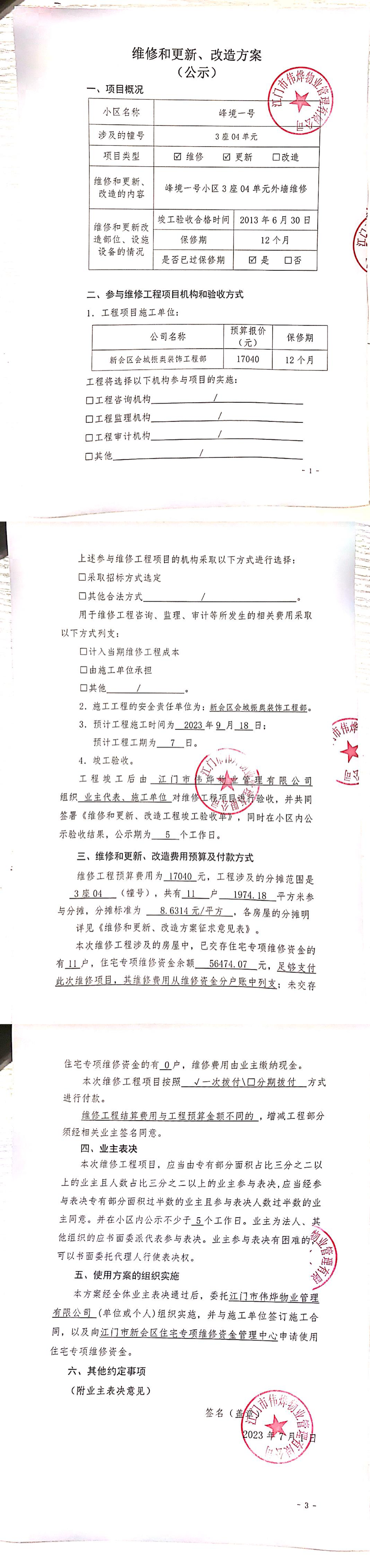 <td valign="top" values="" style="border-width:0" bindtype="0" rowspan="19" colspan="7" datasource="投票结果"><font style="font-size:14pt;"><p style="white-space: normal; font-family: 宋体; line-height: 1.75em;">峰境一号圭阳北路35号3座全体业主:</p><p style="white-space: normal; font-family: 宋体; line-height: 1.75em; text-indent: 2em;">本小区关于峰境一号3座04单元维修外墙使用维修资金的投票的投票已表决结束,询异时间从2023年09月03日开始,投票询异公示期间,业主可通过微信查询自己的表决情况或可凭身份证件申请查询自己的表决情况;如公示的业主表决情况与查询的本人表决意见不一致的,可以以书面形式向投票组织机构申诉,投票组织机构予以纠正并重新公示表决结果。异议提出人对投票组织机构的处理仍有异议的,可以向街道办事处(镇人民政府)反映处理,涉及住宅专项维修资金的,可向属地住宅专项维修资金管理中心反映处理。</p><p style="white-space: normal;"><br></p><p style="white-space: normal; font-family: 宋体; line-height: 1.75em;"><strong>附件:</strong></p><p style="white-space: normal; font-family: 宋体; line-height: 1.75em;"><strong>一、投票范围</strong></p><p style="white-space: normal; font-family: 宋体; line-height: 1.75em; text-indent: 2em;">峰境一号圭阳北路35号3座</p><p style="white-space: normal; font-family: 宋体; line-height: 1.75em; text-indent: 2em;">总人数(专有部分人数之和):11</p><p style="white-space: normal; font-family: 宋体; line-height: 1.75em; text-indent: 2em;"><span style="font-family: 宋体, SimSun;">总户数:11</span></p><p style="white-space: normal; font-family: 宋体; line-height: 1.75em; text-indent: 2em;">建筑物总面积(专有部分面积之和):1974.18㎡</p><p style="white-space: normal; font-family: 宋体; line-height: 1.75em;"><strong>二、询异公示起止时间</strong></p><p dir="ltr" style="white-space: normal; font-family: 宋体; line-height: 1.75em; text-indent: 2em;"><span style="text-indent: 36px;">2023年09月03日至2023年09月09日</span></p><p style="white-space: normal; font-family: 宋体; line-height: 1.75em;"><strong>三、投票详细描述</strong></p><p style="white-space: normal; font-family: 宋体; line-height: 1.75em; text-indent: 2em;"></p><p>本小区3座04单元公共外墙出现脱落,经检查,是由于日久使用 ,导致墙体脱落,存在安全隐患 。已过保修期。现需申请使用维修资金对3座04单元公共外墙进行高空搭棚维修及修复,工程维修预算金额为 17040 元,项目最终费用以施工合同签订金额为准。维修费用的分摊标准为按建筑面积计算, 每平方约: 8.6314 元,详见公示附件。如业主手机不能正常通过微信投票,请联系物业公司进行线下纸质投票,物业公司联系电话:18029402360.</p><p></p><p style="white-space: normal; font-family: 宋体; line-height: 1.75em;"><strong>四、计票规则</strong></p><p style="white-space: normal; font-family: 宋体; line-height: 1.75em; text-indent: 2em;">表决事项:使用建筑物及其附属设施的维修资金<br></p><p style="text-align: left; font-family: 宋体; font-size: 16px; line-height: 1.75em; text-indent: 2em;">计票规则:弃权票不并入其它项 未表决票不并入其它项</p><p></p><p style="white-space: normal; font-family: 宋体; line-height: 1.75em;"><strong>五、通过规则</strong></p><p style="white-space: normal; font-family: 宋体; line-height: 1.75em; text-indent: 2em;">表决事项:使用建筑物及其附属设施的维修资金<br></p><p style="text-align: left; font-family: 宋体; font-size: 16px; line-height: 1.75em; text-indent: 2em;">通过规则:参与表决专有部分面积过半数的业主且参与表决人数过半数的业主同意</p><p></p><p style="white-space: normal; font-family: 宋体; line-height: 1.75em;"><strong>六、投票结果</strong></p><p style="white-space: normal; font-family: 宋体; line-height: 1.75em; text-indent: 2em;"></p><div id="resultTable"><table style="table-layout: fixed; font-size:12px; margin-top:10px" width="100%" border="0" cellspacing="0" cellpadding="0"><tbody><tr><td height="28" colspan="10" align="center" style="border: 1px solid #666"><strong style="font-size: 14px;"> 使用建筑物及其附属设施的维修资金</strong></td> </tr><tr id="trfirst"><td height="28" colspan="4" style="border-left: 1px solid #666; border-bottom: 1px solid #666"><strong> 申报单位:</strong> 江门市伟烨物业管理有限公司</td><td colspan="3" style="border-left: 1px solid #666; border-bottom: 1px solid #666"><strong> 联系方式:</strong> 0750-6123828 </td><td colspan="3" style="border-left: 1px solid #666; border-bottom: 1px solid #666; border-right: 1px solid #666"><strong> 申报日期:</strong> 2023年7月1日 </td></tr><tr> <td height="28" colspan="5" style="border-left: 1px solid #666; border-bottom: 1px solid #666"><strong> 总人数(专有部分人数之和):</strong>11人 </td><td colspan="5" style="border-left: 1px solid #666; border-bottom: 1px solid #666; border-right: 1px solid #666"><strong> 建筑物总面积(专有部分面积之和):</strong>1974.18㎡ </td> </tr><tr><td height="28" colspan="10" bgcolor="#F3F3F3" style="border-left: 1px solid #666;border-bottom: 1px solid #666;border-right: 1px solid #666"><strong> 参与人数及面积统计</strong></td></tr><tr><td height="28" colspan="5" style="border-left: 1px solid #666; border-bottom: 1px solid #666"><strong> 参与表决专有部分人数之和:</strong>4人</td><td colspan="5" style="border-left: 1px solid #666; border-bottom: 1px solid #666; border-right: 1px solid #666"><strong> 参与表决占有表决权总人数比例:</strong>36.36%</td></tr><tr><td height="28" colspan="5" style="border-left: 1px solid #666; border-bottom: 1px solid #666"><strong> 参与表决专有部分面积之和:</s