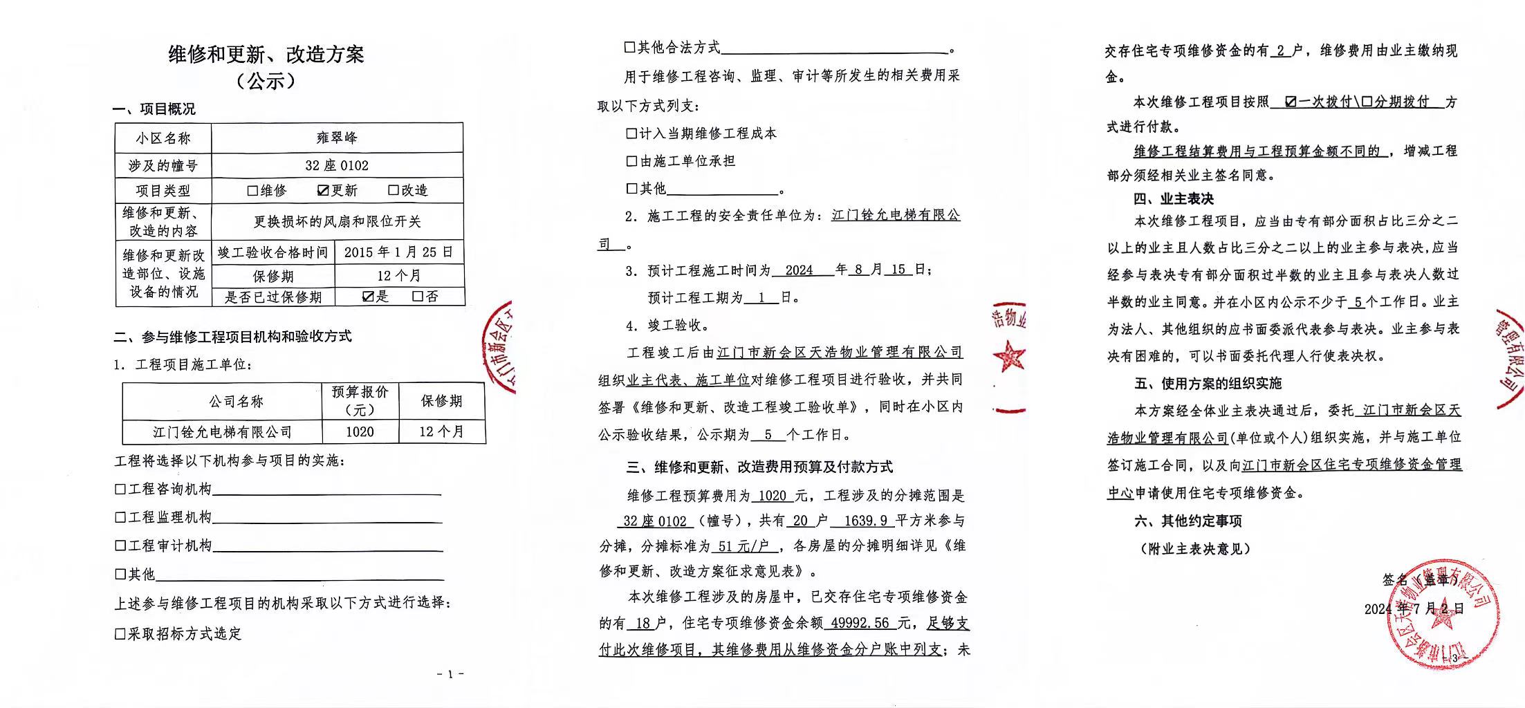 <td VALIGN="top" VALUES="" STYLE="border-width:0" BINDTYPE="0" ROWSPAN="17" COLSPAN="7" DATASOURCE="投票结果" ><font style=" font-family:方正小标宋简体;font-size:14pt;"><p style="line-height: 1.75em;"><span style="font-family: 宋体, SimSun;">各位尊敬的业主:</span><br/></p><p style="text-indent: 2em; line-height: 1.75em;"><span style="font-family: 宋体, SimSun;">根据法律法规的规定,本小区业主利用“江门市物业事项表决管理系统”已对本小区公共事务决策事项进行了表决,在经过7日的询异公示期后,未收到业主有效的异议。现将投票结果公告,并就产生的法律效力说明如下:</span></p><p style="line-height: 1.75em; text-indent: 0em;"><strong style="text-indent: 2em;"><span style="font-family: 宋体, SimSun;">一、投票范围</span></strong></p><p style="text-indent: 2em; line-height: 1.75em;"><span style="font-family: 宋体, SimSun;">雍翠峰雍翠峰32座</span></p><p style="text-indent: 2em; line-height: 1.75em;"><span style="font-family: 宋体, SimSun;">总人数(专有部分人数之和):20</span></p><p style="text-indent: 2em; line-height: 1.75em;"><span style="font-family: 宋体, SimSun;"><span style="font-family: 宋体, SimSun; text-indent: 32px;"><span style="font-family: 宋体; text-indent: 32px;"><span style="font-family: 宋体; text-indent: 32px;">总户数:20</span></span></span></span></p><p style="text-indent: 2em; line-height: 1.75em;"><span style="font-family: 宋体, SimSun;">建筑物总面积(专有部分面积之和):1639.90㎡</span></p><p style="line-height: 1.75em;"><strong><span style="font-family: 宋体, SimSun;">二、投票结果公告时间</span></strong></p><p style="text-indent: 2em; line-height: 1.75em;"><span style="font-family: 宋体, SimSun;"><span style="font-family: 宋体, SimSun; text-indent: 32px;">从2024年07月13日开始</span></span></p><p style="line-height: 1.75em;"><strong><span style="font-family: 宋体, SimSun;">三、计票规则</span></strong></p><p style="text-indent: 2em; line-height: 1.75em;"><span style="font-family: 宋体, SimSun;">表决事项:使用建筑物及其附属设施的维修资金<br /><p style='font-family: 宋体, SimSun;line-height: 1.75em; text-indent: 2em;'>计票规则:弃权票不并入其它项&nbsp;&nbsp;&nbsp;&nbsp;未表决票不并入其它项</p></span></p><p style="line-height: 1.75em;"><strong><span style="font-family: 宋体, SimSun;">四、通过规则</span></strong></p><p style="line-height: 1.75em;"><strong><span style="font-family: 宋体, SimSun;">&nbsp; 根据《中华人民共和国民法典》第二百七十八条规定:业主共同决定事项,应当由专有部分面积占比三分之二以上的业主且人数占比三分之二以上的业主参与表决。</span></strong></p><p style="text-indent: 2em; line-height: 1.75em;"><span style="font-family: 宋体, SimSun;"><span style="font-family: 宋体, SimSun; text-indent: 32px;">表决事项:使用建筑物及其附属设施的维修资金<br /><p style='font-family: 宋体, SimSun;line-height: 1.75em; text-indent: 2em;'>通过规则:双2/3以上参与表决,参与表决双过半同意</p></span></span></p><p style="line-height: 1.75em;"><strong><span style="font-family: 宋体, SimSun;">五、投票结果</span></strong></p><p style="line-height: 1.75em; text-indent: 2em;"><span style="font-family: 宋体, SimSun; text-indent: 2em;"><div id='resultTable'><table style='table-layout: fixed; font-size:12px; margin-top:10px' width='100%' border='0' cellspacing='0' cellpadding='0'><tr><td height='28' colspan='10' align='center' style='border: 1px solid #666'><strong style='font-size: 14px;'> 使用建筑物及其附属设施的维修资金</strong></td> </tr><tr id='trfirst'><td height='28' colspan='4' style='border-left: 1px solid #666; border-bottom: 1px solid #666'><strong>&nbsp;申报单位:</strong> 江门市新会区天浩物业管理有限公司</td><td colspan='3' style='border-left: 1px solid #666; border-bottom: 1px solid #666'><strong>&nbsp;联系方式:</strong> </td><td colspan='3' style='border-left: 1px solid #666; border-bottom: 1px solid #666; border-right: 1px solid #666'><strong>&nbsp;申报日期:</strong> 2024年7月3日 </td></tr><tr> <td height='28' colspan='5' style='border-left: 1px solid #666; border-bottom: 1px solid #666'><strong>&nbsp;总人数(专有部分人数之和):</strong>20人 </td><td colspan='5' style='border-left: 1px solid #666; border-bottom: 1px solid #666; border-right: 1px solid #666'><strong>&nbsp;建筑物总面积(专有部分面积之和):</strong>1639.90㎡ </td> </tr><tr><td height='28' colspan='10' bgcolor='#F3F3F3' style='border-left: 1px solid #666;border-bottom: 1px solid #666;border-right: 1px solid #666'><strong>&nbsp;参与表决人数及面积统计</strong></td></tr><tr><td height='28' colspan='5' style='border-left: 1px solid #666; border-bottom: 1px solid #666'><strong>&nbsp;参与表决人数:</strong>14人</td><td colspan='5' style='border-left: 1px solid #666; border-bottom: 1px solid #666; border-right: 1px solid #666'><strong>&nbsp;参与表决人数占总人数比例:</strong>70.00%</td></tr><tr><td height='28' colspan='5' style='border-left: 1px solid #666; border-bottom: 1px solid #666'><strong>&nbsp;参与表决面积:</strong>1170.95㎡</td><td colspan='5' style='border-left: 1px solid #666; border-bottom: 1px solid #666; border-right: 1px solid #666'><strong>&nbsp;参与表决面积占总面积比例:</strong>71.40%</td></tr><tr><td height='28' colspan='10' bgcolor='#F3F3F3' style='border-left: 1px solid #666; border-bottom: 1px solid #666;border-right: 1px solid #666'> <strong>&nbsp;参与表决同意人数及面积统计</strong></td> </tr><tr><td height='28' colspan='5' style='border-left: 1px solid #666; border-bottom: 1px solid #666'><strong>&nbsp;参与表决同意人数:</strong>14人 </td><td colspan='5' style='border-left: 1px solid #666; border-bottom: 1px solid #66