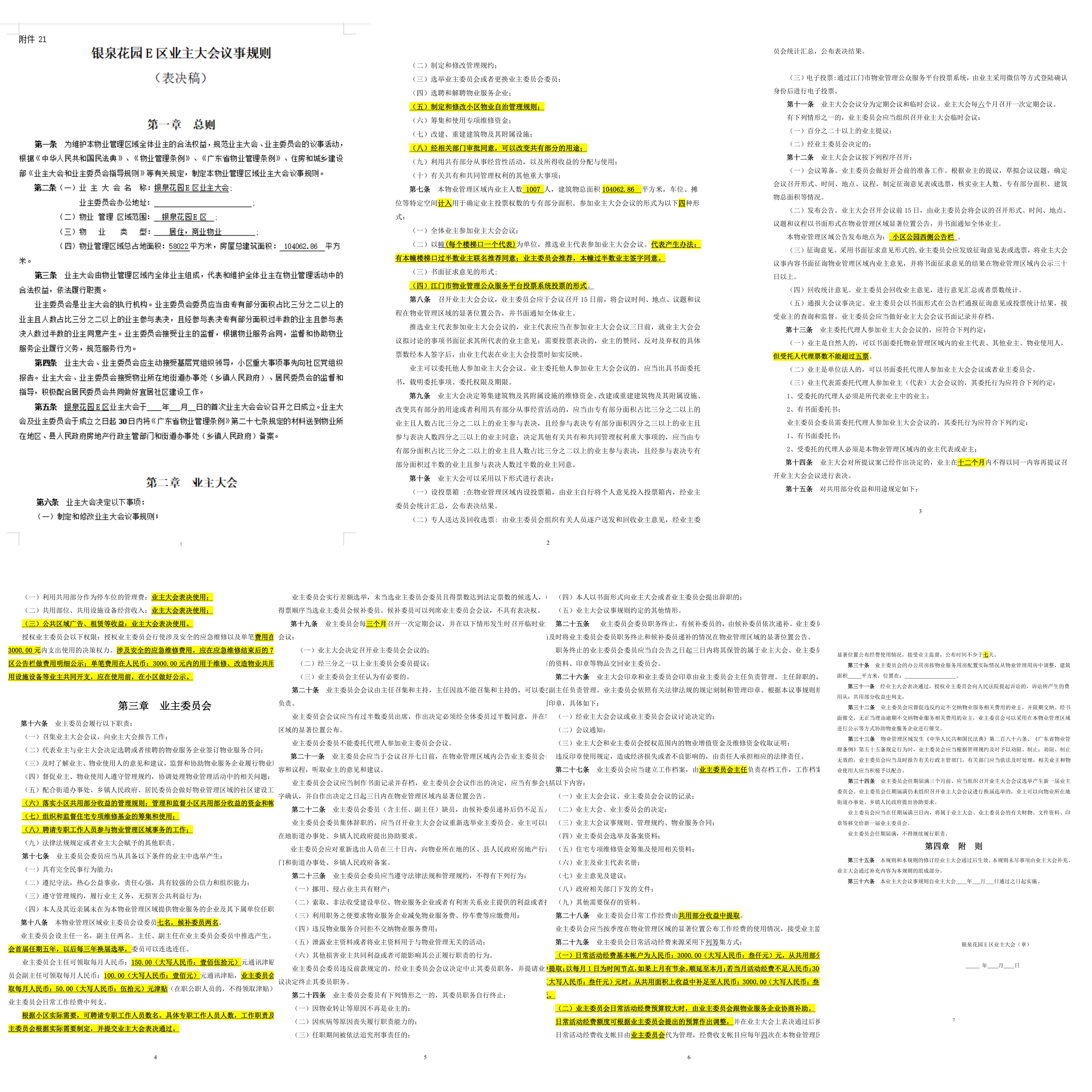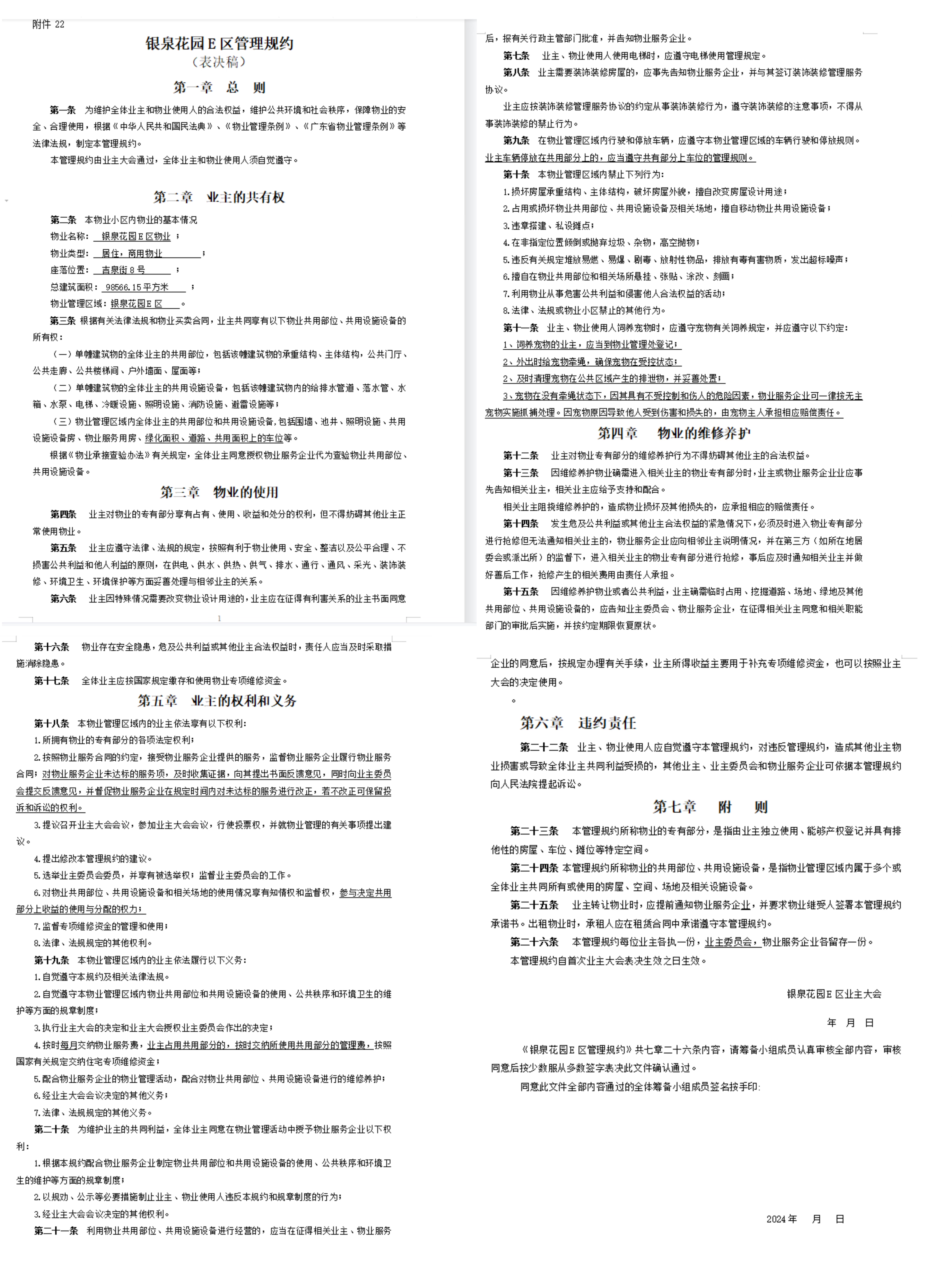 <td VALIGN="top" VALUES="" STYLE="border-width:0" BINDTYPE="0" ROWSPAN="17" COLSPAN="7" DATASOURCE="投票结果" ><font style=" font-family:方正小标宋简体;font-size:14pt;"><p style="line-height: 1.75em;"><span style="font-family: 宋体, SimSun;">各位尊敬的业主:</span><br/></p><p style="text-indent: 2em; line-height: 1.75em;"><span style="font-family: 宋体, SimSun;">根据法律法规的规定,本小区业主利用“江门市物业事项表决管理系统”已对本小区公共事务决策事项进行了表决,在经过7日的询异公示期后,未收到业主有效的异议。现将投票结果公告,并就产生的法律效力说明如下:</span></p><p style="line-height: 1.75em; text-indent: 0em;"><strong style="text-indent: 2em;"><span style="font-family: 宋体, SimSun;">一、投票范围</span></strong></p><p style="text-indent: 2em; line-height: 1.75em;"><span style="font-family: 宋体, SimSun;">银泉花园E区50幢、51幢、52幢、53幢、55幢、56幢、57幢之二、57幢之一、58幢之二、58幢之一、59幢之二、59幢之一、60幢、61幢之二、61幢之一、62幢之二、62幢之一、63幢之二、63幢之一、65幢之二、65幢之一、66幢之二、66幢之一、67幢之二、67幢之一、68幢之二、68幢之三、68幢之一、69幢之二、69幢之三、69幢之四、69幢之一、70幢之二、70幢之三、70幢之一、71幢之二、71幢之一、72幢之二、72幢之三、72幢之一、73幢、75幢、76幢、77幢、78幢之二、78幢之一、79幢、79幢之二、79幢之一、80幢之二、80幢之一、81幢之二、81幢之一、82幢之二、82幢之三、82幢之一、83幢-、83幢之二、83幢之三、83幢之四、83幢之一、83幢之一#、85幢、85幢之二、85幢之一、86幢、86幢之二、86幢之三、86幢之四、86幢之一、87幢之二、87幢之一、88幢之二、88幢之三、88幢之一、金星路150号、金星路152号、金星路154号、金星路156号、金星路158号、金星路160号、麻园路100号、麻园路84号、麻园路86号、麻园路88号、麻园路90号、麻园路92号、麻园路94号、麻园路96号、麻园路98号</span></p><p style="text-indent: 2em; line-height: 1.75em;"><span style="font-family: 宋体, SimSun;">总人数(专有部分人数之和):1007</span></p><p style="text-indent: 2em; line-height: 1.75em;"><span style="font-family:宋体, SimSun">总户数:1079</span></p><p style="text-indent: 2em; line-height: 1.75em;"><span style="font-family: 宋体, SimSun;">建筑物总面积(专有部分面积之和):104062.86㎡</span></p><p style="line-height: 1.75em;"><strong><span style="font-family: 宋体, SimSun;">二、<strong style="white-space: normal;"><span style="font-family: 宋体, SimSun;">投票结果公告时间</span></strong></span></strong></p><p style="text-indent: 2em; line-height: 1.75em;"><span style="font-family: 宋体, SimSun;"></span><span style="font-family: 宋体, SimSun; text-indent: 32px;">从2024年07月11日开始</span><span style="font-family: 宋体, SimSun;"></span></p><p style="line-height: 1.75em;"><strong><span style="font-family: 宋体, SimSun;">三、计票规则</span></strong></p><p style="text-indent: 2em; line-height: 1.75em;"><span style="font-family: 宋体, SimSun;">表决事项:表决《银泉花园E区业主大会议事规则》<br /><p style='font-family: 宋体, SimSun;line-height: 1.75em; text-indent: 2em;'>计票规则:弃权票不并入其它项&nbsp;&nbsp;&nbsp;&nbsp;未表决票不并入其它项</p><br />表决事项:表决《银泉花园E区管理规约》<br /><p style='font-family: 宋体, SimSun;line-height: 1.75em; text-indent: 2em;'>计票规则:弃权票不并入其它项&nbsp;&nbsp;&nbsp;&nbsp;未表决票不并入其它项</p></span></p><p style="line-height: 1.75em;"><strong><span style="font-family: 宋体, SimSun;">四、通过规则</span></strong></p><p style="line-height: 1.75em;"><strong><span style="font-family: 宋体, SimSun;"><strong style="font-family: 宋体; white-space: normal;">&nbsp; 根据《中华人民共和国民法典》第二百七十八条规定:业主共同决定事项,应当由专有部分面积占比三分之二以上的业主且人数占比三分之二以上的业主参与表决。</strong></span></strong></p><p style="text-indent: 2em; line-height: 1.75em;"><span style="font-family: 宋体, SimSun;"><span style="font-family: 宋体, SimSun; text-indent: 32px;"><span style="font-family: 宋体; text-indent: 32px;">表决事项:表决《银泉花园E区业主大会议事规则》<br /><p style='font-family: 宋体, SimSun;line-height: 1.75em; text-indent: 2em;'>通过规则:双2/3以上参与表决,参与表决双过半同意</p><br/>表决事项:表决《银泉花园E区管理规约》<br /><p style='font-family: 宋体, SimSun;line-height: 1.75em; text-indent: 2em;'>通过规则:双2/3以上参与表决,参与表决双过半同意</p></span></span></span></p><p style="line-height: 1.75em;"><strong><span style="font-family: 宋体, SimSun;">五、投票结果</span></strong></p><p style="line-height: 1.75em; text-indent: 2em;"><span style="font-family: 宋体, SimSun; text-indent: 2em;"><div id='resultTable'><table style='table-layout: fixed; font-size:12px; margin-top:10px' width='100%' border='0' cellspacing='0' cellpadding='0'><tr><td height='28' colspan='10' align='center' style='border: 1px solid #666'><strong style='font-size: 14px;'> 表决《银泉花园E区业主大会议事规则》</strong></td> </tr><tr id='trfirst'><td height='28' colspan='4' style='border-left: 1px solid #666; border-bottom: 1px solid #666'><strong>&nbsp;申报单位:</strong> 银泉社区居委会</td><td colspan='3' style='border-left: 1px solid #666; border-bottom: 1px solid #666'><strong>&nbsp;联系方式:</strong> </td><td colspan='3' style='border-left: 1px solid #666; border-bottom: 1px solid #666; border-right: 1px solid #666'><strong>&nbsp;申报日期:</strong> 2024年5月3日 <
