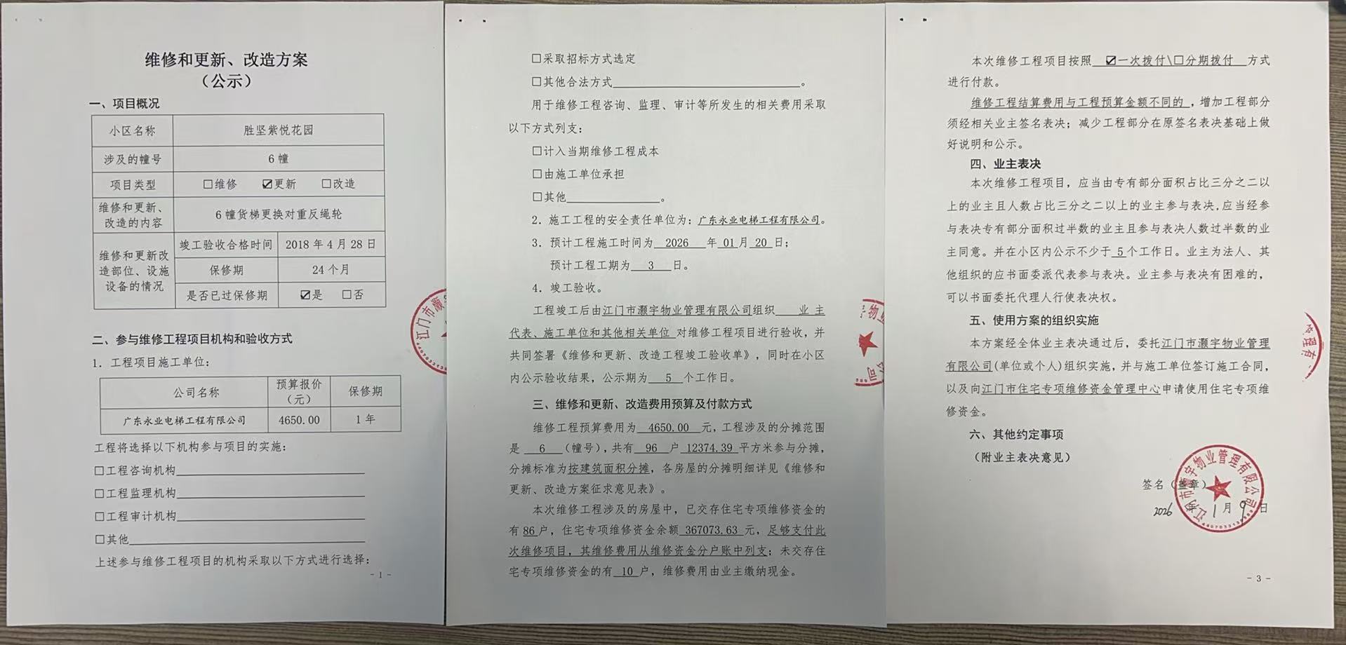 <td VALIGN="top" VALUES="" STYLE="border-width:0" BINDTYPE="0" ROWSPAN="19" COLSPAN="7" DATASOURCE="投票结果" ><font style="font-size:14pt;"><p style="white-space: normal; font-family: 宋体; line-height: 1.75em;">蓬江区胜坚紫悦花园蓬江区胜坚紫悦花园6幢全体业主:</p><p style="white-space: normal; font-family: 宋体; line-height: 1.75em; text-indent: 2em;">本小区关于蓬江区胜坚紫悦花园6栋货梯更换对重反绳轮使用维修资金的投票的投票已表决结束,询异时间从2026年02月05日开始,投票询异公示期间,业主可通过微信查询自己的表决情况或可凭身份证件申请查询自己的表决情况;如公示的业主表决情况与查询的本人表决意见不一致的,可以以书面形式向投票组织机构申诉,投票组织机构予以纠正并重新公示表决结果。异议提出人对投票组织机构的处理仍有异议的,可以向街道办事处(镇人民政府)反映处理,涉及住宅专项维修资金的,可向属地住宅专项维修资金管理中心反映处理。</p><p style="white-space: normal;"><br/></p><p style="white-space: normal; font-family: 宋体; line-height: 1.75em;"><strong>附件:</strong></p><p style="white-space: normal; font-family: 宋体; line-height: 1.75em;"><strong>一、投票范围</strong></p><p style="white-space: normal; font-family: 宋体; line-height: 1.75em; text-indent: 2em;">蓬江区胜坚紫悦花园蓬江区胜坚紫悦花园6幢</p><p style="white-space: normal; font-family: 宋体; line-height: 1.75em; text-indent: 2em;">总人数(专有部分人数之和):88</p><p style="white-space: normal; font-family: 宋体; line-height: 1.75em; text-indent: 2em;"><span style="font-family: 宋体, SimSun;"><span style="font-family: 宋体; text-indent: 32px;"><span style="font-family: 宋体; text-indent: 32px;">总户数:96</span></span></span></p><p style="white-space: normal; font-family: 宋体; line-height: 1.75em; text-indent: 2em;">建筑物总面积(专有部分面积之和):12374.39㎡</p><p style="white-space: normal; font-family: 宋体; line-height: 1.75em;"><strong>二、询异公示起止时间</strong></p><p dir="ltr" style="white-space: normal; font-family: 宋体; line-height: 1.75em; text-indent: 2em;"><span style="text-indent: 36px;">2026年02月05日至2026年02月12日</span></p><p style="white-space: normal; font-family: 宋体; line-height: 1.75em;"><strong>三、投票详细描述</strong></p><p style="white-space: normal; font-family: 宋体; line-height: 1.75em; text-indent: 2em;"><p> <span style="font-family: 宋体, SimSun; font-size: 14px;">本小区6栋货梯对重反绳轮磨损严重导致运行产生异响,需要尽快更换对重反绳轮,存在安全隐患,不能正常运行。</span></p><p><span style="font-family: 宋体, SimSun; font-size: 14px;"> 现对6栋货梯进行维修,工程维修预算金额为4650元,项目最终费用以施工合同签订金额为准。因已过保修期,维修费用由相关业主按建筑面积分摊,每平方约0.38元,详见公示附件。如业主手机不能正常通过微信投票,请联系物业公司进行线下纸质投票,物业电话:0750-3339221。</span></p></p><p style="white-space: normal; font-family: 宋体; line-height: 1.75em;"><strong>四、计票规则</strong></p><p style="white-space: normal; font-family: 宋体; line-height: 1.75em; text-indent: 2em;">表决事项:使用建筑物及其附属设施的维修资金<br /><p style='text-align: left; font-family: 宋体; font-size: 16px; line-height: 1.75em; text-indent: 2em;'>计票规则:弃权票不并入其它项 未表决票不并入其它项</p></p><p style="white-space: normal; font-family: 宋体; line-height: 1.75em;"><strong>五、通过规则</strong></p><p style="white-space: normal; font-family: 宋体; line-height: 1.75em;"><strong><strong style="white-space: normal;"><span style="font-family: 宋体, SimSun;"> 根据《中华人民共和国民法典》第二百七十八条规定:业主共同决定事项,应当由专有部分面积占比三分之二以上的业主且人数占比三分之二以上的业主参与表决。</span></strong></strong></p><p style="white-space: normal; font-family: 宋体; line-height: 1.75em; text-indent: 2em;">表决事项:使用建筑物及其附属设施的维修资金<br /><p style='text-align: left; font-family: 宋体; font-size: 16px; line-height: 1.75em; text-indent: 2em;'>通过规则:双2/3以上参与表决,参与表决双过半同意</p></p><p style="white-space: normal; font-family: 宋体; line-height: 1.75em;"><strong>六、投票结果</strong></p><p style="white-space: normal; font-family: 宋体; line-height: 1.75em; text-indent: 2em;"><div id='resultTable'><table style='table-layout: fixed; font-size:12px; margin-top:10px' width='100%' border='0' cellspacing='0' cellpadding='0'><tr><td height='28' colspan='10' align='center' style='border: 1px solid #666'><strong style='font-size: 14px;'> 使用建筑物及其附属设施的维修资金</strong></td> </tr><tr id='trfirst'><td height='28' colspan='4' style='border-left: 1px solid #666; border-bottom: 1px solid #666'><strong> 申报单位:</strong> 江门市灏宇物业管理有限公司</td><td colspan='3' style='border-left: 1px solid #666; border-bottom: 1px solid #666'><strong> 联系方式:</strong> </td><td colspan='3' style='border-left: 1px solid #666; border-bottom: 1px solid #666; border-right: 1px solid #666'><strong> 申报日期:</strong> 2026年1月12日 </td></tr><tr> <td height='28' colspan='5' style='border-left: 1px solid #666; border-bottom: 1px solid #666'><strong> 总人数(专有部分人数之和):</strong>88人 </td><td colspan='5' style='border-left: 1px solid #666; border-bottom: 1px solid #666; border-right: 1px solid #666'><strong> 建筑物总面积(专有部分面积之和):</strong>12374.39㎡ </td> </tr><tr><td height='28' colspan='10' bgcolor='#F3F3F3' style='border-left: 1px solid #666;border-bo