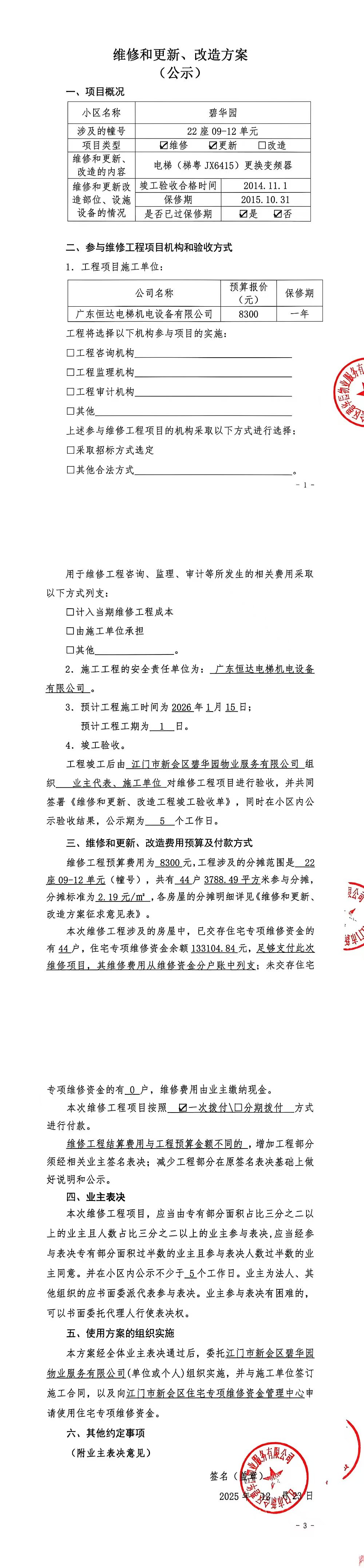 <td VALIGN="top" VALUES="" STYLE="border-width:0" BINDTYPE="0" ROWSPAN="19" COLSPAN="7" DATASOURCE="投票结果" ><font style="font-size:14pt;"><p style="white-space: normal; font-family: 宋体; line-height: 1.75em;">碧华园碧华园22座全体业主:</p><p style="white-space: normal; font-family: 宋体; line-height: 1.75em; text-indent: 2em;">本小区关于碧华园22座09-12单元电梯(梯粤JX6415)更换变频器使用维修资金的投票的投票已表决结束,询异时间从2026年01月09日开始,投票询异公示期间,业主可通过微信查询自己的表决情况或可凭身份证件申请查询自己的表决情况;如公示的业主表决情况与查询的本人表决意见不一致的,可以以书面形式向投票组织机构申诉,投票组织机构予以纠正并重新公示表决结果。异议提出人对投票组织机构的处理仍有异议的,可以向街道办事处(镇人民政府)反映处理,涉及住宅专项维修资金的,可向属地住宅专项维修资金管理中心反映处理。</p><p style="white-space: normal;"><br/></p><p style="white-space: normal; font-family: 宋体; line-height: 1.75em;"><strong>附件:</strong></p><p style="white-space: normal; font-family: 宋体; line-height: 1.75em;"><strong>一、投票范围</strong></p><p style="white-space: normal; font-family: 宋体; line-height: 1.75em; text-indent: 2em;">碧华园碧华园22座</p><p style="white-space: normal; font-family: 宋体; line-height: 1.75em; text-indent: 2em;">总人数(专有部分人数之和):44</p><p style="white-space: normal; font-family: 宋体; line-height: 1.75em; text-indent: 2em;"><span style="font-family: 宋体, SimSun;"><span style="font-family: 宋体; text-indent: 32px;"><span style="font-family: 宋体; text-indent: 32px;">总户数:44</span></span></span></p><p style="white-space: normal; font-family: 宋体; line-height: 1.75em; text-indent: 2em;">建筑物总面积(专有部分面积之和):3788.49㎡</p><p style="white-space: normal; font-family: 宋体; line-height: 1.75em;"><strong>二、询异公示起止时间</strong></p><p dir="ltr" style="white-space: normal; font-family: 宋体; line-height: 1.75em; text-indent: 2em;"><span style="text-indent: 36px;">2026年01月09日至2026年01月19日</span></p><p style="white-space: normal; font-family: 宋体; line-height: 1.75em;"><strong>三、投票详细描述</strong></p><p style="white-space: normal; font-family: 宋体; line-height: 1.75em; text-indent: 2em;"><p style="font-family: "Helvetica Neue", Helvetica, Arial, sans-serif; font-size: 14px; text-wrap-mode: wrap; background-color: rgb(255, 255, 255);"><span style="font-family: 宋体; letter-spacing: 0px; background-image: initial; background-position: initial; background-size: initial; background-repeat: initial; background-attachment: initial; background-origin: initial; background-clip: initial;">碧华园22座09-12单元电梯(梯粤JX6415),经检查,<span style="font-family: 宋体; font-size: 14px; text-wrap-mode: wrap; background-color: rgb(255, 255, 255);">变频器</span>由于使用时间较长,老化严重,内部电子元件老化导致故障频发,频繁出现速度波动,存在一定安全隐患。</span></p><p style="font-family: "Helvetica Neue", Helvetica, Arial, sans-serif; font-size: 14px; text-wrap-mode: wrap; background-color: rgb(255, 255, 255);"><span style="font-family: 宋体; letter-spacing: 0px; background-image: initial; background-position: initial; background-size: initial; background-repeat: initial; background-attachment: initial; background-origin: initial; background-clip: initial;"> 现对碧华园22座09-12单元电梯(梯粤JX6415)进行维修,工程维修预算金额为8300元,项目最终费用以施工合同签订金额为准。因已过保修期,维修费用由相关业主按建筑面积分摊,每平方约2.19元,详见公示附件。如业主手机不能正常通过微信投票,请联系物业公司进行线下纸质投票,物业电话:0750-6329973。</span></p><p><br style="font-family: "Helvetica Neue", Helvetica, Arial, sans-serif; font-size: 14px; text-wrap-mode: wrap; background-color: rgb(255, 255, 255);"/></p><p><br/></p></p><p style="white-space: normal; font-family: 宋体; line-height: 1.75em;"><strong>四、计票规则</strong></p><p style="white-space: normal; font-family: 宋体; line-height: 1.75em; text-indent: 2em;">表决事项:使用建筑物及其附属设施的维修资金<br /><p style='text-align: left; font-family: 宋体; font-size: 16px; line-height: 1.75em; text-indent: 2em;'>计票规则:弃权票不并入其它项 未表决票不并入其它项</p></p><p style="white-space: normal; font-family: 宋体; line-height: 1.75em;"><strong>五、通过规则</strong></p><p style="white-space: normal; font-family: 宋体; line-height: 1.75em;"><strong><strong style="white-space: normal;"><span style="font-family: 宋体, SimSun;"> 根据《中华人民共和国民法典》第二百七十八条规定:业主共同决定事项,应当由专有部分面积占比三分之二以上的业主且人数占比三分之二以上的业主参与表决。</span></strong></strong></p><p style="white-space: normal; font-family: 宋体; line-height: 1.75em; text-indent: 2em;">表决事项:使用建筑物及其附属设施的维修资金<br /><p style='text-align: left; font-family: 宋体; font-size: 16px; line-height: 1.75em; text-indent: 2em;'>通过规则:双2/3以上参与表决,参与表决双过半同意</p></p><p style="white-space: normal; font-family: 宋体; line-height: 1.75em;"><strong>六、投票结果</strong></p><p style="white-space: normal; font-family: 宋体; line-height: 1.75em; text-indent: 2em;"><div id='resultTable'><table style='table-layout: fixed; font-size:12px; margin-top:10px' width='100%' border='0' cellspacing='0' cellpadding='0'><tr><td height='28' colspan='10' align='center' style='border: 1px solid #666'><strong style='font-size: 14px;'> 使用建筑物及其