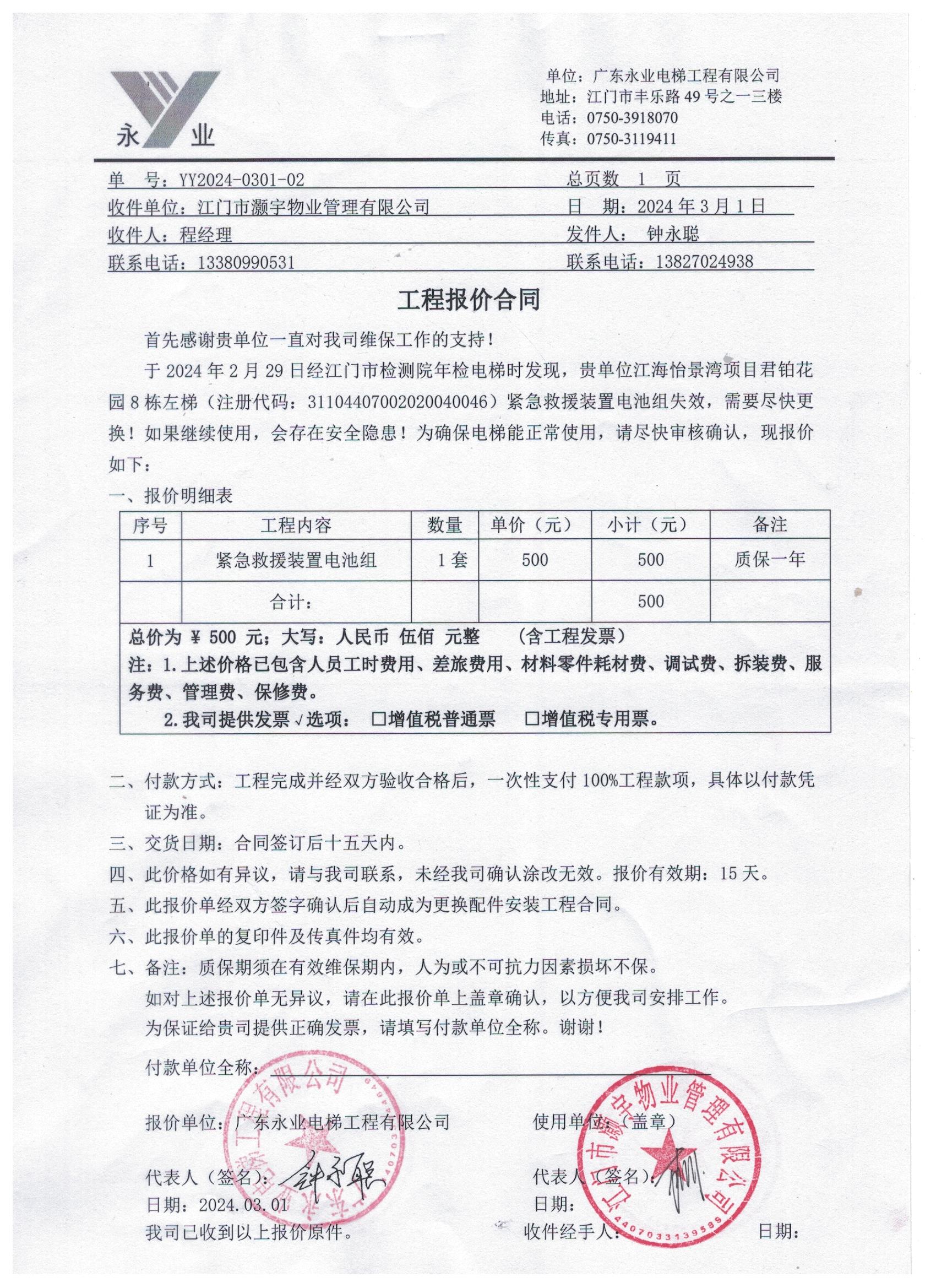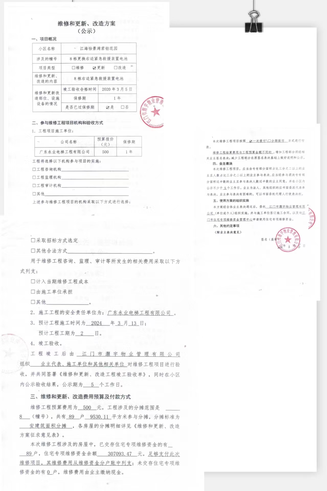 <td VALIGN="top" VALUES="" STYLE="border-width:0" BINDTYPE="0" ROWSPAN="19" COLSPAN="7" DATASOURCE="投票结果" ><font style="font-size:14pt;"><p style="white-space: normal; font-family: 宋体; line-height: 1.75em;">江门市江海区怡景湾君铂花园江门市江海区怡景湾君铂花园8栋全体业主:</p><p style="white-space: normal; font-family: 宋体; line-height: 1.75em; text-indent: 2em;">本小区关于江海怡景湾君铂花园8栋货梯更换紧急救援装置电池的投票已表决结束,询异时间从2024年03月14日开始,投票询异公示期间,业主可通过微信查询自己的表决情况或可凭身份证件申请查询自己的表决情况;如公示的业主表决情况与查询的本人表决意见不一致的,可以以书面形式向投票组织机构申诉,投票组织机构予以纠正并重新公示表决结果。异议提出人对投票组织机构的处理仍有异议的,可以向街道办事处(镇人民政府)反映处理,涉及住宅专项维修资金的,可向属地住宅专项维修资金管理中心反映处理。</p><p style="white-space: normal;"><br/></p><p style="white-space: normal; font-family: 宋体; line-height: 1.75em;"><strong>附件:</strong></p><p style="white-space: normal; font-family: 宋体; line-height: 1.75em;"><strong>一、投票范围</strong></p><p style="white-space: normal; font-family: 宋体; line-height: 1.75em; text-indent: 2em;">江门市江海区怡景湾君铂花园江门市江海区怡景湾君铂花园8栋</p><p style="white-space: normal; font-family: 宋体; line-height: 1.75em; text-indent: 2em;">总人数(专有部分人数之和):88</p><p style="white-space: normal; font-family: 宋体; line-height: 1.75em; text-indent: 2em;"><span style="font-family: 宋体, SimSun;"><span style="font-family: 宋体; text-indent: 32px;"><span style="font-family: 宋体; text-indent: 32px;">总户数:89</span></span></span></p><p style="white-space: normal; font-family: 宋体; line-height: 1.75em; text-indent: 2em;">建筑物总面积(专有部分面积之和):9530.11㎡</p><p style="white-space: normal; font-family: 宋体; line-height: 1.75em;"><strong>二、询异公示起止时间</strong></p><p dir="ltr" style="white-space: normal; font-family: 宋体; line-height: 1.75em; text-indent: 2em;"><span style="text-indent: 36px;">2024年03月14日至2024年03月20日</span></p><p style="white-space: normal; font-family: 宋体; line-height: 1.75em;"><strong>三、投票详细描述</strong></p><p style="white-space: normal; font-family: 宋体; line-height: 1.75em; text-indent: 2em;"><p>小区8栋的货梯经江门市检测院年申时发现,紧急救援装置电池失效,需要跟换。</p><p> 现对8栋货梯进行维修,工程维修预算金额为500元,因已过保修期,维修费用由相关业主按建筑面积分摊,每平方约0.052元,详见公示附件。如业主手机不能正常通过微信投票,请联系物业公司进行线下纸质投票,物业电话:0750-3898816。</p><p><br/></p></p><p style="white-space: normal; font-family: 宋体; line-height: 1.75em;"><strong>四、计票规则</strong></p><p style="white-space: normal; font-family: 宋体; line-height: 1.75em; text-indent: 2em;">表决事项:使用建筑物及其附属设施的维修资金<br /><p style='text-align: left; font-family: 宋体; font-size: 16px; line-height: 1.75em; text-indent: 2em;'>计票规则:弃权票不并入其它项 未表决票不并入其它项</p></p><p style="white-space: normal; font-family: 宋体; line-height: 1.75em;"><strong>五、通过规则</strong></p><p style="white-space: normal; font-family: 宋体; line-height: 1.75em;"><strong><strong style="white-space: normal;"><span style="font-family: 宋体, SimSun;"> 根据《中华人民共和国民法典》第二百七十八条规定:业主共同决定事项,应当由专有部分面积占比三分之二以上的业主且人数占比三分之二以上的业主参与表决。</span></strong></strong></p><p style="white-space: normal; font-family: 宋体; line-height: 1.75em; text-indent: 2em;">表决事项:使用建筑物及其附属设施的维修资金<br /><p style='text-align: left; font-family: 宋体; font-size: 16px; line-height: 1.75em; text-indent: 2em;'>通过规则:双2/3以上参与表决,参与表决双过半同意</p></p><p style="white-space: normal; font-family: 宋体; line-height: 1.75em;"><strong>六、投票结果</strong></p><p style="white-space: normal; font-family: 宋体; line-height: 1.75em; text-indent: 2em;"><div id='resultTable'><table style='table-layout: fixed; font-size:12px; margin-top:10px' width='100%' border='0' cellspacing='0' cellpadding='0'><tr><td height='28' colspan='10' align='center' style='border: 1px solid #666'><strong style='font-size: 14px;'> 使用建筑物及其附属设施的维修资金</strong></td> </tr><tr id='trfirst'><td height='28' colspan='4' style='border-left: 1px solid #666; border-bottom: 1px solid #666'><strong> 申报单位:</strong> 江门市灏宇物业管理有限公司</td><td colspan='3' style='border-left: 1px solid #666; border-bottom: 1px solid #666'><strong> 联系方式:</strong> </td><td colspan='3' style='border-left: 1px solid #666; border-bottom: 1px solid #666; border-right: 1px solid #666'><strong> 申报日期:</strong> 2024年3月6日 </td></tr><tr> <td height='28' colspan='5' style='border-left: 1px solid #666; border-bottom: 1px solid #666'><strong> 总人数(专有部分人数之和):</strong>88人 </td><td colspan='5' style='border-left: 1px solid #666; border-bottom: 1px solid #666; border-right: 1px solid #666'><strong> 建筑物总面积(专有部分面积之和):</strong>9530.11㎡ </td> </tr><tr><td height='28' colspan='10' bgcolor='#F3F3F3' style='border-left: 1px solid #666;border-bottom: 1px solid #666;border-right: 1px solid #666'><strong> 参与人数及面积统计</strong></td></tr><tr><td height='28' colspan='5' style='border-left: 1px solid #666; border-bottom: 1px 