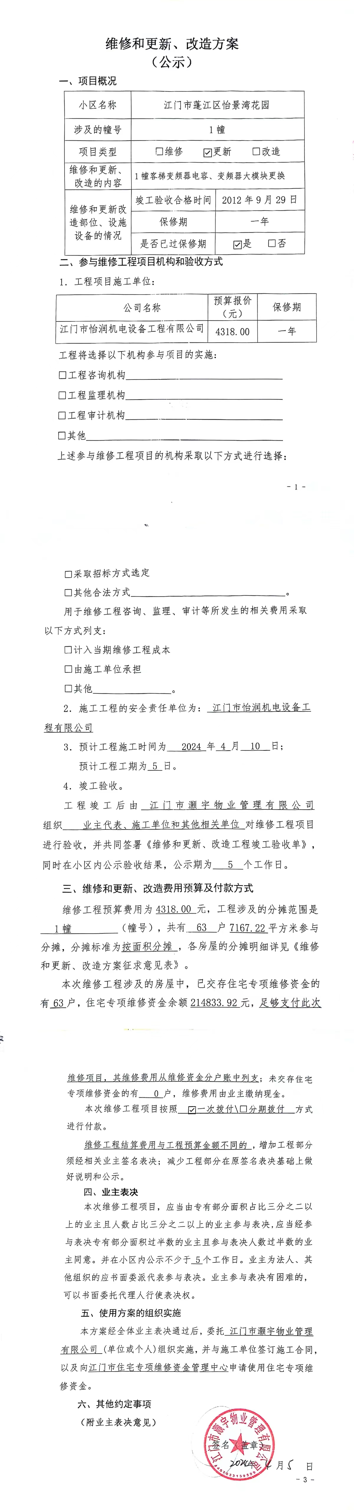 <td VALIGN="top" VALUES="" STYLE="border-width:0" BINDTYPE="0" ROWSPAN="17" COLSPAN="7" DATASOURCE="投票结果" ><font style=" font-family:方正小标宋简体;font-size:14pt;"><p style="line-height: 1.75em;"><span style="font-family: 宋体, SimSun;">各位尊敬的业主:</span><br/></p><p style="text-indent: 2em; line-height: 1.75em;"><span style="font-family: 宋体, SimSun;">根据法律法规的规定,本小区业主利用“江门市物业事项表决管理系统”已对本小区公共事务决策事项进行了表决,在经过7日的询异公示期后,未收到业主有效的异议。现将投票结果公告,并就产生的法律效力说明如下:</span></p><p style="line-height: 1.75em; text-indent: 0em;"><strong style="text-indent: 2em;"><span style="font-family: 宋体, SimSun;">一、投票范围</span></strong></p><p style="text-indent: 2em; line-height: 1.75em;"><span style="font-family: 宋体, SimSun;">蓬江区怡景湾蓬江区怡景湾花园1幢</span></p><p style="text-indent: 2em; line-height: 1.75em;"><span style="font-family: 宋体, SimSun;">总人数(专有部分人数之和):61</span></p><p style="text-indent: 2em; line-height: 1.75em;"><span style="font-family: 宋体, SimSun;"><span style="font-family: 宋体, SimSun; text-indent: 32px;"><span style="font-family: 宋体; text-indent: 32px;"><span style="font-family: 宋体; text-indent: 32px;">总户数:63</span></span></span></span></p><p style="text-indent: 2em; line-height: 1.75em;"><span style="font-family: 宋体, SimSun;">建筑物总面积(专有部分面积之和):7167.22㎡</span></p><p style="line-height: 1.75em;"><strong><span style="font-family: 宋体, SimSun;">二、投票结果公告时间</span></strong></p><p style="text-indent: 2em; line-height: 1.75em;"><span style="font-family: 宋体, SimSun;">从2024年05月08日开始</span></p><p style="line-height: 1.75em;"><strong><span style="font-family: 宋体, SimSun;">三、计票规则</span></strong></p><p style="text-indent: 2em; line-height: 1.75em;"><span style="font-family: 宋体, SimSun;">表决事项:蓬江区怡景湾1幢客梯变频器电容、变频器大模块使用维修资金的投票<br /><p style='font-family: 宋体, SimSun;line-height: 1.75em; text-indent: 2em;'>计票规则:弃权票不并入其它项&nbsp;&nbsp;&nbsp;&nbsp;未表决票不并入其它项</p></span></p><p style="line-height: 1.75em;"><strong><span style="font-family: 宋体, SimSun;">四、通过规则</span></strong></p><p style="line-height: 1.75em;"><strong><span style="font-family: 宋体, SimSun;">&nbsp; 根据《中华人民共和国民法典》第二百七十八条规定:业主共同决定事项,应当由专有部分面积占比三分之二以上的业主且人数占比三分之二以上的业主参与表决。</span></strong></p><p style="text-indent: 2em; line-height: 1.75em;"><span style="font-family: 宋体, SimSun;"><span style="font-family: 宋体, SimSun; text-indent: 32px;">表决事项:蓬江区怡景湾1幢客梯变频器电容、变频器大模块使用维修资金的投票<br /><p style='font-family: 宋体, SimSun;line-height: 1.75em; text-indent: 2em;'>通过规则:双2/3以上参与表决,参与表决双过半同意</p></span></span></p><p style="line-height: 1.75em;"><strong><span style="font-family: 宋体, SimSun;">五、投票结果</span></strong></p><p style="line-height: 1.75em; text-indent: 2em;"><span style="font-family: 宋体, SimSun; text-indent: 2em;"><div id='resultTable'><table style='table-layout: fixed; font-size:12px; margin-top:10px' width='100%' border='0' cellspacing='0' cellpadding='0'><tr><td height='28' colspan='10' align='center' style='border: 1px solid #666'><strong style='font-size: 14px;'> 蓬江区怡景湾1幢客梯变频器电容、变频器大模块使用维修资金的投票</strong></td> </tr><tr id='trfirst'><td height='28' colspan='4' style='border-left: 1px solid #666; border-bottom: 1px solid #666'><strong>&nbsp;申报单位:</strong> 江门市灏宇物业管理有限公司</td><td colspan='3' style='border-left: 1px solid #666; border-bottom: 1px solid #666'><strong>&nbsp;联系方式:</strong> </td><td colspan='3' style='border-left: 1px solid #666; border-bottom: 1px solid #666; border-right: 1px solid #666'><strong>&nbsp;申报日期:</strong> 2024年4月9日 </td></tr><tr> <td height='28' colspan='5' style='border-left: 1px solid #666; border-bottom: 1px solid #666'><strong>&nbsp;列支总人数(专有部分人数之和):</strong>61人 </td><td colspan='5' style='border-left: 1px solid #666; border-bottom: 1px solid #666; border-right: 1px solid #666'><strong>&nbsp;列支建筑物总面积(专有部分面积之和):</strong>7167.22㎡ </td> </tr><tr><td height='28' colspan='10' bgcolor='#F3F3F3' style='border-left: 1px solid #666;border-bottom: 1px solid #666;border-right: 1px solid #666'><strong>&nbsp;参与表决人数及面积统计</strong></td></tr><tr><td height='28' colspan='5' style='border-left: 1px solid #666; border-bottom: 1px solid #666'><strong>&nbsp;参与表决人数:</strong>46人</td><td colspan='5' style='border-left: 1px solid #666; border-bottom: 1px solid #666; border-right: 1px solid #666'><strong>&nbsp;参与表决人数占总人数比例:</strong>75.41%</td></tr><tr><td height='28' colspan='5' style='border-left: 1px solid #666; border-bottom: 1px solid #666'><strong>&nbsp;参与表决面积:</strong>5002.69㎡</td><td colspan='5' style='border-left: 1px solid #666; border-bottom: 1px solid #666; border-right: 1px solid #666'><strong>&nbsp;参与表决面积占总面积比例:</strong>69.80%</td></tr><tr><td height='28' colspan='10' bgcolor='#F3F3F3' style='border-left: 1px solid #666; border-bottom: 1px solid #666;border-right: 1px solid #666'> <strong>&nbsp;参与表决同意人数及面积统计</strong></td> </tr><tr><td height='28' colspan='5' style='border-left: 1px solid #666; border-bottom: 1px solid #666'><strong>&nbsp;参与表决同意人数:</strong>45人