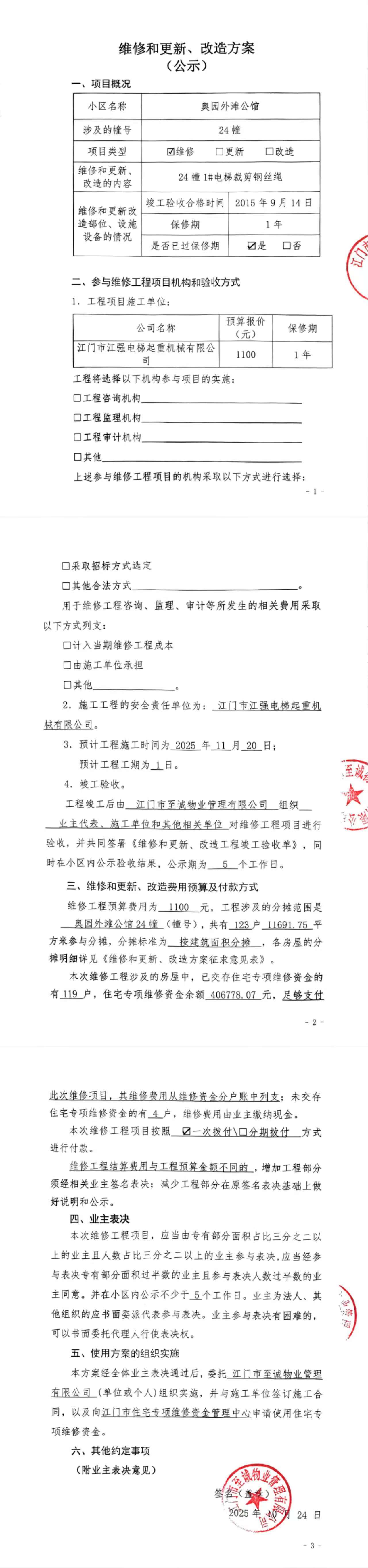 <td VALIGN="top" VALUES="" STYLE="border-width:0" BINDTYPE="0" ROWSPAN="17" COLSPAN="7" DATASOURCE="投票结果" ><font style=" font-family:方正小标宋简体;font-size:14pt;"><p style="line-height: 1.75em;"><span style="font-family: 宋体, SimSun;">各位尊敬的业主:</span><br/></p><p style="text-indent: 2em; line-height: 1.75em;"><span style="font-family: 宋体, SimSun;">根据法律法规的规定,本小区业主利用“江门市物业事项表决管理系统”已对本小区公共事务决策事项(<span style="font-family: 宋体; text-indent: 32px;">奥园外滩公馆24幢1#电梯裁剪钢丝绳使用维修资金的投票</span>)进行了表决,在经过7日的询异公示期后,未收到业主有效的异议。现将投票结果公告,并就产生的法律效力说明如下:</span></p><p style="line-height: 1.75em; text-indent: 0em;"><strong style="text-indent: 2em;"><span style="font-family: 宋体, SimSun;">一、投票范围</span></strong></p><p style="text-indent: 2em; line-height: 1.75em;"><span style="font-family: 宋体, SimSun;">奥园外滩公馆蓬江区棠下镇奥园外滩公馆24幢</span></p><p style="text-indent: 2em; line-height: 1.75em;"><span style="font-family: 宋体, SimSun;">总人数(专有部分人数之和):122</span></p><p style="text-indent: 2em; line-height: 1.75em;"><span style="font-family: 宋体, SimSun;"><span style="font-family: 宋体, SimSun; text-indent: 32px;"><span style="font-family: 宋体; text-indent: 32px;"><span style="font-family: 宋体; text-indent: 32px;">总户数:123</span></span></span></span></p><p style="text-indent: 2em; line-height: 1.75em;"><span style="font-family: 宋体, SimSun;">建筑物总面积(专有部分面积之和):11691.75㎡</span></p><p style="line-height: 1.75em;"><strong><span style="font-family: 宋体, SimSun;">二、投票结果公告时间</span></strong></p><p style="text-indent: 2em; line-height: 1.75em;"><span style="font-family: 宋体, SimSun;"><span style="font-family: 宋体, SimSun; text-indent: 32px;">从2025年12月14日开始</span></span></p><p style="line-height: 1.75em;"><strong><span style="font-family: 宋体, SimSun;">三、计票规则</span></strong></p><p style="text-indent: 2em; line-height: 1.75em;"><span style="font-family: 宋体, SimSun;">表决事项:使用建筑物及其附属设施的维修资金<br /><p style='font-family: 宋体, SimSun;line-height: 1.75em; text-indent: 2em;'>计票规则:弃权票不并入其它项&nbsp;&nbsp;&nbsp;&nbsp;未表决票不并入其它项</p></span></p><p style="line-height: 1.75em;"><strong><span style="font-family: 宋体, SimSun;">四、通过规则</span></strong></p><p style="line-height: 1.75em;"><strong><span style="font-family: 宋体, SimSun;">&nbsp; 根据《中华人民共和国民法典》第二百七十八条规定:业主共同决定事项,应当由专有部分面积占比三分之二以上的业主且人数占比三分之二以上的业主参与表决。</span></strong></p><p style="text-indent: 2em; line-height: 1.75em;"><span style="font-family: 宋体, SimSun;"><span style="font-family: 宋体, SimSun; text-indent: 32px;">表决事项:使用建筑物及其附属设施的维修资金<br /><p style='font-family: 宋体, SimSun;line-height: 1.75em; text-indent: 2em;'>通过规则:双2/3以上参与表决,参与表决双过半同意</p></span></span></p><p style="line-height: 1.75em;"><strong><span style="font-family: 宋体, SimSun;">五、投票结果</span></strong></p><p style="line-height: 1.75em; text-indent: 2em;"><span style="font-family: 宋体, SimSun; text-indent: 2em;"><div id='resultTable'><table style='table-layout: fixed; font-size:12px; margin-top:10px' width='100%' border='0' cellspacing='0' cellpadding='0'><tr><td height='28' colspan='10' align='center' style='border: 1px solid #666'><strong style='font-size: 14px;'> 使用建筑物及其附属设施的维修资金</strong></td> </tr><tr id='trfirst'><td height='28' colspan='4' style='border-left: 1px solid #666; border-bottom: 1px solid #666'><strong>&nbsp;申报单位:</strong> 江门市至诚物业管理有限公司</td><td colspan='3' style='border-left: 1px solid #666; border-bottom: 1px solid #666'><strong>&nbsp;联系方式:</strong> 3851968 </td><td colspan='3' style='border-left: 1px solid #666; border-bottom: 1px solid #666; border-right: 1px solid #666'><strong>&nbsp;申报日期:</strong> 2025年10月24日 </td></tr><tr> <td height='28' colspan='5' style='border-left: 1px solid #666; border-bottom: 1px solid #666'><strong>&nbsp;列支总人数(专有部分人数之和):</strong>122人 </td><td colspan='5' style='border-left: 1px solid #666; border-bottom: 1px solid #666; border-right: 1px solid #666'><strong>&nbsp;列支建筑物总面积(专有部分面积之和):</strong>11691.75㎡ </td> </tr><tr><td height='28' colspan='10' bgcolor='#F3F3F3' style='border-left: 1px solid #666;border-bottom: 1px solid #666;border-right: 1px solid #666'><strong>&nbsp;参与表决人数及面积统计</strong></td></tr><tr><td height='28' colspan='5' style='border-left: 1px solid #666; border-bottom: 1px solid #666'><strong>&nbsp;参与表决人数:</strong>89人</td><td colspan='5' style='border-left: 1px solid #666; border-bottom: 1px solid #666; border-right: 1px solid #666'><strong>&nbsp;参与表决人数占总人数比例:</strong>72.95%</td></tr><tr><td height='28' colspan='5' style='border-left: 1px solid #666; border-bottom: 1px solid #666'><strong>&nbsp;参与表决面积:</strong>8534.13㎡</td><td colspan='5' style='border-left: 1px solid #666; border-bottom: 1px solid #666; border-right: 1px solid #666'><strong>&nbsp;参与表决面积占总面积比例:</strong>72.99%</td></tr><tr><td height='28' colspan='10' bgcolor='#F3F3F3' style='border-left: 1px solid #666; border-bottom: 1px solid #666;border-right: 1px solid #666'> <strong>&nbsp;参与表决同意人数及面积统计</strong></td> </tr><tr><td height='28' colspan='5' style='border-le