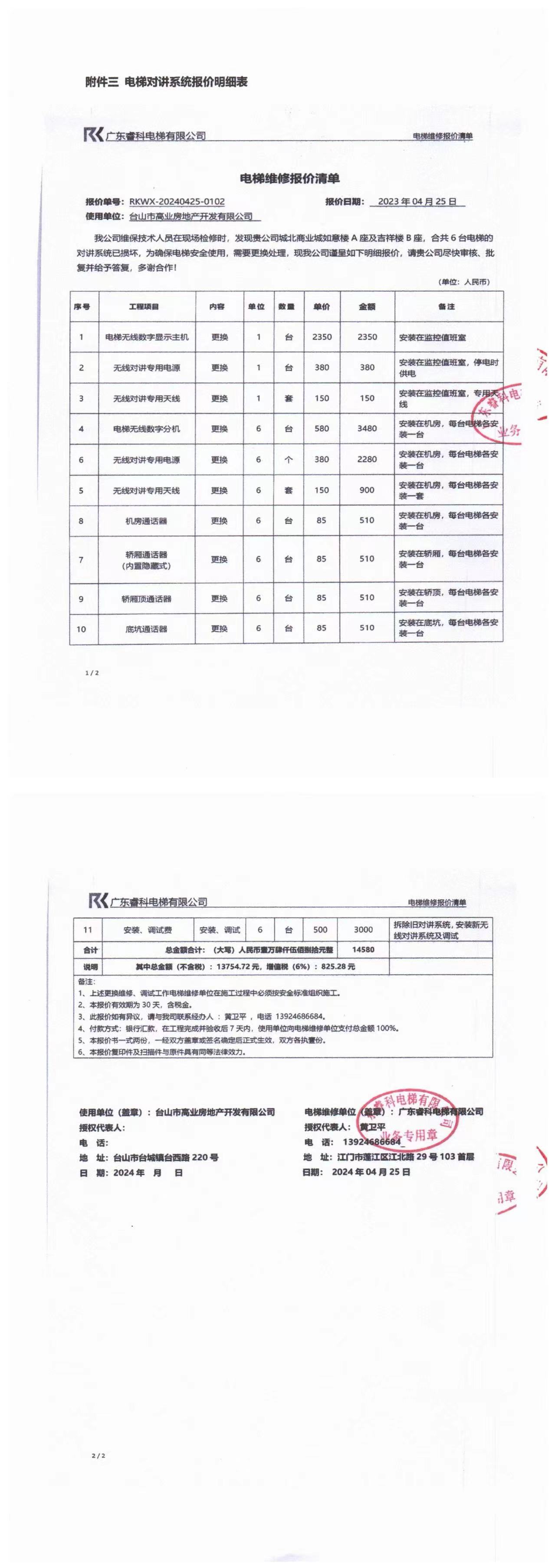 <td VALIGN="top" VALUES="" STYLE="border-width:0" BINDTYPE="0" ROWSPAN="19" COLSPAN="7" DATASOURCE="投票结果" ><font style="font-size:14pt;"><p style="white-space: normal; font-family: 宋体; line-height: 1.75em;">台山市城北商业城桥湖路228号如意楼全体业主:</p><p style="white-space: normal; font-family: 宋体; line-height: 1.75em; text-indent: 2em;">本小区关于城北商业城如意楼维修1梯2梯3梯电梯及监控室对讲机系统的维修资金使用投票的投票已表决结束,询异时间从2024年08月31日开始,投票询异公示期间,业主可通过微信查询自己的表决情况或可凭身份证件申请查询自己的表决情况;如公示的业主表决情况与查询的本人表决意见不一致的,可以以书面形式向投票组织机构申诉,投票组织机构予以纠正并重新公示表决结果。异议提出人对投票组织机构的处理仍有异议的,可以向街道办事处(镇人民政府)反映处理,涉及住宅专项维修资金的,可向属地住宅专项维修资金管理中心反映处理。</p><p style="white-space: normal;"><br/></p><p style="white-space: normal; font-family: 宋体; line-height: 1.75em;"><strong>附件:</strong></p><p style="white-space: normal; font-family: 宋体; line-height: 1.75em;"><strong>一、投票范围</strong></p><p style="white-space: normal; font-family: 宋体; line-height: 1.75em; text-indent: 2em;">台山市城北商业城桥湖路228号如意楼</p><p style="white-space: normal; font-family: 宋体; line-height: 1.75em; text-indent: 2em;">总人数(专有部分人数之和):156</p><p style="white-space: normal; font-family: 宋体; line-height: 1.75em; text-indent: 2em;"><span style="font-family: 宋体, SimSun;"><span style="font-family: 宋体; text-indent: 32px;"><span style="font-family: 宋体; text-indent: 32px;">总户数:156</span></span></span></p><p style="white-space: normal; font-family: 宋体; line-height: 1.75em; text-indent: 2em;">建筑物总面积(专有部分面积之和):15874.90㎡</p><p style="white-space: normal; font-family: 宋体; line-height: 1.75em;"><strong>二、询异公示起止时间</strong></p><p dir="ltr" style="white-space: normal; font-family: 宋体; line-height: 1.75em; text-indent: 2em;"><span style="text-indent: 36px;">2024年08月31日至2024年09月06日</span></p><p style="white-space: normal; font-family: 宋体; line-height: 1.75em;"><strong>三、投票详细描述</strong></p><p style="white-space: normal; font-family: 宋体; line-height: 1.75em; text-indent: 2em;"><p><span style="font-size: 14px;">小区如意楼的1梯、2梯和3梯电梯有线对讲系统,通话质量差,存在断线无声或声音模糊不清的情况。系统响应时间长,影响紧急情况下的快速响应。经检查,是由于设备老化需要更换以保证系统稳定运行。现场维保师傅使用全新的对讲设备进行了测试,测试结果显示,即便更换了设备,通话质量仍未得到明显改善。分析杂音问题源于线路经年使用后老化出现的线路故障。现对如意楼1梯、2梯和3梯进行维修,工程维修预算金额为7494.12元,项目最终费用以施工合同签订金额为准。因已过保修期,维修费用由相关业主按建筑面积分摊,详见公示附件。如业主手机不能正常通过微信投票,请联系物业公司进行线下纸质投票,物业电话:0750-5598999。(此次维修金额吉祥楼,如意楼共6台电梯合计:14580元,由于吉祥楼共148户,如意楼共156户,所以此次维修金额吉祥楼占48.6%,即7085.88元,如意楼占51.4%,即7494.12元)</span></p></p><p style="white-space: normal; font-family: 宋体; line-height: 1.75em;"><strong>四、计票规则</strong></p><p style="white-space: normal; font-family: 宋体; line-height: 1.75em; text-indent: 2em;">表决事项:使用建筑物及其附属设施的维修资金<br /><p style='text-align: left; font-family: 宋体; font-size: 16px; line-height: 1.75em; text-indent: 2em;'>计票规则:弃权票不并入其它项 未表决票不并入其它项</p></p><p style="white-space: normal; font-family: 宋体; line-height: 1.75em;"><strong>五、通过规则</strong></p><p style="white-space: normal; font-family: 宋体; line-height: 1.75em;"><strong><strong style="white-space: normal;"><span style="font-family: 宋体, SimSun;"> 根据《中华人民共和国民法典》第二百七十八条规定:业主共同决定事项,应当由专有部分面积占比三分之二以上的业主且人数占比三分之二以上的业主参与表决。</span></strong></strong></p><p style="white-space: normal; font-family: 宋体; line-height: 1.75em; text-indent: 2em;">表决事项:使用建筑物及其附属设施的维修资金<br /><p style='text-align: left; font-family: 宋体; font-size: 16px; line-height: 1.75em; text-indent: 2em;'>通过规则:双2/3以上参与表决,参与表决双过半同意</p></p><p style="white-space: normal; font-family: 宋体; line-height: 1.75em;"><strong>六、投票结果</strong></p><p style="white-space: normal; font-family: 宋体; line-height: 1.75em; text-indent: 2em;"><div id='resultTable'><table style='table-layout: fixed; font-size:12px; margin-top:10px' width='100%' border='0' cellspacing='0' cellpadding='0'><tr><td height='28' colspan='10' align='center' style='border: 1px solid #666'><strong style='font-size: 14px;'> 使用建筑物及其附属设施的维修资金</strong></td> </tr><tr id='trfirst'><td height='28' colspan='4' style='border-left: 1px solid #666; border-bottom: 1px solid #666'><strong> 申报单位:</strong> 台山市高业物业管理有限公司</td><td colspan='3' style='border-left: 1px solid #666; border-bottom: 1px solid #666'><strong> 联系方式:</strong> 5502277 </td><td colspan='3' style='border-left: 1px solid #666; border-bottom: 1px solid #666; border-right: 1px solid #666'><strong> 申报日期:</strong> 2024年8月15日 </td></tr><tr> <td height='28' cols