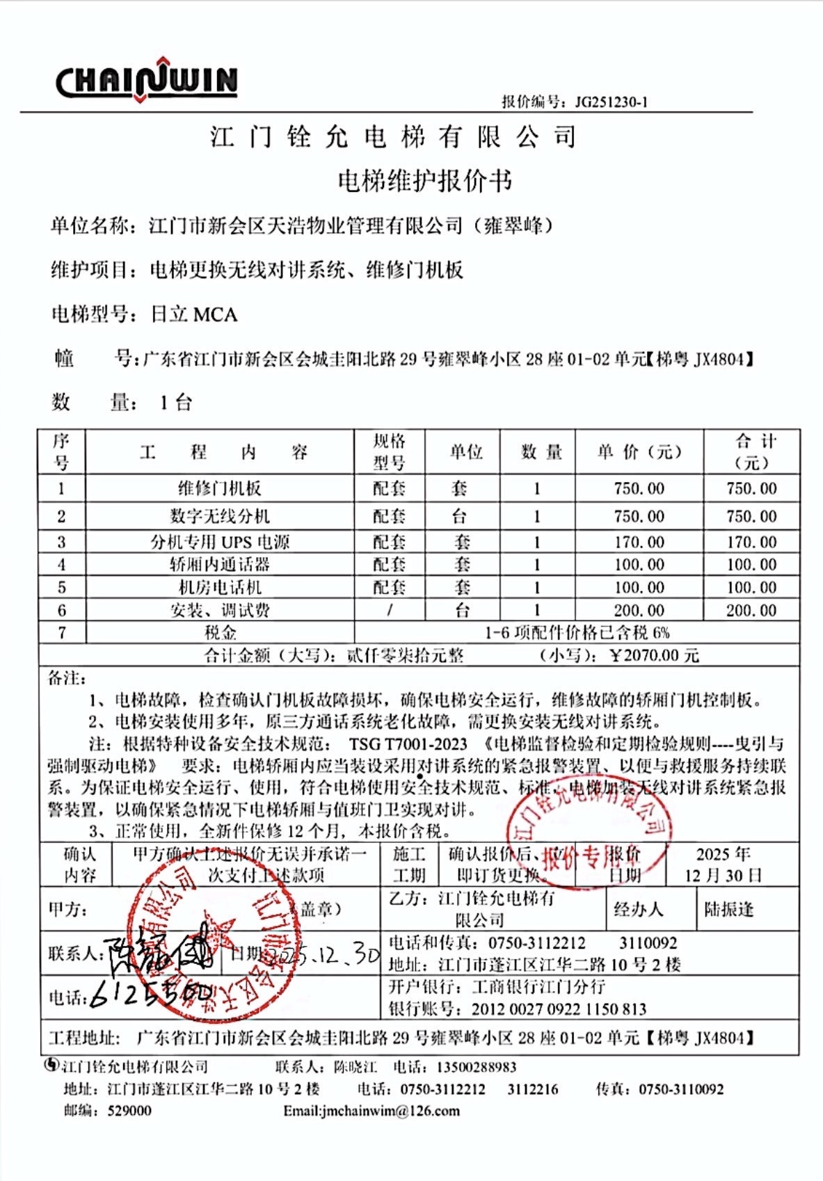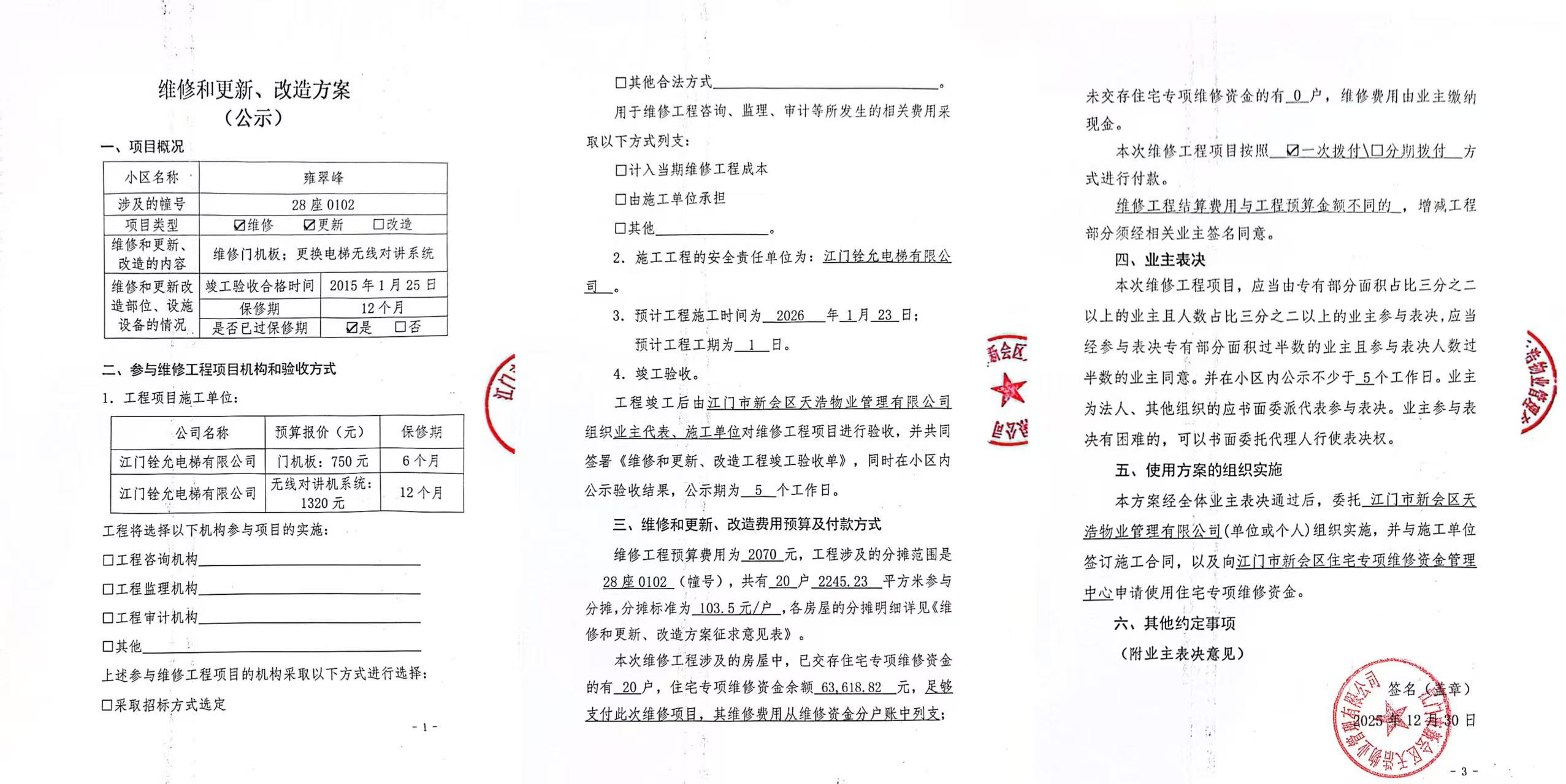 <td VALIGN="top" VALUES="" STYLE="border-width:0" BINDTYPE="0" ROWSPAN="19" COLSPAN="7" DATASOURCE="投票结果" ><font style="font-size:14pt;"><p style="white-space: normal; font-family: 宋体; line-height: 1.75em;">雍翠峰雍翠峰28座全体业主:</p><p style="white-space: normal; font-family: 宋体; line-height: 1.75em; text-indent: 2em;">本小区关于雍翠峰28座01-02单元电梯【梯粤JX4804】维修门机板和更换电梯无线对讲系统使用维修资金的投票的投票已表决结束,询异时间从2026年01月08日开始,投票询异公示期间,业主可通过微信查询自己的表决情况或可凭身份证件申请查询自己的表决情况;如公示的业主表决情况与查询的本人表决意见不一致的,可以以书面形式向投票组织机构申诉,投票组织机构予以纠正并重新公示表决结果。异议提出人对投票组织机构的处理仍有异议的,可以向街道办事处(镇人民政府)反映处理,涉及住宅专项维修资金的,可向属地住宅专项维修资金管理中心反映处理。</p><p style="white-space: normal;"><br/></p><p style="white-space: normal; font-family: 宋体; line-height: 1.75em;"><strong>附件:</strong></p><p style="white-space: normal; font-family: 宋体; line-height: 1.75em;"><strong>一、投票范围</strong></p><p style="white-space: normal; font-family: 宋体; line-height: 1.75em; text-indent: 2em;">雍翠峰雍翠峰28座</p><p style="white-space: normal; font-family: 宋体; line-height: 1.75em; text-indent: 2em;">总人数(专有部分人数之和):20</p><p style="white-space: normal; font-family: 宋体; line-height: 1.75em; text-indent: 2em;"><span style="font-family: 宋体, SimSun;"><span style="font-family: 宋体; text-indent: 32px;"><span style="font-family: 宋体; text-indent: 32px;">总户数:20</span></span></span></p><p style="white-space: normal; font-family: 宋体; line-height: 1.75em; text-indent: 2em;">建筑物总面积(专有部分面积之和):2245.23㎡</p><p style="white-space: normal; font-family: 宋体; line-height: 1.75em;"><strong>二、询异公示起止时间</strong></p><p dir="ltr" style="white-space: normal; font-family: 宋体; line-height: 1.75em; text-indent: 2em;"><span style="text-indent: 36px;">2026年01月08日至2026年01月18日</span></p><p style="white-space: normal; font-family: 宋体; line-height: 1.75em;"><strong>三、投票详细描述</strong></p><p style="white-space: normal; font-family: 宋体; line-height: 1.75em; text-indent: 2em;"><p> 雍翠峰28座01-02单元电梯【梯粤JX4804】,电梯上报开门异常,经检查确认为电梯门机板故障和三方通话系统老化,配件日常使用自然损坏,已过保修期。</p><p> 现需申请使用维修资金对28座01-02单元电梯【梯粤JX4804】进行维修,工程维修预算金额为2070元,项目最终费用以施工合同签订金额为准。维修费用的分摊标准为按分户分摊,每户分摊103.5元,详见公示附件。如业主不能正常通过微信投票,请联系物业公司进行线下纸质投票,物业电话:0750-6125500</p><p><br/></p></p><p style="white-space: normal; font-family: 宋体; line-height: 1.75em;"><strong>四、计票规则</strong></p><p style="white-space: normal; font-family: 宋体; line-height: 1.75em; text-indent: 2em;">表决事项:使用建筑物及其附属设施的维修资金<br /><p style='text-align: left; font-family: 宋体; font-size: 16px; line-height: 1.75em; text-indent: 2em;'>计票规则:弃权票不并入其它项 未表决票不并入其它项</p></p><p style="white-space: normal; font-family: 宋体; line-height: 1.75em;"><strong>五、通过规则</strong></p><p style="white-space: normal; font-family: 宋体; line-height: 1.75em;"><strong><strong style="white-space: normal;"><span style="font-family: 宋体, SimSun;"> 根据《中华人民共和国民法典》第二百七十八条规定:业主共同决定事项,应当由专有部分面积占比三分之二以上的业主且人数占比三分之二以上的业主参与表决。</span></strong></strong></p><p style="white-space: normal; font-family: 宋体; line-height: 1.75em; text-indent: 2em;">表决事项:使用建筑物及其附属设施的维修资金<br /><p style='text-align: left; font-family: 宋体; font-size: 16px; line-height: 1.75em; text-indent: 2em;'>通过规则:双2/3以上参与表决,参与表决双过半同意</p></p><p style="white-space: normal; font-family: 宋体; line-height: 1.75em;"><strong>六、投票结果</strong></p><p style="white-space: normal; font-family: 宋体; line-height: 1.75em; text-indent: 2em;"><div id='resultTable'><table style='table-layout: fixed; font-size:12px; margin-top:10px' width='100%' border='0' cellspacing='0' cellpadding='0'><tr><td height='28' colspan='10' align='center' style='border: 1px solid #666'><strong style='font-size: 14px;'> 使用建筑物及其附属设施的维修资金</strong></td> </tr><tr id='trfirst'><td height='28' colspan='4' style='border-left: 1px solid #666; border-bottom: 1px solid #666'><strong> 申报单位:</strong> 江门市新会区天浩物业管理有限公司</td><td colspan='3' style='border-left: 1px solid #666; border-bottom: 1px solid #666'><strong> 联系方式:</strong> </td><td colspan='3' style='border-left: 1px solid #666; border-bottom: 1px solid #666; border-right: 1px solid #666'><strong> 申报日期:</strong> 2025年12月30日 </td></tr><tr> <td height='28' colspan='5' style='border-left: 1px solid #666; border-bottom: 1px solid #666'><strong> 总人数(专有部分人数之和):</strong>20人 </td><td colspan='5' style='border-left: 1px solid #666; border-bottom: 1px solid #666; border-right: 1px solid #666'><strong> 建筑物总面积(专有部分面积之和):</strong>2245.23㎡ </td> </tr><tr><td height='28' colspan='10' bgcolor='#F3F3F3' style='border-left: 1px solid #666;border-bottom: 1px solid #666;border-right: 1px solid #666'><strong> 参与人数