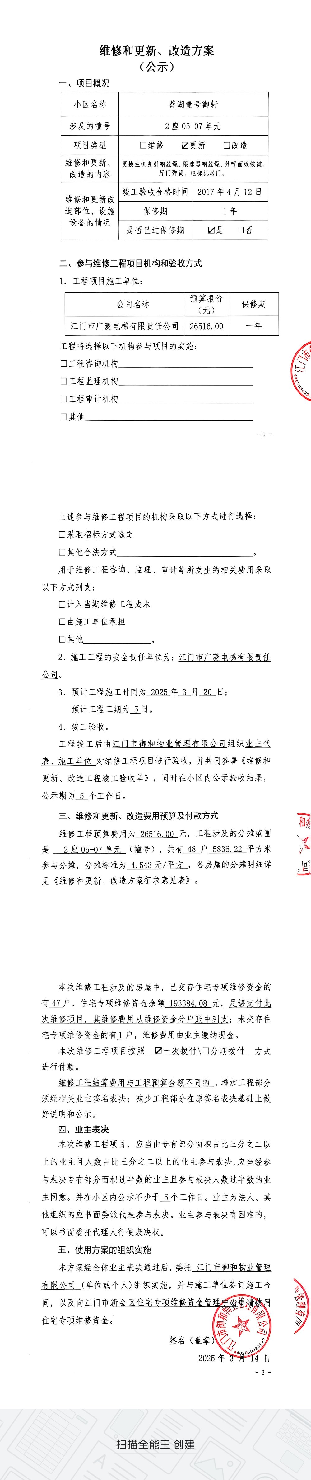 <td VALIGN="top" VALUES="" STYLE="border-width:0" BINDTYPE="0" ROWSPAN="19" COLSPAN="7" DATASOURCE="投票结果" ><font style="font-size:14pt;"><p style="white-space: normal; font-family: 宋体; line-height: 1.75em;">葵湖壹号御轩2座全体业主:</p><p style="white-space: normal; font-family: 宋体; line-height: 1.75em; text-indent: 2em;">本小区关于葵湖壹号御轩2座05-07单元4#梯更换曳引钢丝绳、限速器钢丝绳、机房门等使用维修资金的投票的投票已表决结束,询异时间从2025年03月24日开始,投票询异公示期间,业主可通过微信查询自己的表决情况或可凭身份证件申请查询自己的表决情况;如公示的业主表决情况与查询的本人表决意见不一致的,可以以书面形式向投票组织机构申诉,投票组织机构予以纠正并重新公示表决结果。异议提出人对投票组织机构的处理仍有异议的,可以向街道办事处(镇人民政府)反映处理,涉及住宅专项维修资金的,可向属地住宅专项维修资金管理中心反映处理。</p><p style="white-space: normal;"><br/></p><p style="white-space: normal; font-family: 宋体; line-height: 1.75em;"><strong>附件:</strong></p><p style="white-space: normal; font-family: 宋体; line-height: 1.75em;"><strong>一、投票范围</strong></p><p style="white-space: normal; font-family: 宋体; line-height: 1.75em; text-indent: 2em;">葵湖壹号御轩2座</p><p style="white-space: normal; font-family: 宋体; line-height: 1.75em; text-indent: 2em;">总人数(专有部分人数之和):47</p><p style="white-space: normal; font-family: 宋体; line-height: 1.75em; text-indent: 2em;"><span style="font-family: 宋体, SimSun;"><span style="font-family: 宋体; text-indent: 32px;"><span style="font-family: 宋体; text-indent: 32px;">总户数:48</span></span></span></p><p style="white-space: normal; font-family: 宋体; line-height: 1.75em; text-indent: 2em;">建筑物总面积(专有部分面积之和):5836.22㎡</p><p style="white-space: normal; font-family: 宋体; line-height: 1.75em;"><strong>二、询异公示起止时间</strong></p><p dir="ltr" style="white-space: normal; font-family: 宋体; line-height: 1.75em; text-indent: 2em;"><span style="text-indent: 36px;">2025年03月24日至2025年04月03日</span></p><p style="white-space: normal; font-family: 宋体; line-height: 1.75em;"><strong>三、投票详细描述</strong></p><p style="white-space: normal; font-family: 宋体; line-height: 1.75em; text-indent: 2em;"><p style="text-wrap: wrap;"><span style="font-family: 宋体, SimSun;"> 小区2座05-07单元4#梯日常运行时出现异响,机房门渗水,经检查,是由于4#梯主机曳引钢丝绳<span style="text-indent: 40px;">、限速器钢丝绳</span><span style="text-indent: 40px; line-height: 32px;">起铁粉、散股磨损严重,有严重安全风险,</span><span style="text-indent: 40px;">机房门外露、老化损坏严重。</span></span></p><p style="text-wrap: wrap;"><span style="font-family: 宋体, SimSun;"> 现对2座05-07单元4#梯进行维修<span style="font-family: 微软雅黑, "Microsoft YaHei"; background-color: rgb(255, 255, 255);">,<span style="font-family: 宋体, SimSun;">工程维修预算金额为26516.00元,项目最终费用以施工合同签订金额为准。因已过保修期,维修费用由相关业主按建筑面积分摊,每平方约4.543元,详见公示附件。如业主手机不能正常通过微信投票,请联系物业公司进行线下纸质投票,物业电话:0750-6693366。</span></span></span></p><p><br/></p></p><p style="white-space: normal; font-family: 宋体; line-height: 1.75em;"><strong>四、计票规则</strong></p><p style="white-space: normal; font-family: 宋体; line-height: 1.75em; text-indent: 2em;">表决事项:使用建筑物及其附属设施的维修资金<br /><p style='text-align: left; font-family: 宋体; font-size: 16px; line-height: 1.75em; text-indent: 2em;'>计票规则:弃权票不并入其它项 未表决票不并入其它项</p></p><p style="white-space: normal; font-family: 宋体; line-height: 1.75em;"><strong>五、通过规则</strong></p><p style="white-space: normal; font-family: 宋体; line-height: 1.75em;"><strong><strong style="white-space: normal;"><span style="font-family: 宋体, SimSun;"> 根据《中华人民共和国民法典》第二百七十八条规定:业主共同决定事项,应当由专有部分面积占比三分之二以上的业主且人数占比三分之二以上的业主参与表决。</span></strong></strong></p><p style="white-space: normal; font-family: 宋体; line-height: 1.75em; text-indent: 2em;">表决事项:使用建筑物及其附属设施的维修资金<br /><p style='text-align: left; font-family: 宋体; font-size: 16px; line-height: 1.75em; text-indent: 2em;'>通过规则:双2/3以上参与表决,参与表决双过半同意</p></p><p style="white-space: normal; font-family: 宋体; line-height: 1.75em;"><strong>六、投票结果</strong></p><p style="white-space: normal; font-family: 宋体; line-height: 1.75em; text-indent: 2em;"><div id='resultTable'><table style='table-layout: fixed; font-size:12px; margin-top:10px' width='100%' border='0' cellspacing='0' cellpadding='0'><tr><td height='28' colspan='10' align='center' style='border: 1px solid #666'><strong style='font-size: 14px;'> 使用建筑物及其附属设施的维修资金</strong></td> </tr><tr id='trfirst'><td height='28' colspan='4' style='border-left: 1px solid #666; border-bottom: 1px solid #666'><strong> 申报单位:</strong> 江门市御和物业管理有限公司</td><td colspan='3' style='border-left: 1px solid #666; border-bottom: 1px solid #666'><strong> 联系方式:</strong> 6693366 </td><td colspan='3' style='border-left: 1px solid #666; border-bottom: 1px solid #666; border-right: 1px solid #666'><strong> 申报日期:</strong> 2025年3月14日 </td></tr><tr> <td height='28' colspan='5' style='border-left: 1px solid #666