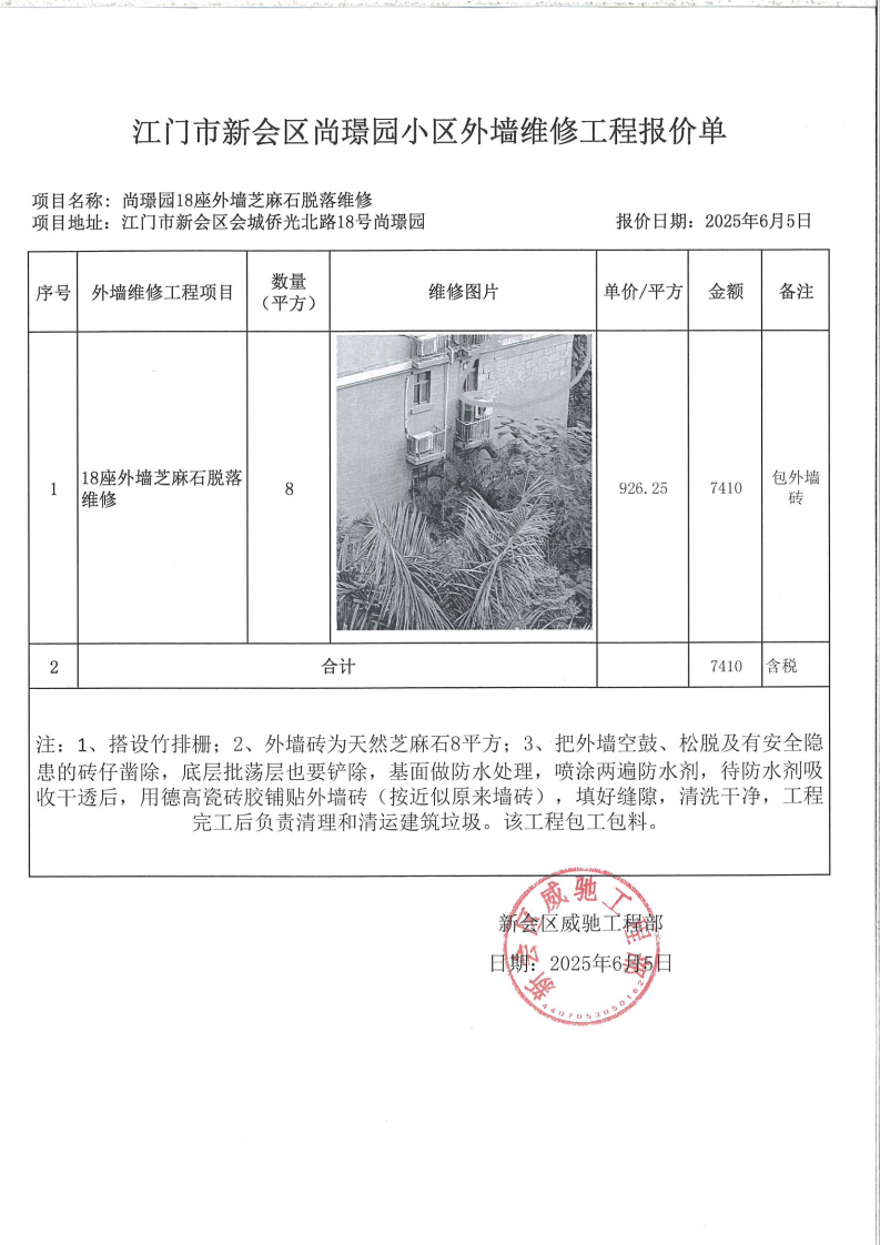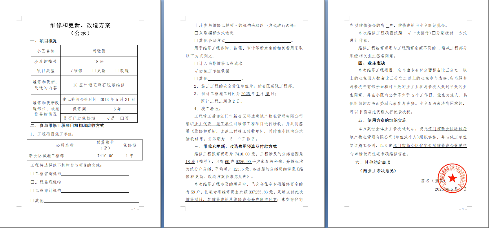 <td VALIGN="top" VALUES="" STYLE="border-width:0" BINDTYPE="0" ROWSPAN="19" COLSPAN="7" DATASOURCE="投票结果" ><font style="font-size:14pt;"><p style="white-space: normal; font-family: 宋体; line-height: 1.75em;">尚璟园尚璟园18座全体业主:</p><p style="white-space: normal; font-family: 宋体; line-height: 1.75em; text-indent: 2em;">本小区关于尚璟园18座外墙芝麻石脱落维修使用维修资金的投票的投票已表决结束,询异时间从2025年09月03日开始,投票询异公示期间,业主可通过微信查询自己的表决情况或可凭身份证件申请查询自己的表决情况;如公示的业主表决情况与查询的本人表决意见不一致的,可以以书面形式向投票组织机构申诉,投票组织机构予以纠正并重新公示表决结果。异议提出人对投票组织机构的处理仍有异议的,可以向街道办事处(镇人民政府)反映处理,涉及住宅专项维修资金的,可向属地住宅专项维修资金管理中心反映处理。</p><p style="white-space: normal;"><br/></p><p style="white-space: normal; font-family: 宋体; line-height: 1.75em;"><strong>附件:</strong></p><p style="white-space: normal; font-family: 宋体; line-height: 1.75em;"><strong>一、投票范围</strong></p><p style="white-space: normal; font-family: 宋体; line-height: 1.75em; text-indent: 2em;">尚璟园尚璟园18座</p><p style="white-space: normal; font-family: 宋体; line-height: 1.75em; text-indent: 2em;">总人数(专有部分人数之和):59</p><p style="white-space: normal; font-family: 宋体; line-height: 1.75em; text-indent: 2em;"><span style="font-family: 宋体, SimSun;"><span style="font-family: 宋体; text-indent: 32px;"><span style="font-family: 宋体; text-indent: 32px;">总户数:60</span></span></span></p><p style="white-space: normal; font-family: 宋体; line-height: 1.75em; text-indent: 2em;">建筑物总面积(专有部分面积之和):9286.90㎡</p><p style="white-space: normal; font-family: 宋体; line-height: 1.75em;"><strong>二、询异公示起止时间</strong></p><p dir="ltr" style="white-space: normal; font-family: 宋体; line-height: 1.75em; text-indent: 2em;"><span style="text-indent: 36px;">2025年09月03日至2025年09月13日</span></p><p style="white-space: normal; font-family: 宋体; line-height: 1.75em;"><strong>三、投票详细描述</strong></p><p style="white-space: normal; font-family: 宋体; line-height: 1.75em; text-indent: 2em;"><p><span style="font-family: arial, helvetica, sans-serif;"><span style="font-size: 15px; color: black; background: white;">本小区</span><span style="font-size: 15px; color: black; background: white;">18</span><span style="font-size: 15px; color: black; background: white;">座外墙芝麻石出现脱落,经检查,是由于外墙芝麻石空鼓造成。现需申请使用维修资金对</span><span style="font-size: 15px; color: black; background: white;">18</span><span style="font-size: 15px; color: black; background: white;">座外墙芝麻石进行维修,工程维修预算金额为</span><span style="font-size: 15px; color: black; background: white;">7410.00</span><span style="font-size: 15px; color: black; background: white;">元,项目最终费用以施工合同签订金额为准。因已过保修期,维修费用由相关业主按分户分摊,共涉及</span><span style="font-size: 15px; color: black; background: white;">60</span><span style="font-size: 15px; color: black; background: white;">户,每户</span><span style="font-size: 15px; color: black; background: white;">123.50</span><span style="font-size: 15px; color: black; background: white;">元,详见公示附件。如业主手机不能正常通过微信投票,请联系物业公司进行线下纸质投票,物业公司联系电话:</span><span style="font-size: 15px; color: black; background: white;">0750-6198383</span><span style="font-size: 15px; color: black; background: white;">。</span></span></p><p><br/></p></p><p style="white-space: normal; font-family: 宋体; line-height: 1.75em;"><strong>四、计票规则</strong></p><p style="white-space: normal; font-family: 宋体; line-height: 1.75em; text-indent: 2em;">表决事项:使用建筑物及其附属设施的维修资金<br /><p style='text-align: left; font-family: 宋体; font-size: 16px; line-height: 1.75em; text-indent: 2em;'>计票规则:弃权票不并入其它项 未表决票不并入其它项</p></p><p style="white-space: normal; font-family: 宋体; line-height: 1.75em;"><strong>五、通过规则</strong></p><p style="white-space: normal; font-family: 宋体; line-height: 1.75em;"><strong><strong style="white-space: normal;"><span style="font-family: 宋体, SimSun;"> 根据《中华人民共和国民法典》第二百七十八条规定:业主共同决定事项,应当由专有部分面积占比三分之二以上的业主且人数占比三分之二以上的业主参与表决。</span></strong></strong></p><p style="white-space: normal; font-family: 宋体; line-height: 1.75em; text-indent: 2em;">表决事项:使用建筑物及其附属设施的维修资金<br /><p style='text-align: left; font-family: 宋体; font-size: 16px; line-height: 1.75em; text-indent: 2em;'>通过规则:双2/3以上参与表决,参与表决双过半同意</p></p><p style="white-space: normal; font-family: 宋体; line-height: 1.75em;"><strong>六、投票结果</strong></p><p style="white-space: normal; font-family: 宋体; line-height: 1.75em; text-indent: 2em;"><div id='resultTable'><table style='table-layout: fixed; font-size:12px; margin-top:10px' width='100%' border='0' cellspacing='0' cellpadding='0'><tr><td height='28' colspan='10' align='center' style='border: 1px solid #666'><strong style='font-size: 14px;'> 使用建筑物及其附属设施的维修资金</strong></td> </tr><tr id='trfirst'><td height='28' colspan='4' style='border-left: 1px solid #666; border-bottom: 1px solid #666'><strong> 申报单位:</strong> 新会区环城房地产