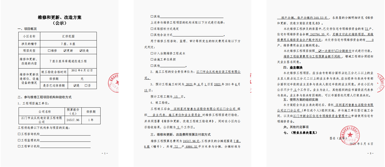 <td valign="top" values="" style="border-width:0" bindtype="0" rowspan="17" colspan="7" datasource="投票结果"><font style=" font-family:方正小标宋简体;font-size:14pt;"><p style="line-height: 1.75em;"><span style="font-family: 宋体, SimSun;">各位尊敬的业主:</span><br></p><p style="text-indent: 2em; line-height: 1.75em;"><span style="font-family: 宋体, SimSun;">根据法律法规的规定,本小区业主利用“物业公共事务决策系统”已对本小区公共事务决策事项进行了表决,在经过7日的询异公示期后,未收到业主有效的异议。现将投票结果公告,并就产生的法律效力说明如下:</span></p><p style="line-height: 1.75em; text-indent: 0em;"><strong style="text-indent: 2em;"><span style="font-family: 宋体, SimSun;">一、投票范围</span></strong></p><p style="text-indent: 2em; line-height: 1.75em;"><span style="font-family: 宋体, SimSun;">汇侨花园汇侨花园7座、汇侨花园8座</span></p><p style="text-indent: 2em; line-height: 1.75em;"><span style="font-family: 宋体, SimSun;">总人数(专有部分人数之和):72</span></p><p style="text-indent: 2em; line-height: 1.75em;"><span style="font-family: 宋体, SimSun;"><span style="font-family: 宋体, SimSun; text-indent: 32px;">总户数:72</span></span></p><p style="text-indent: 2em; line-height: 1.75em;"><span style="font-family: 宋体, SimSun;">建筑物总面积(专有部分面积之和):6884.32㎡</span></p><p style="line-height: 1.75em;"><strong><span style="font-family: 宋体, SimSun;">二、投票起止时间</span></strong></p><p style="text-indent: 2em; line-height: 1.75em;"><span style="font-family: 宋体, SimSun;">投票表决时间:从2023年05月10日到2023年05月25日止</span></p><p style="text-indent: 2em; line-height: 1.75em;"><span style="font-family: 宋体, SimSun;">投票询异公示时间:从2023年05月26日开始</span></p><p style="text-indent: 2em; line-height: 1.75em;"><span style="font-family: 宋体, SimSun;">投票结果通知公告时间:从2023年06月02日开始</span></p><p style="line-height: 1.75em;"><strong><span style="font-family: 宋体, SimSun;">三、计票规则</span></strong></p><p style="text-indent: 2em; line-height: 1.75em;"><span style="font-family: 宋体, SimSun;">表决事项:使用建筑物及其附属设施的维修资金<br></span></p><p style="font-family: 宋体, SimSun;line-height: 1.75em; text-indent: 2em;">计票规则:弃权票不并入其它项 未表决票不并入其它项</p><p></p><p style="line-height: 1.75em;"><strong><span style="font-family: 宋体, SimSun;">四、通过规则</span></strong></p><p style="text-indent: 2em; line-height: 1.75em;"><span style="font-family: 宋体, SimSun;"><span style="font-family: 宋体, SimSun; text-indent: 32px;">表决事项:使用建筑物及其附属设施的维修资金<br></span></span></p><p style="font-family: 宋体, SimSun;line-height: 1.75em; text-indent: 2em;">通过规则:参与表决专有部分面积过半数的业主且参与表决人数过半数的业主同意</p><p></p><p style="line-height: 1.75em;"><strong><span style="font-family: 宋体, SimSun;">五、投票结果</span></strong></p><p style="line-height: 1.75em; text-indent: 2em;"><span style="font-family: 宋体, SimSun; text-indent: 2em;"></span></p><div id="resultTable"><table style="table-layout: fixed; font-size:12px; margin-top:10px" width="100%" border="0" cellspacing="0" cellpadding="0"><tbody><tr><td height="28" colspan="10" align="center" style="border: 1px solid #666"><strong style="font-size: 14px;"> 使用建筑物及其附属设施的维修资金</strong></td> </tr><tr id="trfirst"><td height="28" colspan="4" style="border-left: 1px solid #666; border-bottom: 1px solid #666"><strong> 申报单位:</strong> 深圳星河智善生活股份有限公司江门分公司</td><td colspan="3" style="border-left: 1px solid #666; border-bottom: 1px solid #666"><strong> 联系方式:</strong> (0750) 3871336 3829717 </td><td colspan="3" style="border-left: 1px solid #666; border-bottom: 1px solid #666; border-right: 1px solid #666"><strong> 申报日期:</strong> 2023年5月8日 </td></tr><tr> <td height="28" colspan="5" style="border-left: 1px solid #666; border-bottom: 1px solid #666"><strong> 总人数(专有部分人数之和):</strong>72人 </td><td colspan="5" style="border-left: 1px solid #666; border-bottom: 1px solid #666; border-right: 1px solid #666"><strong> 建筑物总面积(专有部分面积之和):</strong>6884.32㎡ </td> </tr><tr><td height="28" colspan="10" bgcolor="#F3F3F3" style="border-left: 1px solid #666;border-bottom: 1px solid #666;border-right: 1px solid #666"><strong> 参与人数及面积统计</strong></td></tr><tr><td height="28" colspan="5" style="border-left: 1px solid #666; border-bottom: 1px solid #666"><strong> 参与表决专有部分人数之和:</strong>52人</td><td colspan="5" style="border-left: 1px solid #666; border-bottom: 1px solid #666; border-right: 1px solid #666"><strong> 参与表决占有表决权总人数比例:</strong>72.22%</td></tr><tr><td height="28" colspan="5" style="border-left: 1px solid #666; border-bottom: 1px solid #666"><strong> 参与表决专有部分面积之和:</strong>5051.04㎡</td><td colspan="5" style="border-left: 1px solid #666; border-bottom: 1px solid #666; border-right: 1px solid #666"><strong> 参与表决占有表决权总面积比例:</strong>73.37%</td></tr><tr><td height="28" colspan="10" bgcolor="#F3F3F3" style="border-left: 1px solid #666; border-bottom: 1px solid #666;border-right: 1px solid #666"> <strong> 未参与人数及面积统计</strong></td> </tr><tr><td height="28" colspan="5" style="border-left: 1px solid #666; border-bottom: 1px solid #666"><strong> 未参与表决专有部分人数之和:</strong>20人 </td><td colspan="5" style="border-left: 1px solid #666; border-bottom: 1px solid #666; border-right: 1px solid #666"><strong> 未参与表决占有表决权总人数比例: