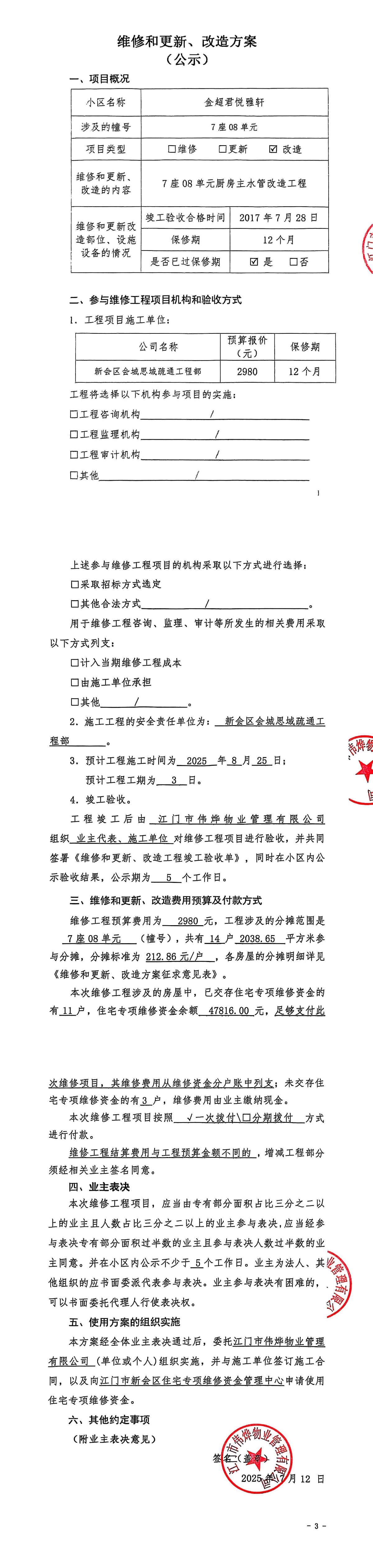 <td VALIGN="top" VALUES="" STYLE="border-width:0" BINDTYPE="0" ROWSPAN="19" COLSPAN="7" DATASOURCE="投票结果" ><font style="font-size:14pt;"><p style="white-space: normal; font-family: 宋体; line-height: 1.75em;">金超君悦雅轩7座全体业主:</p><p style="white-space: normal; font-family: 宋体; line-height: 1.75em; text-indent: 2em;">本小区关于金超君悦雅轩7座08单元厨房主水管改造工程使用维修资金的投票的投票已表决结束,询异时间从2025年07月30日开始,投票询异公示期间,业主可通过微信查询自己的表决情况或可凭身份证件申请查询自己的表决情况;如公示的业主表决情况与查询的本人表决意见不一致的,可以以书面形式向投票组织机构申诉,投票组织机构予以纠正并重新公示表决结果。异议提出人对投票组织机构的处理仍有异议的,可以向街道办事处(镇人民政府)反映处理,涉及住宅专项维修资金的,可向属地住宅专项维修资金管理中心反映处理。</p><p style="white-space: normal;"><br/></p><p style="white-space: normal; font-family: 宋体; line-height: 1.75em;"><strong>附件:</strong></p><p style="white-space: normal; font-family: 宋体; line-height: 1.75em;"><strong>一、投票范围</strong></p><p style="white-space: normal; font-family: 宋体; line-height: 1.75em; text-indent: 2em;">金超君悦雅轩7座</p><p style="white-space: normal; font-family: 宋体; line-height: 1.75em; text-indent: 2em;">总人数(专有部分人数之和):14</p><p style="white-space: normal; font-family: 宋体; line-height: 1.75em; text-indent: 2em;"><span style="font-family: 宋体, SimSun;"><span style="font-family: 宋体; text-indent: 32px;"><span style="font-family: 宋体; text-indent: 32px;">总户数:14</span></span></span></p><p style="white-space: normal; font-family: 宋体; line-height: 1.75em; text-indent: 2em;">建筑物总面积(专有部分面积之和):2038.65㎡</p><p style="white-space: normal; font-family: 宋体; line-height: 1.75em;"><strong>二、询异公示起止时间</strong></p><p dir="ltr" style="white-space: normal; font-family: 宋体; line-height: 1.75em; text-indent: 2em;"><span style="text-indent: 36px;">2025年07月30日至2025年08月09日</span></p><p style="white-space: normal; font-family: 宋体; line-height: 1.75em;"><strong>三、投票详细描述</strong></p><p style="white-space: normal; font-family: 宋体; line-height: 1.75em; text-indent: 2em;"><p> 金超君悦雅轩7座08单元厨房主水管多次出现水反涌并造成堵塞现象,已过保修期。现需申请使用维修资金对7座08单元厨房主水管进行改造,工程维修预算金额为2980元,项目最终费用以施工合同签订金额为准。改造费用的分摊标准为按分户分摊,每户分摊约:212.86元,详见公示附件。如业主手机不能正常通过微信投票,请联系物业公司进行线下纸质投票,物业公司联系电话:0750-6122009</p></p><p style="white-space: normal; font-family: 宋体; line-height: 1.75em;"><strong>四、计票规则</strong></p><p style="white-space: normal; font-family: 宋体; line-height: 1.75em; text-indent: 2em;">表决事项:使用建筑物及其附属设施的维修资金<br /><p style='text-align: left; font-family: 宋体; font-size: 16px; line-height: 1.75em; text-indent: 2em;'>计票规则:弃权票不并入其它项 未表决票不并入其它项</p></p><p style="white-space: normal; font-family: 宋体; line-height: 1.75em;"><strong>五、通过规则</strong></p><p style="white-space: normal; font-family: 宋体; line-height: 1.75em;"><strong><strong style="white-space: normal;"><span style="font-family: 宋体, SimSun;"> 根据《中华人民共和国民法典》第二百七十八条规定:业主共同决定事项,应当由专有部分面积占比三分之二以上的业主且人数占比三分之二以上的业主参与表决。</span></strong></strong></p><p style="white-space: normal; font-family: 宋体; line-height: 1.75em; text-indent: 2em;">表决事项:使用建筑物及其附属设施的维修资金<br /><p style='text-align: left; font-family: 宋体; font-size: 16px; line-height: 1.75em; text-indent: 2em;'>通过规则:双2/3以上参与表决,参与表决双过半同意</p></p><p style="white-space: normal; font-family: 宋体; line-height: 1.75em;"><strong>六、投票结果</strong></p><p style="white-space: normal; font-family: 宋体; line-height: 1.75em; text-indent: 2em;"><div id='resultTable'><table style='table-layout: fixed; font-size:12px; margin-top:10px' width='100%' border='0' cellspacing='0' cellpadding='0'><tr><td height='28' colspan='10' align='center' style='border: 1px solid #666'><strong style='font-size: 14px;'> 使用建筑物及其附属设施的维修资金</strong></td> </tr><tr id='trfirst'><td height='28' colspan='4' style='border-left: 1px solid #666; border-bottom: 1px solid #666'><strong> 申报单位:</strong> 江门市伟烨物业管理有限公司</td><td colspan='3' style='border-left: 1px solid #666; border-bottom: 1px solid #666'><strong> 联系方式:</strong> 0750-6123828 </td><td colspan='3' style='border-left: 1px solid #666; border-bottom: 1px solid #666; border-right: 1px solid #666'><strong> 申报日期:</strong> 2025年7月12日 </td></tr><tr> <td height='28' colspan='5' style='border-left: 1px solid #666; border-bottom: 1px solid #666'><strong> 总人数(专有部分人数之和):</strong>14人 </td><td colspan='5' style='border-left: 1px solid #666; border-bottom: 1px solid #666; border-right: 1px solid #666'><strong> 建筑物总面积(专有部分面积之和):</strong>2038.65㎡ </td> </tr><tr><td height='28' colspan='10' bgcolor='#F3F3F3' style='border-left: 1px solid #666;border-bottom: 1px solid #666;border-right: 1px solid #666'><strong> 参与人数及面积统计</strong></td></tr><tr><td height='28' colspan='5' style='border-left: 1px solid #666; border-bottom: 1px solid #666'><