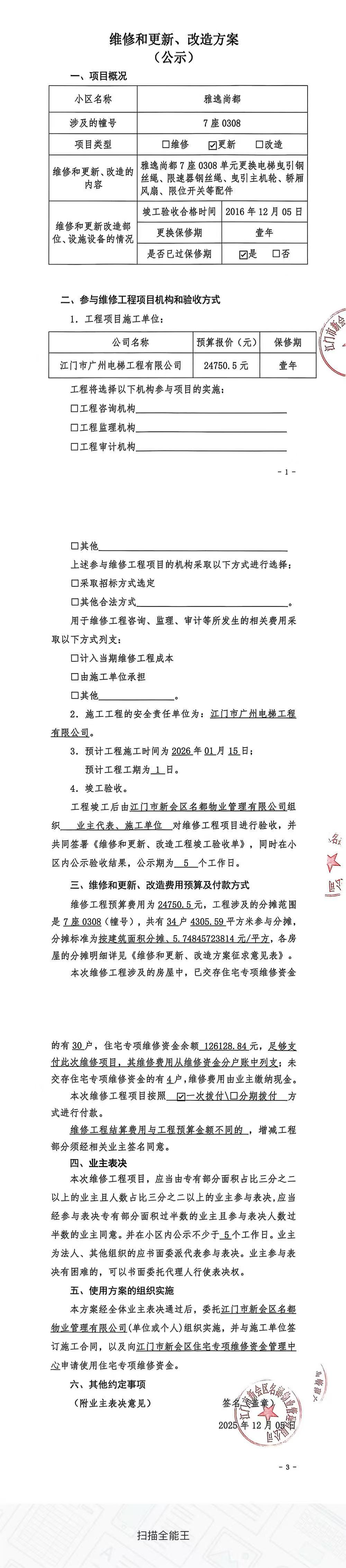 <td VALIGN="top" VALUES="" STYLE="border-width:0" BINDTYPE="0" ROWSPAN="19" COLSPAN="7" DATASOURCE="投票结果" ><font style="font-size:14pt;"><p style="white-space: normal; font-family: 宋体; line-height: 1.75em;">雅逸尚都雅逸尚都7座全体业主:</p><p style="white-space: normal; font-family: 宋体; line-height: 1.75em; text-indent: 2em;">本小区关于雅逸尚都7座0308单元客梯更换轿厢风扇、货梯更换电梯钢丝绳、曳引主机轮、轿厢风扇、限位开关等配件使用维修资金的投票的投票已表决结束,询异时间从2025年12月30日开始,投票询异公示期间,业主可通过微信查询自己的表决情况或可凭身份证件申请查询自己的表决情况;如公示的业主表决情况与查询的本人表决意见不一致的,可以以书面形式向投票组织机构申诉,投票组织机构予以纠正并重新公示表决结果。异议提出人对投票组织机构的处理仍有异议的,可以向街道办事处(镇人民政府)反映处理,涉及住宅专项维修资金的,可向属地住宅专项维修资金管理中心反映处理。</p><p style="white-space: normal;"><br/></p><p style="white-space: normal; font-family: 宋体; line-height: 1.75em;"><strong>附件:</strong></p><p style="white-space: normal; font-family: 宋体; line-height: 1.75em;"><strong>一、投票范围</strong></p><p style="white-space: normal; font-family: 宋体; line-height: 1.75em; text-indent: 2em;">雅逸尚都雅逸尚都7座</p><p style="white-space: normal; font-family: 宋体; line-height: 1.75em; text-indent: 2em;">总人数(专有部分人数之和):34</p><p style="white-space: normal; font-family: 宋体; line-height: 1.75em; text-indent: 2em;"><span style="font-family: 宋体, SimSun;"><span style="font-family: 宋体; text-indent: 32px;"><span style="font-family: 宋体; text-indent: 32px;">总户数:34</span></span></span></p><p style="white-space: normal; font-family: 宋体; line-height: 1.75em; text-indent: 2em;">建筑物总面积(专有部分面积之和):4305.59㎡</p><p style="white-space: normal; font-family: 宋体; line-height: 1.75em;"><strong>二、询异公示起止时间</strong></p><p dir="ltr" style="white-space: normal; font-family: 宋体; line-height: 1.75em; text-indent: 2em;"><span style="text-indent: 36px;">2025年12月30日至2026年01月09日</span></p><p style="white-space: normal; font-family: 宋体; line-height: 1.75em;"><strong>三、投票详细描述</strong></p><p style="white-space: normal; font-family: 宋体; line-height: 1.75em; text-indent: 2em;"><p> 雅逸尚都7座0308单元货梯【梯粤JX6526】、客梯【梯粤JX6525】运行时出现异响,经检查,是由于货梯【梯粤JX6526】曳引钢丝绳、限速器钢丝绳、曳引主机轮、轿厢风扇、涨紧轮、限位开关、底坑缓冲开关、底坑涨紧轮开关自然磨损和损坏、客梯【梯粤JX6525】轿厢风扇自然损坏,为保障电梯安全运行,需要更换<span style="text-wrap-mode: wrap;">曳引钢丝绳、限速器钢丝绳、曳引主机轮、轿厢风扇、涨紧轮等配件。</span></p><p><span style="text-wrap-mode: wrap;"> 现对7座0308单元<span style="text-wrap-mode: wrap;">货梯【梯粤JX6526】、客梯【梯粤JX6525】</span>进行维修,工程维修预算金额为24750.5元,</span><span style="text-wrap-mode: wrap;">项目最终费用以施工合同签订金额为准。因已过保修期,维修费用由相关业主按建筑面积分摊,每平方约5.74845723814元,详见公示附件。如业主手机不能正常通过微信投票,请联系物业公司进行线下纸质投票,物业电话:0750-6609908。</span></p></p><p style="white-space: normal; font-family: 宋体; line-height: 1.75em;"><strong>四、计票规则</strong></p><p style="white-space: normal; font-family: 宋体; line-height: 1.75em; text-indent: 2em;">表决事项:使用建筑物及其附属设施的维修资金<br /><p style='text-align: left; font-family: 宋体; font-size: 16px; line-height: 1.75em; text-indent: 2em;'>计票规则:弃权票不并入其它项 未表决票不并入其它项</p></p><p style="white-space: normal; font-family: 宋体; line-height: 1.75em;"><strong>五、通过规则</strong></p><p style="white-space: normal; font-family: 宋体; line-height: 1.75em;"><strong><strong style="white-space: normal;"><span style="font-family: 宋体, SimSun;"> 根据《中华人民共和国民法典》第二百七十八条规定:业主共同决定事项,应当由专有部分面积占比三分之二以上的业主且人数占比三分之二以上的业主参与表决。</span></strong></strong></p><p style="white-space: normal; font-family: 宋体; line-height: 1.75em; text-indent: 2em;">表决事项:使用建筑物及其附属设施的维修资金<br /><p style='text-align: left; font-family: 宋体; font-size: 16px; line-height: 1.75em; text-indent: 2em;'>通过规则:双2/3以上参与表决,参与表决双过半同意</p></p><p style="white-space: normal; font-family: 宋体; line-height: 1.75em;"><strong>六、投票结果</strong></p><p style="white-space: normal; font-family: 宋体; line-height: 1.75em; text-indent: 2em;"><div id='resultTable'><table style='table-layout: fixed; font-size:12px; margin-top:10px' width='100%' border='0' cellspacing='0' cellpadding='0'><tr><td height='28' colspan='10' align='center' style='border: 1px solid #666'><strong style='font-size: 14px;'> 使用建筑物及其附属设施的维修资金</strong></td> </tr><tr id='trfirst'><td height='28' colspan='4' style='border-left: 1px solid #666; border-bottom: 1px solid #666'><strong> 申报单位:</strong> 江门市新会区名都物业管理有限公司</td><td colspan='3' style='border-left: 1px solid #666; border-bottom: 1px solid #666'><strong> 联系方式:</strong> 6609908 </td><td colspan='3' style='border-left: 1px solid #666; border-bottom: 1px solid #666; border-right: 1px solid #666'><strong> 申报日期:</strong> 20