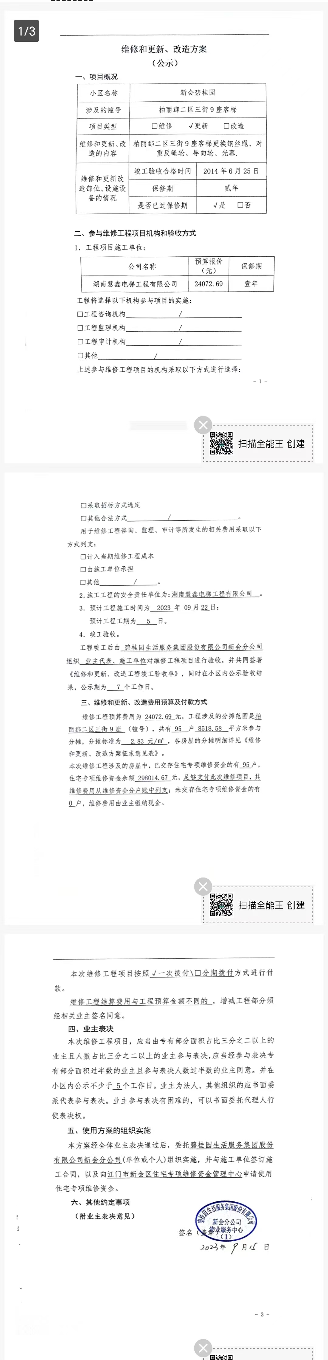 <td valign="top" values="" style="border-width:0" bindtype="0" rowspan="17" colspan="7" datasource="投票结果"><font style=" font-family:方正小标宋简体;font-size:14pt;"><p style="line-height: 1.75em;"><span style="font-family: 宋体, SimSun;">各位尊敬的业主:</span><br></p><p style="text-indent: 2em; line-height: 1.75em;"><span style="font-family: 宋体, SimSun;">根据法律法规的规定,本小区业主利用“江门市物业事项表决管理系统”已对本小区公共事务决策事项进行了表决,在经过7日的询异公示期后,未收到业主有效的异议。现将投票结果公告,并就产生的法律效力说明如下:</span></p><p style="line-height: 1.75em; text-indent: 0em;"><strong style="text-indent: 2em;"><span style="font-family: 宋体, SimSun;">一、投票范围</span></strong></p><p style="text-indent: 2em; line-height: 1.75em;"><span style="font-family: 宋体, SimSun;">新会碧桂园碧桂园柏丽郡二区三街9座</span></p><p style="text-indent: 2em; line-height: 1.75em;"><span style="font-family: 宋体, SimSun;">总人数(专有部分人数之和):95</span></p><p style="text-indent: 2em; line-height: 1.75em;"><span style="font-family: 宋体, SimSun;"><span style="font-family: 宋体, SimSun; text-indent: 32px;"><span style="font-family: 宋体; text-indent: 32px;">总户数:95</span></span></span></p><p style="text-indent: 2em; line-height: 1.75em;"><span style="font-family: 宋体, SimSun;">建筑物总面积(专有部分面积之和):8518.58㎡</span></p><p style="line-height: 1.75em;"><strong><span style="font-family: 宋体, SimSun;">二、投票结果公告时间</span></strong></p><p style="text-indent: 2em; line-height: 1.75em;"><span style="font-family: 宋体, SimSun;">从2023年09月29日开始</span></p><p style="line-height: 1.75em;"><strong><span style="font-family: 宋体, SimSun;">三、计票规则</span></strong></p><p style="text-indent: 2em; line-height: 1.75em;"><span style="font-family: 宋体, SimSun;">表决事项:使用建筑物及其附属设施的维修资金<br></span></p><p style="font-family: 宋体, SimSun;line-height: 1.75em; text-indent: 2em;">计票规则:弃权票不并入其它项 未表决票不并入其它项</p><p></p><p style="line-height: 1.75em;"><strong><span style="font-family: 宋体, SimSun;">四、通过规则</span></strong></p><p style="text-indent: 2em; line-height: 1.75em;"><span style="font-family: 宋体, SimSun;"><span style="font-family: 宋体, SimSun; text-indent: 32px;">表决事项:使用建筑物及其附属设施的维修资金<br></span></span></p><p style="font-family: 宋体, SimSun;line-height: 1.75em; text-indent: 2em;">通过规则:参与表决专有部分面积过半数的业主且参与表决人数过半数的业主同意</p><p></p><p style="line-height: 1.75em;"><strong><span style="font-family: 宋体, SimSun;">五、投票结果</span></strong></p><p style="line-height: 1.75em; text-indent: 2em;"><span style="font-family: 宋体, SimSun; text-indent: 2em;"></span></p><div id="resultTable"><table style="table-layout: fixed; font-size:12px; margin-top:10px" width="100%" border="0" cellspacing="0" cellpadding="0"><tbody><tr><td height="28" colspan="10" align="center" style="border: 1px solid #666"><strong style="font-size: 14px;"> 使用建筑物及其附属设施的维修资金</strong></td> </tr><tr id="trfirst"><td height="28" colspan="4" style="border-left: 1px solid #666; border-bottom: 1px solid #666"><strong> 申报单位:</strong> 碧桂园生活服务集团股份有限公司新会分公司</td><td colspan="3" style="border-left: 1px solid #666; border-bottom: 1px solid #666"><strong> 联系方式:</strong> </td><td colspan="3" style="border-left: 1px solid #666; border-bottom: 1px solid #666; border-right: 1px solid #666"><strong> 申报日期:</strong> 2023年9月15日 </td></tr><tr> <td height="28" colspan="5" style="border-left: 1px solid #666; border-bottom: 1px solid #666"><strong> 总人数(专有部分人数之和):</strong>95人 </td><td colspan="5" style="border-left: 1px solid #666; border-bottom: 1px solid #666; border-right: 1px solid #666"><strong> 建筑物总面积(专有部分面积之和):</strong>8518.58㎡ </td> </tr><tr><td height="28" colspan="10" bgcolor="#F3F3F3" style="border-left: 1px solid #666;border-bottom: 1px solid #666;border-right: 1px solid #666"><strong> 参与人数及面积统计</strong></td></tr><tr><td height="28" colspan="5" style="border-left: 1px solid #666; border-bottom: 1px solid #666"><strong> 参与表决专有部分人数之和:</strong>67人</td><td colspan="5" style="border-left: 1px solid #666; border-bottom: 1px solid #666; border-right: 1px solid #666"><strong> 参与表决占有表决权总人数比例:</strong>70.53%</td></tr><tr><td height="28" colspan="5" style="border-left: 1px solid #666; border-bottom: 1px solid #666"><strong> 参与表决专有部分面积之和:</strong>6004.05㎡</td><td colspan="5" style="border-left: 1px solid #666; border-bottom: 1px solid #666; border-right: 1px solid #666"><strong> 参与表决占有表决权总面积比例:</strong>70.48%</td></tr><tr><td height="28" colspan="10" bgcolor="#F3F3F3" style="border-left: 1px solid #666; border-bottom: 1px solid #666;border-right: 1px solid #666"> <strong> 未参与人数及面积统计</strong></td> </tr><tr><td height="28" colspan="5" style="border-left: 1px solid #666; border-bottom: 1px solid #666"><strong> 未参与表决专有部分人数之和:</strong>28人 </td><td colspan="5" style="border-left: 1px solid #666; border-bottom: 1px solid #666; border-right: 1px solid #666"><strong> 未参与表决占有表决权总人数比例:</strong>29.47%</td></tr><tr><td height="28" colspan="5" style="border-left: 1px solid #666; border-bottom: 1px solid #666"><strong> 未参与表决专有部分面积之和:</strong>2514.53㎡</td><td colspan="5" style="border-left: 1px solid #666; border-bottom: 1px solid #666; border-right: