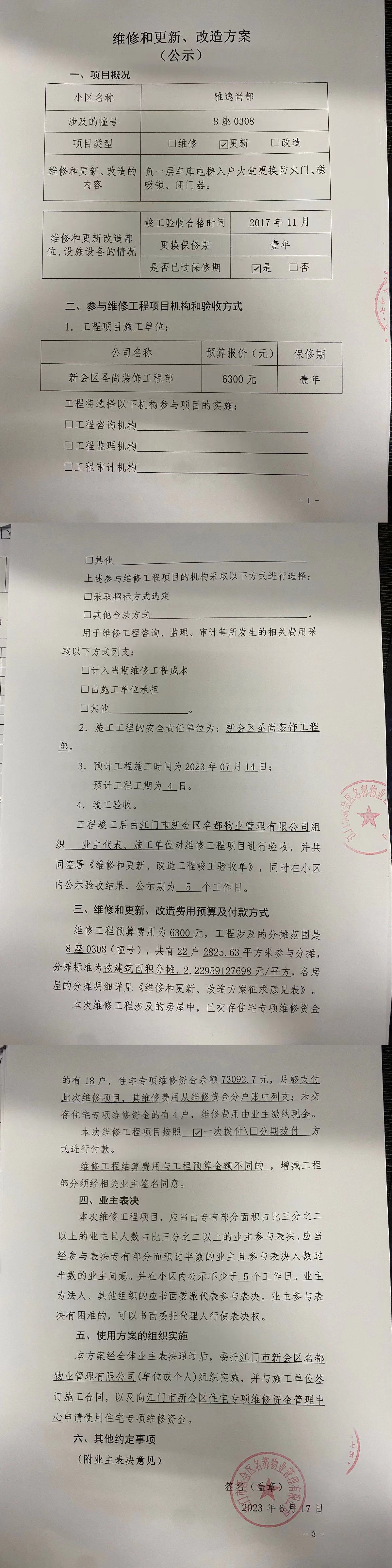 <td VALIGN="top" VALUES="" STYLE="border-width:0" BINDTYPE="0" ROWSPAN="19" COLSPAN="7" DATASOURCE="投票结果" ><font style="font-size:14pt;"><p style="white-space: normal; font-family: 宋体; line-height: 1.75em;">雅逸尚都雅逸尚都8座全体业主:</p><p style="white-space: normal; font-family: 宋体; line-height: 1.75em; text-indent: 2em;">本小区关于雅逸尚都8座0308负一层车库电梯入户大堂更换防火门、磁吸锁、闭门器使用维修资金的投票的投票已表决结束,询异时间从2023年06月29日开始,投票询异公示期间,业主可通过微信查询自己的表决情况或可凭身份证件申请查询自己的表决情况;如公示的业主表决情况与查询的本人表决意见不一致的,可以以书面形式向投票组织机构申诉,投票组织机构予以纠正并重新公示表决结果。异议提出人对投票组织机构的处理仍有异议的,可以向街道办事处(镇人民政府)反映处理,涉及住宅专项维修资金的,可向属地住宅专项维修资金管理中心反映处理。</p><p style="white-space: normal;"><br/></p><p style="white-space: normal; font-family: 宋体; line-height: 1.75em;"><strong>附件:</strong></p><p style="white-space: normal; font-family: 宋体; line-height: 1.75em;"><strong>一、投票范围</strong></p><p style="white-space: normal; font-family: 宋体; line-height: 1.75em; text-indent: 2em;">雅逸尚都雅逸尚都8座</p><p style="white-space: normal; font-family: 宋体; line-height: 1.75em; text-indent: 2em;">总人数(专有部分人数之和):22</p><p style="white-space: normal; font-family: 宋体; line-height: 1.75em; text-indent: 2em;"><span style="font-family: 宋体, SimSun;">总户数:22</span></p><p style="white-space: normal; font-family: 宋体; line-height: 1.75em; text-indent: 2em;">建筑物总面积(专有部分面积之和):2825.63㎡</p><p style="white-space: normal; font-family: 宋体; line-height: 1.75em;"><strong>二、询异公示起止时间</strong></p><p dir="ltr" style="white-space: normal; font-family: 宋体; line-height: 1.75em; text-indent: 2em;"><span style="text-indent: 36px;">2023年06月29日至2023年07月05日</span></p><p style="white-space: normal; font-family: 宋体; line-height: 1.75em;"><strong>三、投票详细描述</strong></p><p style="white-space: normal; font-family: 宋体; line-height: 1.75em; text-indent: 2em;"><p><span style="font-family: "Helvetica Neue", Helvetica, Arial, sans-serif; font-size: 14px; text-wrap: wrap; background-color: rgb(255, 255, 255);">本小区8座0308负一层车库电梯入户大堂防火门、磁吸锁、闭门器损坏需要更换。现需申请使用维修资金对</span><span style="font-family: "Helvetica Neue", Helvetica, Arial, sans-serif; font-size: 14px; text-wrap: wrap; background-color: rgb(255, 255, 255);">8座0308负一层车库电梯入户大堂防火门</span><span style="font-family: "Helvetica Neue", Helvetica, Arial, sans-serif; font-size: 14px; text-wrap: wrap; background-color: rgb(255, 255, 255);">进行更换,工程维修预算金额为6300元,项目最终费用以施工合同签订金额为准。维修费用的分摊标准为按建筑面积分摊,<span style="font-family: "Helvetica Neue", Helvetica, Arial, sans-serif; font-size: 14px; text-wrap: wrap; background-color: rgb(255, 255, 255);">每平方约2.22959127698元详见公示附件</span>。如业主手机不能正常通过微信投票,请联系物业公司进行线下纸质投票,物业电话:0750-6609908。</span></p></p><p style="white-space: normal; font-family: 宋体; line-height: 1.75em;"><strong>四、计票规则</strong></p><p style="white-space: normal; font-family: 宋体; line-height: 1.75em; text-indent: 2em;">表决事项:使用建筑物及其附属设施的维修资金<br /><p style='text-align: left; font-family: 宋体; font-size: 16px; line-height: 1.75em; text-indent: 2em;'>计票规则:弃权票不并入其它项 未表决票不并入其它项</p></p><p style="white-space: normal; font-family: 宋体; line-height: 1.75em;"><strong>五、通过规则</strong></p><p style="white-space: normal; font-family: 宋体; line-height: 1.75em; text-indent: 2em;">表决事项:使用建筑物及其附属设施的维修资金<br /><p style='text-align: left; font-family: 宋体; font-size: 16px; line-height: 1.75em; text-indent: 2em;'>通过规则:参与表决专有部分面积过半数的业主且参与表决人数过半数的业主同意</p></p><p style="white-space: normal; font-family: 宋体; line-height: 1.75em;"><strong>六、投票结果</strong></p><p style="white-space: normal; font-family: 宋体; line-height: 1.75em; text-indent: 2em;"><div id='resultTable'><table style='table-layout: fixed; font-size:12px; margin-top:10px' width='100%' border='0' cellspacing='0' cellpadding='0'><tr><td height='28' colspan='10' align='center' style='border: 1px solid #666'><strong style='font-size: 14px;'> 使用建筑物及其附属设施的维修资金</strong></td> </tr><tr id='trfirst'><td height='28' colspan='4' style='border-left: 1px solid #666; border-bottom: 1px solid #666'><strong> 申报单位:</strong> 江门市新会区名都物业管理有限公司</td><td colspan='3' style='border-left: 1px solid #666; border-bottom: 1px solid #666'><strong> 联系方式:</strong> 6609908 </td><td colspan='3' style='border-left: 1px solid #666; border-bottom: 1px solid #666; border-right: 1px solid #666'><strong> 申报日期:</strong> 2023年6月19日 </td></tr><tr> <td height='28' colspan='5' style='border-left: 1px solid #666; border-bottom: 1px solid #666'><strong> 总人数(专有部分人数之和):</strong>22人 </td><td colspan='5' style='border-left: 1px solid #666; border-bottom: 1px solid #666; border-right: 1px solid #666'><strong> 建筑物总面积(专有部分面积之和):</strong>2825.63㎡ </td> </tr><tr><td height='28' colspan='10' bgcolor='#F3F3F3' style='border-left: 1px solid #666;border-bottom: