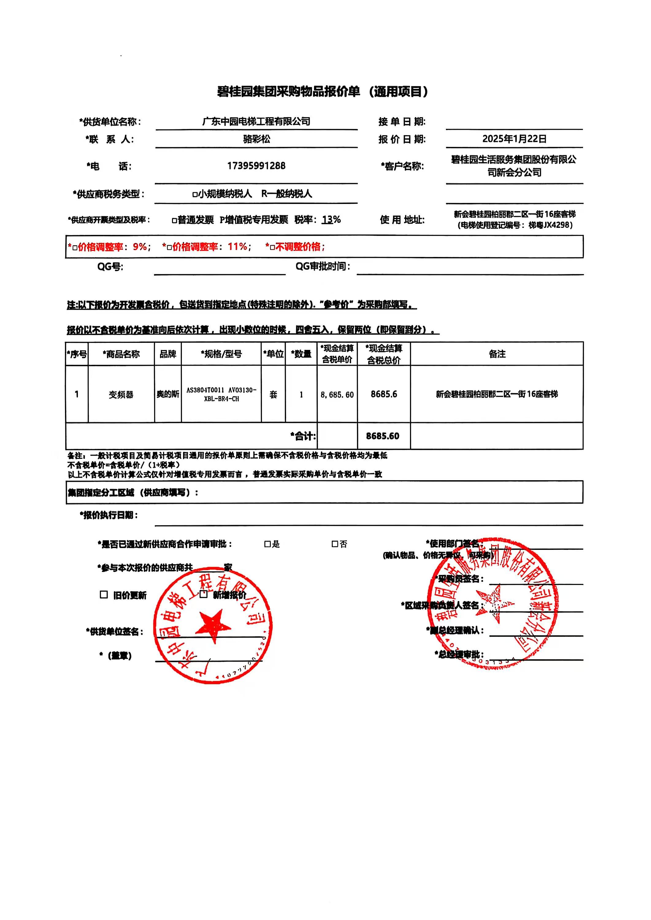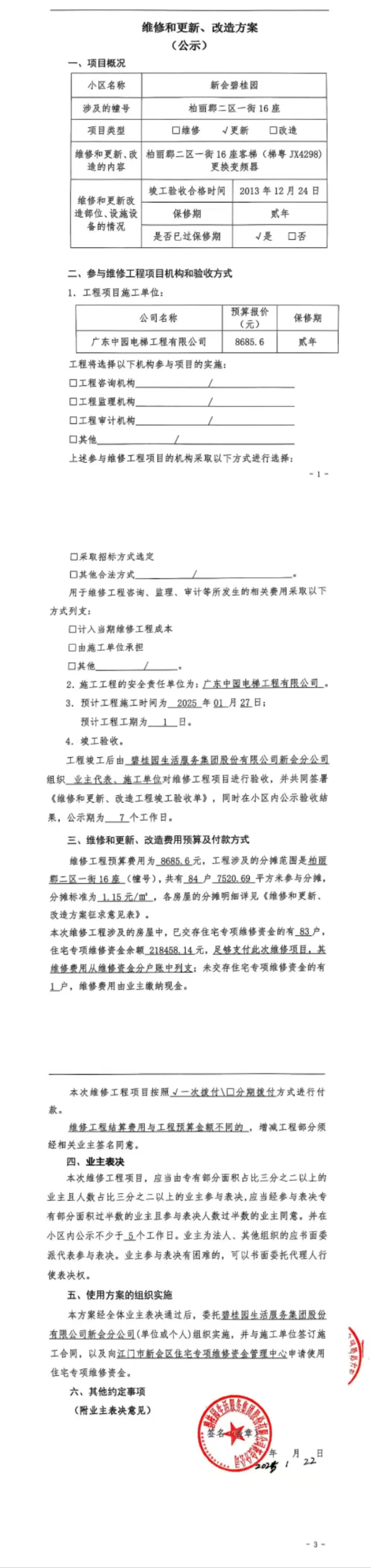 <td VALIGN="top" VALUES="" STYLE="border-width:0" BINDTYPE="0" ROWSPAN="19" COLSPAN="7" DATASOURCE="投票结果" ><font style="font-size:14pt;"><p style="white-space: normal; font-family: 宋体; line-height: 1.75em;">新会碧桂园柏丽郡二区一街16座全体业主:</p><p style="white-space: normal; font-family: 宋体; line-height: 1.75em; text-indent: 2em;">本小区关于新会碧桂园柏丽郡二区一街16座客梯(梯粤JX4298)更换变频器使用维修资金的投票的投票已表决结束,询异时间从2025年01月26日开始,投票询异公示期间,业主可通过微信查询自己的表决情况或可凭身份证件申请查询自己的表决情况;如公示的业主表决情况与查询的本人表决意见不一致的,可以以书面形式向投票组织机构申诉,投票组织机构予以纠正并重新公示表决结果。异议提出人对投票组织机构的处理仍有异议的,可以向街道办事处(镇人民政府)反映处理,涉及住宅专项维修资金的,可向属地住宅专项维修资金管理中心反映处理。</p><p style="white-space: normal;"><br/></p><p style="white-space: normal; font-family: 宋体; line-height: 1.75em;"><strong>附件:</strong></p><p style="white-space: normal; font-family: 宋体; line-height: 1.75em;"><strong>一、投票范围</strong></p><p style="white-space: normal; font-family: 宋体; line-height: 1.75em; text-indent: 2em;">新会碧桂园柏丽郡二区一街16座</p><p style="white-space: normal; font-family: 宋体; line-height: 1.75em; text-indent: 2em;">总人数(专有部分人数之和):82</p><p style="white-space: normal; font-family: 宋体; line-height: 1.75em; text-indent: 2em;"><span style="font-family: 宋体, SimSun;"><span style="font-family: 宋体; text-indent: 32px;"><span style="font-family: 宋体; text-indent: 32px;">总户数:84</span></span></span></p><p style="white-space: normal; font-family: 宋体; line-height: 1.75em; text-indent: 2em;">建筑物总面积(专有部分面积之和):7520.69㎡</p><p style="white-space: normal; font-family: 宋体; line-height: 1.75em;"><strong>二、询异公示起止时间</strong></p><p dir="ltr" style="white-space: normal; font-family: 宋体; line-height: 1.75em; text-indent: 2em;"><span style="text-indent: 36px;">2025年01月26日至2025年02月05日</span></p><p style="white-space: normal; font-family: 宋体; line-height: 1.75em;"><strong>三、投票详细描述</strong></p><p style="white-space: normal; font-family: 宋体; line-height: 1.75em; text-indent: 2em;"><p>新会碧桂园柏丽郡二区一街16座客梯(梯粤JX4298)变频器出现异常,导致电梯会突然停止状态。经检查,是客梯变频器损坏,已过保修期。现申请使用维修资金对新会碧桂园柏丽郡二区一街16座客梯(梯粤JX4298)变频器进行更换,工程维修预算约8685.6元,项目最终费用以施工合同签订为准,维修费用的分摊标准按建筑面积分摊,每平方约1.15元,详见公示,如果有业主手机不能正常通过微信投票的,请联系物业公司进行线下纸质投票,物业电话17308202882许秀珠.</p></p><p style="white-space: normal; font-family: 宋体; line-height: 1.75em;"><strong>四、计票规则</strong></p><p style="white-space: normal; font-family: 宋体; line-height: 1.75em; text-indent: 2em;">表决事项:使用建筑物及其附属设施的维修资金<br /><p style='text-align: left; font-family: 宋体; font-size: 16px; line-height: 1.75em; text-indent: 2em;'>计票规则:弃权票不并入其它项 未表决票不并入其它项</p></p><p style="white-space: normal; font-family: 宋体; line-height: 1.75em;"><strong>五、通过规则</strong></p><p style="white-space: normal; font-family: 宋体; line-height: 1.75em;"><strong><strong style="white-space: normal;"><span style="font-family: 宋体, SimSun;"> 根据《中华人民共和国民法典》第二百七十八条规定:业主共同决定事项,应当由专有部分面积占比三分之二以上的业主且人数占比三分之二以上的业主参与表决。</span></strong></strong></p><p style="white-space: normal; font-family: 宋体; line-height: 1.75em; text-indent: 2em;">表决事项:使用建筑物及其附属设施的维修资金<br /><p style='text-align: left; font-family: 宋体; font-size: 16px; line-height: 1.75em; text-indent: 2em;'>通过规则:双2/3以上参与表决,参与表决双过半同意</p></p><p style="white-space: normal; font-family: 宋体; line-height: 1.75em;"><strong>六、投票结果</strong></p><p style="white-space: normal; font-family: 宋体; line-height: 1.75em; text-indent: 2em;"><div id='resultTable'><table style='table-layout: fixed; font-size:12px; margin-top:10px' width='100%' border='0' cellspacing='0' cellpadding='0'><tr><td height='28' colspan='10' align='center' style='border: 1px solid #666'><strong style='font-size: 14px;'> 使用建筑物及其附属设施的维修资金</strong></td> </tr><tr id='trfirst'><td height='28' colspan='4' style='border-left: 1px solid #666; border-bottom: 1px solid #666'><strong> 申报单位:</strong> 碧桂园生活服务集团股份有限公司新会分公司</td><td colspan='3' style='border-left: 1px solid #666; border-bottom: 1px solid #666'><strong> 联系方式:</strong> </td><td colspan='3' style='border-left: 1px solid #666; border-bottom: 1px solid #666; border-right: 1px solid #666'><strong> 申报日期:</strong> 2025年1月24日 </td></tr><tr> <td height='28' colspan='5' style='border-left: 1px solid #666; border-bottom: 1px solid #666'><strong> 总人数(专有部分人数之和):</strong>82人 </td><td colspan='5' style='border-left: 1px solid #666; border-bottom: 1px solid #666; border-right: 1px solid #666'><strong> 建筑物总面积(专有部分面积之和):</strong>7520.69㎡ </td> </tr><tr><td height='28' colspan='10' bgcolor='#F3F3F3' style='border-left: 1px solid #666;border-bottom: 1px solid #666;border-right: 1px solid #666'><st
