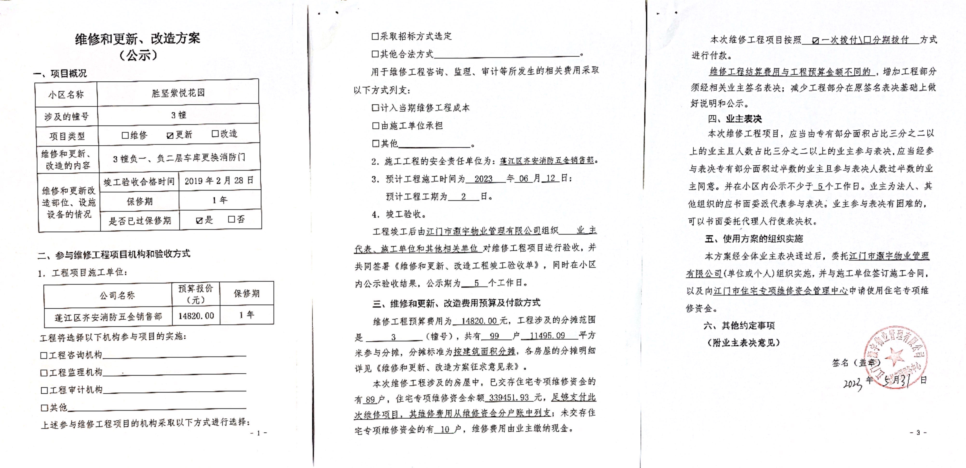 <td valign="top" values="" style="border-width:0" bindtype="0" rowspan="17" colspan="7" datasource="投票结果"><font style=" font-family:方正小标宋简体;font-size:14pt;"><p style="line-height: 1.75em;"><span style="font-family: 宋体, SimSun;">各位尊敬的业主:</span><br></p><p style="text-indent: 2em; line-height: 1.75em;"><span style="font-family: 宋体, SimSun;">根据法律法规的规定,本小区业主利用“物业公共事务决策系统”已对本小区公共事务决策事项进行了表决,在经过7日的询异公示期后,未收到业主有效的异议。现将投票结果公告,并就产生的法律效力说明如下:</span></p><p style="line-height: 1.75em; text-indent: 0em;"><strong style="text-indent: 2em;"><span style="font-family: 宋体, SimSun;">一、投票范围</span></strong></p><p style="text-indent: 2em; line-height: 1.75em;"><span style="font-family: 宋体, SimSun;">蓬江区胜坚紫悦花园蓬江区胜坚紫悦花园3幢</span></p><p style="text-indent: 2em; line-height: 1.75em;"><span style="font-family: 宋体, SimSun;">总人数(专有部分人数之和):90</span></p><p style="text-indent: 2em; line-height: 1.75em;"><span style="font-family: 宋体, SimSun;"><span style="font-family: 宋体, SimSun; text-indent: 32px;">总户数:99</span></span></p><p style="text-indent: 2em; line-height: 1.75em;"><span style="font-family: 宋体, SimSun;">建筑物总面积(专有部分面积之和):11495.09㎡</span></p><p style="line-height: 1.75em;"><strong><span style="font-family: 宋体, SimSun;">二、投票起止时间</span></strong></p><p style="text-indent: 2em; line-height: 1.75em;"><span style="font-family: 宋体, SimSun;">投票表决时间:从2023年06月01日到2023年06月05日止</span></p><p style="text-indent: 2em; line-height: 1.75em;"><span style="font-family: 宋体, SimSun;">投票询异公示时间:从2023年06月06日开始</span></p><p style="text-indent: 2em; line-height: 1.75em;"><span style="font-family: 宋体, SimSun;">投票结果通知公告时间:从2023年06月13日开始</span></p><p style="line-height: 1.75em;"><strong><span style="font-family: 宋体, SimSun;">三、计票规则</span></strong></p><p style="text-indent: 2em; line-height: 1.75em;"><span style="font-family: 宋体, SimSun;">表决事项:使用建筑物及其附属设施的维修资金<br></span></p><p style="font-family: 宋体, SimSun;line-height: 1.75em; text-indent: 2em;">计票规则:弃权票不并入其它项 未表决票不并入其它项</p><p></p><p style="line-height: 1.75em;"><strong><span style="font-family: 宋体, SimSun;">四、通过规则</span></strong></p><p style="text-indent: 2em; line-height: 1.75em;"><span style="font-family: 宋体, SimSun;"><span style="font-family: 宋体, SimSun; text-indent: 32px;">表决事项:使用建筑物及其附属设施的维修资金<br></span></span></p><p style="font-family: 宋体, SimSun;line-height: 1.75em; text-indent: 2em;">通过规则:参与表决专有部分面积过半数的业主且参与表决人数过半数的业主同意</p><p></p><p style="line-height: 1.75em;"><strong><span style="font-family: 宋体, SimSun;">五、投票结果</span></strong></p><p style="line-height: 1.75em; text-indent: 2em;"><span style="font-family: 宋体, SimSun; text-indent: 2em;"></span></p><div id="resultTable"><table style="table-layout: fixed; font-size:12px; margin-top:10px" width="100%" border="0" cellspacing="0" cellpadding="0"><tbody><tr><td height="28" colspan="10" align="center" style="border: 1px solid #666"><strong style="font-size: 14px;"> 使用建筑物及其附属设施的维修资金</strong></td> </tr><tr id="trfirst"><td height="28" colspan="4" style="border-left: 1px solid #666; border-bottom: 1px solid #666"><strong> 申报单位:</strong> 江门市灏宇物业管理有限公司</td><td colspan="3" style="border-left: 1px solid #666; border-bottom: 1px solid #666"><strong> 联系方式:</strong> </td><td colspan="3" style="border-left: 1px solid #666; border-bottom: 1px solid #666; border-right: 1px solid #666"><strong> 申报日期:</strong> 2023年5月31日 </td></tr><tr> <td height="28" colspan="5" style="border-left: 1px solid #666; border-bottom: 1px solid #666"><strong> 总人数(专有部分人数之和):</strong>90人 </td><td colspan="5" style="border-left: 1px solid #666; border-bottom: 1px solid #666; border-right: 1px solid #666"><strong> 建筑物总面积(专有部分面积之和):</strong>11495.09㎡ </td> </tr><tr><td height="28" colspan="10" bgcolor="#F3F3F3" style="border-left: 1px solid #666;border-bottom: 1px solid #666;border-right: 1px solid #666"><strong> 参与人数及面积统计</strong></td></tr><tr><td height="28" colspan="5" style="border-left: 1px solid #666; border-bottom: 1px solid #666"><strong> 参与表决专有部分人数之和:</strong>69人</td><td colspan="5" style="border-left: 1px solid #666; border-bottom: 1px solid #666; border-right: 1px solid #666"><strong> 参与表决占有表决权总人数比例:</strong>76.67%</td></tr><tr><td height="28" colspan="5" style="border-left: 1px solid #666; border-bottom: 1px solid #666"><strong> 参与表决专有部分面积之和:</strong>7954.69㎡</td><td colspan="5" style="border-left: 1px solid #666; border-bottom: 1px solid #666; border-right: 1px solid #666"><strong> 参与表决占有表决权总面积比例:</strong>69.20%</td></tr><tr><td height="28" colspan="10" bgcolor="#F3F3F3" style="border-left: 1px solid #666; border-bottom: 1px solid #666;border-right: 1px solid #666"> <strong> 未参与人数及面积统计</strong></td> </tr><tr><td height="28" colspan="5" style="border-left: 1px solid #666; border-bottom: 1px solid #666"><strong> 未参与表决专有部分人数之和:</strong>21人 </td><td colspan="5" style="border-left: 1px solid #666; border-bottom: 1px solid #666; border-right: 1px solid #666"><strong> 未参与表决占有表决权总人数比例:</strong>23.33%</td></tr><t