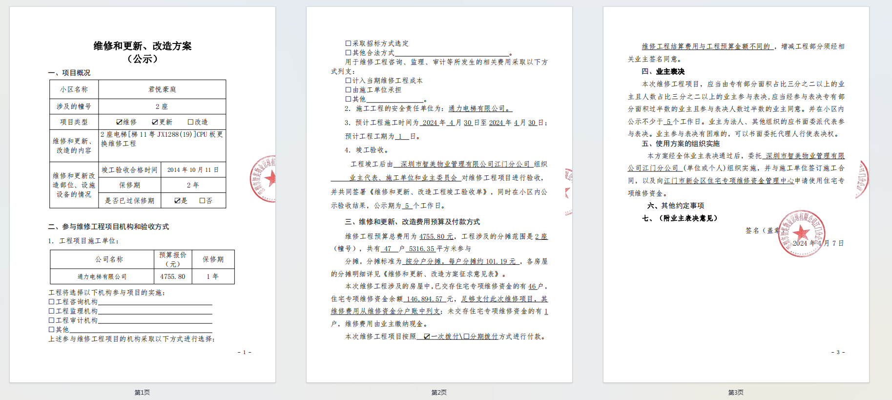 <td VALIGN="top" VALUES="" STYLE="border-width:0" BINDTYPE="0" ROWSPAN="19" COLSPAN="7" DATASOURCE="投票结果" ><font style="font-size:14pt;"><p style="white-space: normal; font-family: 宋体; line-height: 1.75em;">君悦豪庭君悦豪庭2座全体业主:</p><p style="white-space: normal; font-family: 宋体; line-height: 1.75em; text-indent: 2em;">本小区关于君悦豪庭2座电梯[梯11粤JX1288(19)]CPU板更换工程使用维修资金的投票的投票已表决结束,询异时间从2024年04月16日开始,投票询异公示期间,业主可通过微信查询自己的表决情况或可凭身份证件申请查询自己的表决情况;如公示的业主表决情况与查询的本人表决意见不一致的,可以以书面形式向投票组织机构申诉,投票组织机构予以纠正并重新公示表决结果。异议提出人对投票组织机构的处理仍有异议的,可以向街道办事处(镇人民政府)反映处理,涉及住宅专项维修资金的,可向属地住宅专项维修资金管理中心反映处理。</p><p style="white-space: normal;"><br/></p><p style="white-space: normal; font-family: 宋体; line-height: 1.75em;"><strong>附件:</strong></p><p style="white-space: normal; font-family: 宋体; line-height: 1.75em;"><strong>一、投票范围</strong></p><p style="white-space: normal; font-family: 宋体; line-height: 1.75em; text-indent: 2em;">君悦豪庭君悦豪庭2座</p><p style="white-space: normal; font-family: 宋体; line-height: 1.75em; text-indent: 2em;">总人数(专有部分人数之和):46</p><p style="white-space: normal; font-family: 宋体; line-height: 1.75em; text-indent: 2em;"><span style="font-family: 宋体, SimSun;"><span style="font-family: 宋体; text-indent: 32px;"><span style="font-family: 宋体; text-indent: 32px;">总户数:47</span></span></span></p><p style="white-space: normal; font-family: 宋体; line-height: 1.75em; text-indent: 2em;">建筑物总面积(专有部分面积之和):5316.35㎡</p><p style="white-space: normal; font-family: 宋体; line-height: 1.75em;"><strong>二、询异公示起止时间</strong></p><p dir="ltr" style="white-space: normal; font-family: 宋体; line-height: 1.75em; text-indent: 2em;"><span style="text-indent: 36px;">2024年04月16日至2024年04月22日</span></p><p style="white-space: normal; font-family: 宋体; line-height: 1.75em;"><strong>三、投票详细描述</strong></p><p style="white-space: normal; font-family: 宋体; line-height: 1.75em; text-indent: 2em;"><p>小区2座电梯[梯11粤JX1288(19)]出现停止运行现象,经检查是由于CPU板故障导致,因使用时间较长,电子原件出现老化而不能正常运行。现对2座电梯[梯11粤JX1288(19)]CPU板进行更换,工程预算金额为4755.80元,项目最终费用以施工合同签订金额为准。因已过保修期,维修费用由相关业主按分户分摊,每户约101.19元,详见公示附件。如业主手机不能正常通过微信投票,请联系物业公司进行线下纸质投票,物业电话:13555625107,管家电话:18128218709</p></p><p style="white-space: normal; font-family: 宋体; line-height: 1.75em;"><strong>四、计票规则</strong></p><p style="white-space: normal; font-family: 宋体; line-height: 1.75em; text-indent: 2em;">表决事项:使用建筑物及其附属设施的维修资金<br /><p style='text-align: left; font-family: 宋体; font-size: 16px; line-height: 1.75em; text-indent: 2em;'>计票规则:弃权票不并入其它项 未表决票不并入其它项</p></p><p style="white-space: normal; font-family: 宋体; line-height: 1.75em;"><strong>五、通过规则</strong></p><p style="white-space: normal; font-family: 宋体; line-height: 1.75em;"><strong><strong style="white-space: normal;"><span style="font-family: 宋体, SimSun;"> 根据《中华人民共和国民法典》第二百七十八条规定:业主共同决定事项,应当由专有部分面积占比三分之二以上的业主且人数占比三分之二以上的业主参与表决。</span></strong></strong></p><p style="white-space: normal; font-family: 宋体; line-height: 1.75em; text-indent: 2em;">表决事项:使用建筑物及其附属设施的维修资金<br /><p style='text-align: left; font-family: 宋体; font-size: 16px; line-height: 1.75em; text-indent: 2em;'>通过规则:双2/3以上参与表决,参与表决双过半同意</p></p><p style="white-space: normal; font-family: 宋体; line-height: 1.75em;"><strong>六、投票结果</strong></p><p style="white-space: normal; font-family: 宋体; line-height: 1.75em; text-indent: 2em;"><div id='resultTable'><table style='table-layout: fixed; font-size:12px; margin-top:10px' width='100%' border='0' cellspacing='0' cellpadding='0'><tr><td height='28' colspan='10' align='center' style='border: 1px solid #666'><strong style='font-size: 14px;'> 使用建筑物及其附属设施的维修资金</strong></td> </tr><tr id='trfirst'><td height='28' colspan='4' style='border-left: 1px solid #666; border-bottom: 1px solid #666'><strong> 申报单位:</strong> 深圳市智美物业管理有限公司江门分公司</td><td colspan='3' style='border-left: 1px solid #666; border-bottom: 1px solid #666'><strong> 联系方式:</strong> </td><td colspan='3' style='border-left: 1px solid #666; border-bottom: 1px solid #666; border-right: 1px solid #666'><strong> 申报日期:</strong> 2024年4月7日 </td></tr><tr> <td height='28' colspan='5' style='border-left: 1px solid #666; border-bottom: 1px solid #666'><strong> 总人数(专有部分人数之和):</strong>46人 </td><td colspan='5' style='border-left: 1px solid #666; border-bottom: 1px solid #666; border-right: 1px solid #666'><strong> 建筑物总面积(专有部分面积之和):</strong>5316.35㎡ </td> </tr><tr><td height='28' colspan='10' bgcolor='#F3F3F3' style='border-left: 1px solid #666;border-bottom: 1px solid #666;border-right: 1px solid #666'><strong> 参与人数及面积统计</strong></td></tr><tr><td height='28' col