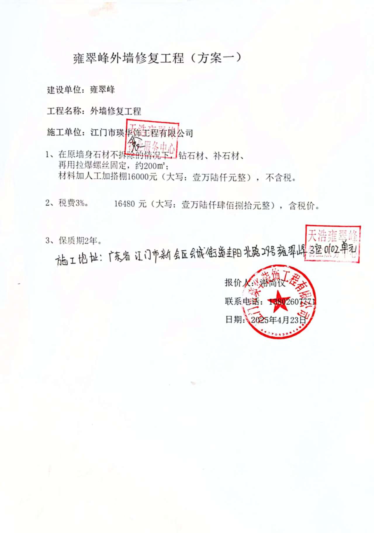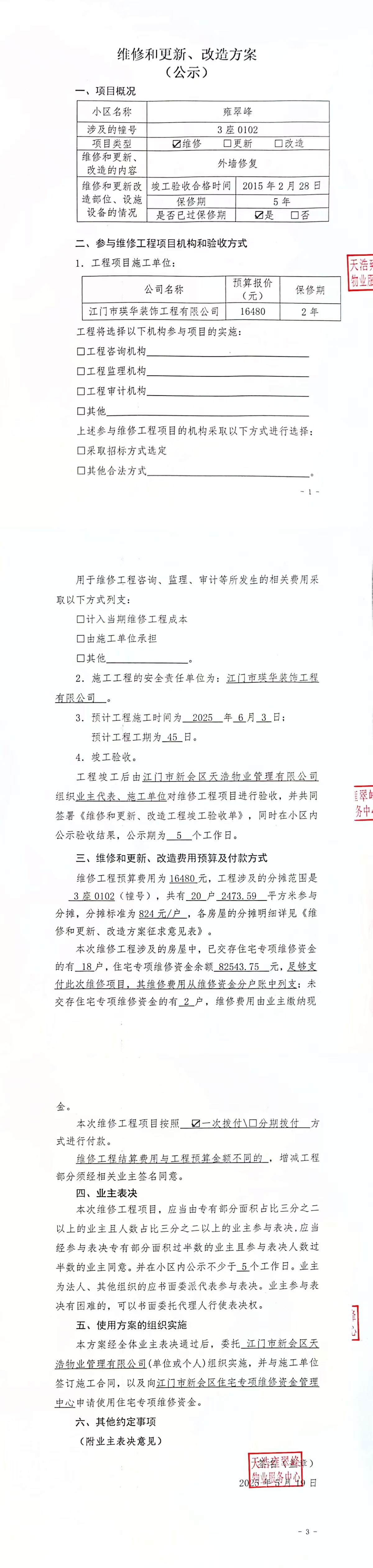 <td VALIGN="top" VALUES="" STYLE="border-width:0" BINDTYPE="0" ROWSPAN="19" COLSPAN="7" DATASOURCE="投票结果" ><font style="font-size:14pt;"><p style="white-space: normal; font-family: 宋体; line-height: 1.75em;">雍翠峰雍翠峰3座全体业主:</p><p style="white-space: normal; font-family: 宋体; line-height: 1.75em; text-indent: 2em;">本小区关于雍翠峰3座0102单元外墙修复使用维修资金的投票的投票已表决结束,询异时间从2025年05月22日开始,投票询异公示期间,业主可通过微信查询自己的表决情况或可凭身份证件申请查询自己的表决情况;如公示的业主表决情况与查询的本人表决意见不一致的,可以以书面形式向投票组织机构申诉,投票组织机构予以纠正并重新公示表决结果。异议提出人对投票组织机构的处理仍有异议的,可以向街道办事处(镇人民政府)反映处理,涉及住宅专项维修资金的,可向属地住宅专项维修资金管理中心反映处理。</p><p style="white-space: normal;"><br/></p><p style="white-space: normal; font-family: 宋体; line-height: 1.75em;"><strong>附件:</strong></p><p style="white-space: normal; font-family: 宋体; line-height: 1.75em;"><strong>一、投票范围</strong></p><p style="white-space: normal; font-family: 宋体; line-height: 1.75em; text-indent: 2em;">雍翠峰雍翠峰3座</p><p style="white-space: normal; font-family: 宋体; line-height: 1.75em; text-indent: 2em;">总人数(专有部分人数之和):20</p><p style="white-space: normal; font-family: 宋体; line-height: 1.75em; text-indent: 2em;"><span style="font-family: 宋体, SimSun;"><span style="font-family: 宋体; text-indent: 32px;"><span style="font-family: 宋体; text-indent: 32px;">总户数:20</span></span></span></p><p style="white-space: normal; font-family: 宋体; line-height: 1.75em; text-indent: 2em;">建筑物总面积(专有部分面积之和):2473.59㎡</p><p style="white-space: normal; font-family: 宋体; line-height: 1.75em;"><strong>二、询异公示起止时间</strong></p><p dir="ltr" style="white-space: normal; font-family: 宋体; line-height: 1.75em; text-indent: 2em;"><span style="text-indent: 36px;">2025年05月22日至2025年06月01日</span></p><p style="white-space: normal; font-family: 宋体; line-height: 1.75em;"><strong>三、投票详细描述</strong></p><p style="white-space: normal; font-family: 宋体; line-height: 1.75em; text-indent: 2em;"><table class="formGrid" width="1730" style="width: 750px;"><tbody><tr class="firstRow"><td colspan="3" style="border-left-style: dotted; border-left-color: rgb(212, 212, 212); border-bottom-color: rgb(212, 212, 212); padding: 0px; max-width: 1000px; overflow-wrap: break-word;"><p> 雍翠峰3座0102单元前阳台外墙大理石脱落存在较大安全隐患,已过保修期。</p><p> 现需申请使用维修资金对3座0102单元<span style="text-wrap: wrap;"><span style="text-wrap: wrap;">前阳台外墙</span></span>进行修复,工程维修预算金额为16480元,项目最终费用以施工合同签订金额为准。维修费用的分摊标准为按分户分摊,每户分摊824元,详见公示附件。如业主不能正常通过微信投票,请联系物业公司进行线下纸质投票,物业电话:0750-6125500</p></td></tr></tbody></table><p><br/></p></p><p style="white-space: normal; font-family: 宋体; line-height: 1.75em;"><strong>四、计票规则</strong></p><p style="white-space: normal; font-family: 宋体; line-height: 1.75em; text-indent: 2em;">表决事项:使用建筑物及其附属设施的维修资金<br /><p style='text-align: left; font-family: 宋体; font-size: 16px; line-height: 1.75em; text-indent: 2em;'>计票规则:弃权票不并入其它项 未表决票不并入其它项</p></p><p style="white-space: normal; font-family: 宋体; line-height: 1.75em;"><strong>五、通过规则</strong></p><p style="white-space: normal; font-family: 宋体; line-height: 1.75em;"><strong><strong style="white-space: normal;"><span style="font-family: 宋体, SimSun;"> 根据《中华人民共和国民法典》第二百七十八条规定:业主共同决定事项,应当由专有部分面积占比三分之二以上的业主且人数占比三分之二以上的业主参与表决。</span></strong></strong></p><p style="white-space: normal; font-family: 宋体; line-height: 1.75em; text-indent: 2em;">表决事项:使用建筑物及其附属设施的维修资金<br /><p style='text-align: left; font-family: 宋体; font-size: 16px; line-height: 1.75em; text-indent: 2em;'>通过规则:双2/3以上参与表决,参与表决双过半同意</p></p><p style="white-space: normal; font-family: 宋体; line-height: 1.75em;"><strong>六、投票结果</strong></p><p style="white-space: normal; font-family: 宋体; line-height: 1.75em; text-indent: 2em;"><div id='resultTable'><table style='table-layout: fixed; font-size:12px; margin-top:10px' width='100%' border='0' cellspacing='0' cellpadding='0'><tr><td height='28' colspan='10' align='center' style='border: 1px solid #666'><strong style='font-size: 14px;'> 使用建筑物及其附属设施的维修资金</strong></td> </tr><tr id='trfirst'><td height='28' colspan='4' style='border-left: 1px solid #666; border-bottom: 1px solid #666'><strong> 申报单位:</strong> 江门市新会区天浩物业管理有限公司</td><td colspan='3' style='border-left: 1px solid #666; border-bottom: 1px solid #666'><strong> 联系方式:</strong> </td><td colspan='3' style='border-left: 1px solid #666; border-bottom: 1px solid #666; border-right: 1px solid #666'><strong> 申报日期:</strong> 2025年5月8日 </td></tr><tr> <td height='28' colspan='5' style='border-left: 1px solid #666; border-bottom: 1px solid #666'><strong> 总人数(专有部分人数之和):</strong>20人 </td><td colspan='5' style='border-left: 1px solid #666; border-bottom: 1px solid #666; border-right: 1px solid #666'><strong> 建筑物总面积(专有部分面