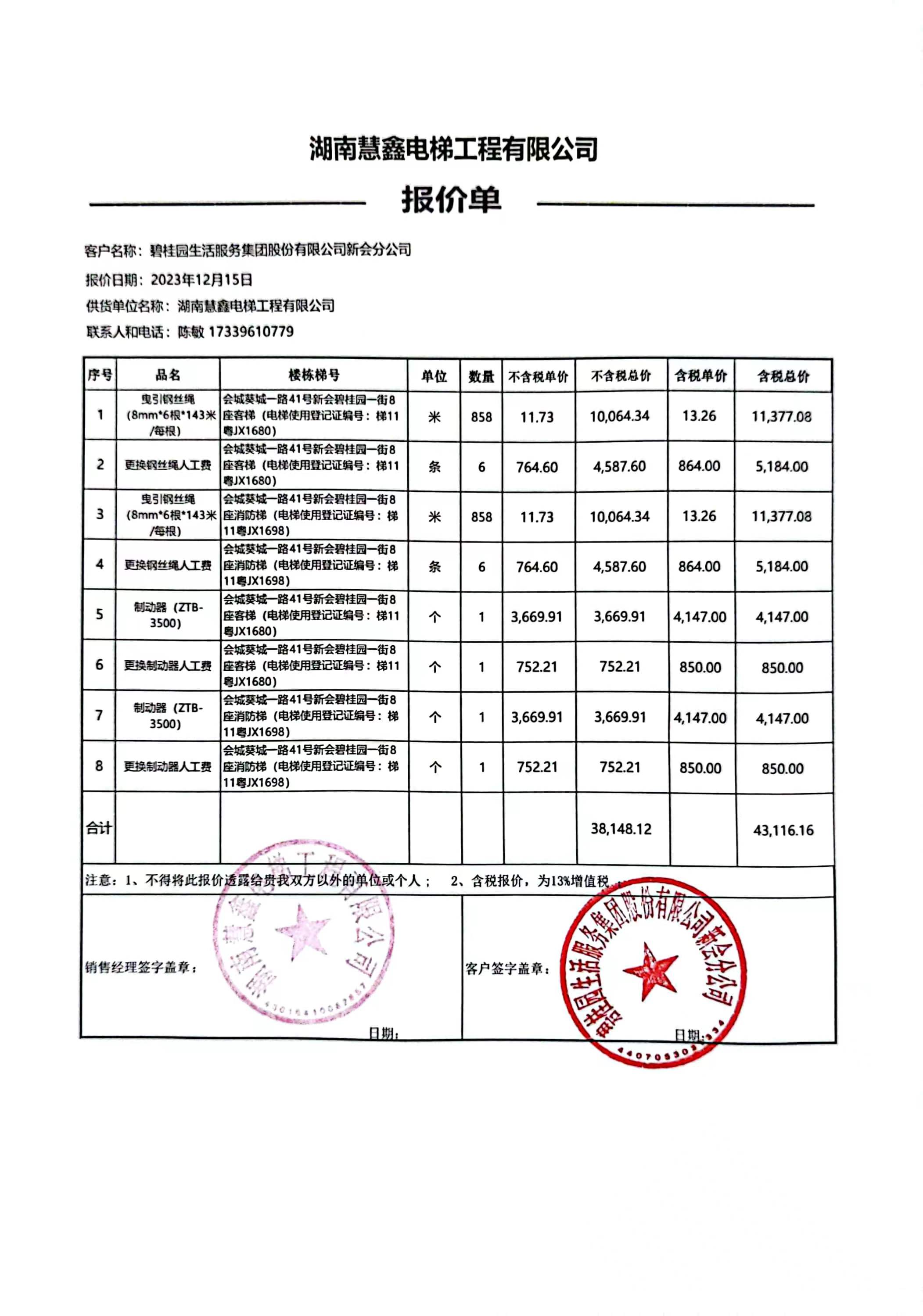 <td VALIGN="top" VALUES="" STYLE="border-width:0" BINDTYPE="0" ROWSPAN="19" COLSPAN="7" DATASOURCE="投票结果" ><font style="font-size:14pt;"><p style="white-space: normal; font-family: 宋体; line-height: 1.75em;">新会碧桂园葵城一路41号01街08座全体业主:</p><p style="white-space: normal; font-family: 宋体; line-height: 1.75em; text-indent: 2em;">本小区关于新会碧桂园会城葵城一路41号新会碧桂园一街8座客梯、消防梯更换钢丝绳和制动器使用维修资金的投票的投票已表决结束,询异时间从2024年04月01日开始,投票询异公示期间,业主可通过微信查询自己的表决情况或可凭身份证件申请查询自己的表决情况;如公示的业主表决情况与查询的本人表决意见不一致的,可以以书面形式向投票组织机构申诉,投票组织机构予以纠正并重新公示表决结果。异议提出人对投票组织机构的处理仍有异议的,可以向街道办事处(镇人民政府)反映处理,涉及住宅专项维修资金的,可向属地住宅专项维修资金管理中心反映处理。</p><p style="white-space: normal;"><br/></p><p style="white-space: normal; font-family: 宋体; line-height: 1.75em;"><strong>附件:</strong></p><p style="white-space: normal; font-family: 宋体; line-height: 1.75em;"><strong>一、投票范围</strong></p><p style="white-space: normal; font-family: 宋体; line-height: 1.75em; text-indent: 2em;">新会碧桂园葵城一路41号01街08座</p><p style="white-space: normal; font-family: 宋体; line-height: 1.75em; text-indent: 2em;">总人数(专有部分人数之和):36</p><p style="white-space: normal; font-family: 宋体; line-height: 1.75em; text-indent: 2em;"><span style="font-family: 宋体, SimSun;"><span style="font-family: 宋体; text-indent: 32px;"><span style="font-family: 宋体; text-indent: 32px;">总户数:36</span></span></span></p><p style="white-space: normal; font-family: 宋体; line-height: 1.75em; text-indent: 2em;">建筑物总面积(专有部分面积之和):4997.50㎡</p><p style="white-space: normal; font-family: 宋体; line-height: 1.75em;"><strong>二、询异公示起止时间</strong></p><p dir="ltr" style="white-space: normal; font-family: 宋体; line-height: 1.75em; text-indent: 2em;"><span style="text-indent: 36px;">2024年04月01日至2024年04月07日</span></p><p style="white-space: normal; font-family: 宋体; line-height: 1.75em;"><strong>三、投票详细描述</strong></p><p style="white-space: normal; font-family: 宋体; line-height: 1.75em; text-indent: 2em;"><p>新会碧桂园会城葵城一路41号新会碧桂园一街8座客梯、<span style="text-wrap: wrap;">消防梯</span>因钢丝绳和制动器存在安全隐患,现需更换客梯、消防梯钢丝绳和制动器。现申请使用维修资金对新会碧桂园会城葵城一路41号新会碧桂园一街<span style="text-wrap: wrap;">8座客梯、</span><span style="text-wrap: wrap;">消防梯</span>更换钢丝绳和制动器,工程维修预算约43116.16元,项目最终费用以施工合同签订为准,维修费用的分摊标准按建筑面积分摊,每平方约8.63元,详见公示,如果有业主手机不能正常通过微信投票的,请联系物业公司进行线下纸质投票,物业电话17308202884. </p></p><p style="white-space: normal; font-family: 宋体; line-height: 1.75em;"><strong>四、计票规则</strong></p><p style="white-space: normal; font-family: 宋体; line-height: 1.75em; text-indent: 2em;">表决事项:使用建筑物及其附属设施的维修资金<br /><p style='text-align: left; font-family: 宋体; font-size: 16px; line-height: 1.75em; text-indent: 2em;'>计票规则:弃权票不并入其它项 未表决票不并入其它项</p></p><p style="white-space: normal; font-family: 宋体; line-height: 1.75em;"><strong>五、通过规则</strong></p><p style="white-space: normal; font-family: 宋体; line-height: 1.75em;"><strong><strong style="white-space: normal;"><span style="font-family: 宋体, SimSun;"> 根据《中华人民共和国民法典》第二百七十八条规定:业主共同决定事项,应当由专有部分面积占比三分之二以上的业主且人数占比三分之二以上的业主参与表决。</span></strong></strong></p><p style="white-space: normal; font-family: 宋体; line-height: 1.75em; text-indent: 2em;">表决事项:使用建筑物及其附属设施的维修资金<br /><p style='text-align: left; font-family: 宋体; font-size: 16px; line-height: 1.75em; text-indent: 2em;'>通过规则:双2/3以上参与表决,参与表决双过半同意</p></p><p style="white-space: normal; font-family: 宋体; line-height: 1.75em;"><strong>六、投票结果</strong></p><p style="white-space: normal; font-family: 宋体; line-height: 1.75em; text-indent: 2em;"><div id='resultTable'><table style='table-layout: fixed; font-size:12px; margin-top:10px' width='100%' border='0' cellspacing='0' cellpadding='0'><tr><td height='28' colspan='10' align='center' style='border: 1px solid #666'><strong style='font-size: 14px;'> 使用建筑物及其附属设施的维修资金</strong></td> </tr><tr id='trfirst'><td height='28' colspan='4' style='border-left: 1px solid #666; border-bottom: 1px solid #666'><strong> 申报单位:</strong> 碧桂园生活服务集团股份有限公司新会分公司</td><td colspan='3' style='border-left: 1px solid #666; border-bottom: 1px solid #666'><strong> 联系方式:</strong> </td><td colspan='3' style='border-left: 1px solid #666; border-bottom: 1px solid #666; border-right: 1px solid #666'><strong> 申报日期:</strong> 2024年2月7日 </td></tr><tr> <td height='28' colspan='5' style='border-left: 1px solid #666; border-bottom: 1px solid #666'><strong> 总人数(专有部分人数之和):</strong>36人 </td><td colspan='5' style='border-left: 1px solid #666; border-bottom: 1px solid #666; border-right: 1px solid #666'><strong> 建筑物总面积(专有部分面积之和):</stron
