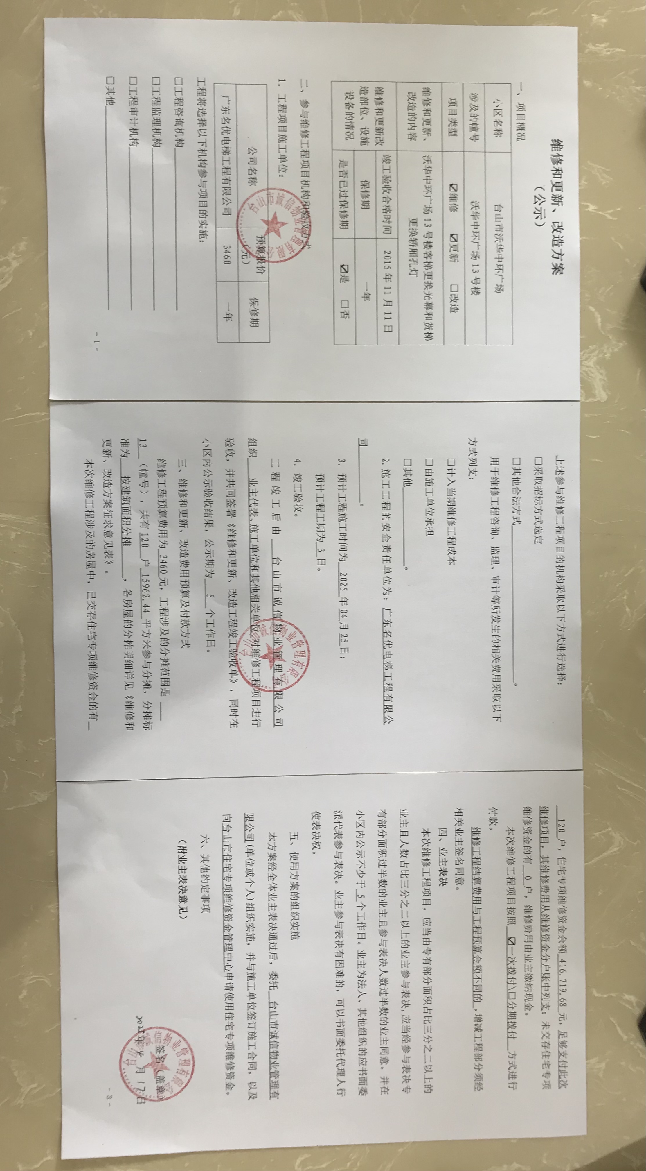 <td VALIGN="top" VALUES="" STYLE="border-width:0" BINDTYPE="0" ROWSPAN="17" COLSPAN="7" DATASOURCE="投票结果" ><font style=" font-family:方正小标宋简体;font-size:14pt;"><p style="line-height: 1.75em;"><span style="font-family: 宋体, SimSun;">各位尊敬的业主:</span><br/></p><p style="text-indent: 2em; line-height: 1.75em;"><span style="font-family: 宋体, SimSun;">根据法律法规的规定,本小区业主利用“江门市物业事项表决管理系统”已对本小区公共事务决策事项(<span style="font-family: 宋体; text-indent: 32px;">沃华中环广场13号楼客梯更换光幕和货梯更换轿厢孔灯使用维修资金投票</span>)进行了表决,在经过7日的询异公示期后,未收到业主有效的异议。现将投票结果公告,并就产生的法律效力说明如下:</span></p><p style="line-height: 1.75em; text-indent: 0em;"><strong style="text-indent: 2em;"><span style="font-family: 宋体, SimSun;">一、投票范围</span></strong></p><p style="text-indent: 2em; line-height: 1.75em;"><span style="font-family: 宋体, SimSun;">台山沃华中环广场台山沃华中环广场13号楼</span></p><p style="text-indent: 2em; line-height: 1.75em;"><span style="font-family: 宋体, SimSun;">总人数(专有部分人数之和):120</span></p><p style="text-indent: 2em; line-height: 1.75em;"><span style="font-family: 宋体, SimSun;"><span style="font-family: 宋体, SimSun; text-indent: 32px;"><span style="font-family: 宋体; text-indent: 32px;"><span style="font-family: 宋体; text-indent: 32px;">总户数:120</span></span></span></span></p><p style="text-indent: 2em; line-height: 1.75em;"><span style="font-family: 宋体, SimSun;">建筑物总面积(专有部分面积之和):15962.44㎡</span></p><p style="line-height: 1.75em;"><strong><span style="font-family: 宋体, SimSun;">二、投票结果公告时间</span></strong></p><p style="text-indent: 2em; line-height: 1.75em;"><span style="font-family: 宋体, SimSun;"><span style="font-family: 宋体, SimSun; text-indent: 32px;">从2025年05月18日开始</span></span></p><p style="line-height: 1.75em;"><strong><span style="font-family: 宋体, SimSun;">三、计票规则</span></strong></p><p style="text-indent: 2em; line-height: 1.75em;"><span style="font-family: 宋体, SimSun;">表决事项:使用建筑物及其附属设施的维修资金<br /><p style='font-family: 宋体, SimSun;line-height: 1.75em; text-indent: 2em;'>计票规则:弃权票不并入其它项&nbsp;&nbsp;&nbsp;&nbsp;未表决票不并入其它项</p></span></p><p style="line-height: 1.75em;"><strong><span style="font-family: 宋体, SimSun;">四、通过规则</span></strong></p><p style="line-height: 1.75em;"><strong><span style="font-family: 宋体, SimSun;">&nbsp; 根据《中华人民共和国民法典》第二百七十八条规定:业主共同决定事项,应当由专有部分面积占比三分之二以上的业主且人数占比三分之二以上的业主参与表决。</span></strong></p><p style="text-indent: 2em; line-height: 1.75em;"><span style="font-family: 宋体, SimSun;"><span style="font-family: 宋体, SimSun; text-indent: 32px;">表决事项:使用建筑物及其附属设施的维修资金<br /><p style='font-family: 宋体, SimSun;line-height: 1.75em; text-indent: 2em;'>通过规则:双2/3以上参与表决,参与表决双过半同意</p></span></span></p><p style="line-height: 1.75em;"><strong><span style="font-family: 宋体, SimSun;">五、投票结果</span></strong></p><p style="line-height: 1.75em; text-indent: 2em;"><span style="font-family: 宋体, SimSun; text-indent: 2em;"><div id='resultTable'><table style='table-layout: fixed; font-size:12px; margin-top:10px' width='100%' border='0' cellspacing='0' cellpadding='0'><tr><td height='28' colspan='10' align='center' style='border: 1px solid #666'><strong style='font-size: 14px;'> 使用建筑物及其附属设施的维修资金</strong></td> </tr><tr id='trfirst'><td height='28' colspan='4' style='border-left: 1px solid #666; border-bottom: 1px solid #666'><strong>&nbsp;申报单位:</strong> 台山市诚信物业管理有限公司</td><td colspan='3' style='border-left: 1px solid #666; border-bottom: 1px solid #666'><strong>&nbsp;联系方式:</strong> 5555819 </td><td colspan='3' style='border-left: 1px solid #666; border-bottom: 1px solid #666; border-right: 1px solid #666'><strong>&nbsp;申报日期:</strong> 2025年4月17日 </td></tr><tr> <td height='28' colspan='5' style='border-left: 1px solid #666; border-bottom: 1px solid #666'><strong>&nbsp;列支总人数(专有部分人数之和):</strong>120人 </td><td colspan='5' style='border-left: 1px solid #666; border-bottom: 1px solid #666; border-right: 1px solid #666'><strong>&nbsp;列支建筑物总面积(专有部分面积之和):</strong>15962.44㎡ </td> </tr><tr><td height='28' colspan='10' bgcolor='#F3F3F3' style='border-left: 1px solid #666;border-bottom: 1px solid #666;border-right: 1px solid #666'><strong>&nbsp;参与表决人数及面积统计</strong></td></tr><tr><td height='28' colspan='5' style='border-left: 1px solid #666; border-bottom: 1px solid #666'><strong>&nbsp;参与表决人数:</strong>85人</td><td colspan='5' style='border-left: 1px solid #666; border-bottom: 1px solid #666; border-right: 1px solid #666'><strong>&nbsp;参与表决人数占总人数比例:</strong>70.83%</td></tr><tr><td height='28' colspan='5' style='border-left: 1px solid #666; border-bottom: 1px solid #666'><strong>&nbsp;参与表决面积:</strong>11143.14㎡</td><td colspan='5' style='border-left: 1px solid #666; border-bottom: 1px solid #666; border-right: 1px solid #666'><strong>&nbsp;参与表决面积占总面积比例:</strong>69.81%</td></tr><tr><td height='28' colspan='10' bgcolor='#F3F3F3' style='border-left: 1px solid #666; border-bottom: 1px solid #666;border-right: 1px solid #666'> <strong>&nbsp;参与表决同意人数及面积统计</strong></td> </tr><tr><td height='28' colspan='