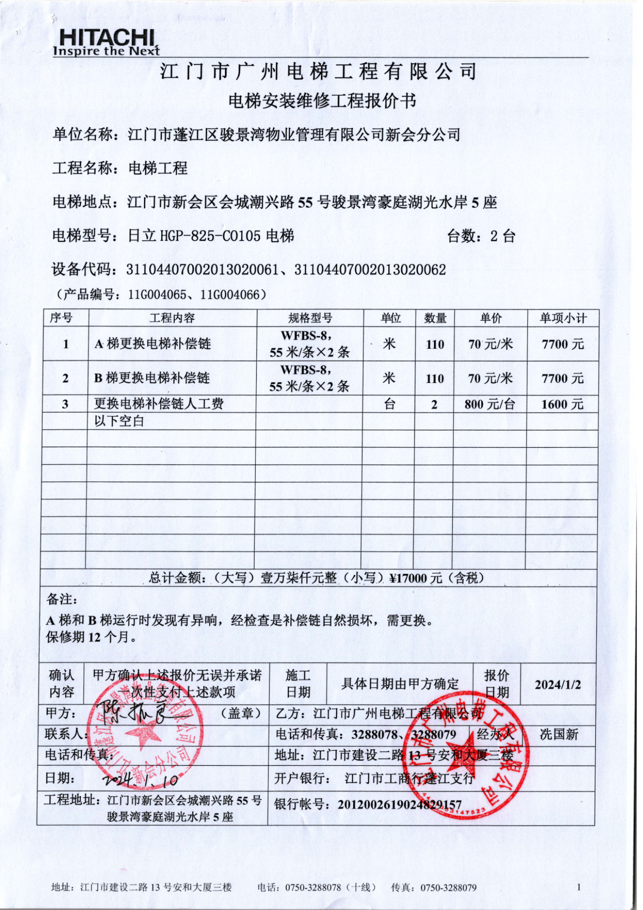 <td VALIGN="top" VALUES="" STYLE="border-width:0" BINDTYPE="0" ROWSPAN="19" COLSPAN="7" DATASOURCE="投票结果" ><font style="font-size:14pt;"><p style="white-space: normal; font-family: 宋体; line-height: 1.75em;">新会骏景湾豪庭湖光水岸5座全体业主:</p><p style="white-space: normal; font-family: 宋体; line-height: 1.75em; text-indent: 2em;">本小区关于湖光水岸5座A、B梯更换补偿链使用维修资金的投票的投票已表决结束,询异时间从2024年02月17日开始,投票询异公示期间,业主可通过微信查询自己的表决情况或可凭身份证件申请查询自己的表决情况;如公示的业主表决情况与查询的本人表决意见不一致的,可以以书面形式向投票组织机构申诉,投票组织机构予以纠正并重新公示表决结果。异议提出人对投票组织机构的处理仍有异议的,可以向街道办事处(镇人民政府)反映处理,涉及住宅专项维修资金的,可向属地住宅专项维修资金管理中心反映处理。</p><p style="white-space: normal;"><br/></p><p style="white-space: normal; font-family: 宋体; line-height: 1.75em;"><strong>附件:</strong></p><p style="white-space: normal; font-family: 宋体; line-height: 1.75em;"><strong>一、投票范围</strong></p><p style="white-space: normal; font-family: 宋体; line-height: 1.75em; text-indent: 2em;">新会骏景湾豪庭湖光水岸5座</p><p style="white-space: normal; font-family: 宋体; line-height: 1.75em; text-indent: 2em;">总人数(专有部分人数之和):60</p><p style="white-space: normal; font-family: 宋体; line-height: 1.75em; text-indent: 2em;"><span style="font-family: 宋体, SimSun;"><span style="font-family: 宋体; text-indent: 32px;"><span style="font-family: 宋体; text-indent: 32px;">总户数:60</span></span></span></p><p style="white-space: normal; font-family: 宋体; line-height: 1.75em; text-indent: 2em;">建筑物总面积(专有部分面积之和):6793.72㎡</p><p style="white-space: normal; font-family: 宋体; line-height: 1.75em;"><strong>二、询异公示起止时间</strong></p><p dir="ltr" style="white-space: normal; font-family: 宋体; line-height: 1.75em; text-indent: 2em;"><span style="text-indent: 36px;">2024年02月17日至2024年02月23日</span></p><p style="white-space: normal; font-family: 宋体; line-height: 1.75em;"><strong>三、投票详细描述</strong></p><p style="white-space: normal; font-family: 宋体; line-height: 1.75em; text-indent: 2em;"><p>本小区湖光水岸5座A、B电梯更换补偿链,存在安全风险,需尽快维修更换,已过保修期。现需申请使用维修资金对湖光水岸5座A、B电梯进行维修,工程维修预算金额为17000元,项目最终费用以施工合同签订金额为准。维修费用的分摊标准为建筑面积分摊,每平方约:2.502310957766879元,详见公示附件。如业主手机不能通过微信投票,请联系物业公司进行线下纸质投票,物业电话:0750-6179992</p></p><p style="white-space: normal; font-family: 宋体; line-height: 1.75em;"><strong>四、计票规则</strong></p><p style="white-space: normal; font-family: 宋体; line-height: 1.75em; text-indent: 2em;">表决事项:使用建筑物及其附属设施的维修资金<br /><p style='text-align: left; font-family: 宋体; font-size: 16px; line-height: 1.75em; text-indent: 2em;'>计票规则:弃权票不并入其它项 未表决票不并入其它项</p></p><p style="white-space: normal; font-family: 宋体; line-height: 1.75em;"><strong>五、通过规则</strong></p><p style="white-space: normal; font-family: 宋体; line-height: 1.75em;"><strong><strong style="white-space: normal;"><span style="font-family: 宋体, SimSun;"> 根据《中华人民共和国民法典》第二百七十八条规定:业主共同决定事项,应当由专有部分面积占比三分之二以上的业主且人数占比三分之二以上的业主参与表决。</span></strong></strong></p><p style="white-space: normal; font-family: 宋体; line-height: 1.75em; text-indent: 2em;">表决事项:使用建筑物及其附属设施的维修资金<br /><p style='text-align: left; font-family: 宋体; font-size: 16px; line-height: 1.75em; text-indent: 2em;'>通过规则:双2/3以上参与表决,参与表决双过半同意</p></p><p style="white-space: normal; font-family: 宋体; line-height: 1.75em;"><strong>六、投票结果</strong></p><p style="white-space: normal; font-family: 宋体; line-height: 1.75em; text-indent: 2em;"><div id='resultTable'><table style='table-layout: fixed; font-size:12px; margin-top:10px' width='100%' border='0' cellspacing='0' cellpadding='0'><tr><td height='28' colspan='10' align='center' style='border: 1px solid #666'><strong style='font-size: 14px;'> 使用建筑物及其附属设施的维修资金</strong></td> </tr><tr id='trfirst'><td height='28' colspan='4' style='border-left: 1px solid #666; border-bottom: 1px solid #666'><strong> 申报单位:</strong> 江门市蓬江区骏景湾物业管理有限公司新会分公司</td><td colspan='3' style='border-left: 1px solid #666; border-bottom: 1px solid #666'><strong> 联系方式:</strong> </td><td colspan='3' style='border-left: 1px solid #666; border-bottom: 1px solid #666; border-right: 1px solid #666'><strong> 申报日期:</strong> 2024年1月13日 </td></tr><tr> <td height='28' colspan='5' style='border-left: 1px solid #666; border-bottom: 1px solid #666'><strong> 总人数(专有部分人数之和):</strong>60人 </td><td colspan='5' style='border-left: 1px solid #666; border-bottom: 1px solid #666; border-right: 1px solid #666'><strong> 建筑物总面积(专有部分面积之和):</strong>6793.72㎡ </td> </tr><tr><td height='28' colspan='10' bgcolor='#F3F3F3' style='border-left: 1px solid #666;border-bottom: 1px solid #666;border-right: 1px solid #666'><strong> 参与人数及面积统计</strong></td></tr><tr><td height='28' colspan='5' style='border-left: 1px solid #666; border-b