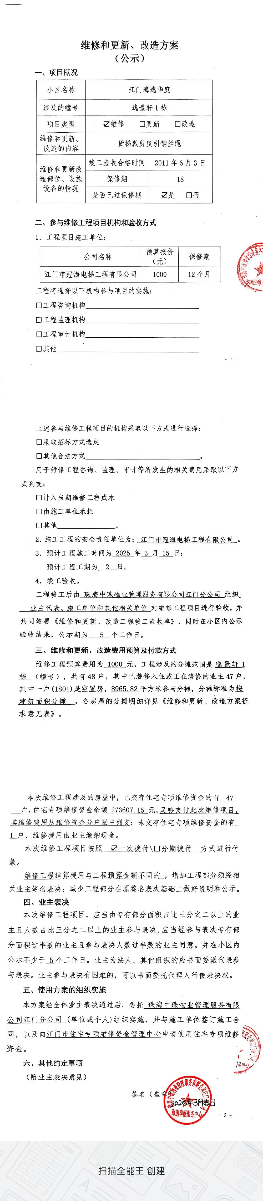 <td VALIGN="top" VALUES="" STYLE="border-width:0" BINDTYPE="0" ROWSPAN="17" COLSPAN="7" DATASOURCE="投票结果" ><font style=" font-family:方正小标宋简体;font-size:14pt;"><p style="line-height: 1.75em;"><span style="font-family: 宋体, SimSun;">各位尊敬的业主:</span><br/></p><p style="text-indent: 2em; line-height: 1.75em;"><span style="font-family: 宋体, SimSun;">根据法律法规的规定,本小区业主利用“江门市物业事项表决管理系统”已对本小区公共事务决策事项(<span style="font-family: 宋体; text-indent: 32px;">江门海逸华庭逸景轩1栋货梯裁剪曳引钢丝绳使用维修资金的投票</span>)进行了表决,在经过7日的询异公示期后,未收到业主有效的异议。现将投票结果公告,并就产生的法律效力说明如下:</span></p><p style="line-height: 1.75em; text-indent: 0em;"><strong style="text-indent: 2em;"><span style="font-family: 宋体, SimSun;">一、投票范围</span></strong></p><p style="text-indent: 2em; line-height: 1.75em;"><span style="font-family: 宋体, SimSun;">海逸华庭江海区外海海逸华庭逸景轩1幢</span></p><p style="text-indent: 2em; line-height: 1.75em;"><span style="font-family: 宋体, SimSun;">总人数(专有部分人数之和):47</span></p><p style="text-indent: 2em; line-height: 1.75em;"><span style="font-family: 宋体, SimSun;"><span style="font-family: 宋体, SimSun; text-indent: 32px;"><span style="font-family: 宋体; text-indent: 32px;"><span style="font-family: 宋体; text-indent: 32px;">总户数:47</span></span></span></span></p><p style="text-indent: 2em; line-height: 1.75em;"><span style="font-family: 宋体, SimSun;">建筑物总面积(专有部分面积之和):8965.82㎡</span></p><p style="line-height: 1.75em;"><strong><span style="font-family: 宋体, SimSun;">二、投票结果公告时间</span></strong></p><p style="text-indent: 2em; line-height: 1.75em;"><span style="font-family: 宋体, SimSun;"><span style="font-family: 宋体, SimSun; text-indent: 32px;">从2025年05月08日开始</span></span></p><p style="line-height: 1.75em;"><strong><span style="font-family: 宋体, SimSun;">三、计票规则</span></strong></p><p style="text-indent: 2em; line-height: 1.75em;"><span style="font-family: 宋体, SimSun;">表决事项:使用建筑物及其附属设施的维修资金<br /><p style='font-family: 宋体, SimSun;line-height: 1.75em; text-indent: 2em;'>计票规则:弃权票不并入其它项&nbsp;&nbsp;&nbsp;&nbsp;未表决票不并入其它项</p></span></p><p style="line-height: 1.75em;"><strong><span style="font-family: 宋体, SimSun;">四、通过规则</span></strong></p><p style="line-height: 1.75em;"><strong><span style="font-family: 宋体, SimSun;">&nbsp; 根据《中华人民共和国民法典》第二百七十八条规定:业主共同决定事项,应当由专有部分面积占比三分之二以上的业主且人数占比三分之二以上的业主参与表决。</span></strong></p><p style="text-indent: 2em; line-height: 1.75em;"><span style="font-family: 宋体, SimSun;"><span style="font-family: 宋体, SimSun; text-indent: 32px;">表决事项:使用建筑物及其附属设施的维修资金<br /><p style='font-family: 宋体, SimSun;line-height: 1.75em; text-indent: 2em;'>通过规则:双2/3以上参与表决,参与表决双过半同意</p></span></span></p><p style="line-height: 1.75em;"><strong><span style="font-family: 宋体, SimSun;">五、投票结果</span></strong></p><p style="line-height: 1.75em; text-indent: 2em;"><span style="font-family: 宋体, SimSun; text-indent: 2em;"><div id='resultTable'><table style='table-layout: fixed; font-size:12px; margin-top:10px' width='100%' border='0' cellspacing='0' cellpadding='0'><tr><td height='28' colspan='10' align='center' style='border: 1px solid #666'><strong style='font-size: 14px;'> 使用建筑物及其附属设施的维修资金</strong></td> </tr><tr id='trfirst'><td height='28' colspan='4' style='border-left: 1px solid #666; border-bottom: 1px solid #666'><strong>&nbsp;申报单位:</strong> 珠海中珠物业管理服务有限公司江门分公司</td><td colspan='3' style='border-left: 1px solid #666; border-bottom: 1px solid #666'><strong>&nbsp;联系方式:</strong> 3181899 </td><td colspan='3' style='border-left: 1px solid #666; border-bottom: 1px solid #666; border-right: 1px solid #666'><strong>&nbsp;申报日期:</strong> 2025年3月5日 </td></tr><tr> <td height='28' colspan='5' style='border-left: 1px solid #666; border-bottom: 1px solid #666'><strong>&nbsp;列支总人数(专有部分人数之和):</strong>47人 </td><td colspan='5' style='border-left: 1px solid #666; border-bottom: 1px solid #666; border-right: 1px solid #666'><strong>&nbsp;列支建筑物总面积(专有部分面积之和):</strong>8965.82㎡ </td> </tr><tr><td height='28' colspan='10' bgcolor='#F3F3F3' style='border-left: 1px solid #666;border-bottom: 1px solid #666;border-right: 1px solid #666'><strong>&nbsp;参与表决人数及面积统计</strong></td></tr><tr><td height='28' colspan='5' style='border-left: 1px solid #666; border-bottom: 1px solid #666'><strong>&nbsp;参与表决人数:</strong>34人</td><td colspan='5' style='border-left: 1px solid #666; border-bottom: 1px solid #666; border-right: 1px solid #666'><strong>&nbsp;参与表决人数占总人数比例:</strong>72.34%</td></tr><tr><td height='28' colspan='5' style='border-left: 1px solid #666; border-bottom: 1px solid #666'><strong>&nbsp;参与表决面积:</strong>6480.24㎡</td><td colspan='5' style='border-left: 1px solid #666; border-bottom: 1px solid #666; border-right: 1px solid #666'><strong>&nbsp;参与表决面积占总面积比例:</strong>72.28%</td></tr><tr><td height='28' colspan='10' bgcolor='#F3F3F3' style='border-left: 1px solid #666; border-bottom: 1px solid #666;border-right: 1px solid #666'> <strong>&nbsp;参与表决同意人数及面积统计</strong></td> </tr><tr><td height='28' colspan='5' 